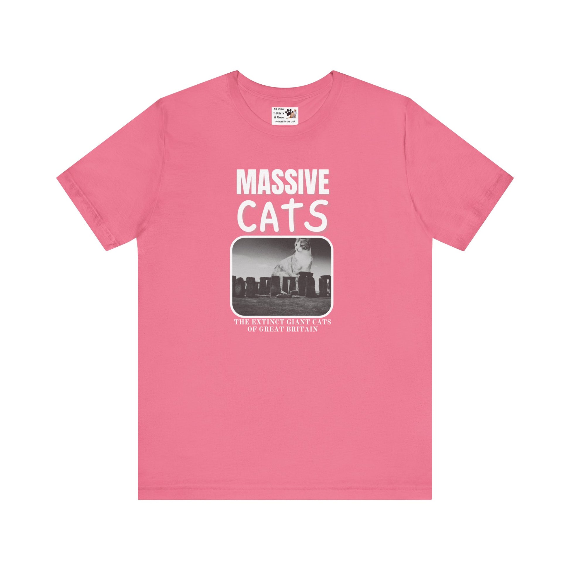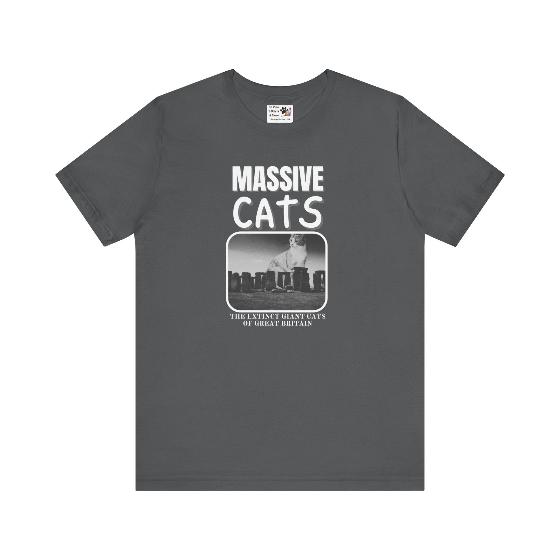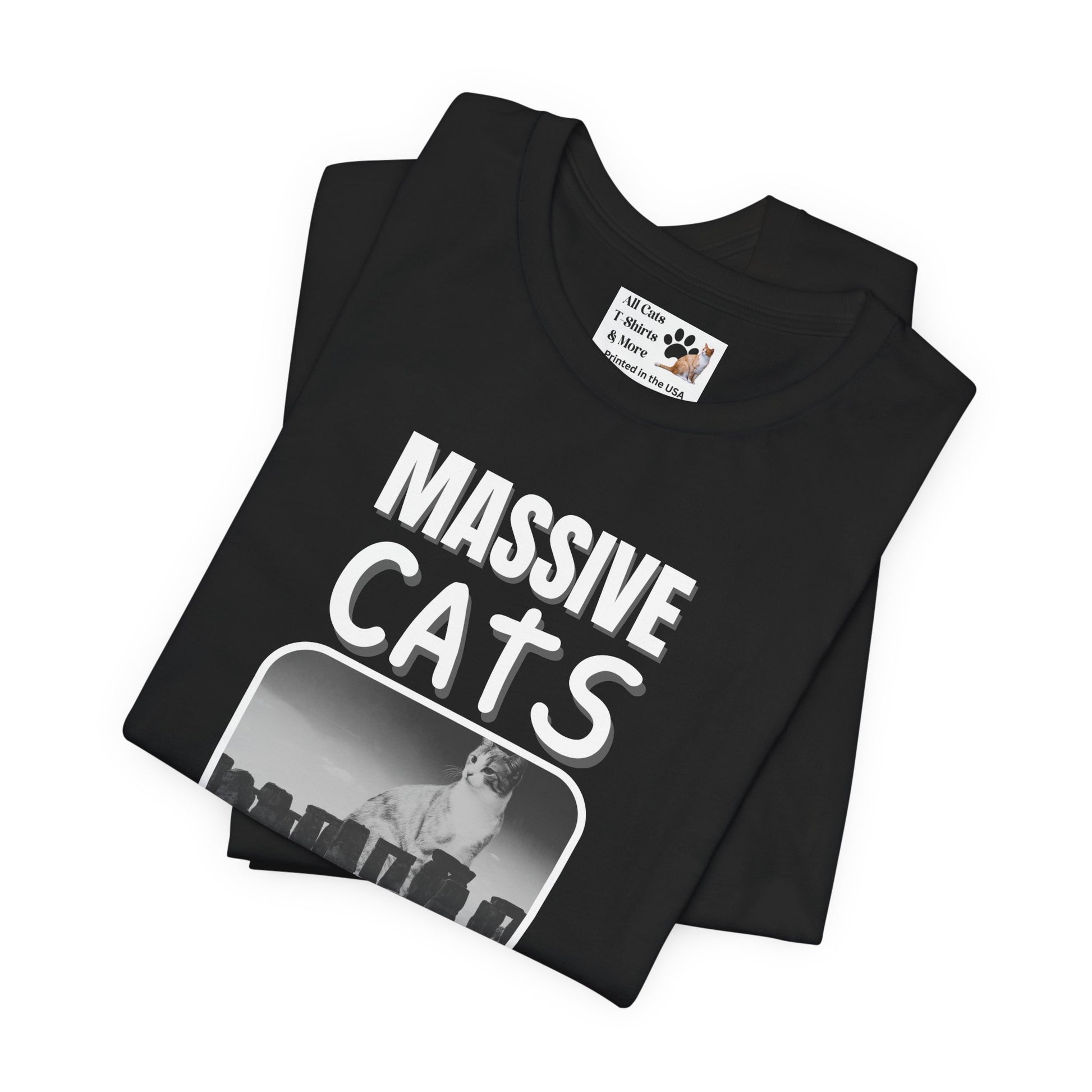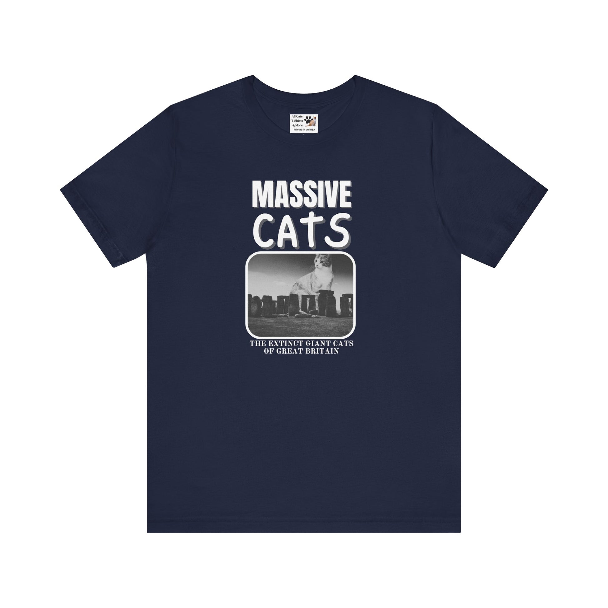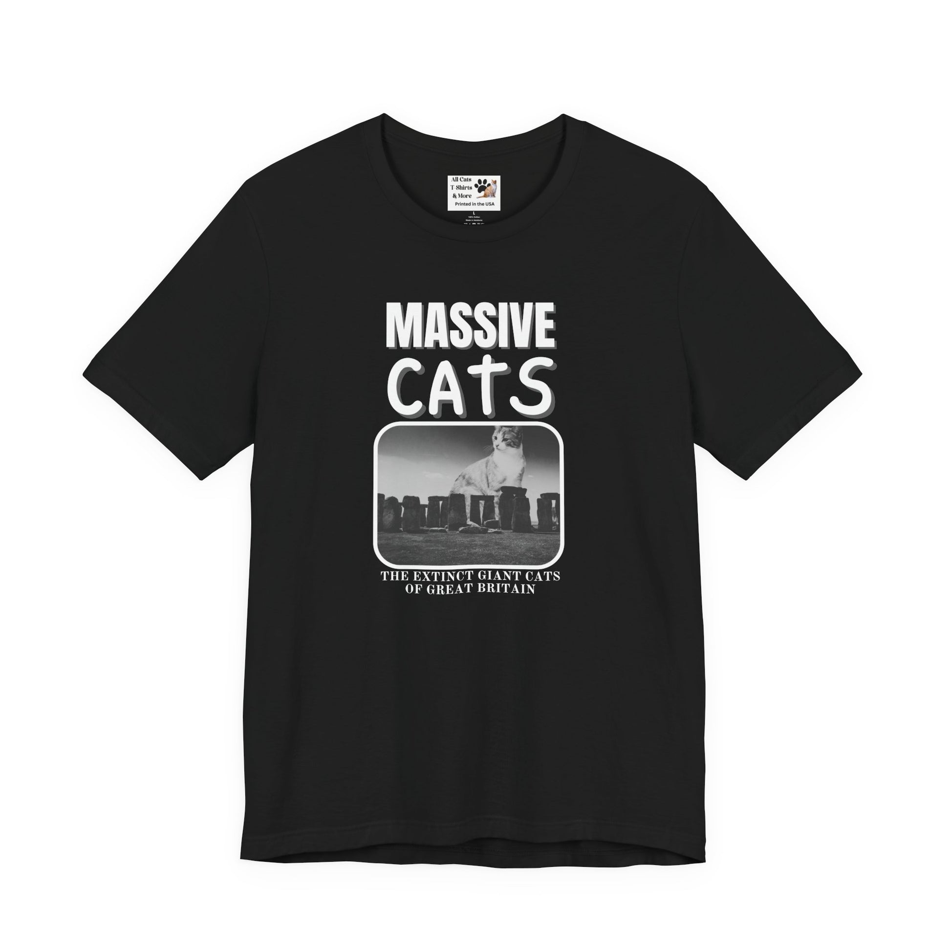 A Massive Cats T-Shirt - Huge Cat Sitting Behind Stone Henge - (Vintage Inspired, Funny Cat Unisex Jersey Tee - Perfect for Cat Fans!)