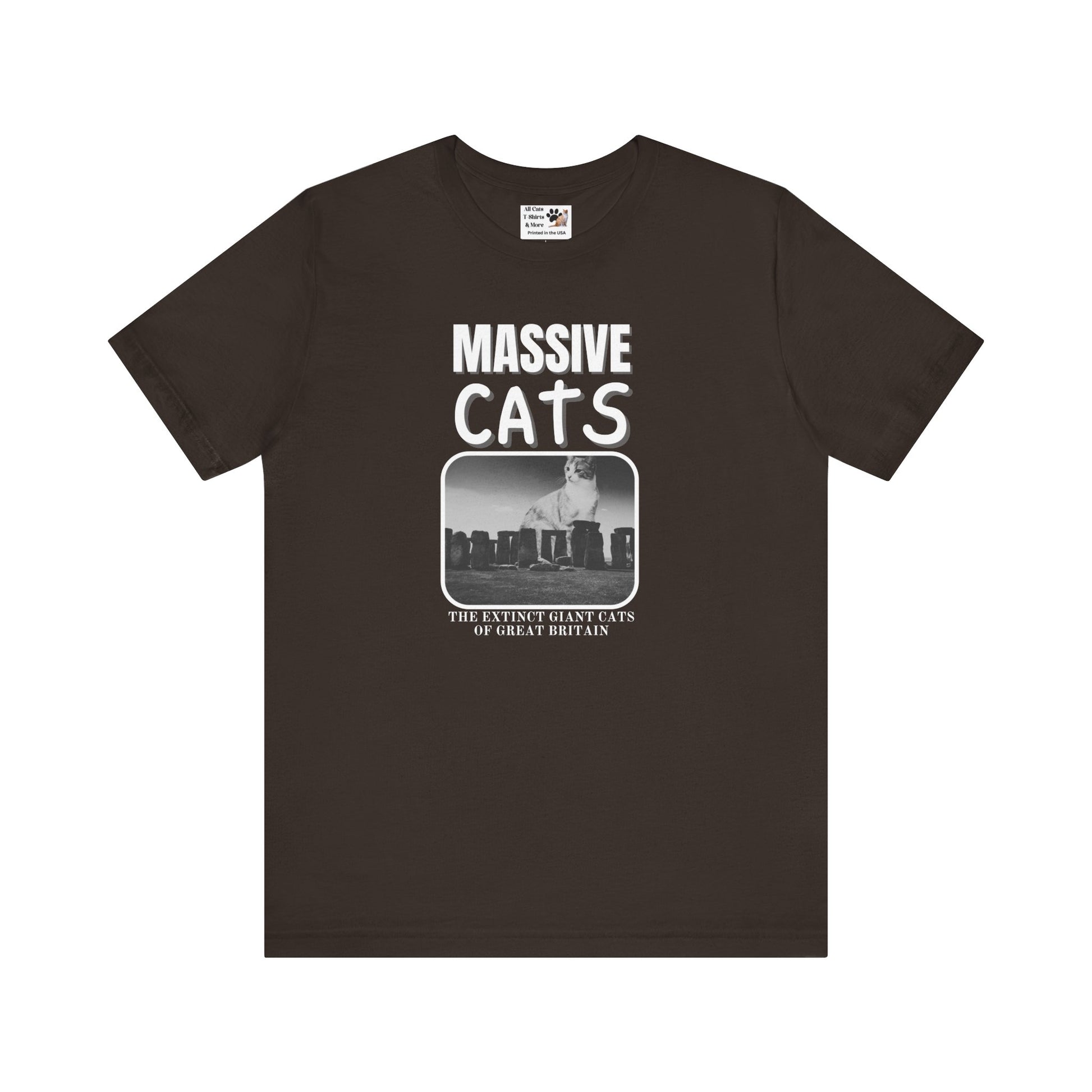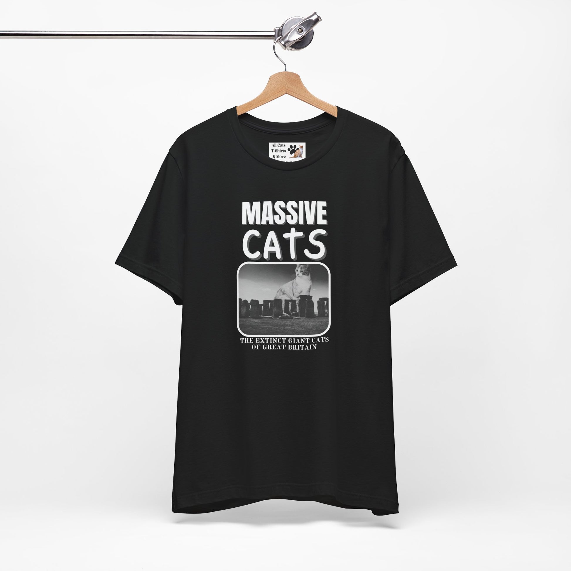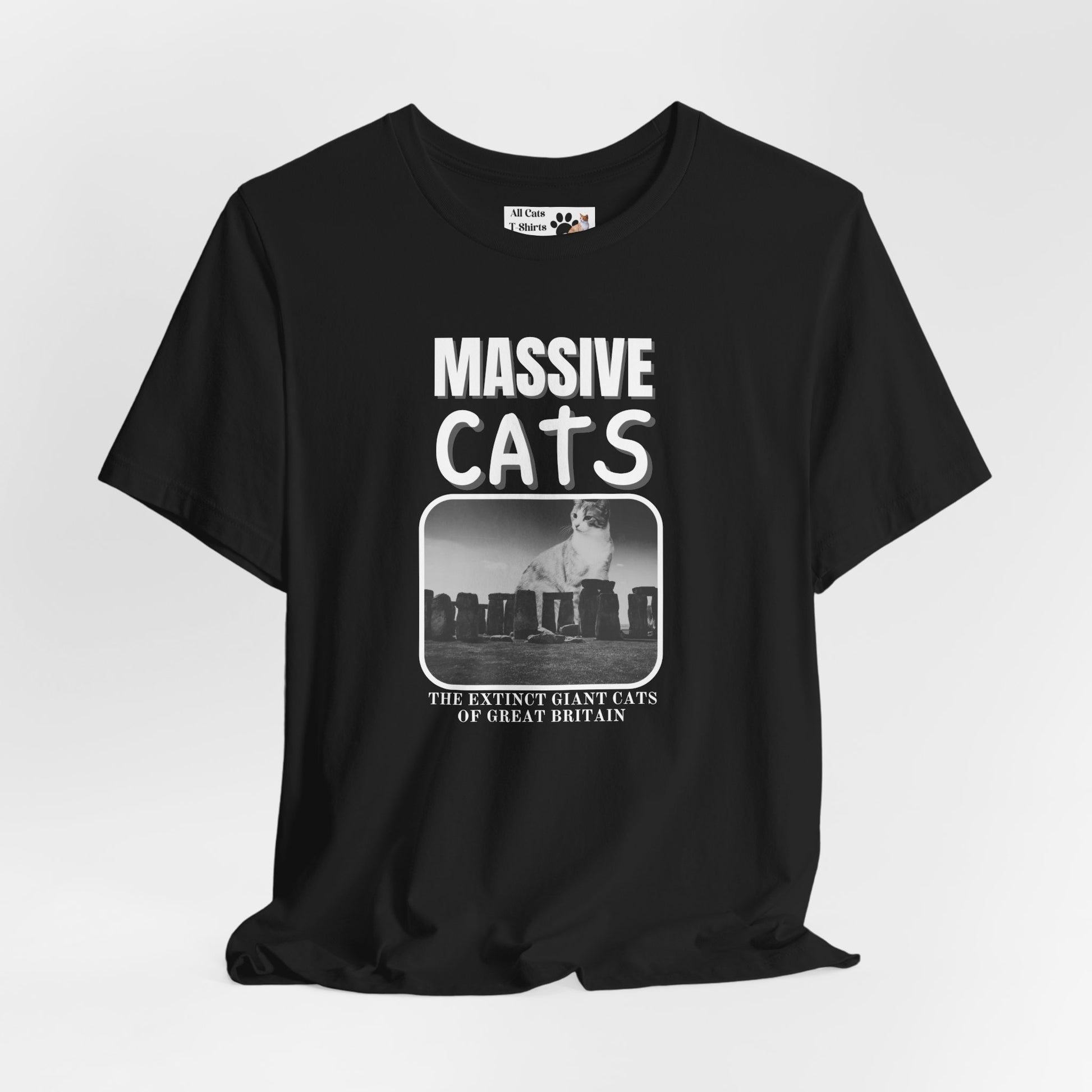 The "Massive Cats" T-Shirt Theme is a fantasy about huge make believe cats from the past which are now extinct: "The Extinct Giant Cats of Great Britain" This T-Shirt features a "Massive Cat" sitting behind Stone Henge. It gives a playful and imaginative vibe, perfect for cat lovers and fans of fantasy creatures.