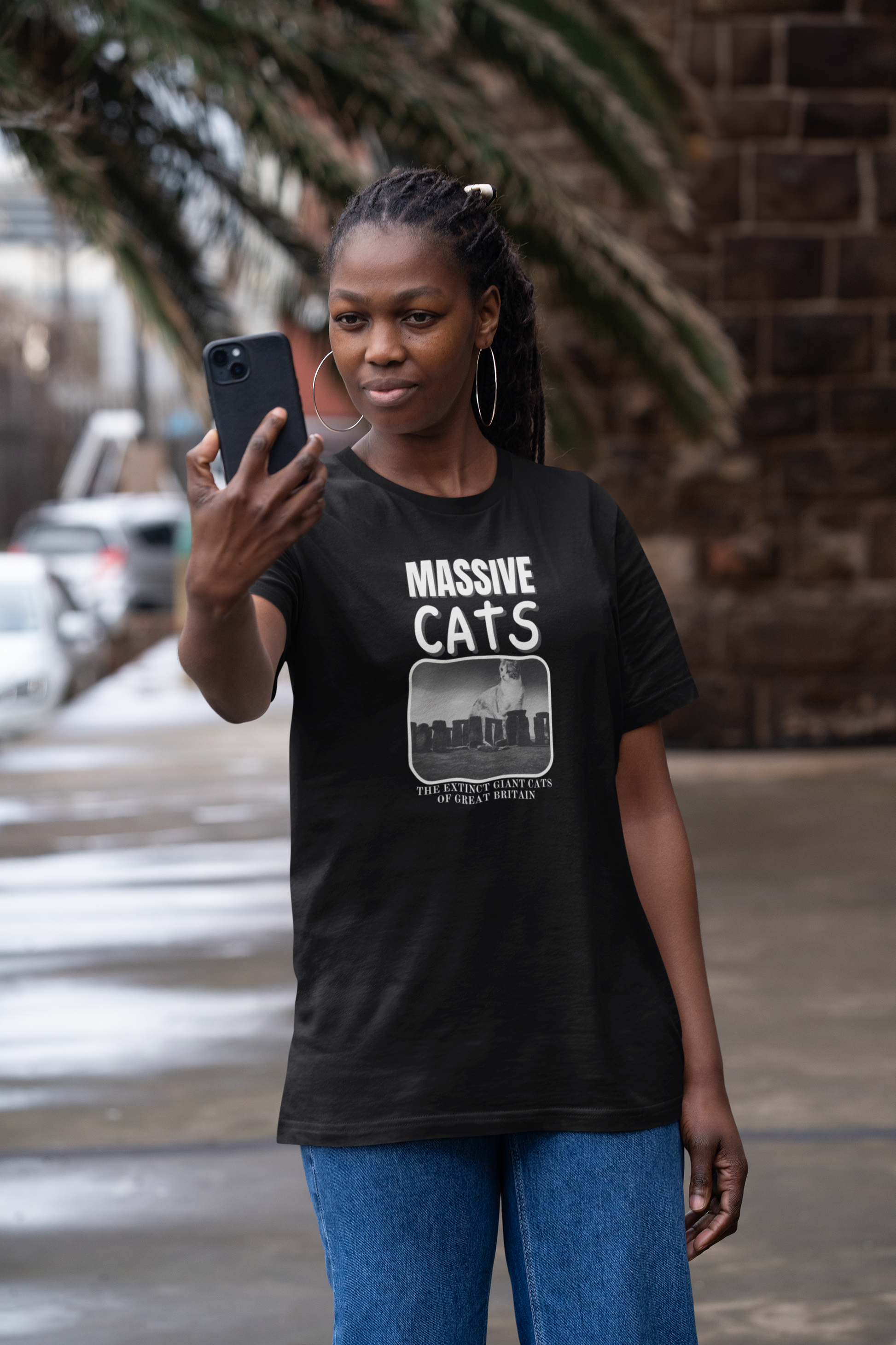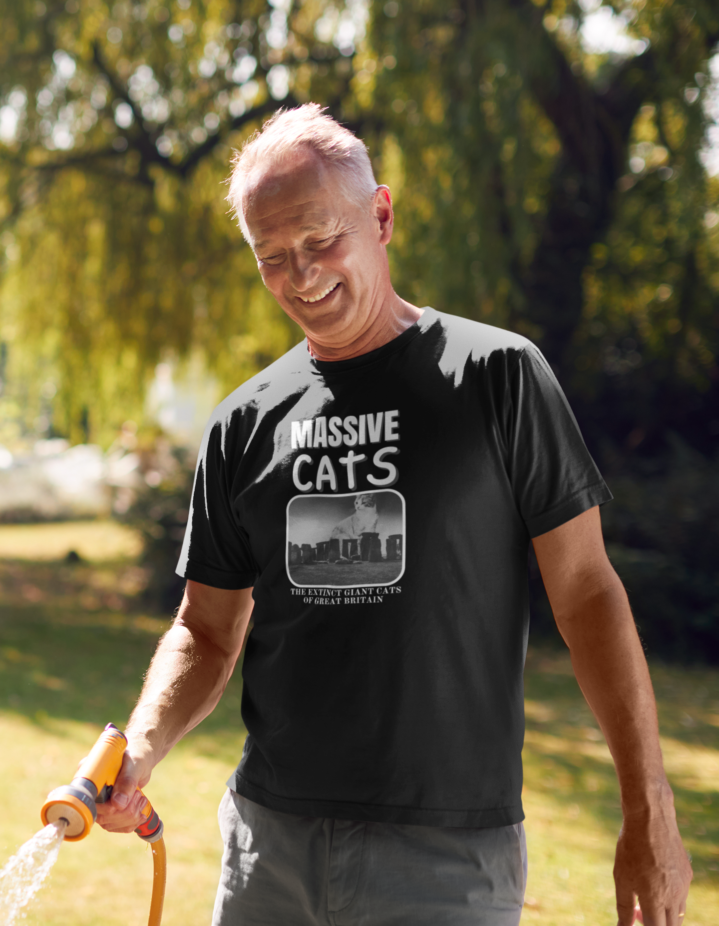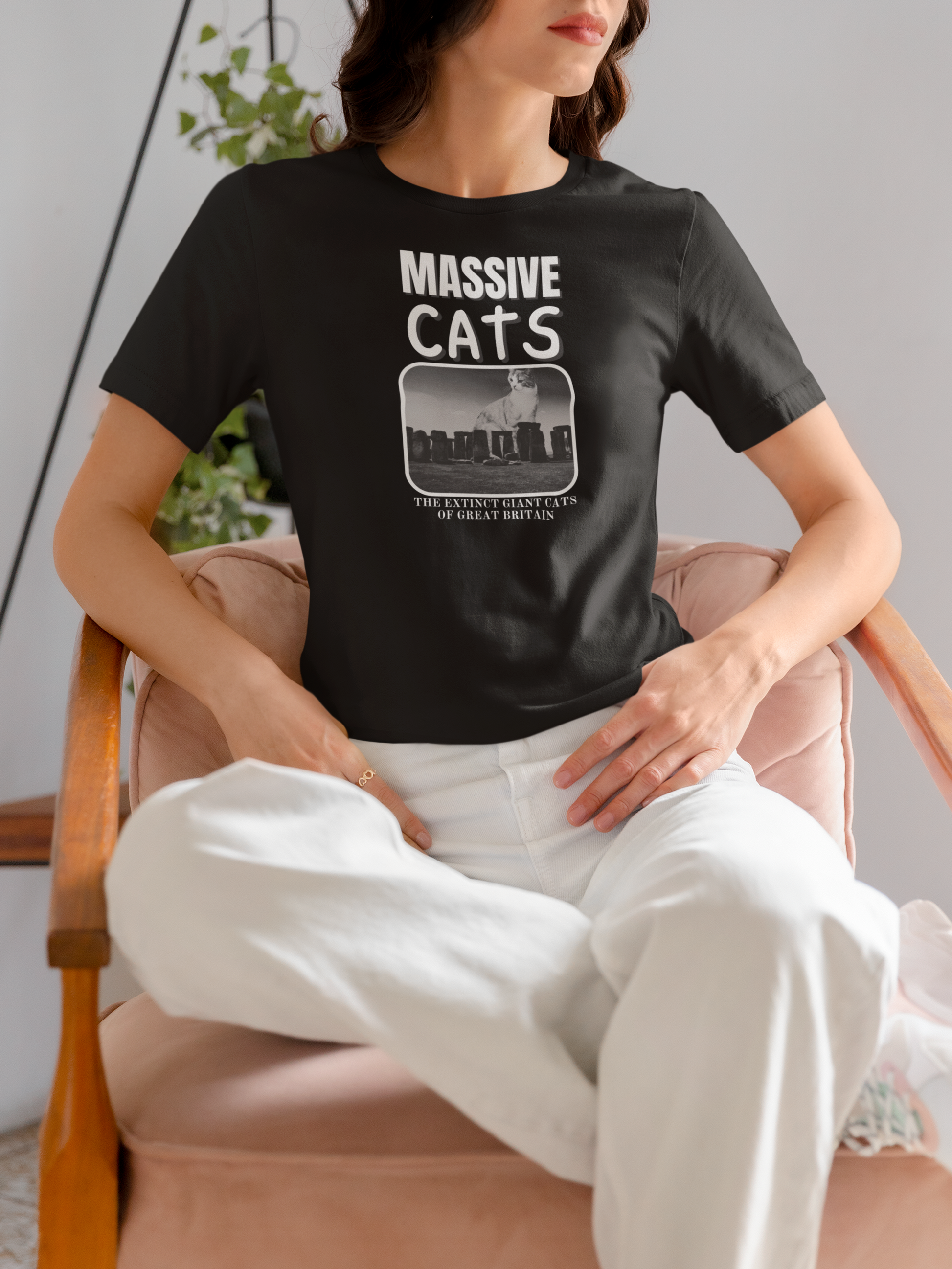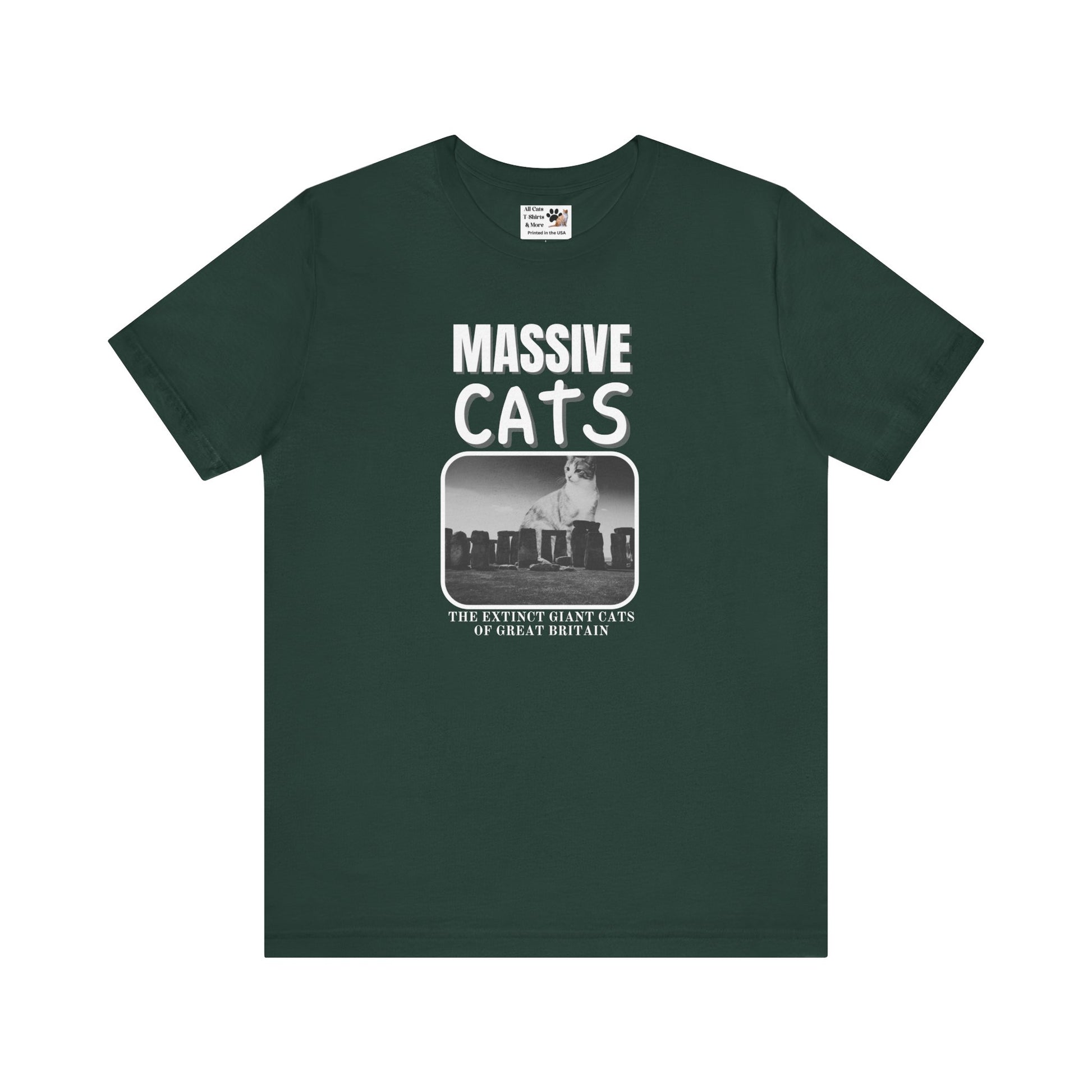 The "Massive Cats" T-Shirt Theme is a fantasy about huge make believe cats from the past which are now extinct: "The Extinct Giant Cats of Great Britain" This T-Shirt features a "Massive Cat" sitting behind Stone Henge. It gives a playful and imaginative vibe, perfect for cat lovers and fans of fantasy creatures.