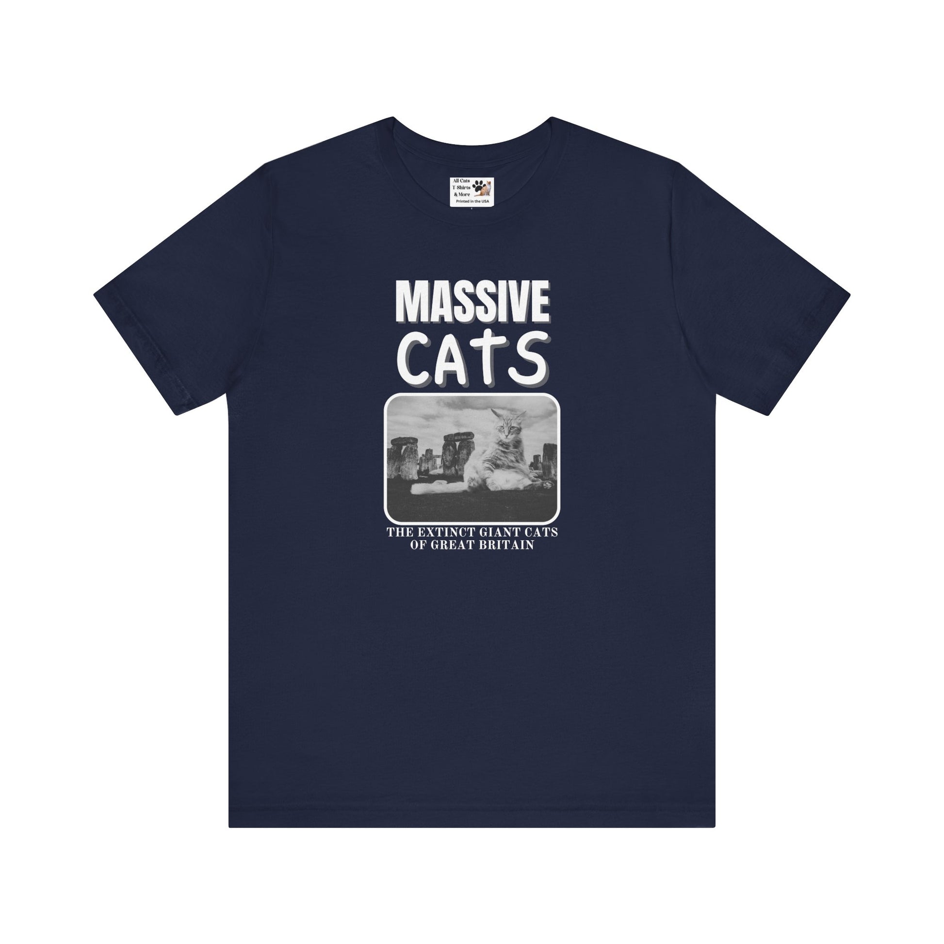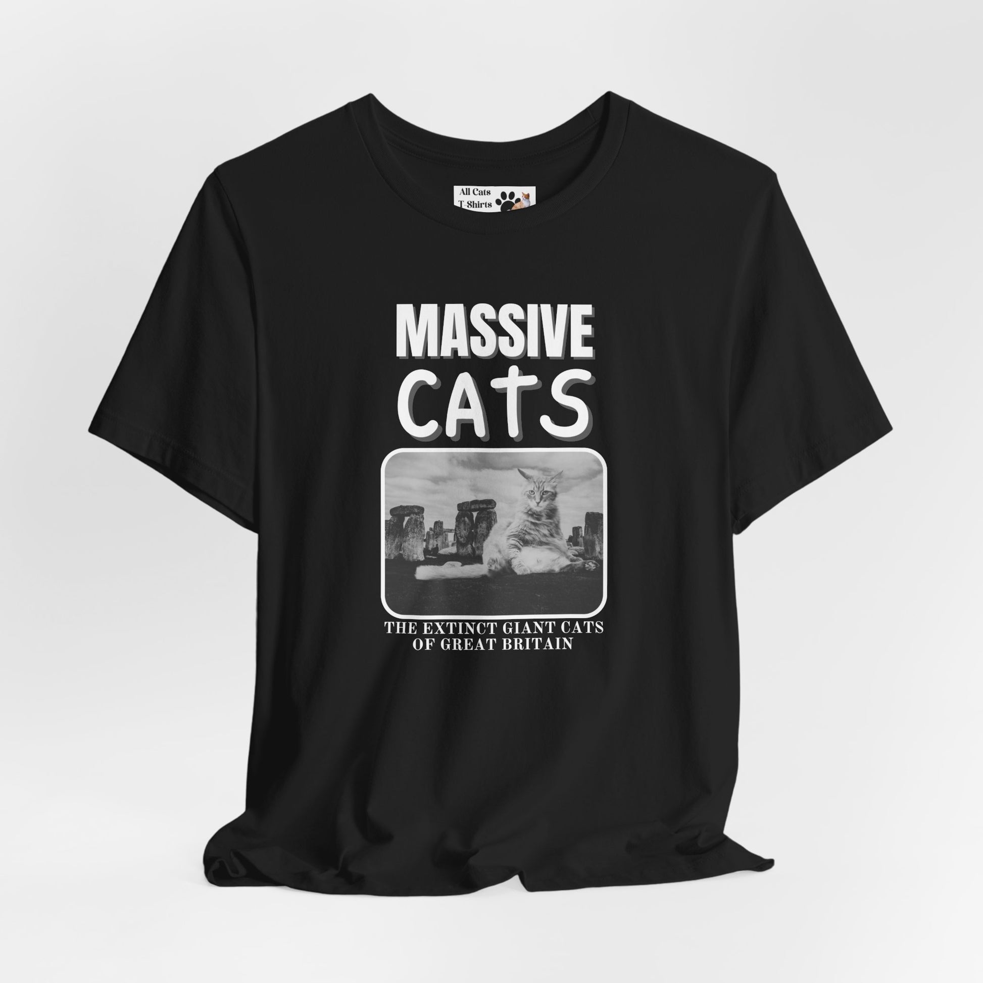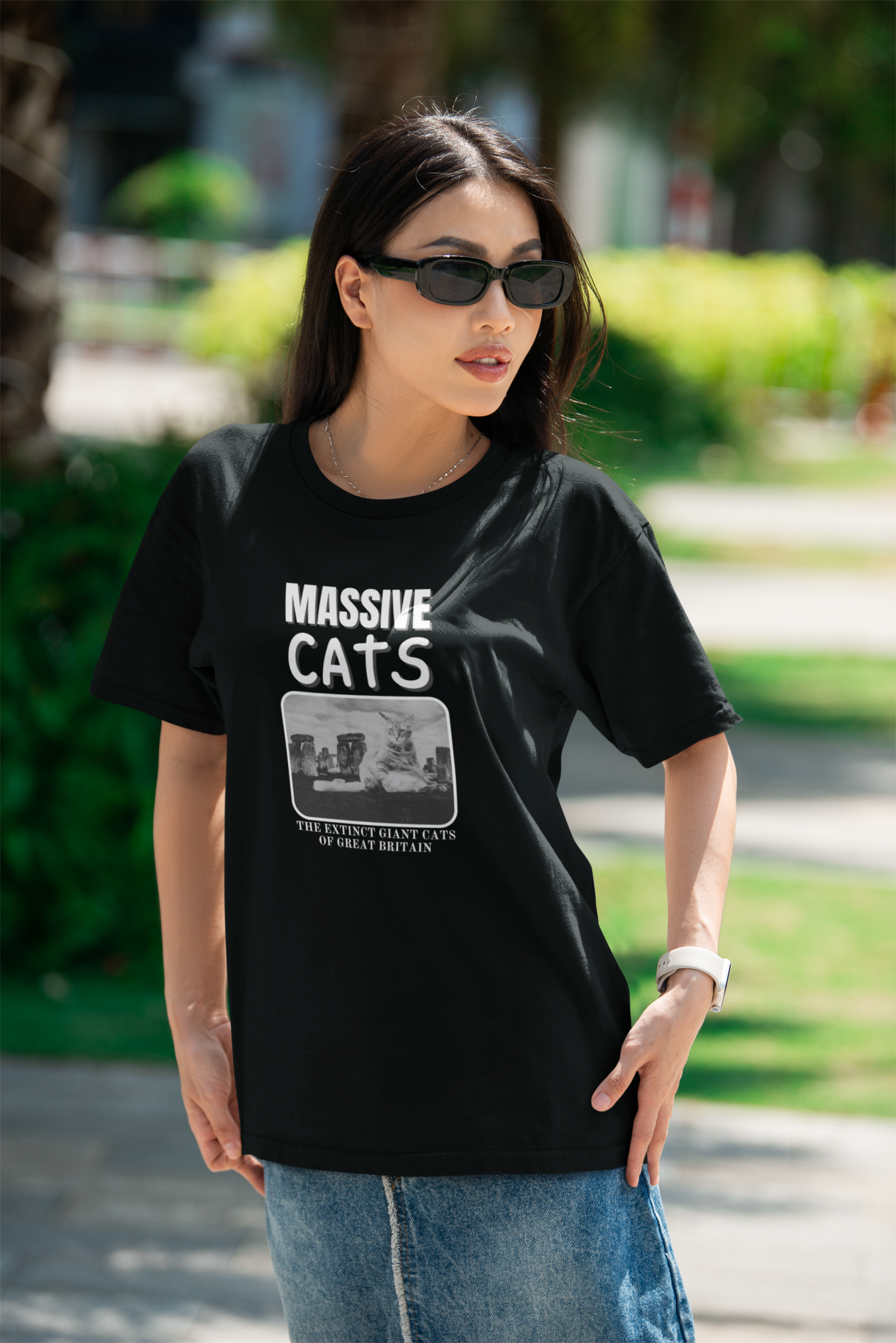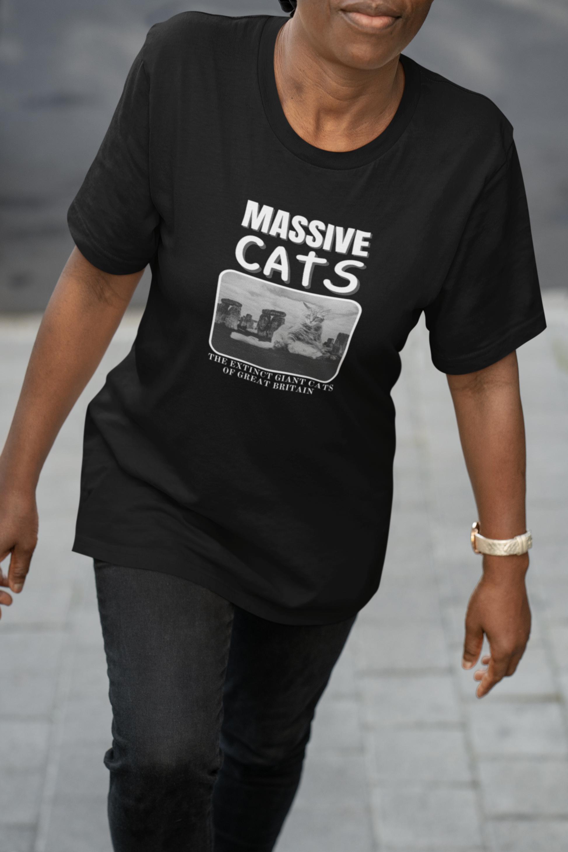The "Massive Cats" T-Shirt Theme is a fantasy about huge make believe cats from the past which are now extinct: "The Extinct Giant Cats of Great Britain" This T-Shirt features a "Massive Cat" sitting in front of Stone Henge. It gives a playful and imaginative vibe, perfect for cat lovers and fans of fantasy creatures.