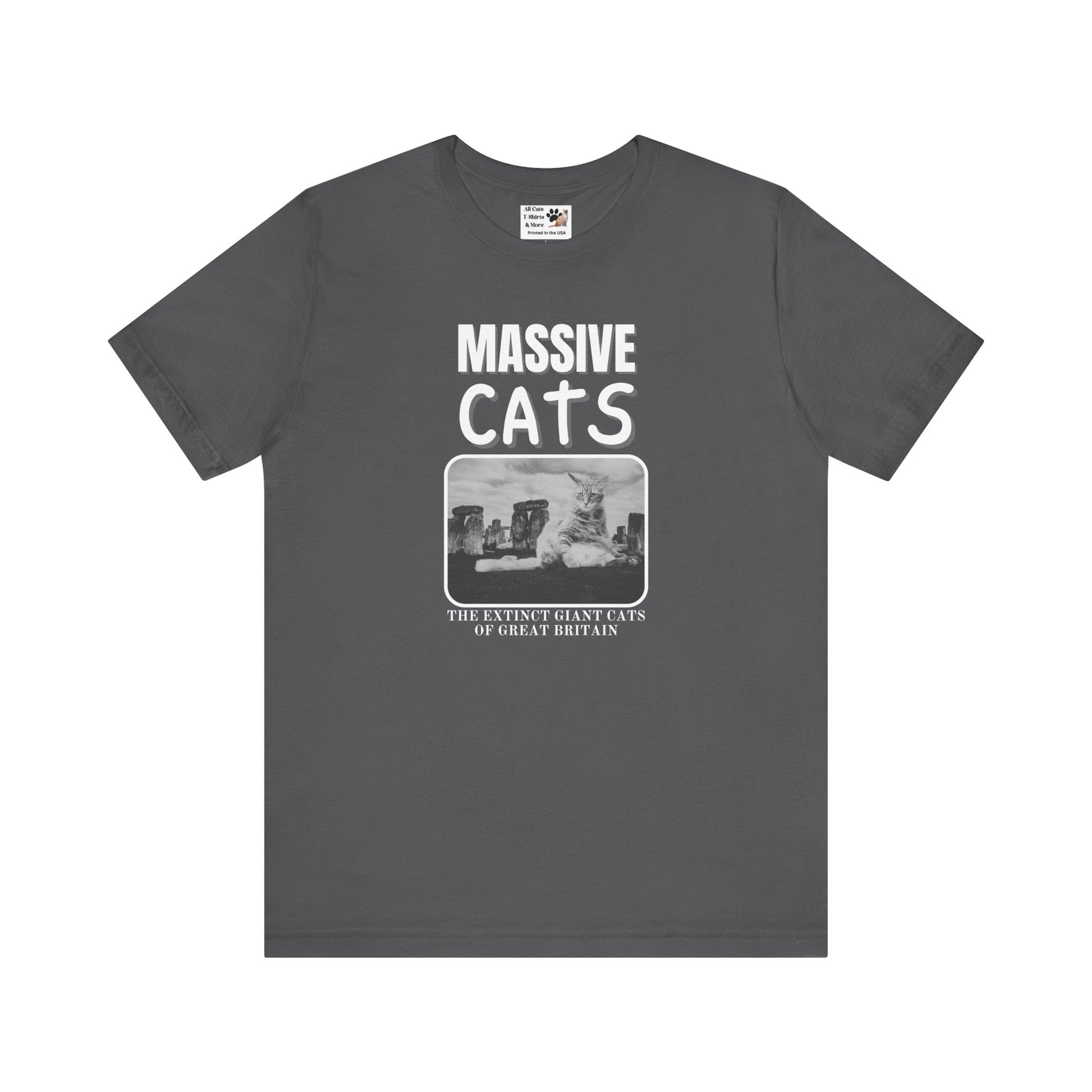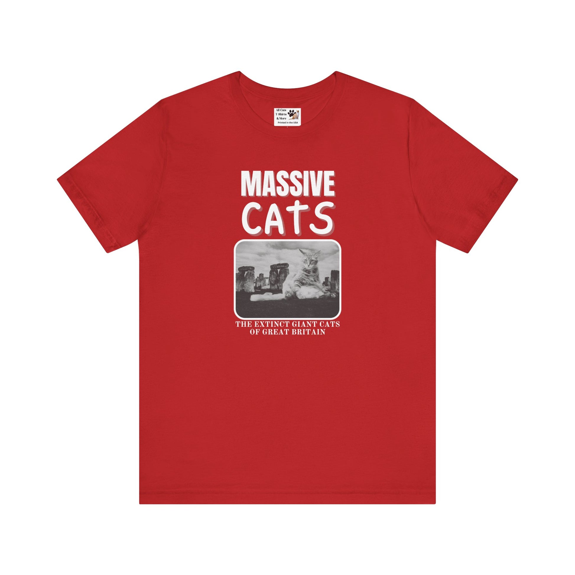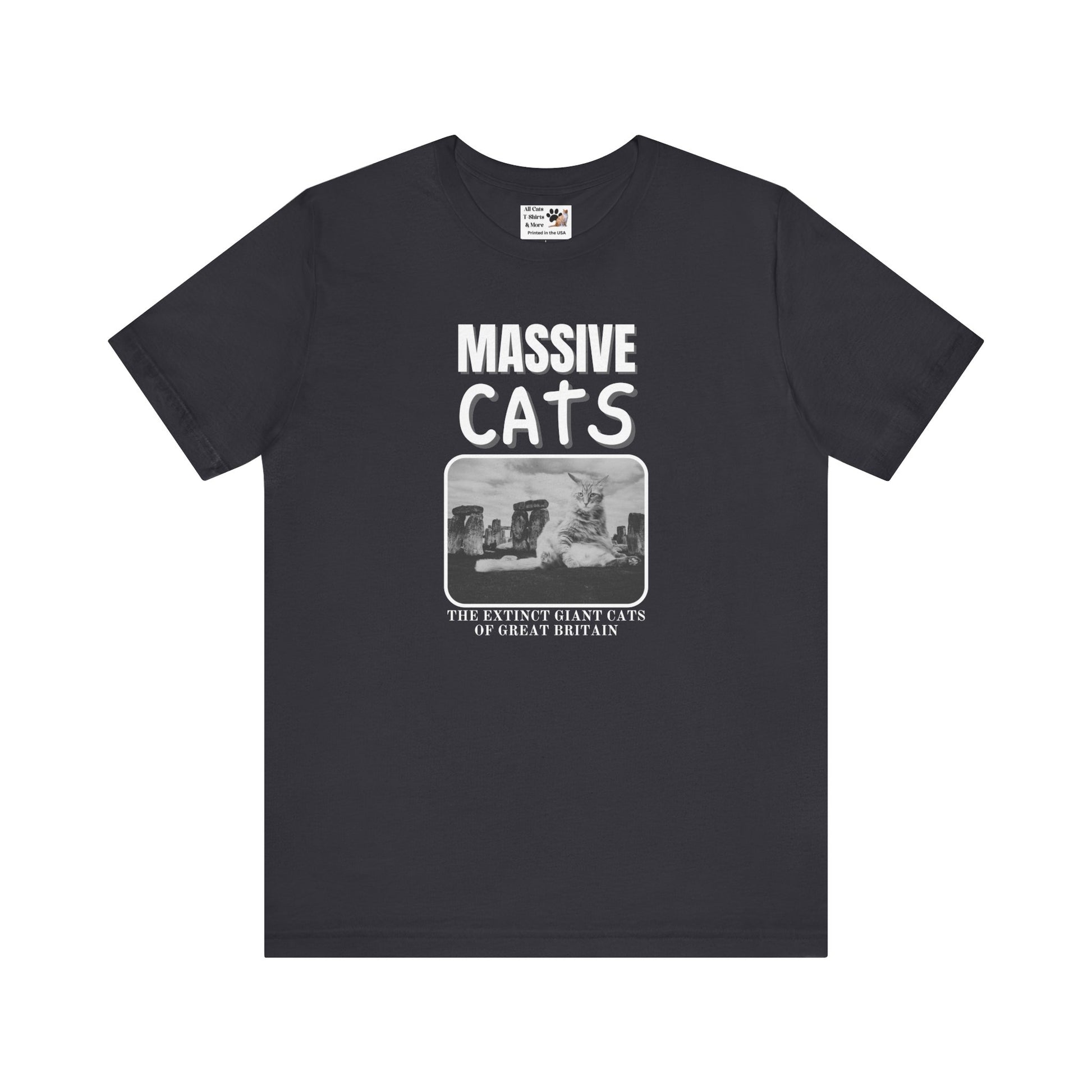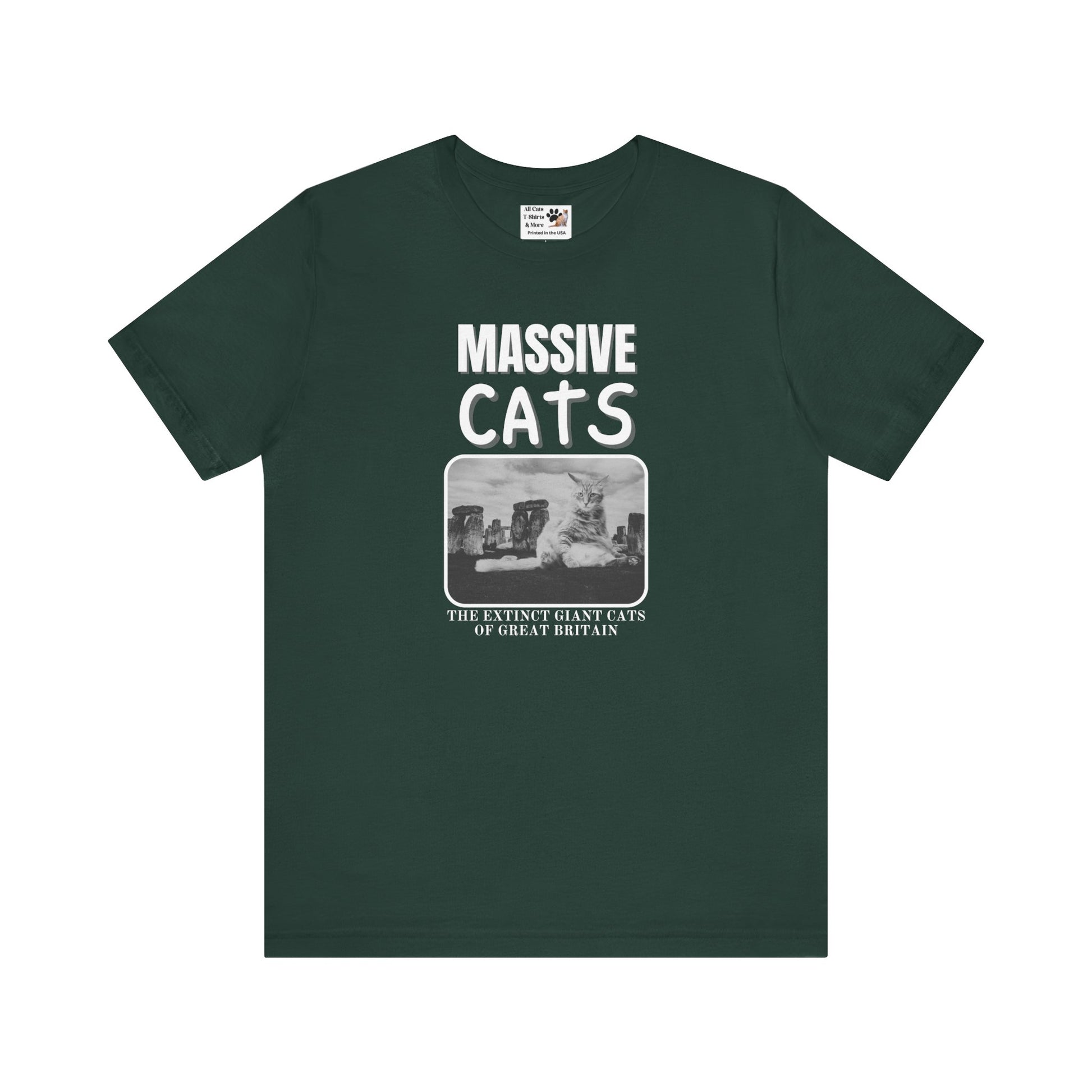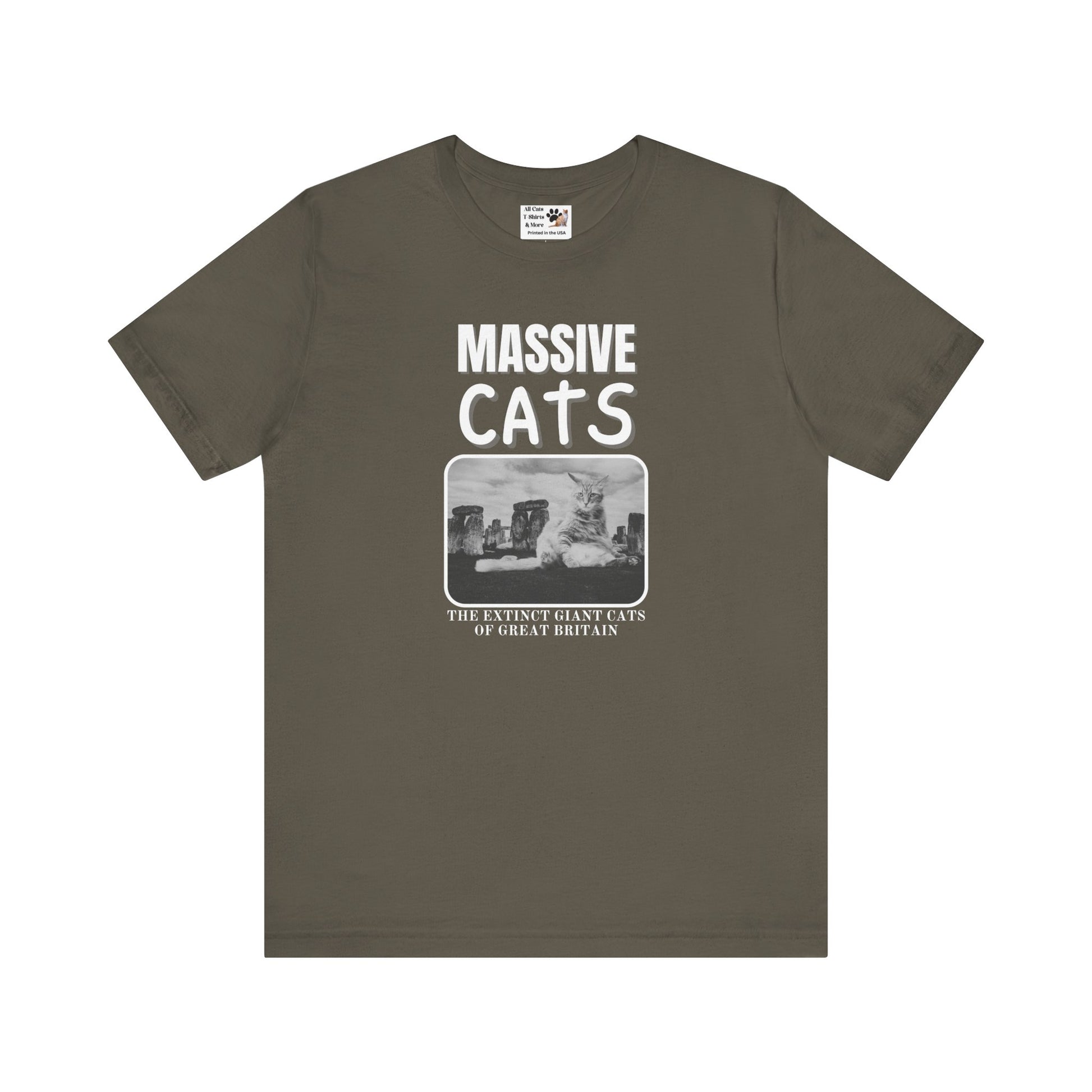 The "Massive Cats" T-Shirt Theme is a fantasy about huge make believe cats from the past which are now extinct: "The Extinct Giant Cats of Great Britain" This T-Shirt features a "Massive Cat" sitting in front of Stone Henge. It gives a playful and imaginative vibe, perfect for cat lovers and fans of fantasy creatures.