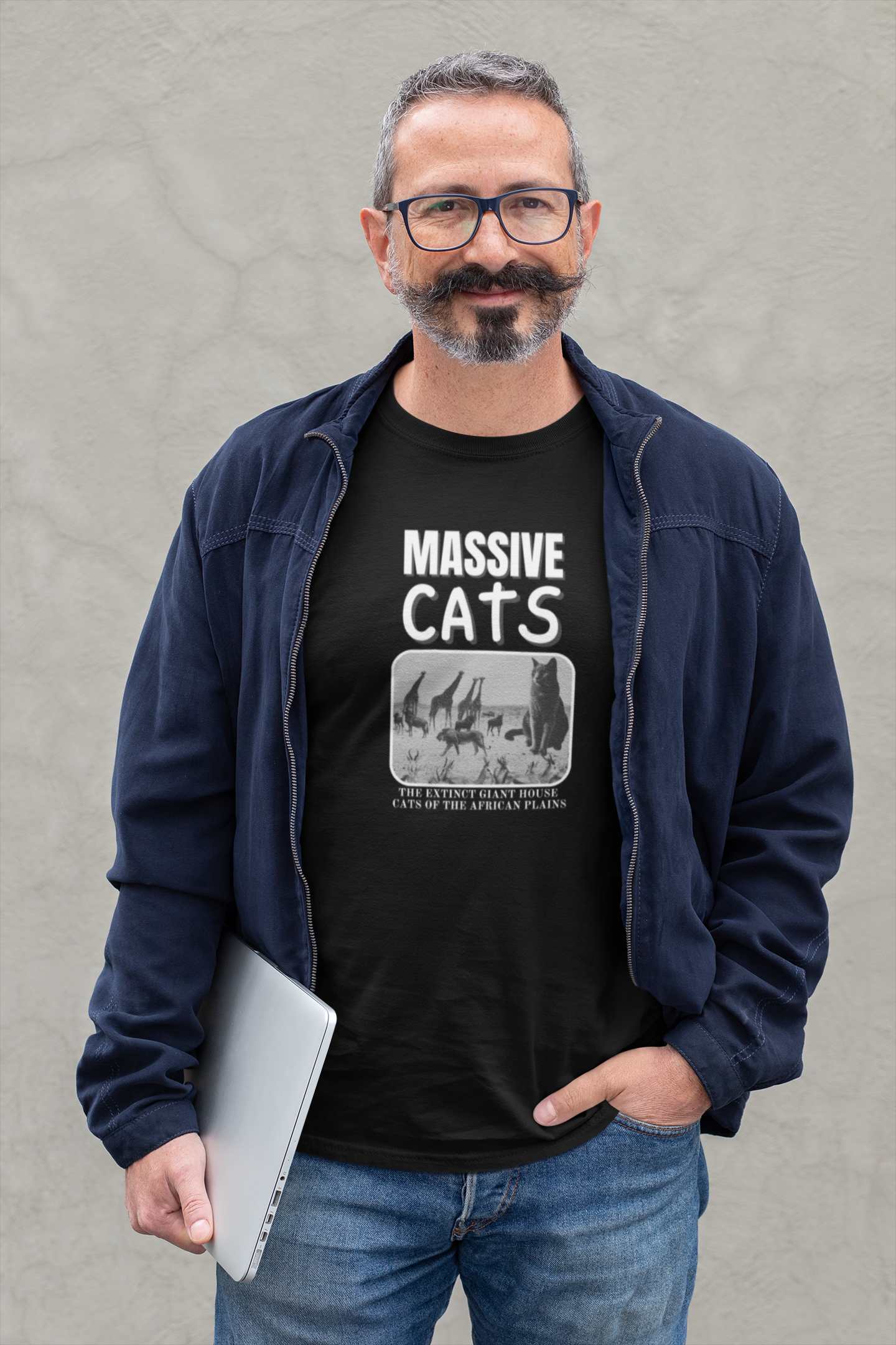 The "Massive Cats" T-Shirt Theme is a historical fantasy about huge make believe cats from the past which are now extinct. This Massive Cats T-Shirt design of "The Extinct Giant House Cats of the African Plain" features a huge house cat sitting amongst other african wildlife. It gives a playful and imaginative vibe, perfect for cat lovers and fans of fantasy creatures.