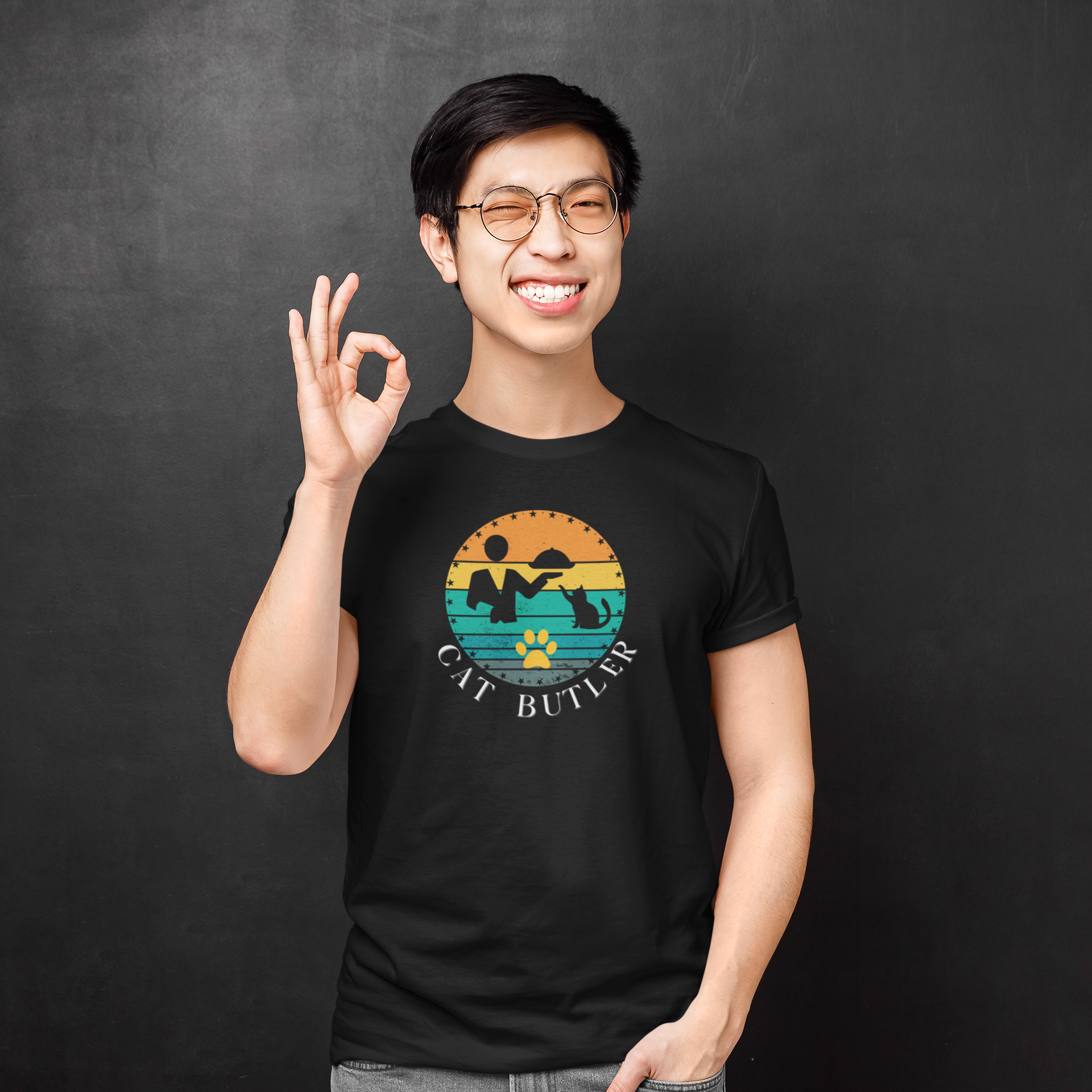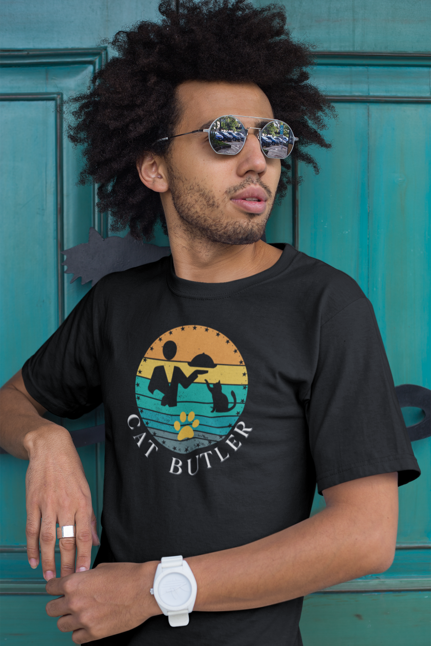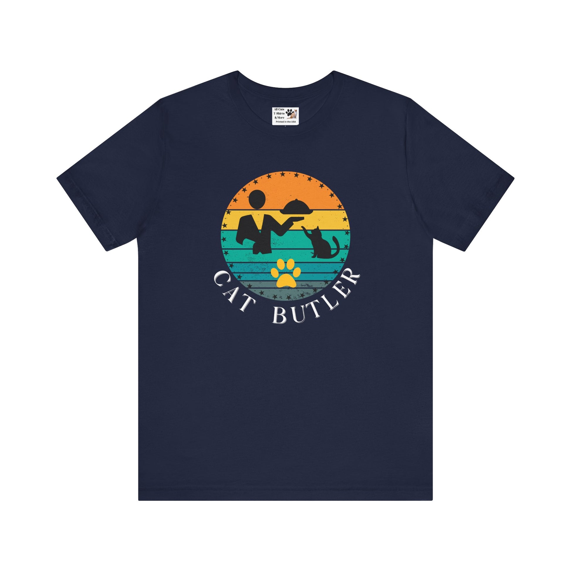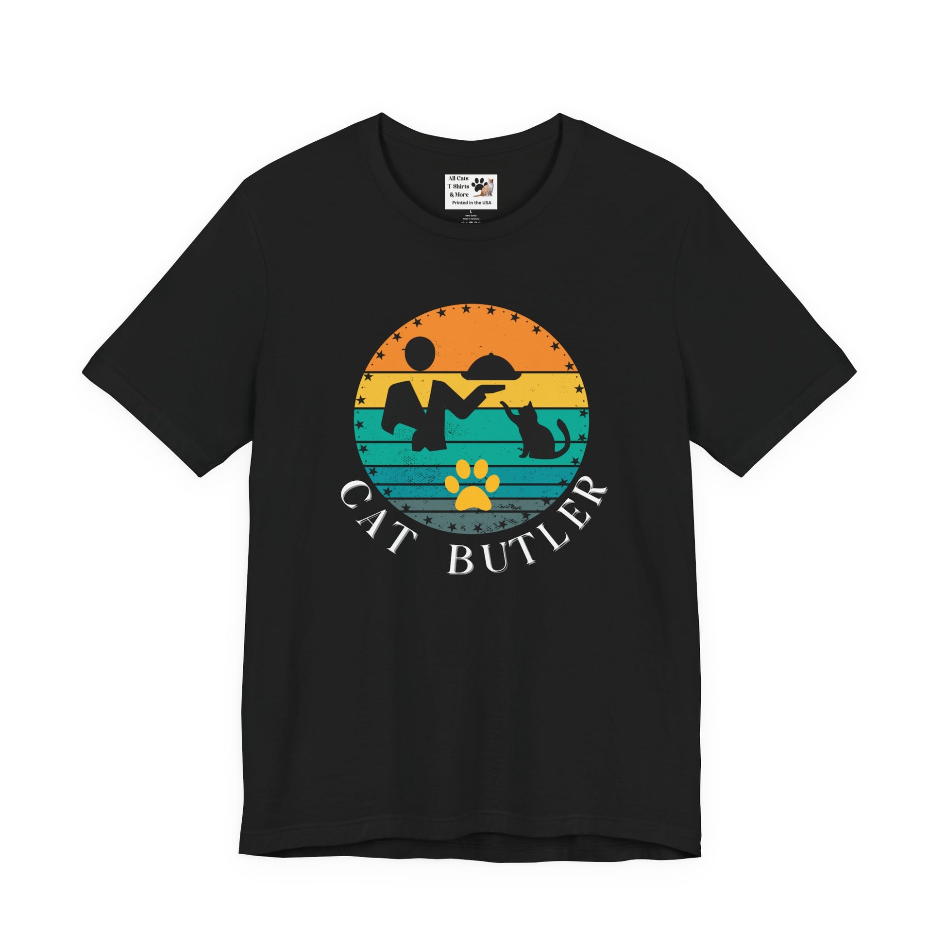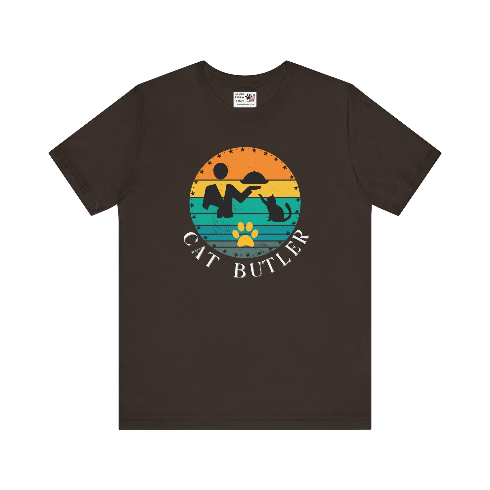 "Cat Butler" T-Shirt - With Vintage Sunset Style Graphic - (Unisex Jersey Short Sleeve Tee - Perfect Gift for Cat Lovers!)