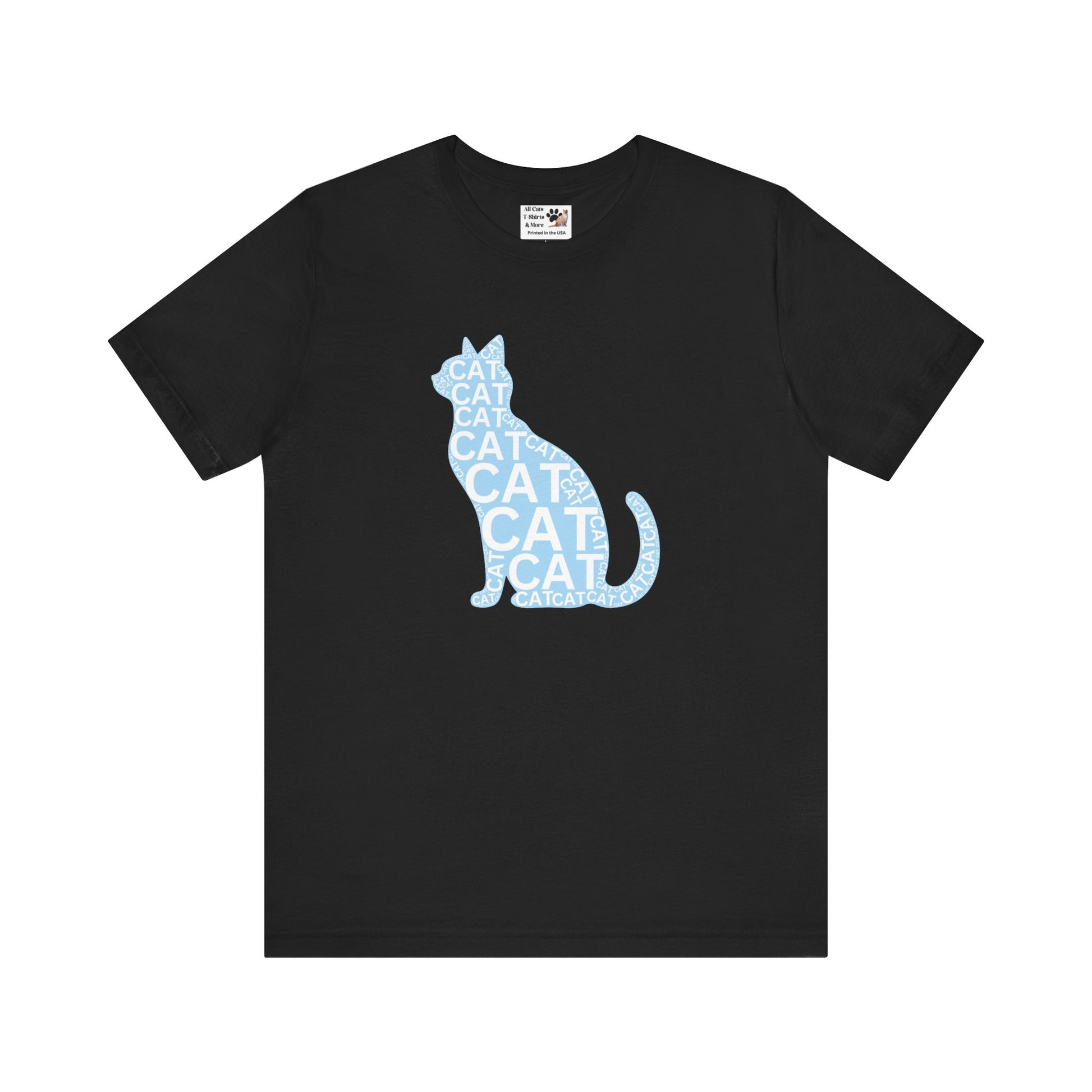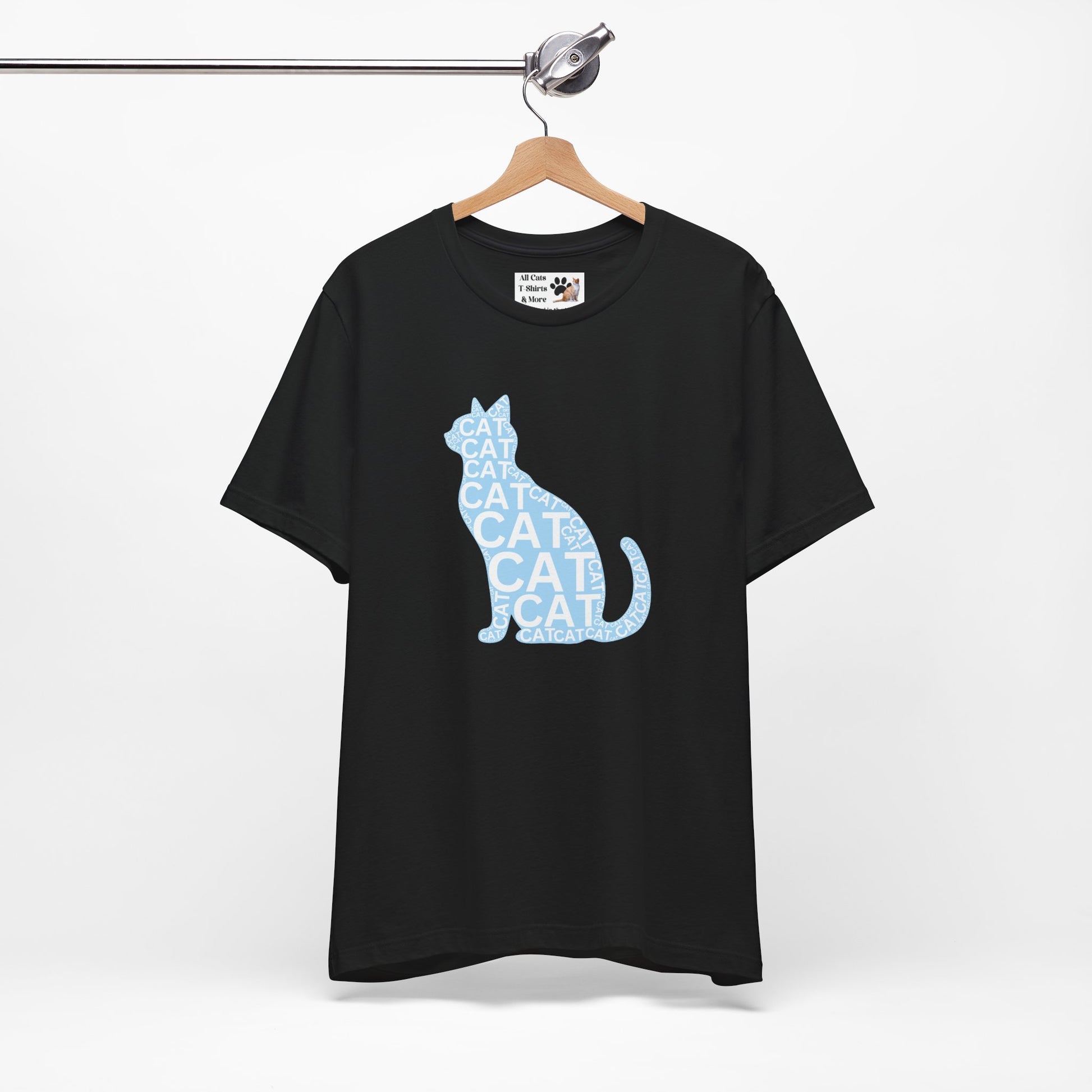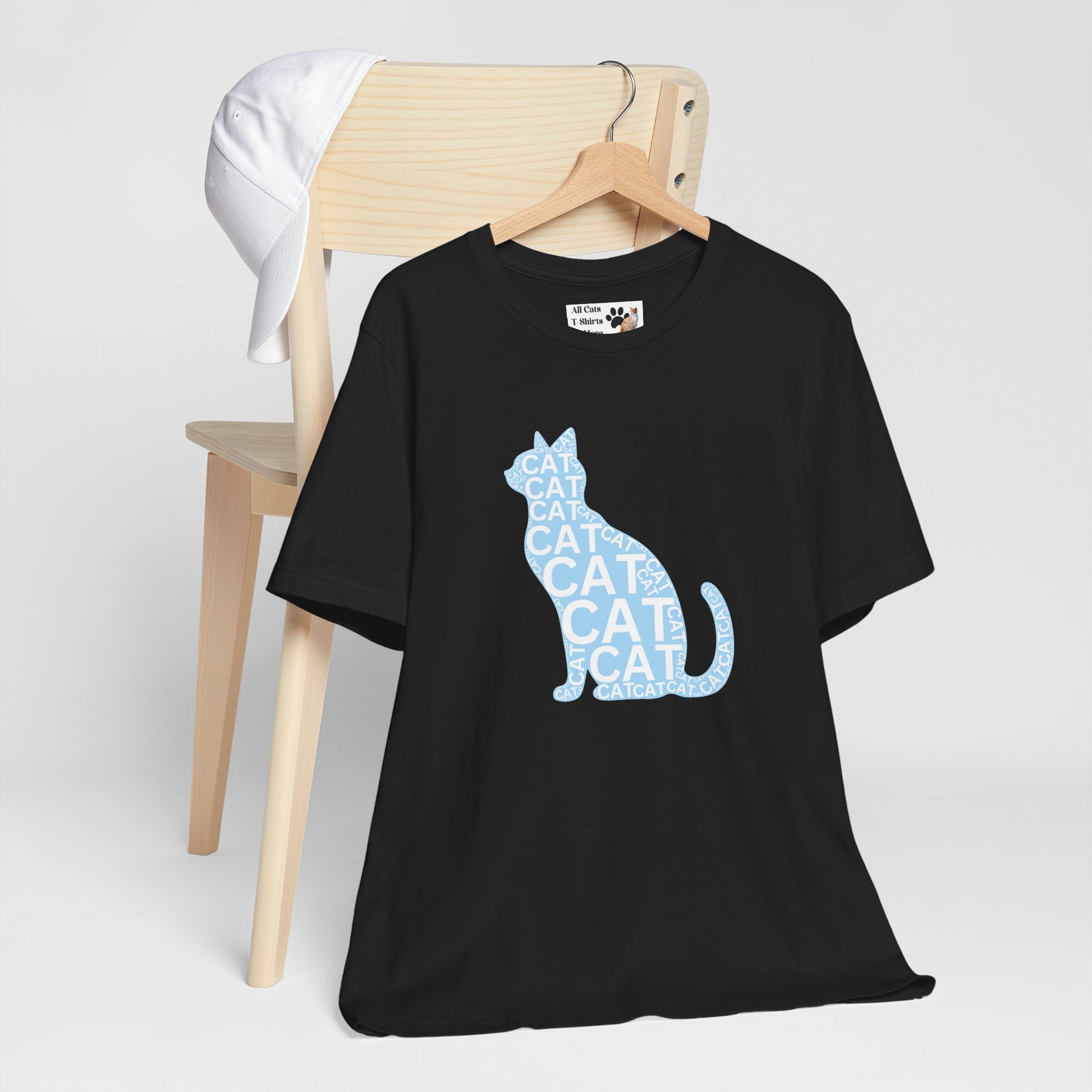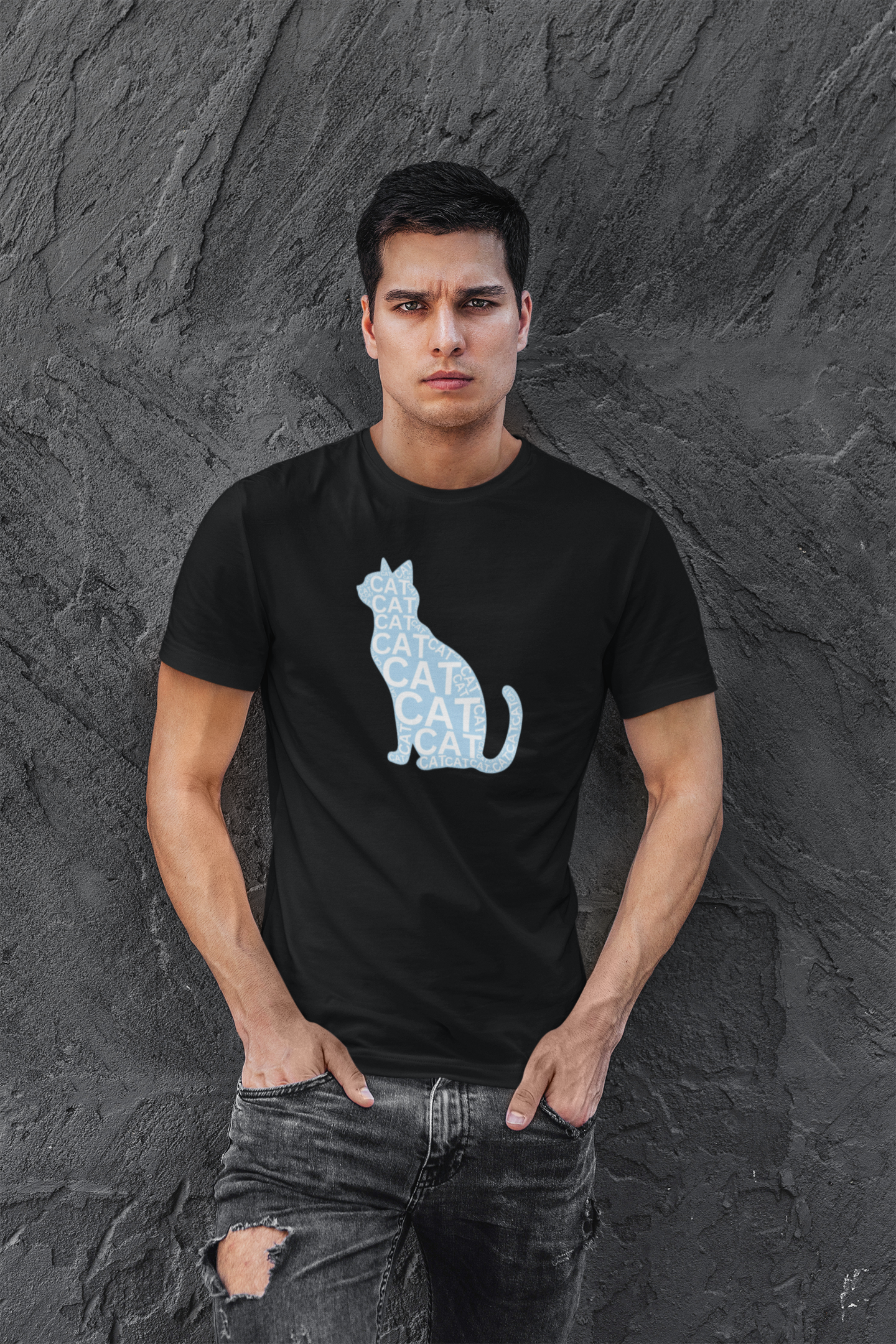 A Cat Silhouette Graphic T-Shirt with the word "Cat" written all over inside it, in different sizes. This fun and quirky design is perfect for cat lovers who want to show off their love for felines in a stylish way. Great for casual wear, relevant for cat lovers, and a great gift for cat enthusiasts.