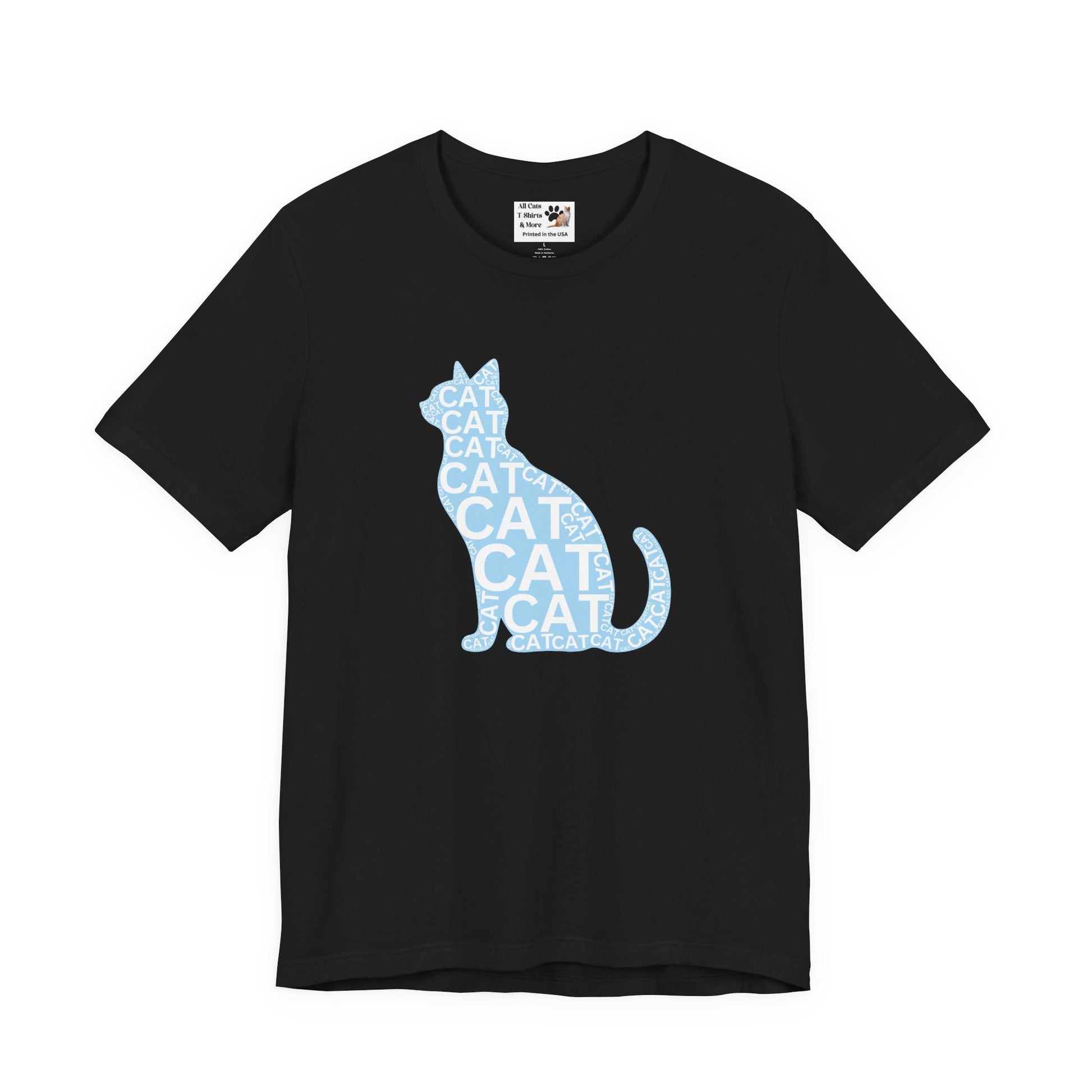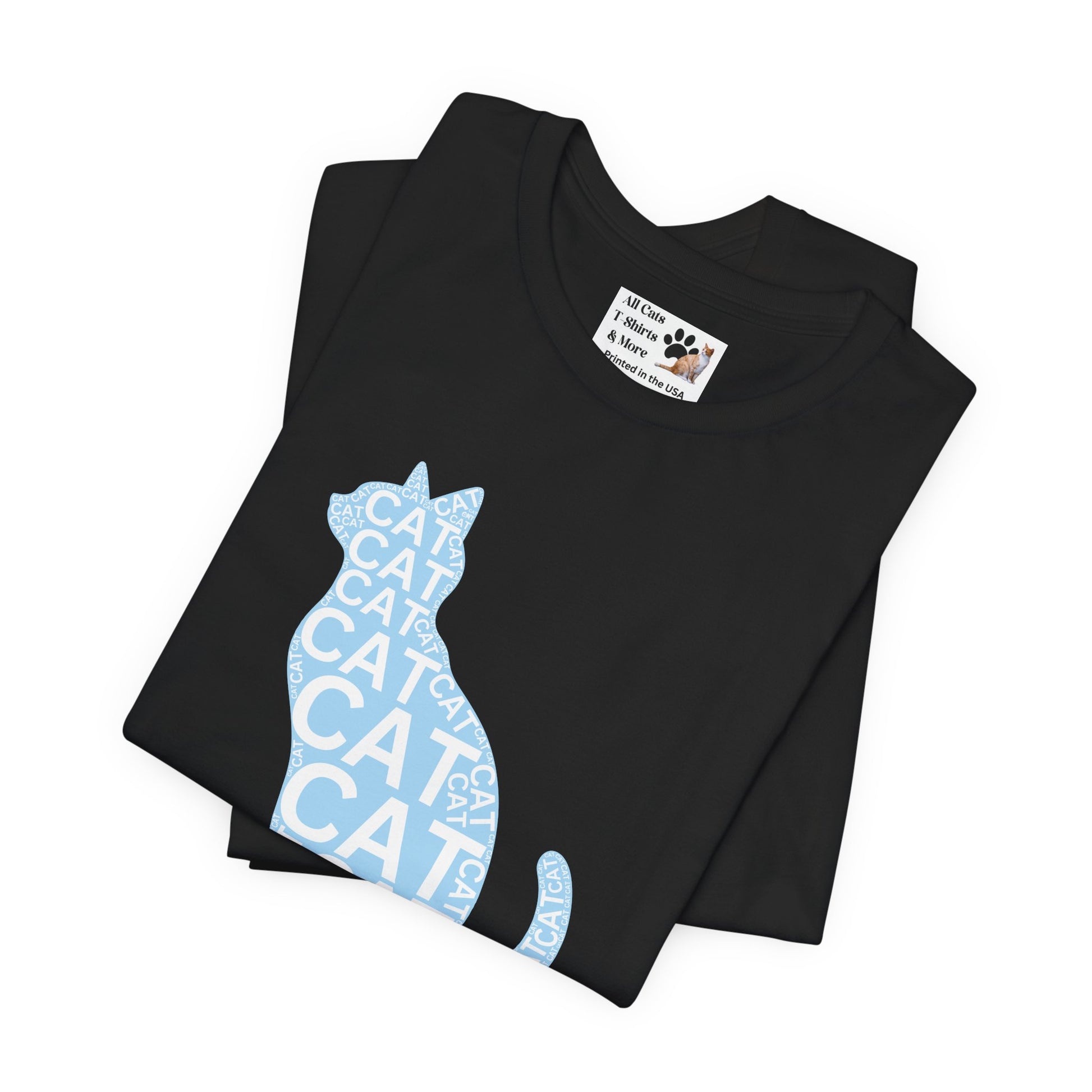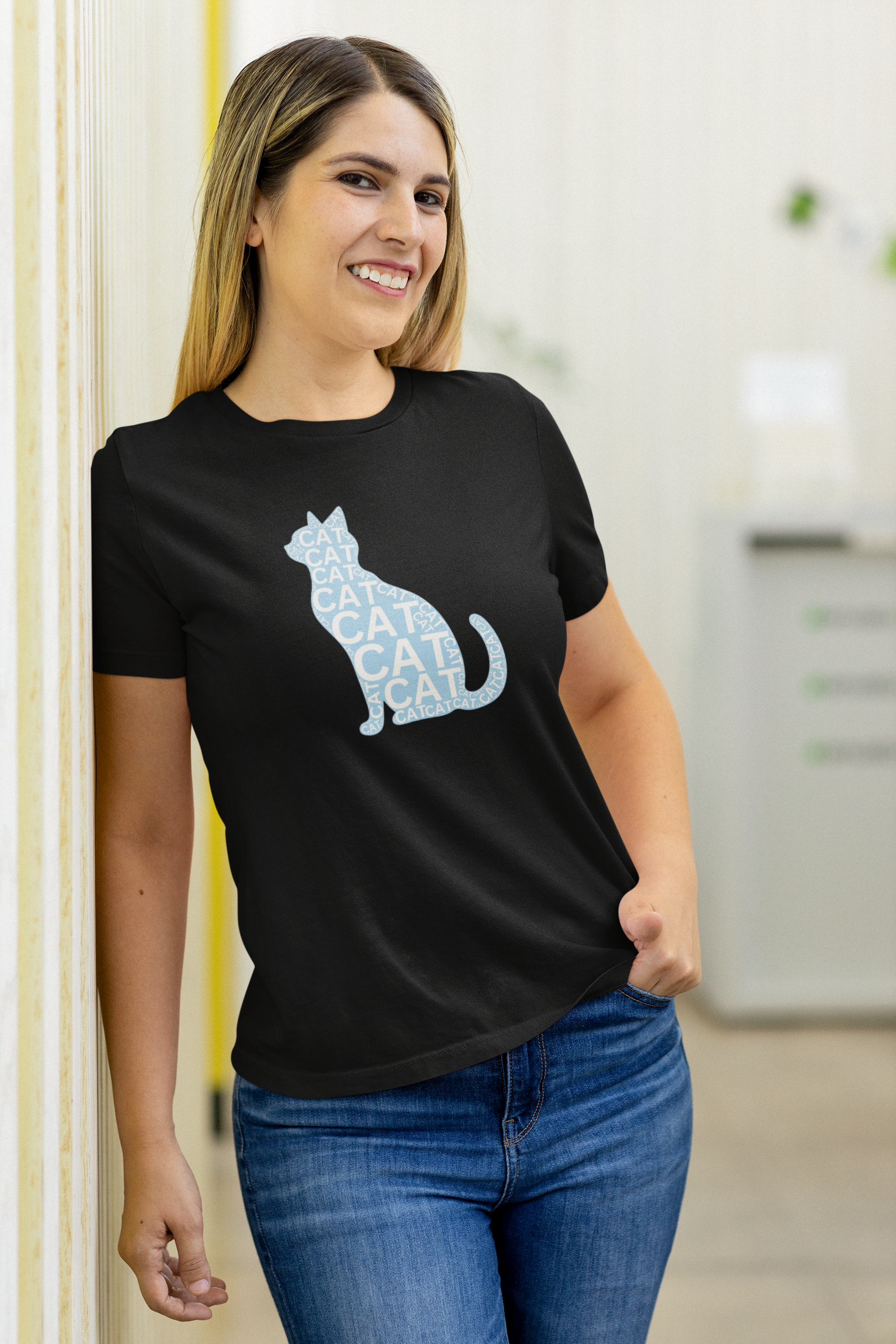 A Cat Silhouette Graphic T-Shirt with the word "Cat" written all over inside it, in different sizes. This fun and quirky design is perfect for cat lovers who want to show off their love for felines in a stylish way. Great for casual wear, relevant for cat lovers, and a great gift for cat enthusiasts.