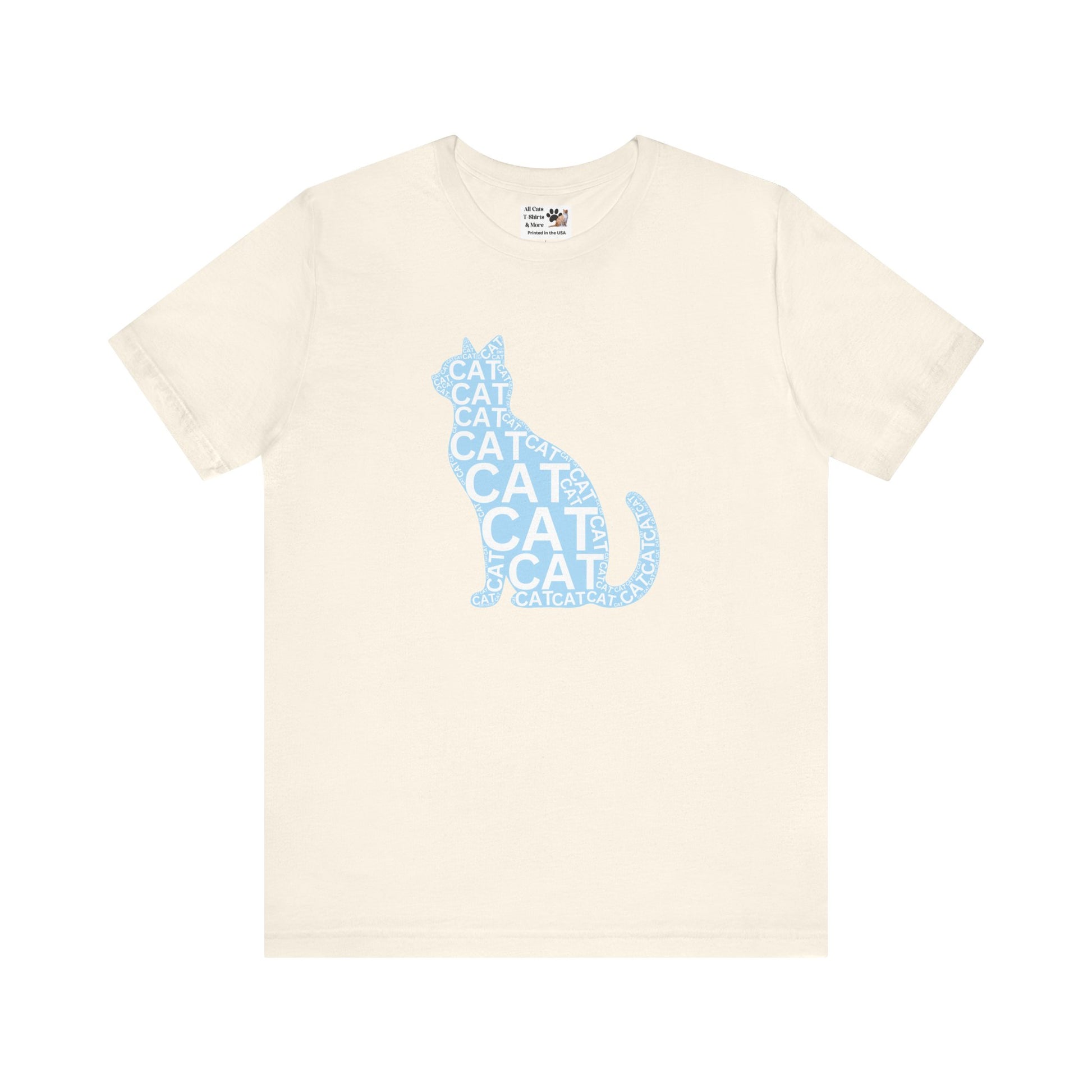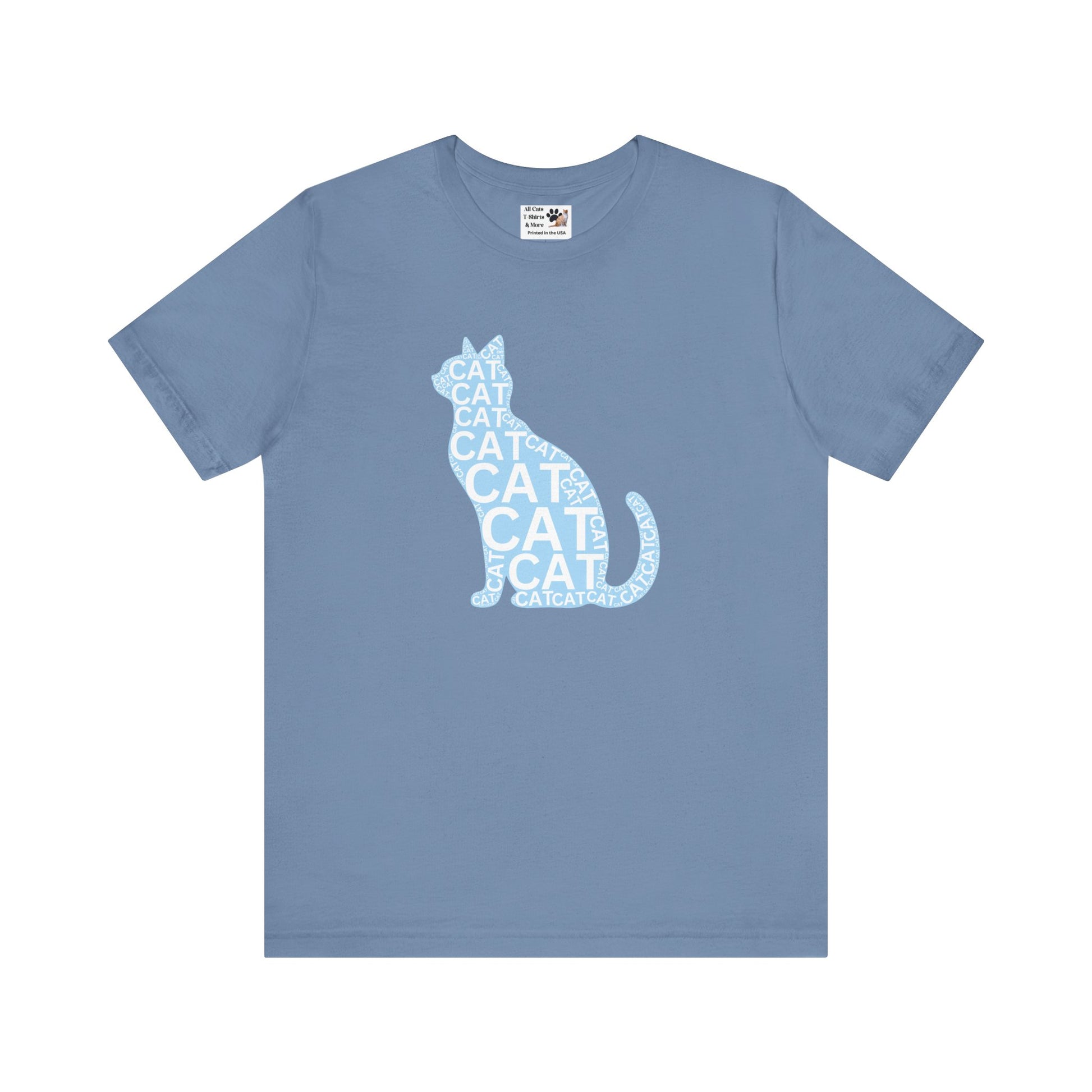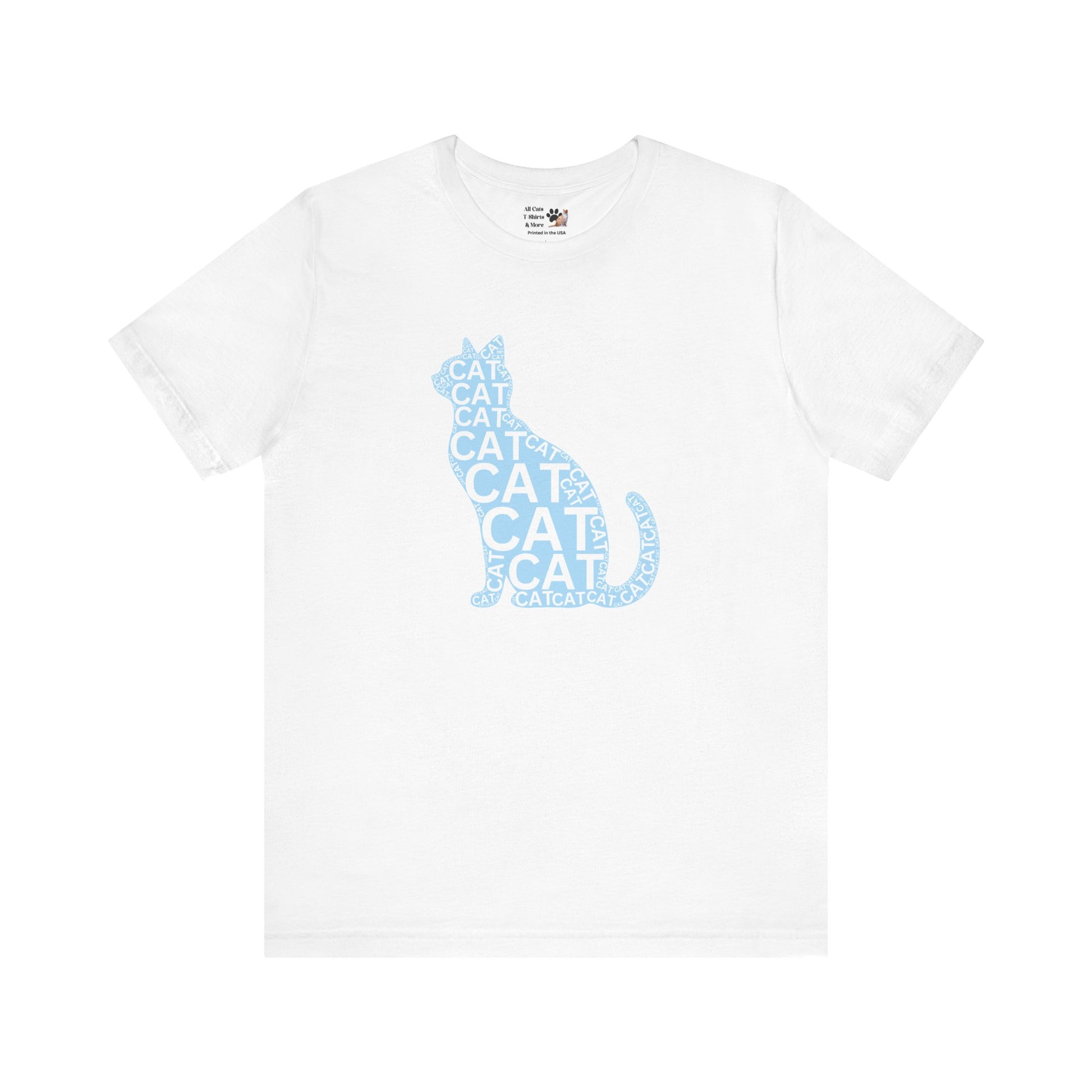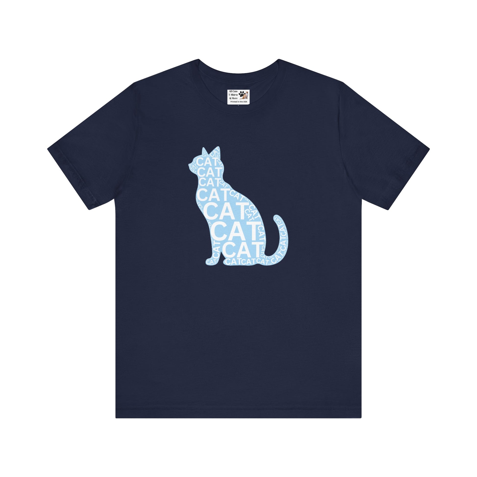 A Cat Silhouette Graphic T-Shirt with the word "Cat" written all over inside it, in different sizes. This fun and quirky design is perfect for cat lovers who want to show off their love for felines in a stylish way. Great for casual wear, relevant for cat lovers, and a great gift for cat enthusiasts.