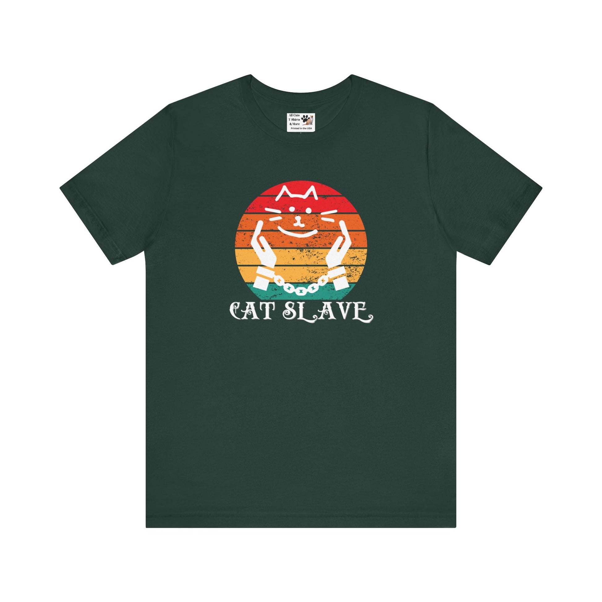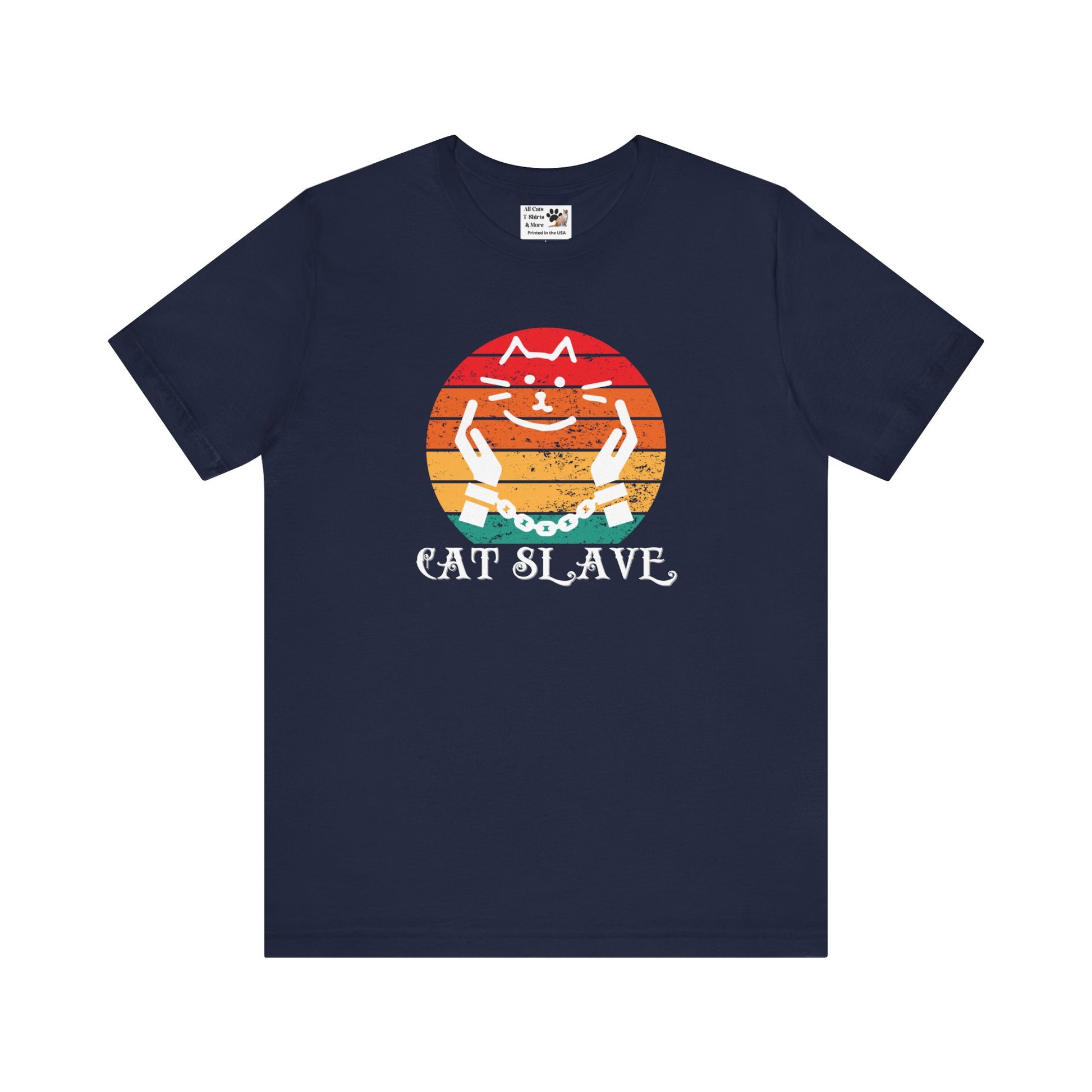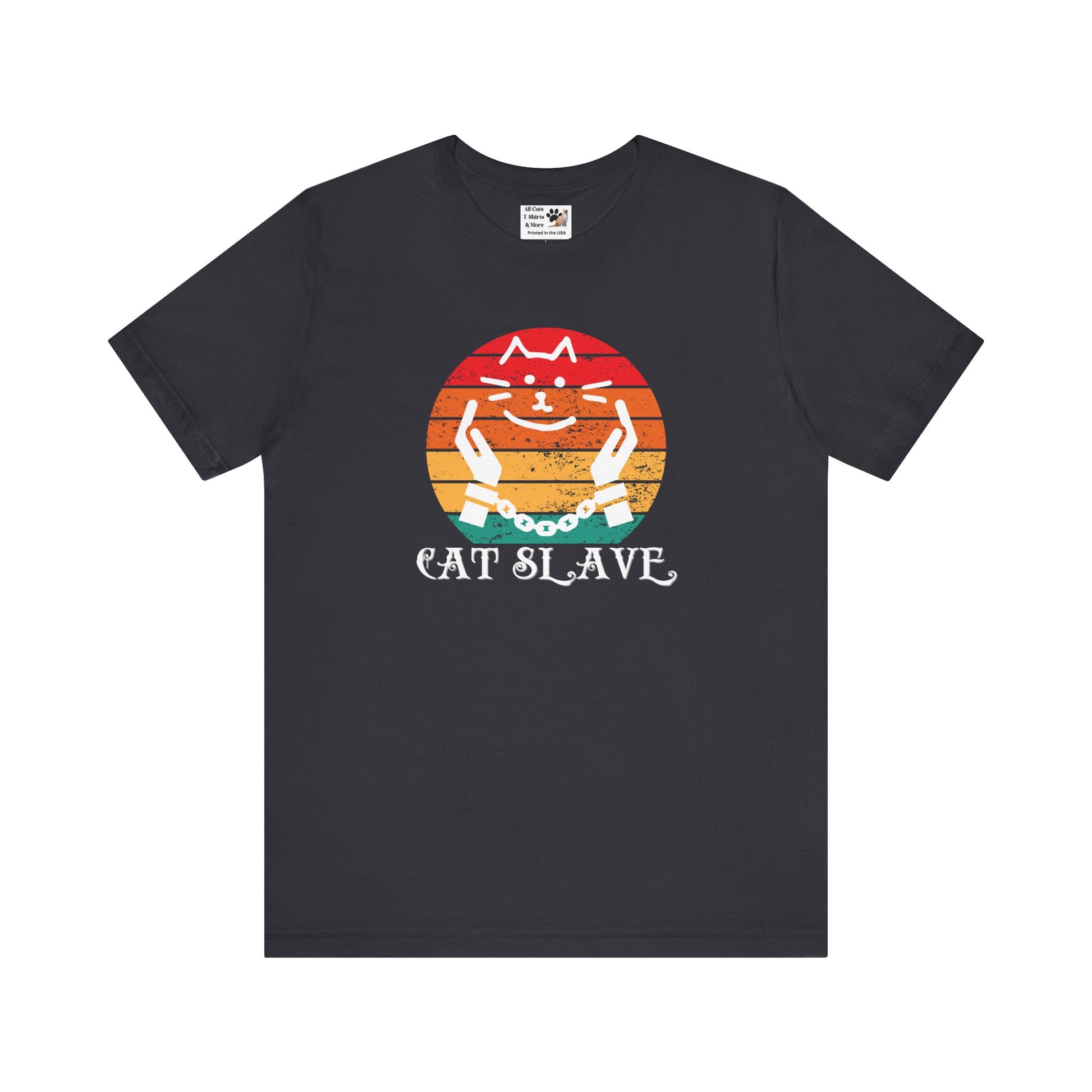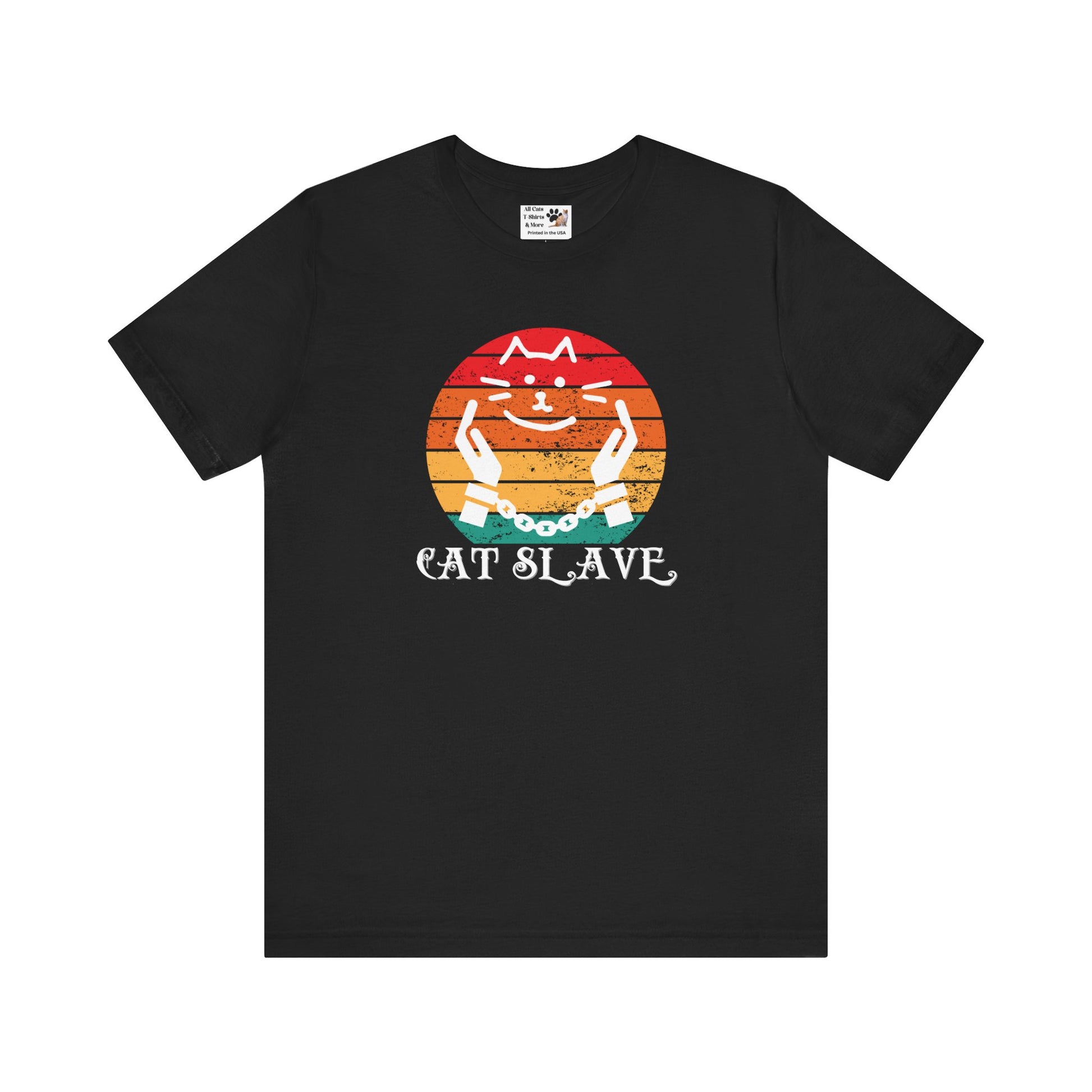 A humorous "Cat Slave Vintage Sunset T-Shirt" for cat owners & lovers who know who the boss really is. This t-shirt exudes a playful and humorous vibe, perfect for cat owners and lovers to show their love for their feline companions. Ideal for casual wear and lounging around, this t-shirt is a great way to express your personality and love for cats.