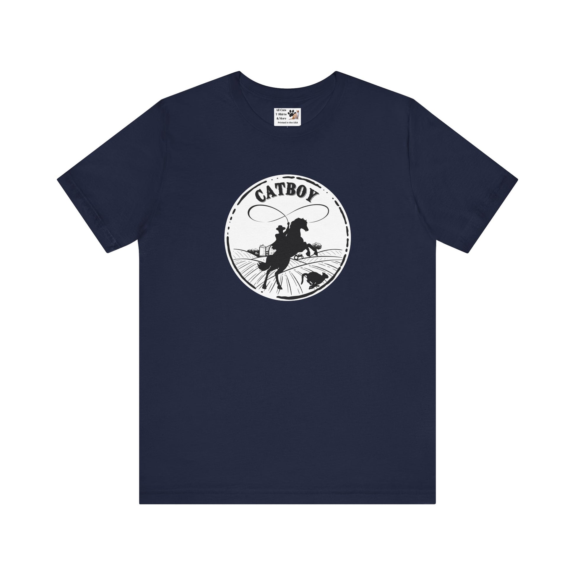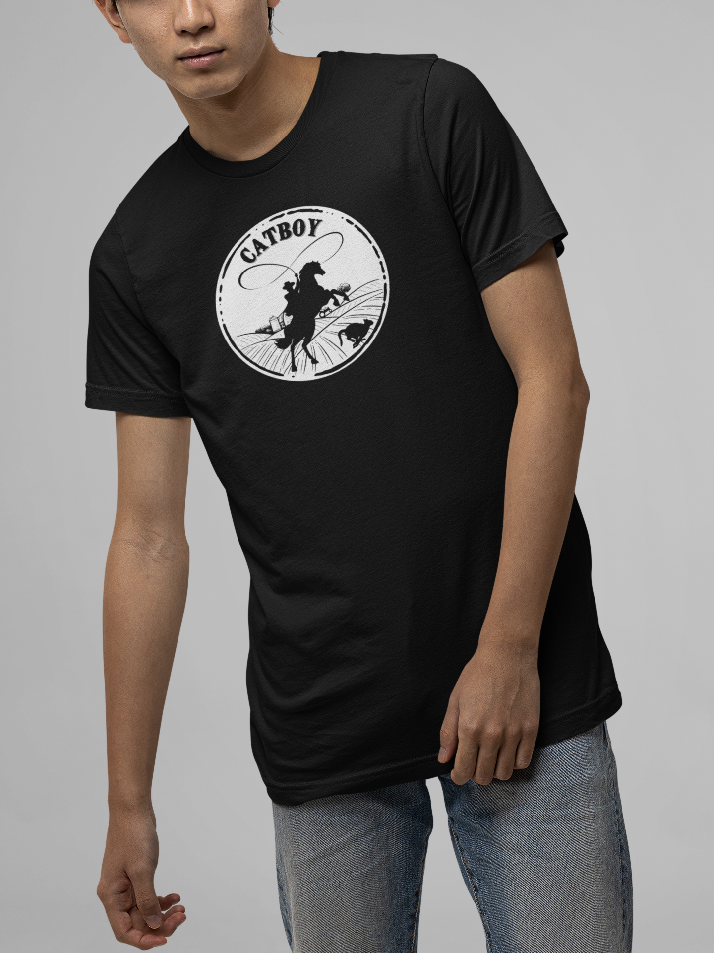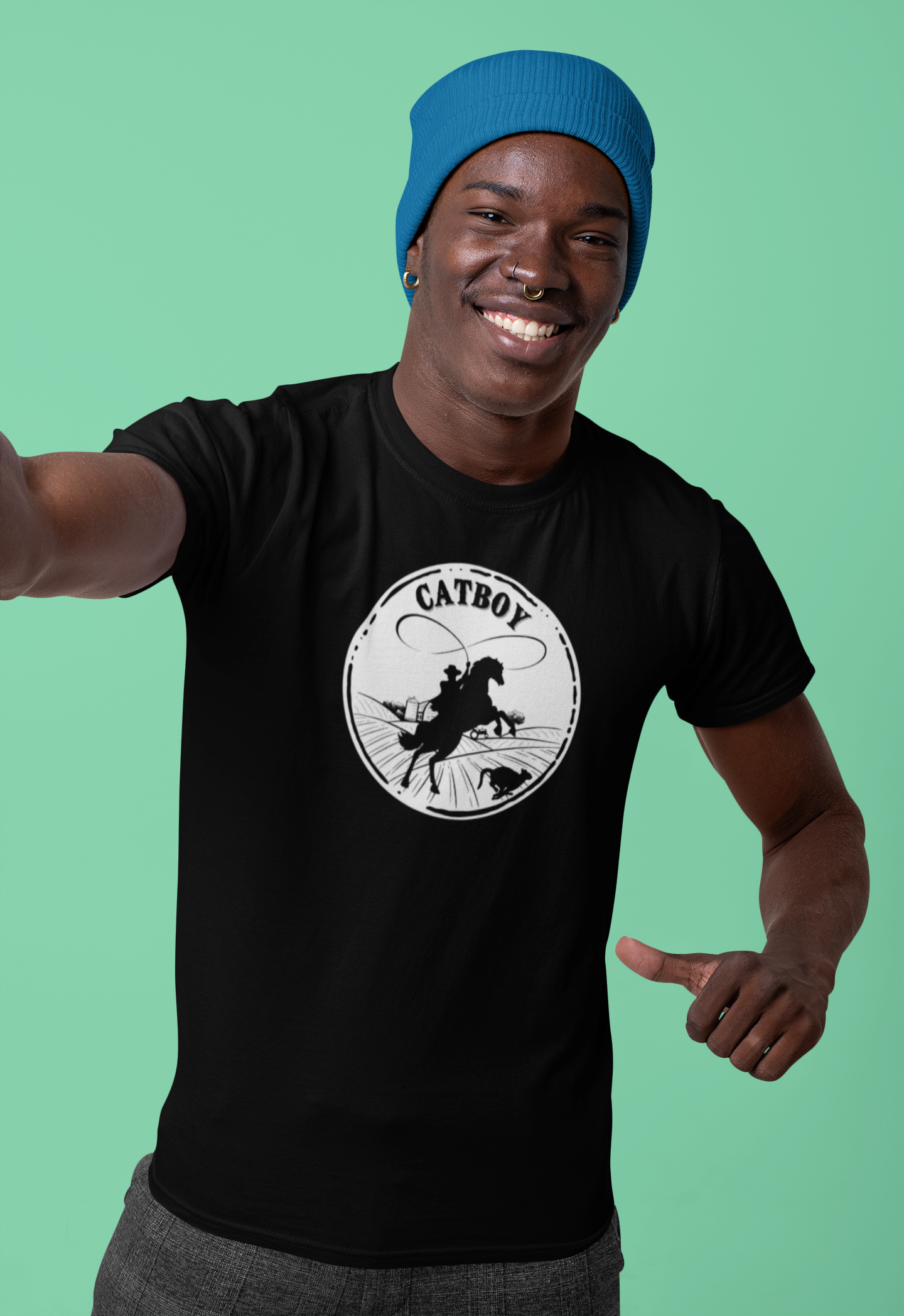 This fun western theme "Catboy" T-Shirt is a play-on the concept of Cowboys; A "CATboy" is someone who loves and looks after CATS instead of horses or cattle on a farm or ranch. (A just for fun T-Shirt; It in no way is meant to depict cats being harmed in any way. We LOVE cats!)