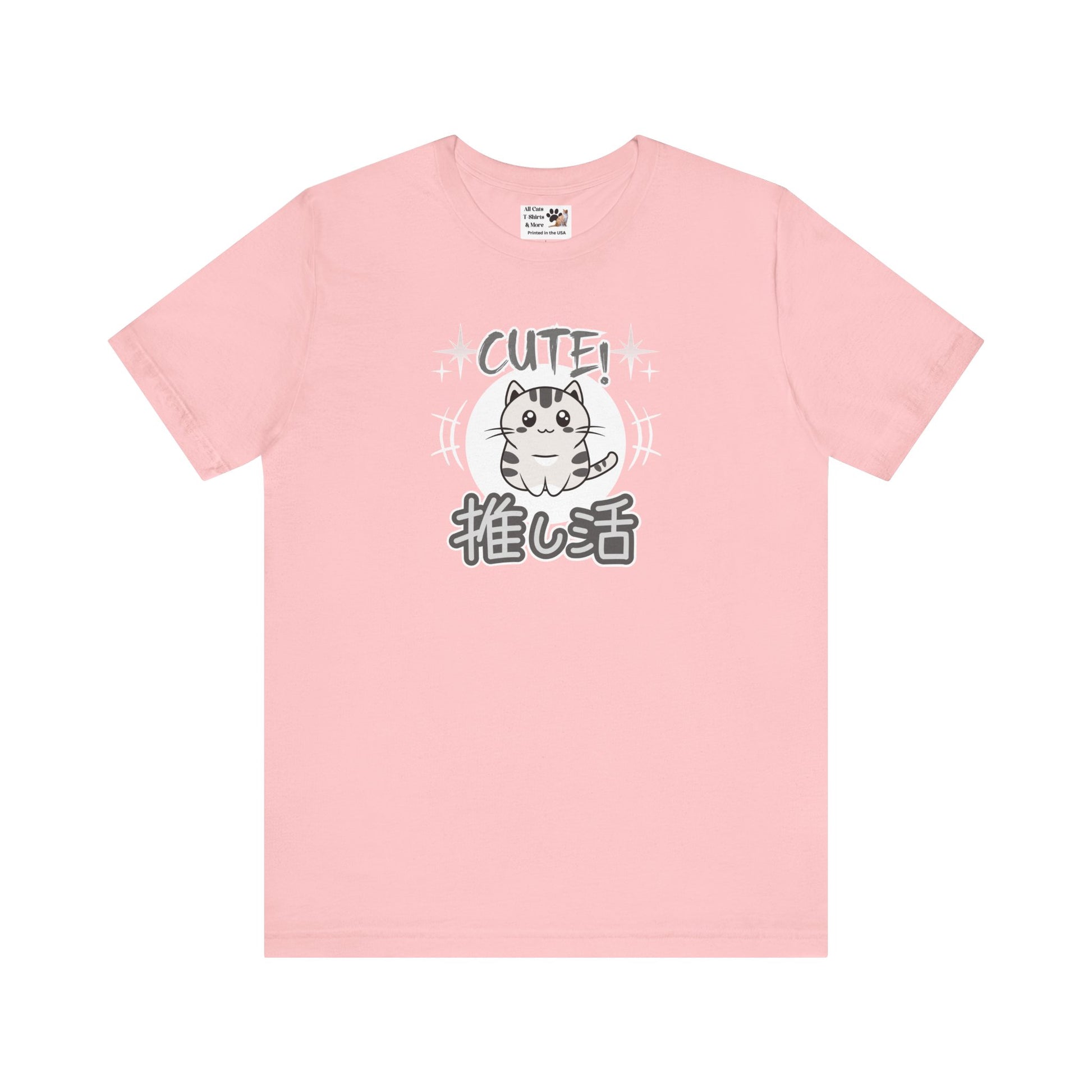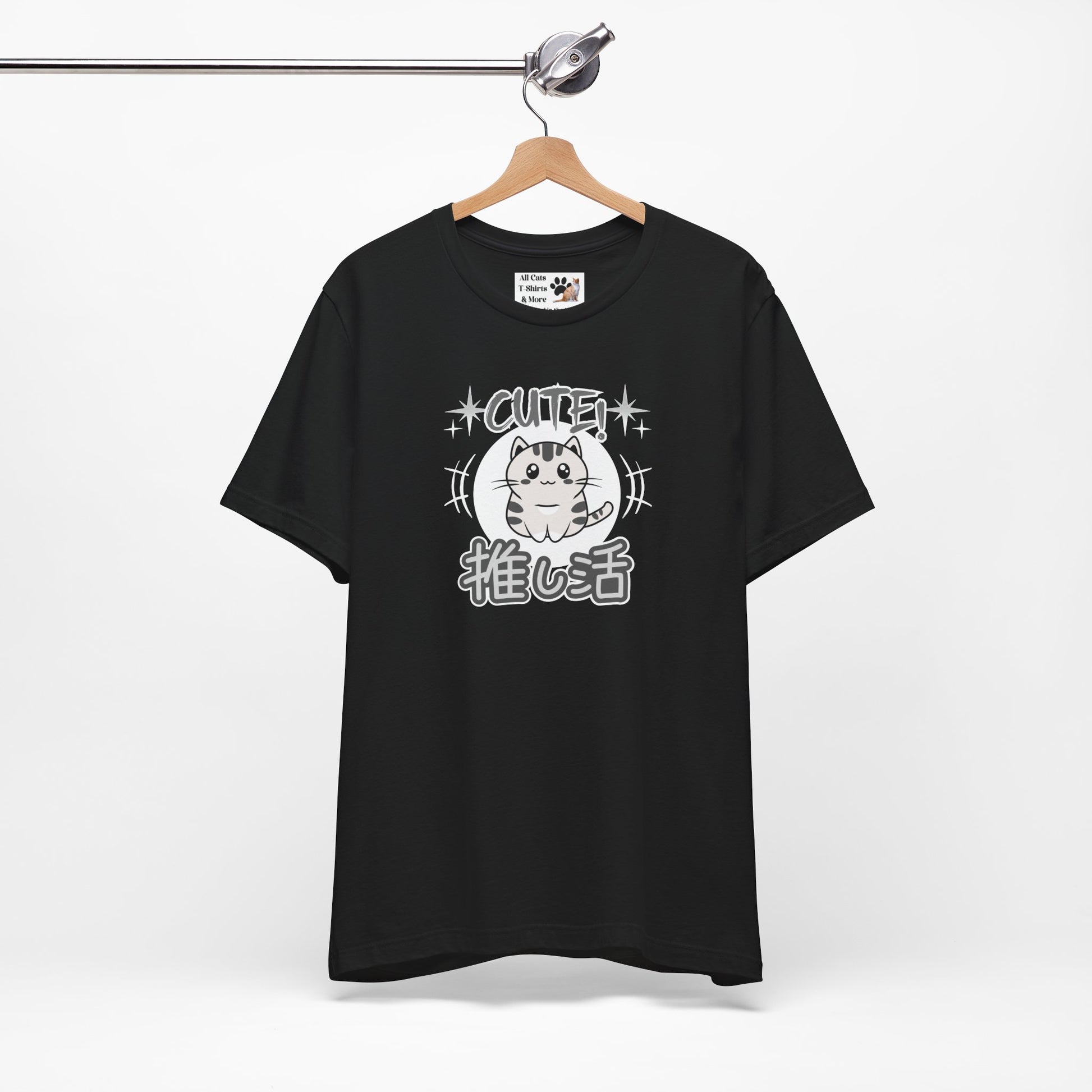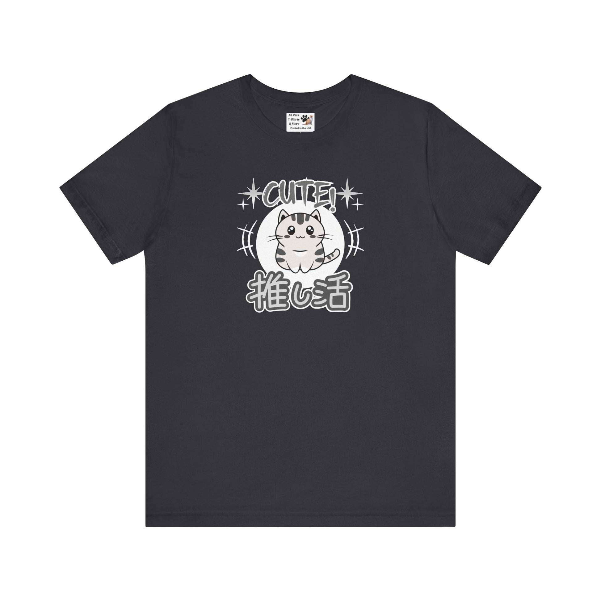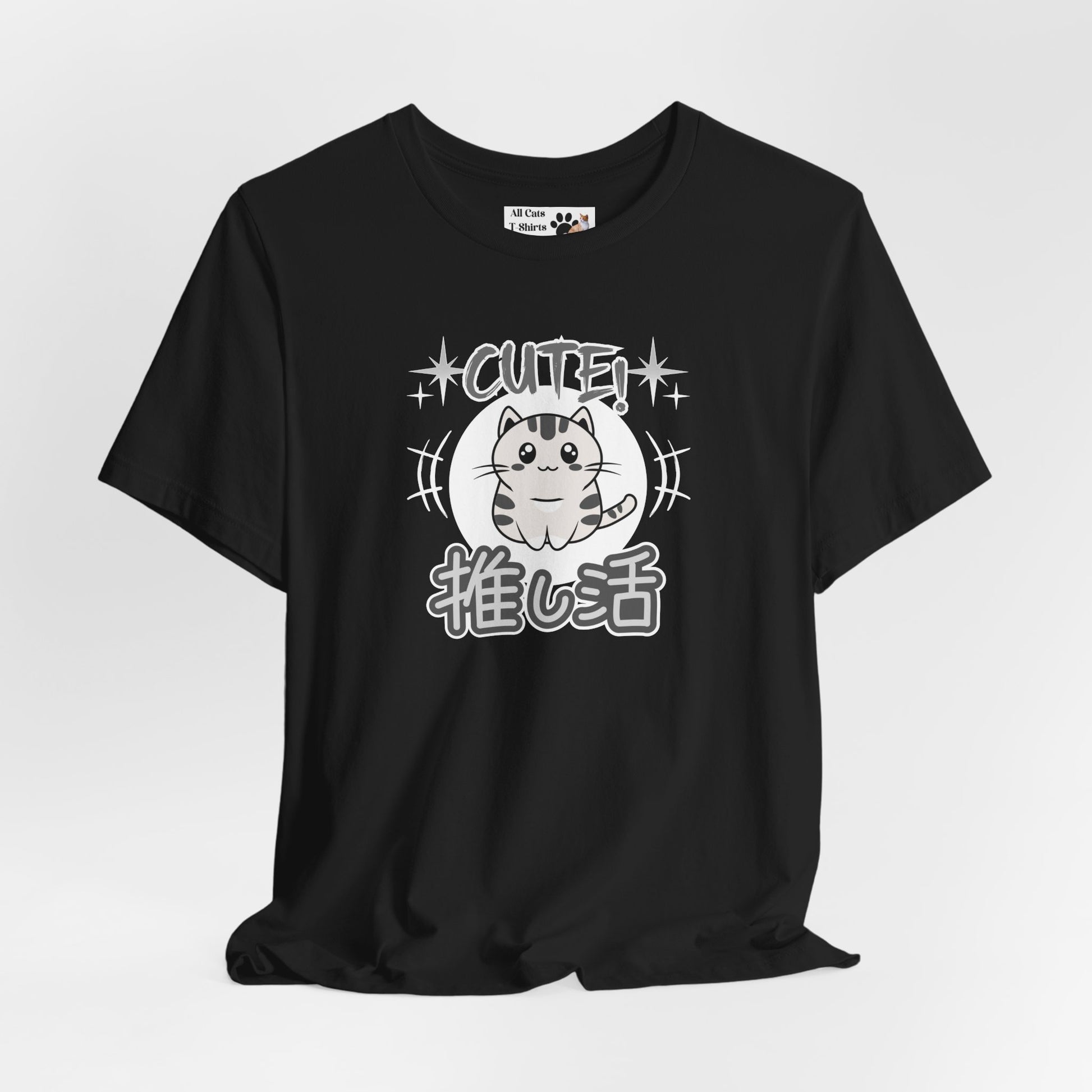 A cute Japanese style T-shirt in grey tones of a little cat and with the word "cute" above and in Japanese Kanji script below: "Oshikatsu" meaning "Supporting my Fave" or favorite.