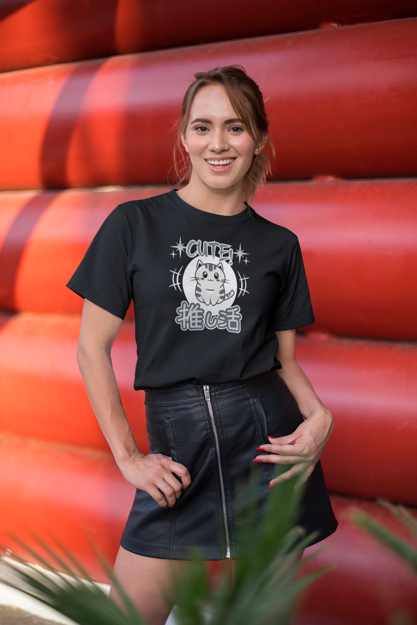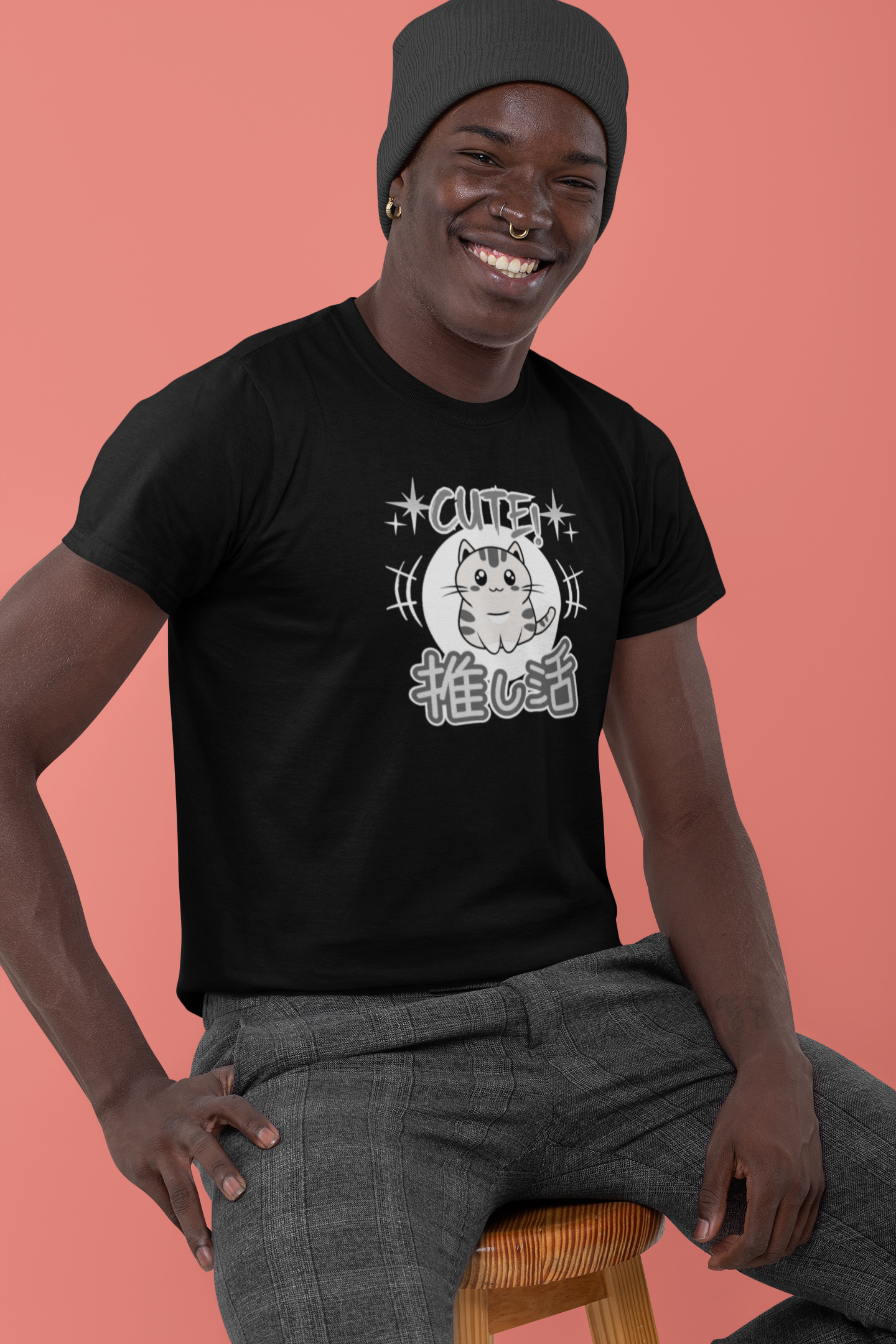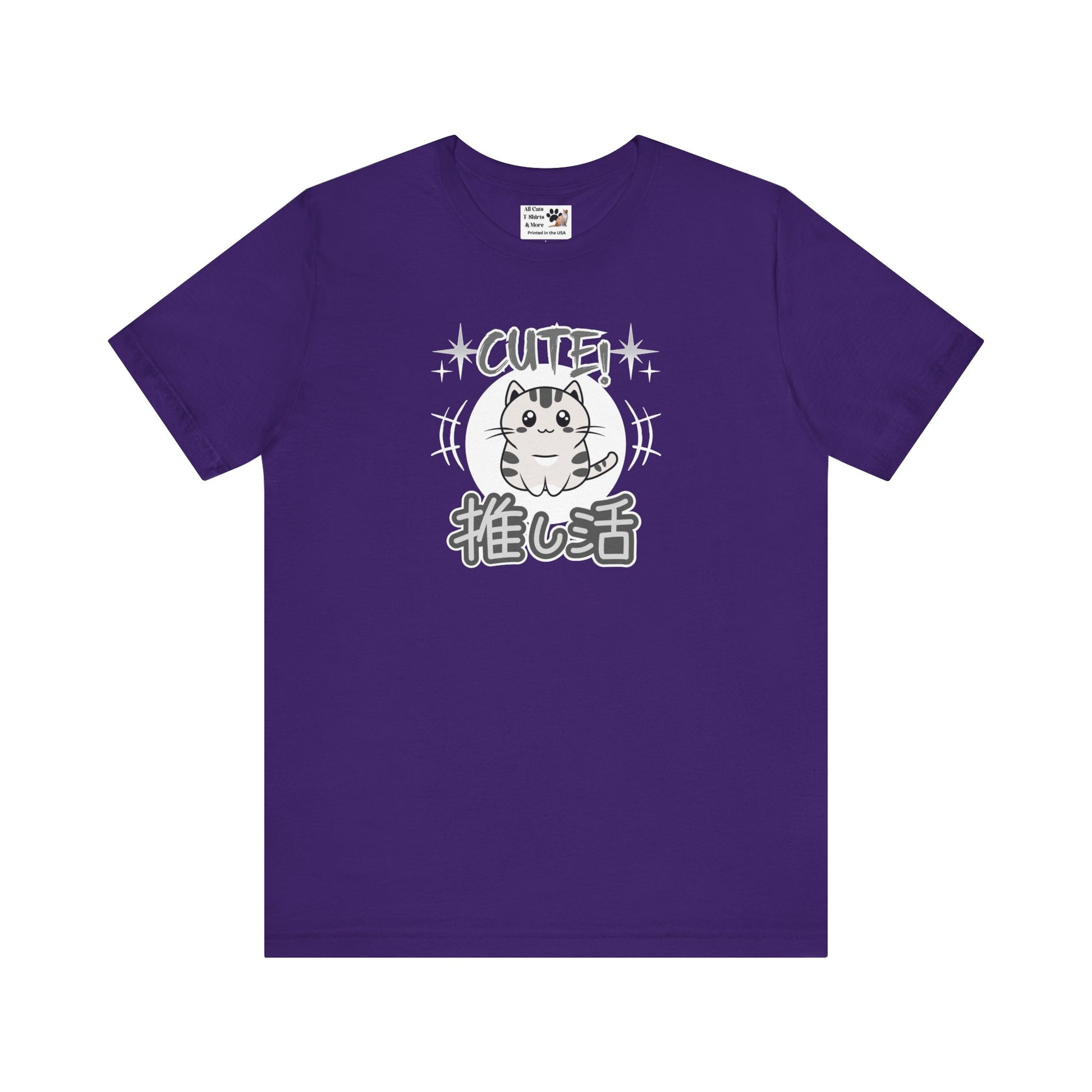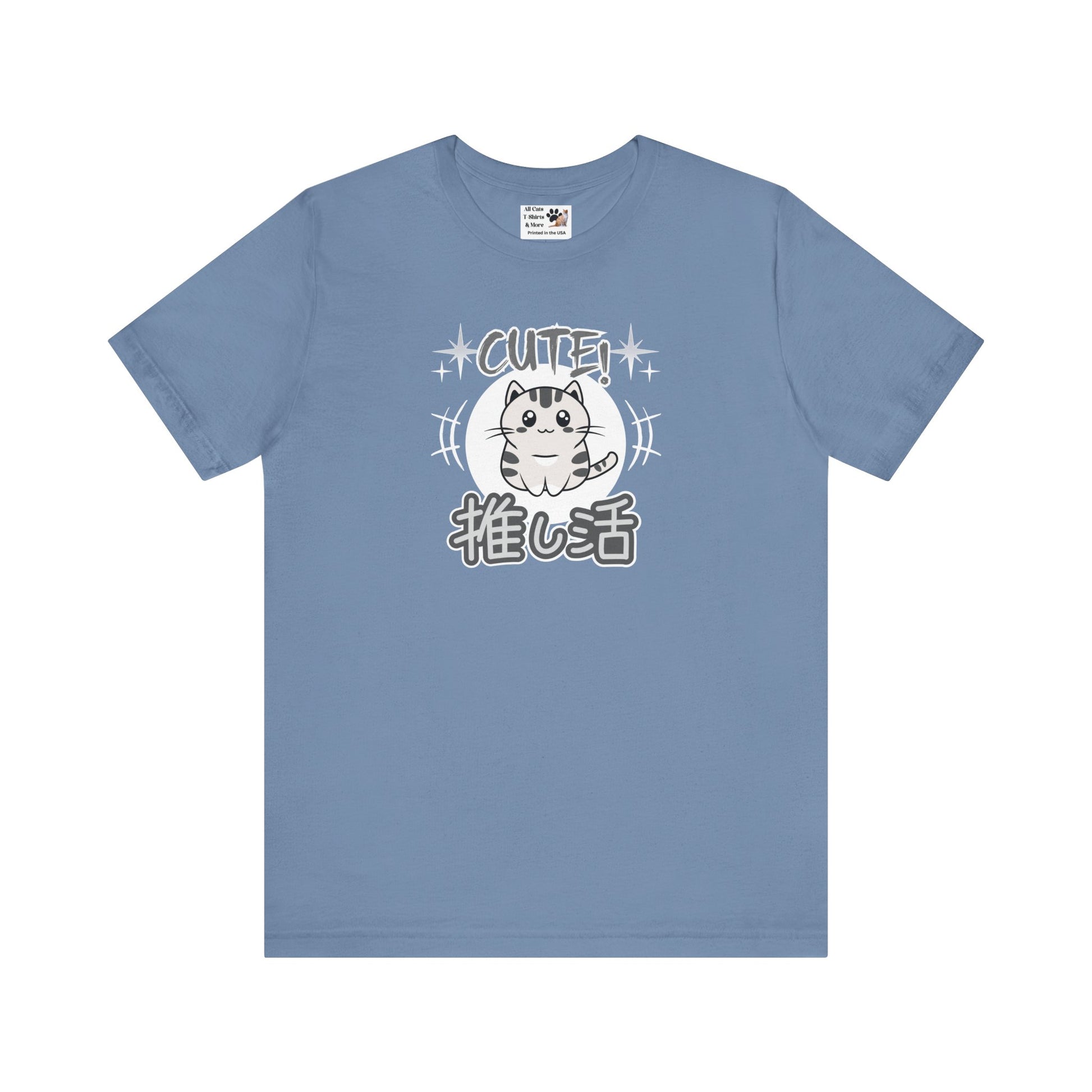 A cute Japanese style T-shirt in grey tones of a little cat and with the word "cute" above and in Japanese Kanji script below: "Oshikatsu" meaning "Supporting my Fave" or favorite.