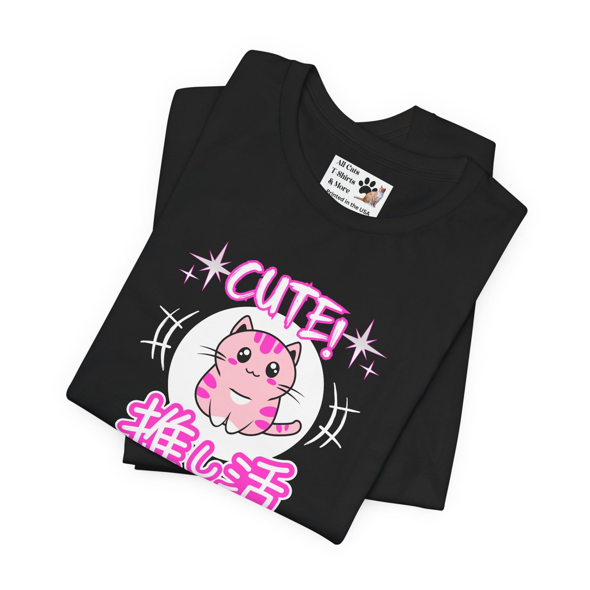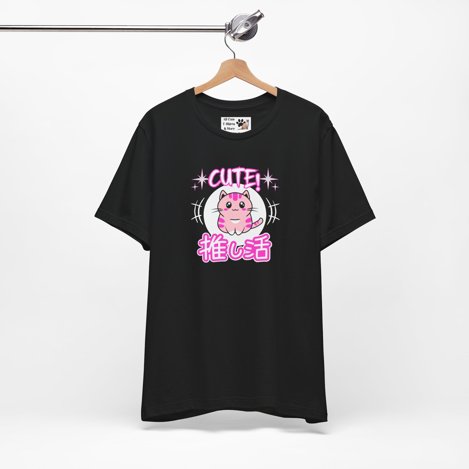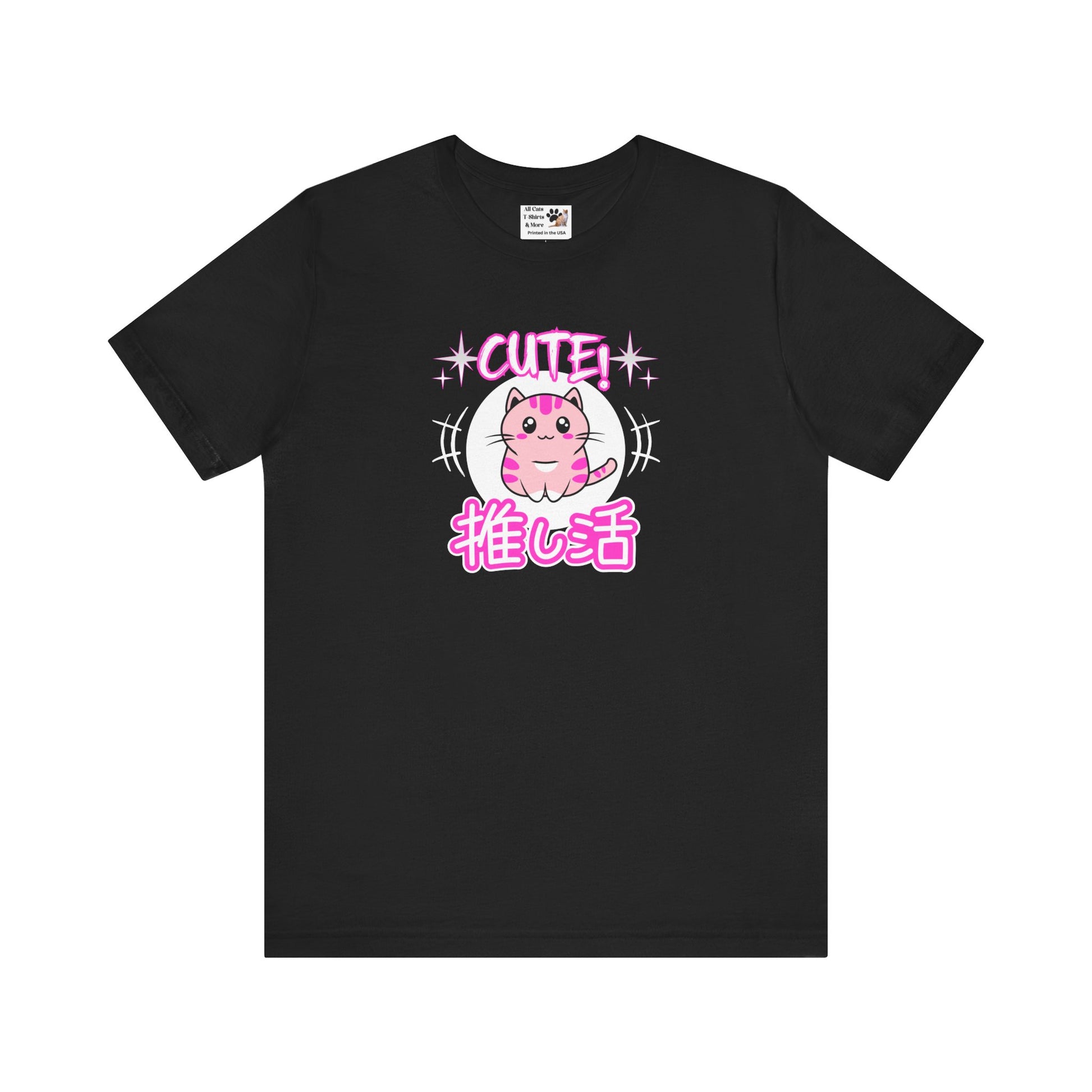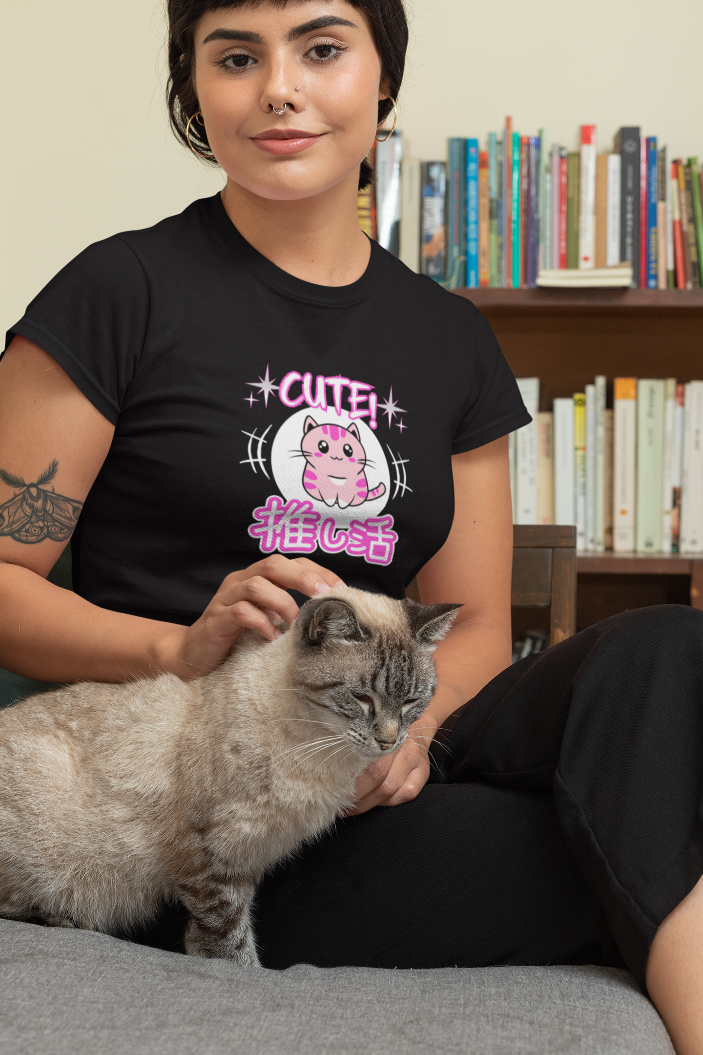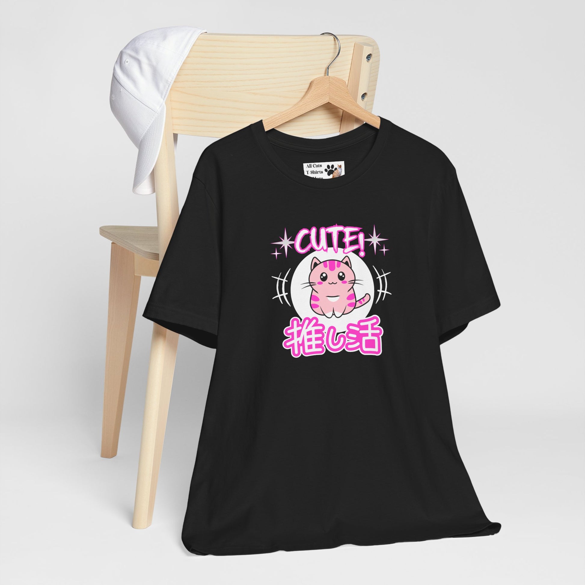 A cute Japanese style T-shirt in pink colors of a little cat, with the word "cute" above and in Japanese Kanji script below: "Oshikatsu" meaning "Supporting my Fave" or favorite.