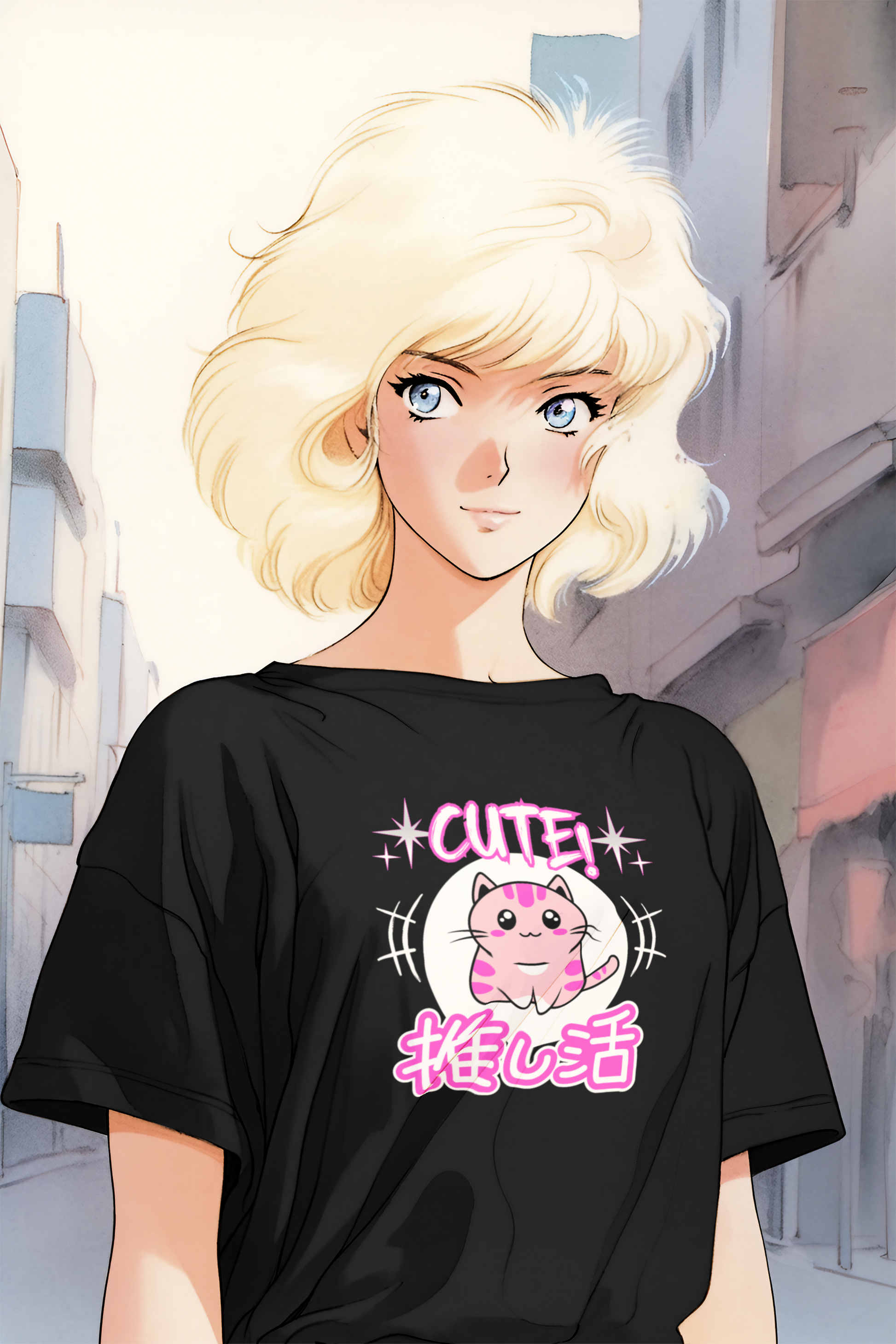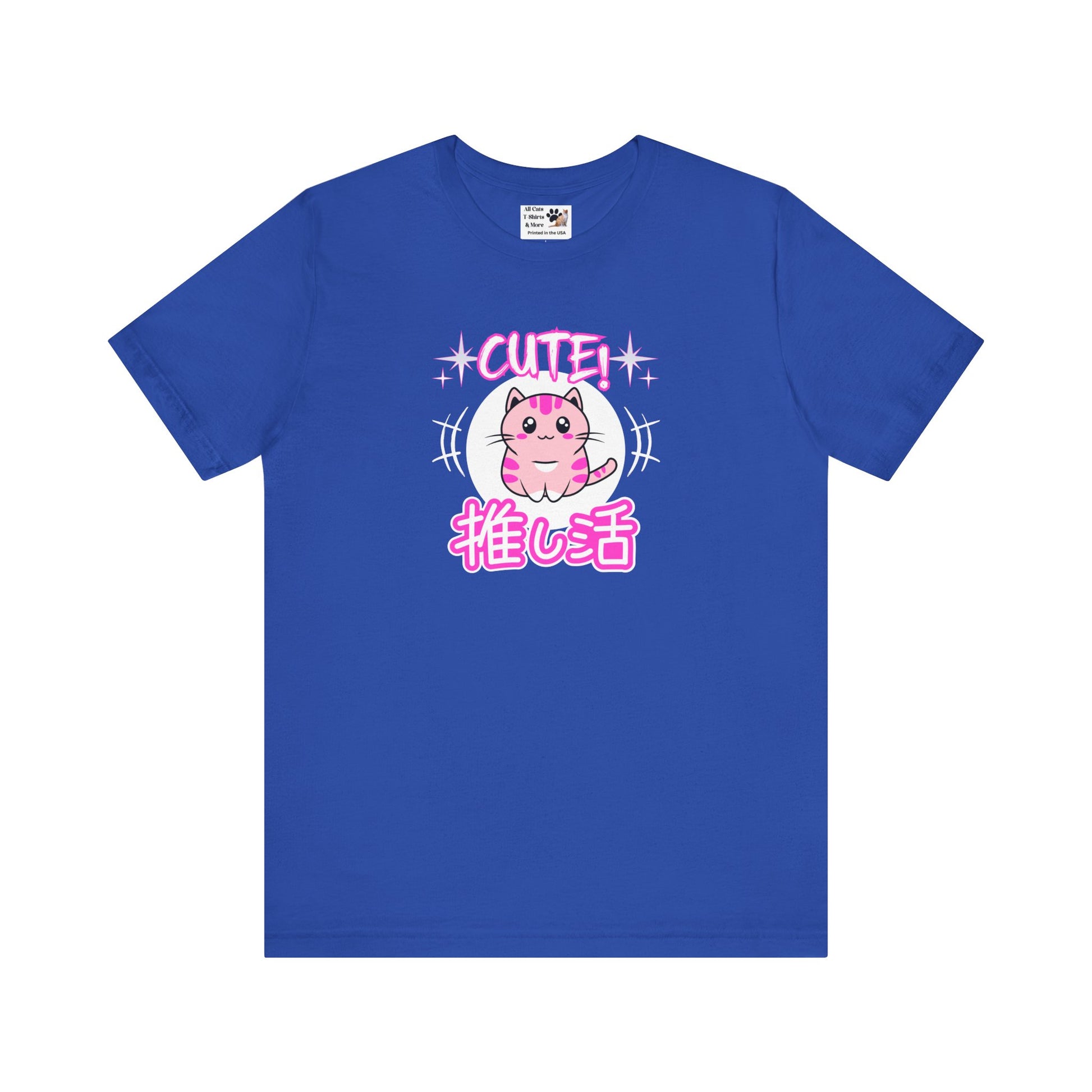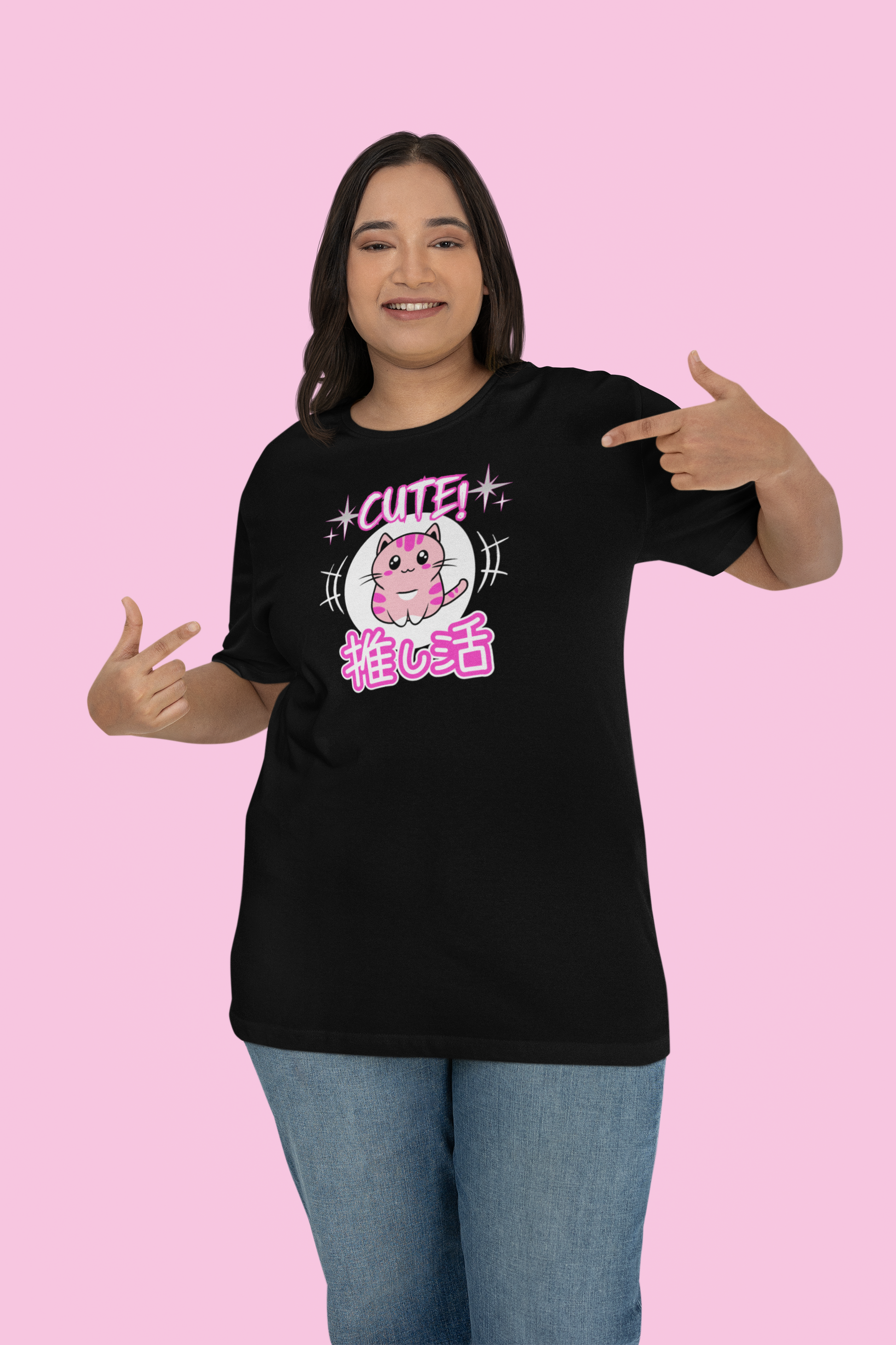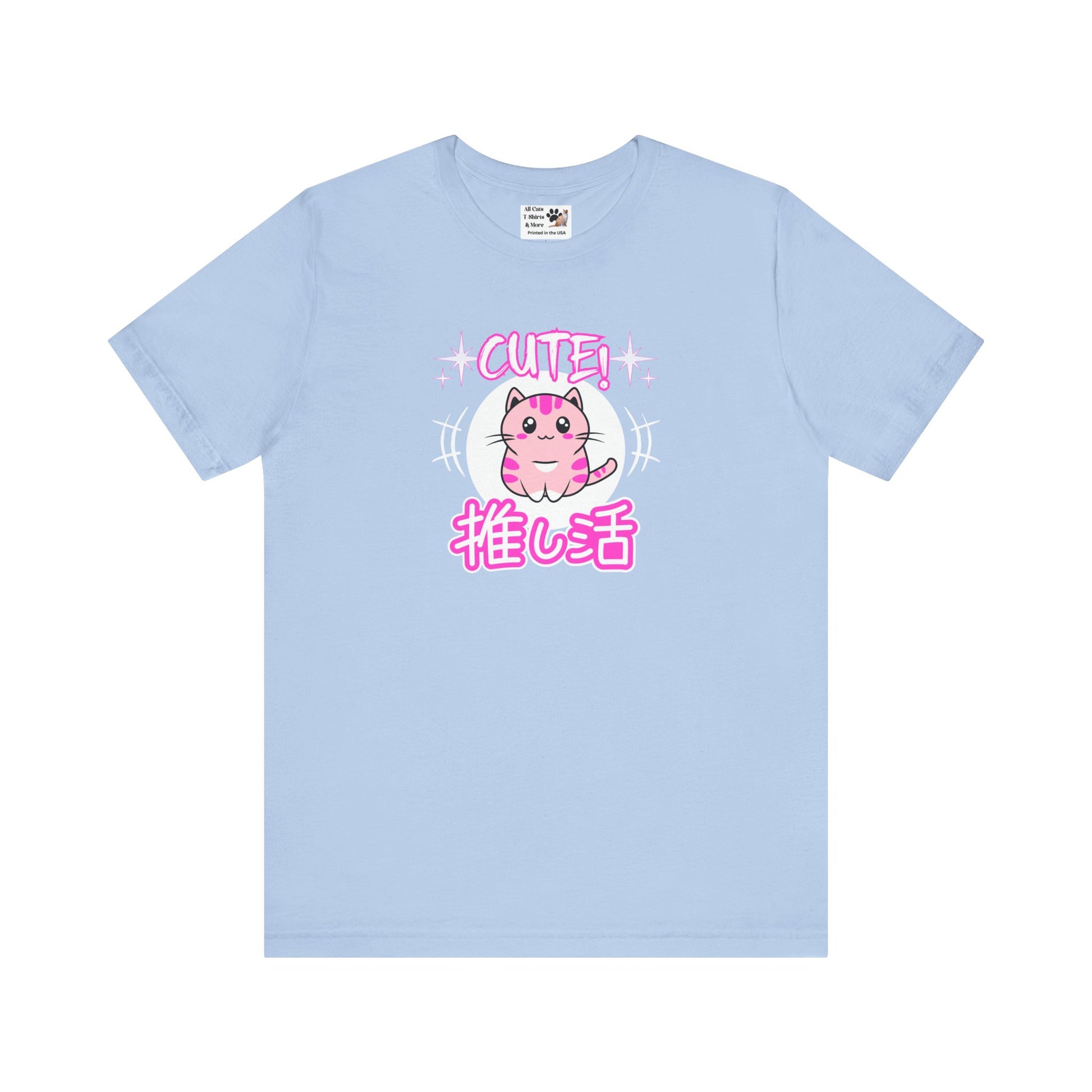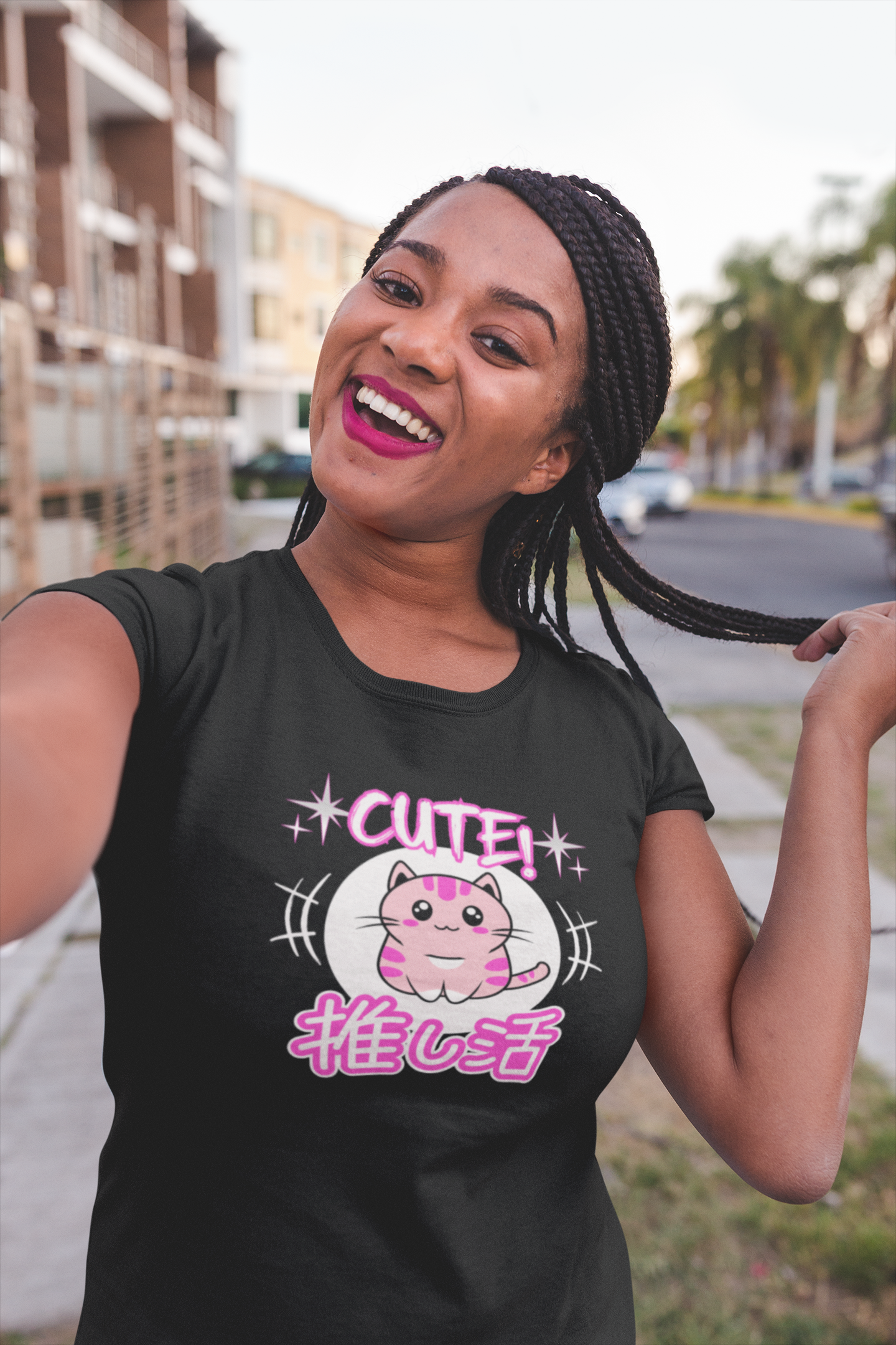 A cute Japanese style T-shirt in pink colors of a little cat, with the word "cute" above and in Japanese Kanji script below: "Oshikatsu" meaning "Supporting my Fave" or favorite.