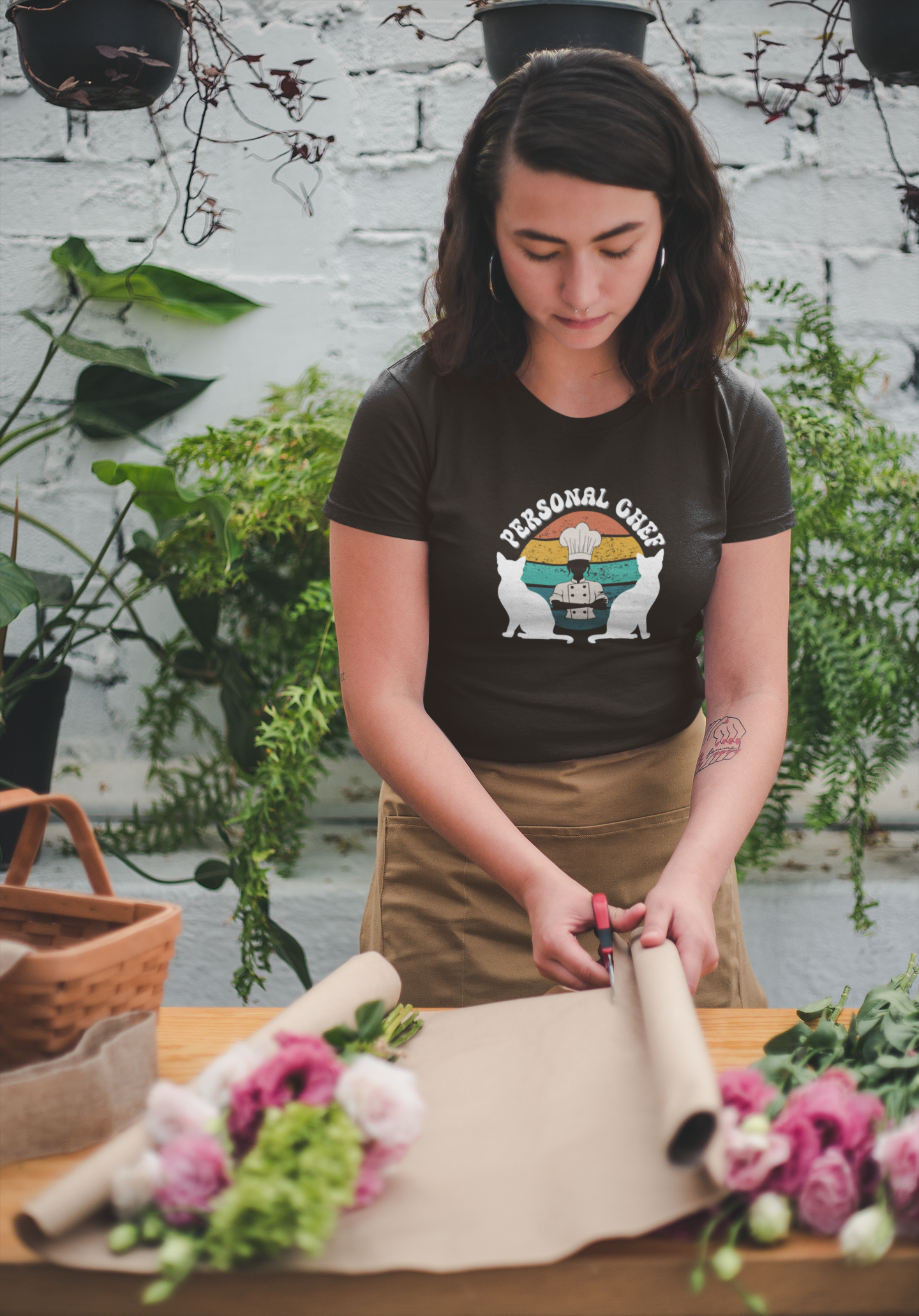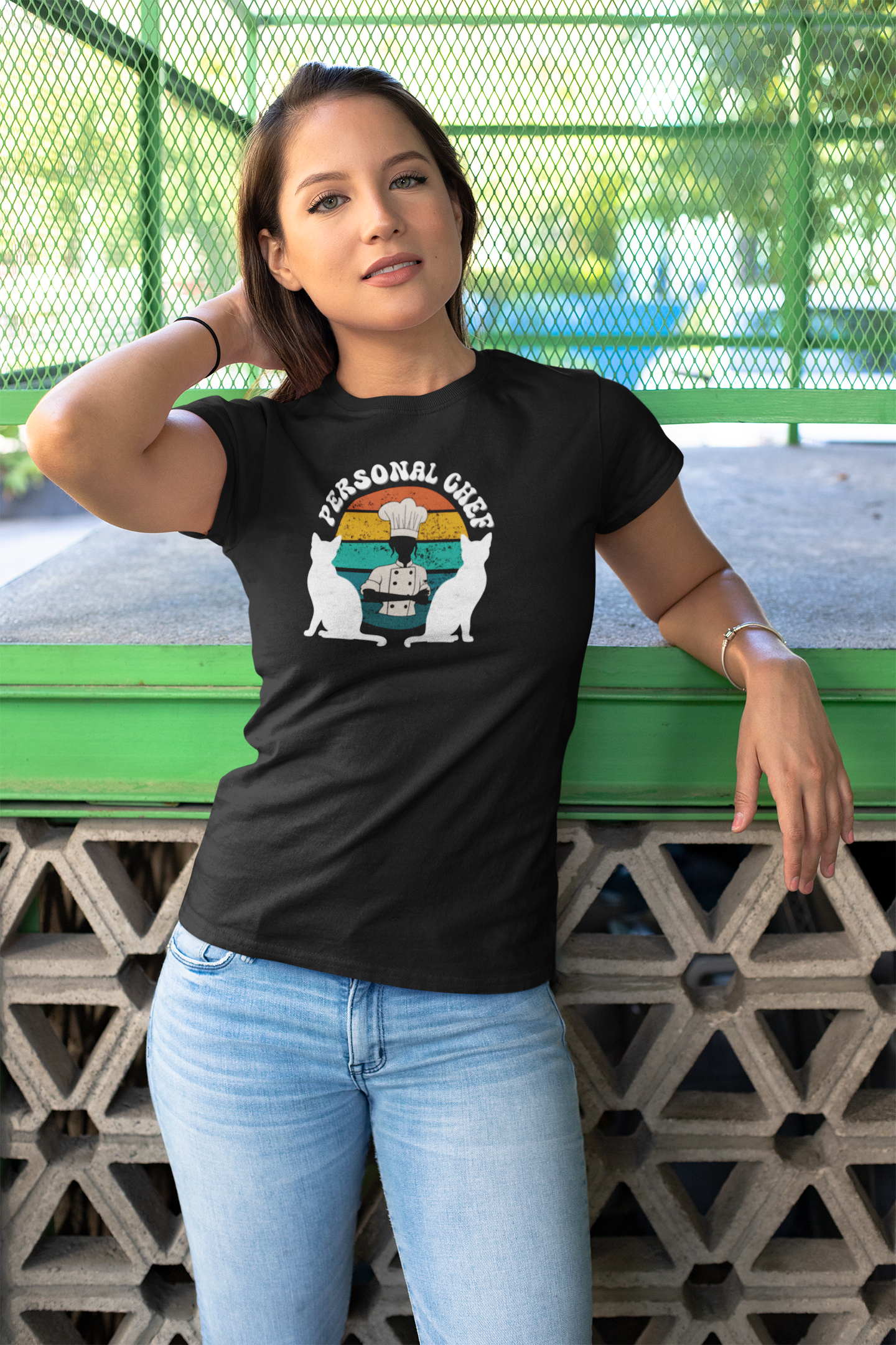 Are you a "PERSONAL CHEF" for your kitty? Introducing the Personal Chef for Cats T-shirts theme; these T-shirts help proud cat owners make a fun and funny statment about being their cats "personal chef" (Or the opener of the can of cat food!) This T-Shirt features two white cats & a chefs silhouette on a distressed style vintage sunset background. This fun and quirky design is perfect for cat lovers and can be a great conversation starter and a playful addition to a casual outfit. Ideal for wearing during everyday activities or while hanging out with friends. Relevant for cat owners and parents and those who enjoy unique and humorous clothing.