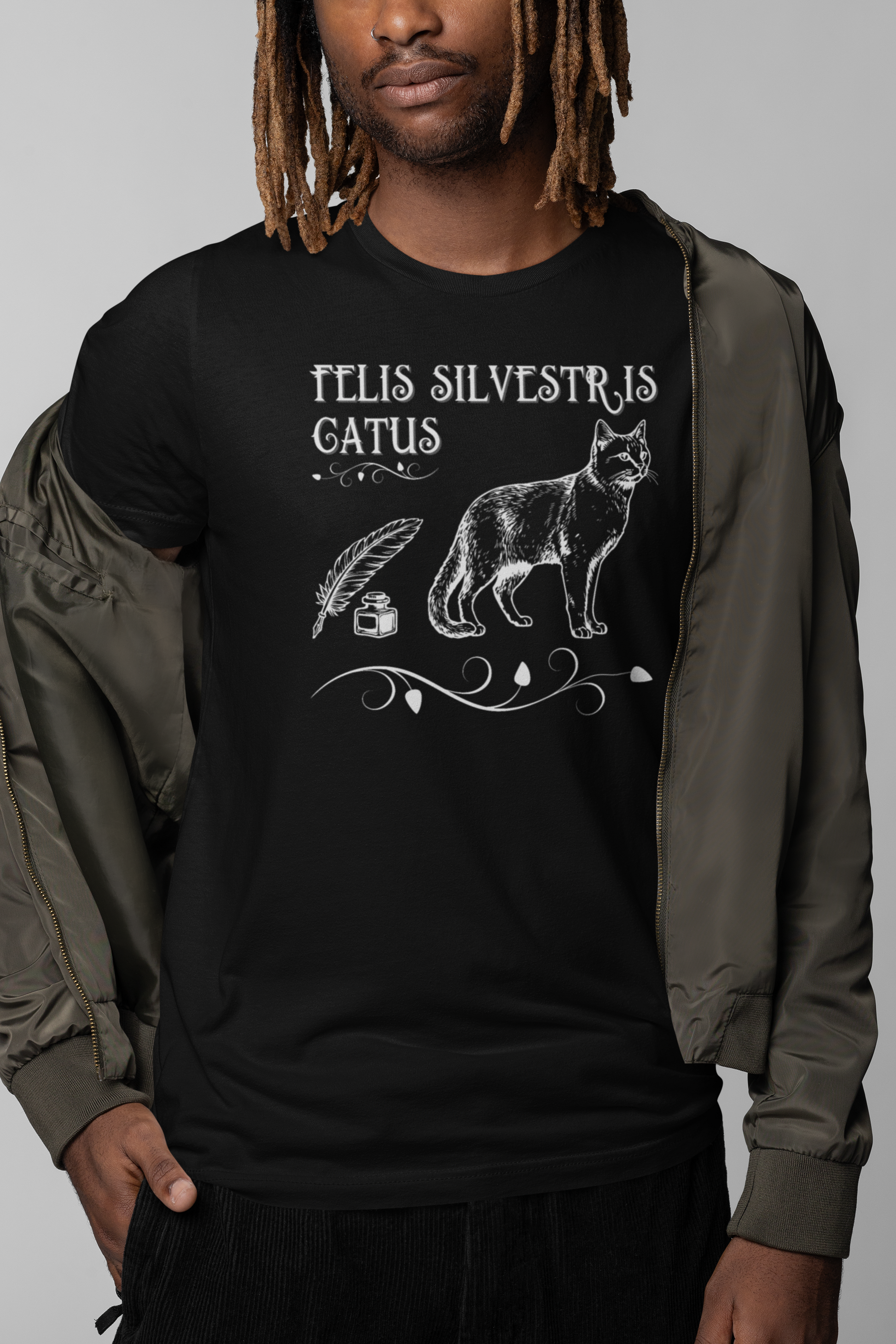 Felis Silvestris Catus. (basically meaning domestic cat) A fun "scientificky" Cat T-Shirt; the design gives a quirky and intellectual vibe, making it a great conversation starter. Ideal for casual wear or as a unique gift for birthdays, holidays, or special occasions. A simple and cool design.