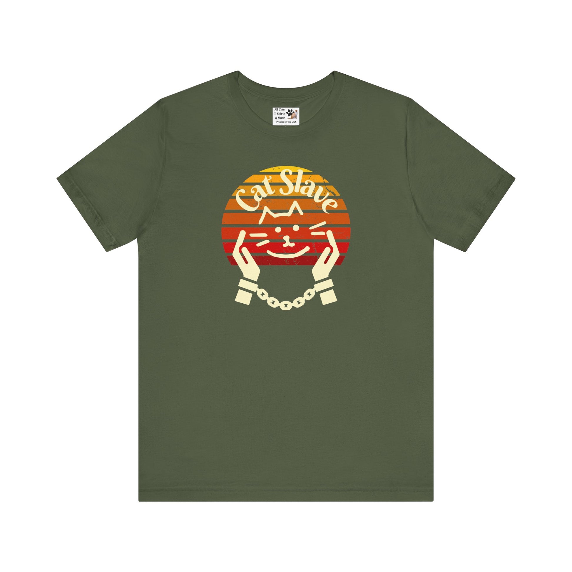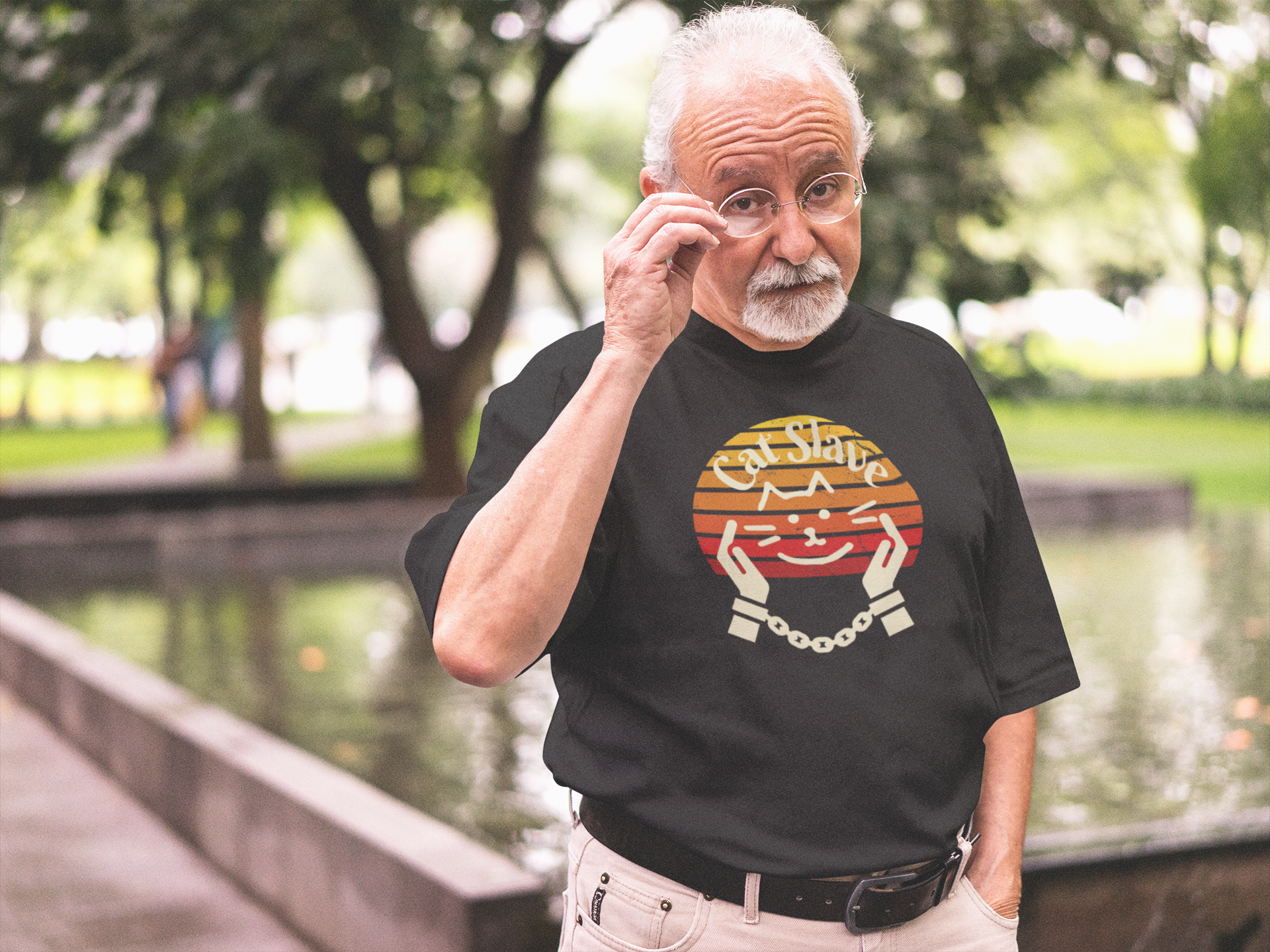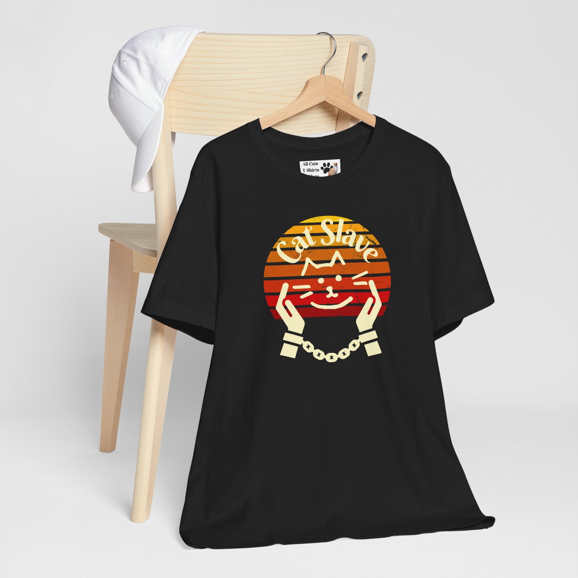 A humorous "Cat Slave Vintage Sunset T-Shirt" for cat owners & lovers who know who the boss really is. This t-shirt exudes a playful and humorous vibe, perfect for cat owners and lovers to show their love for their feline companions. Ideal for casual wear and lounging around, this t-shirt is a great way to express your personality and love for cats.
