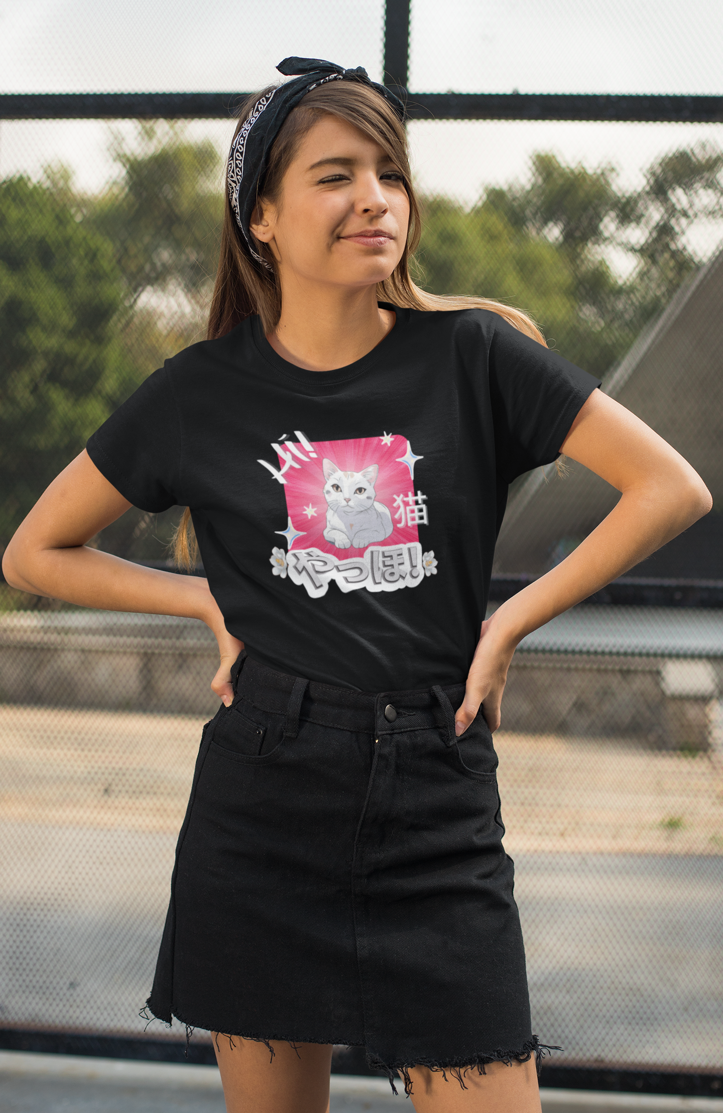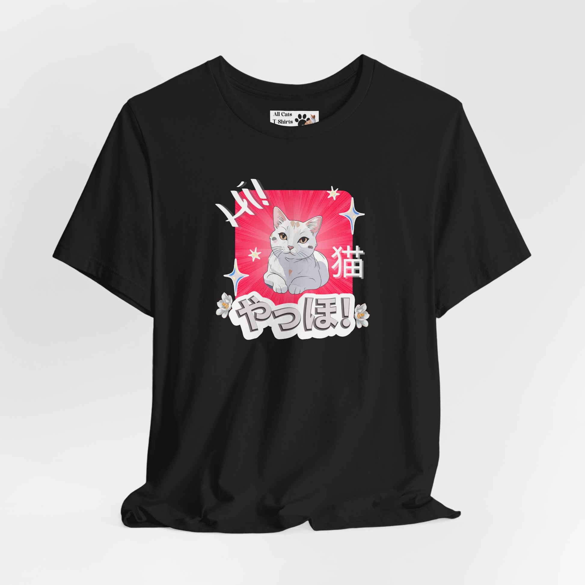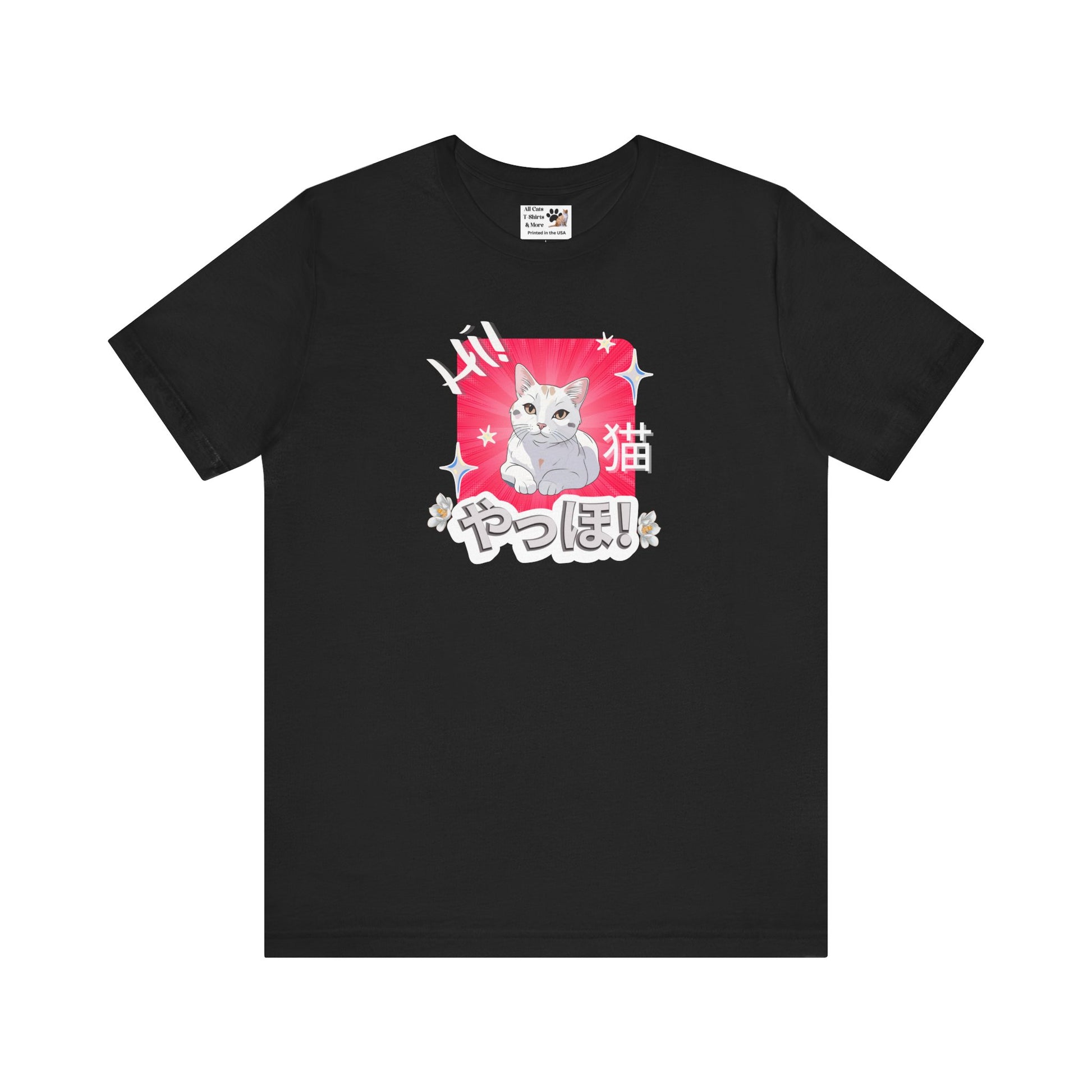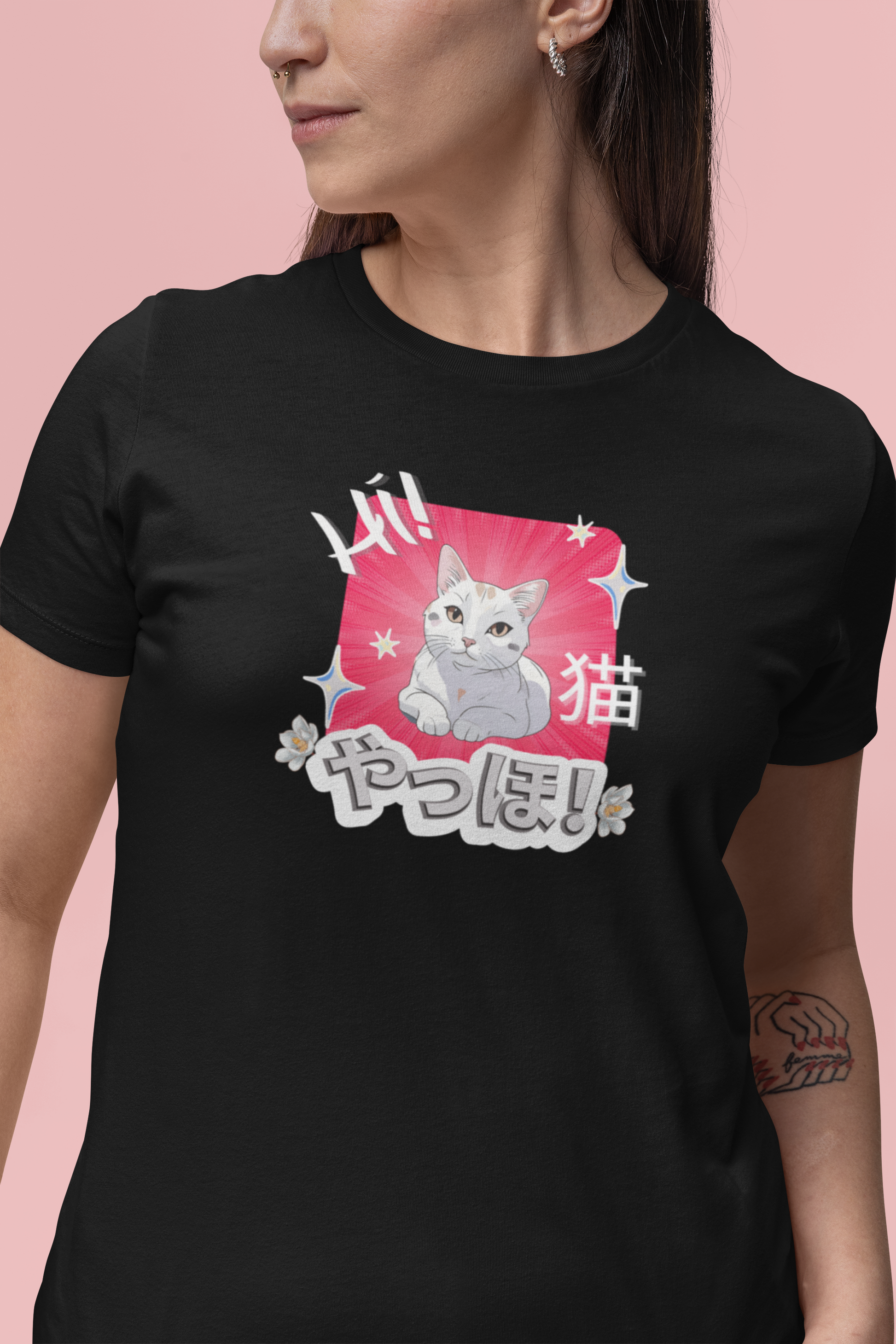 A Japanese anime style T-shirt of a cute white with pink background saying Hi in japanese ("Yahho": extremely informal) and it says "Cat" in Japanese characters. (A.I. Generated Cat Graphic) This shirt gives off a playful and trendy vibe, perfect for anime fans or those who appreciate Japanese culture. Ideal for casual wear, this T-shirt is great for everyday use or as a statement piece for special occasions.