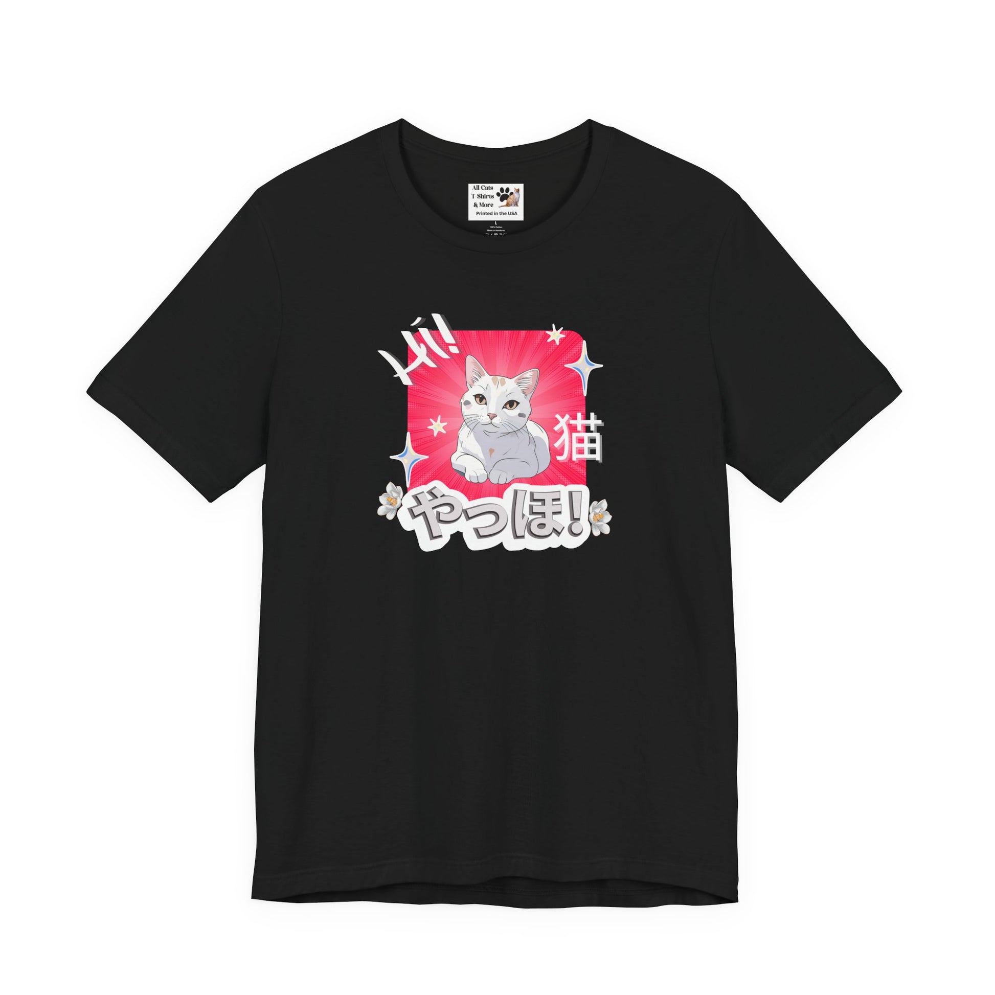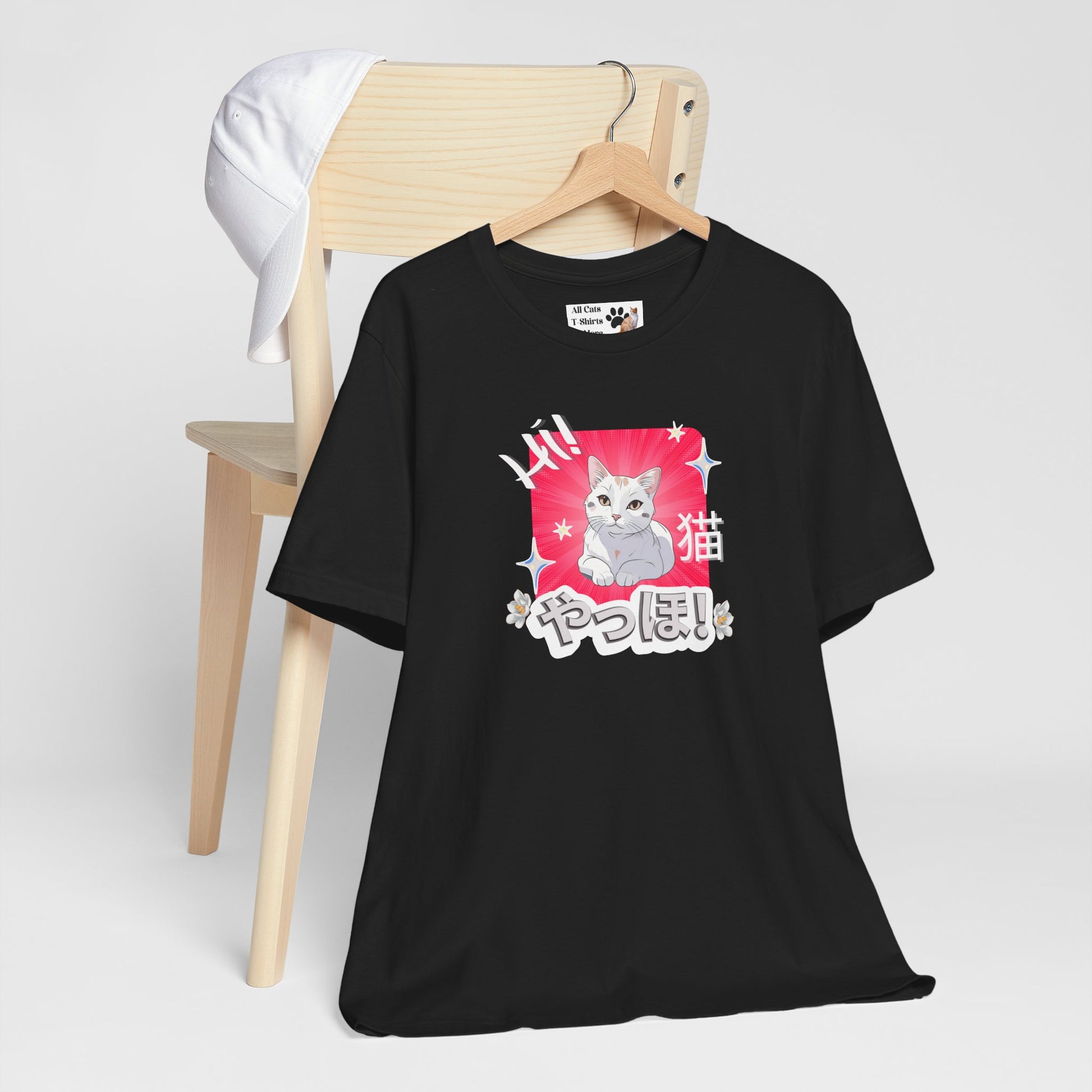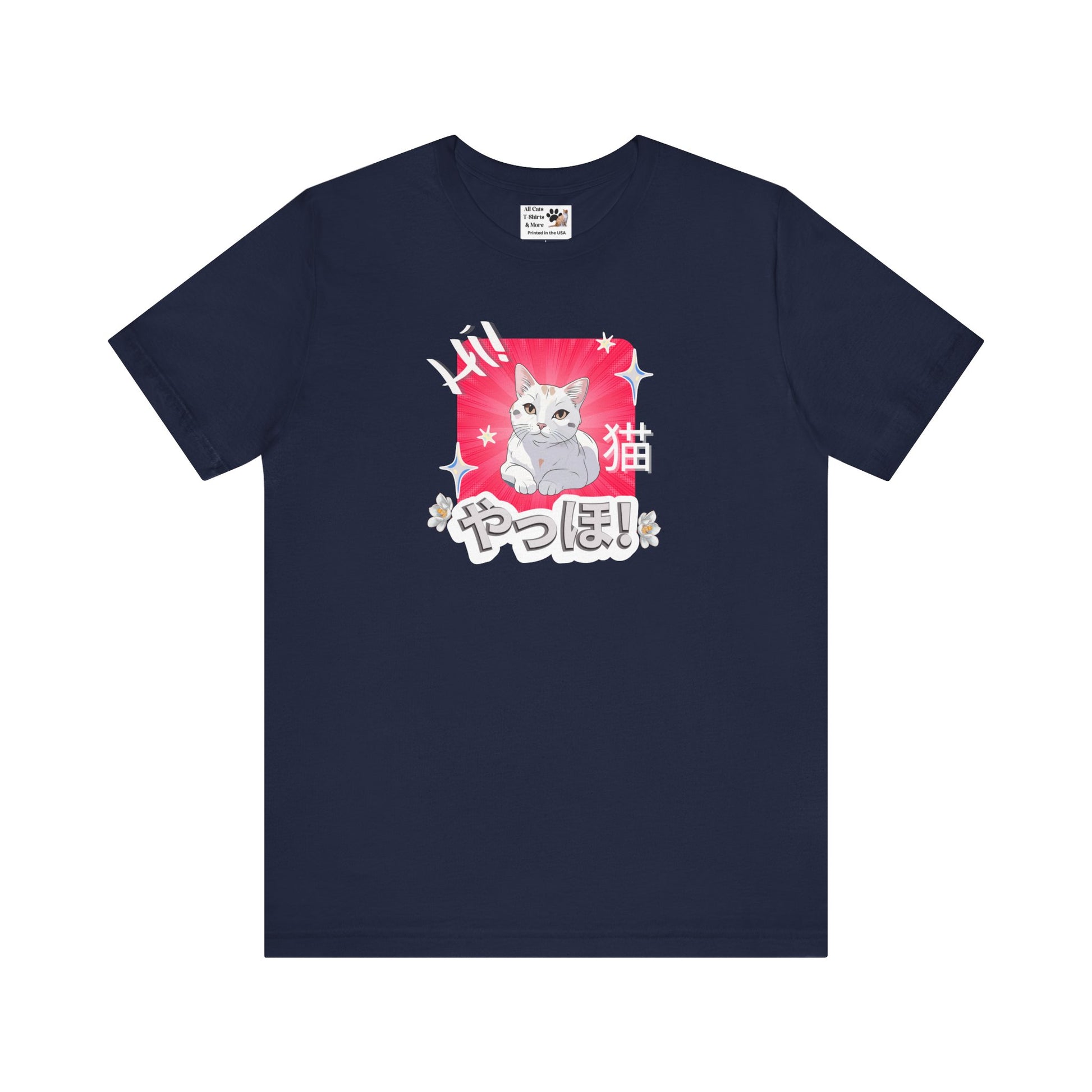 A Japanese anime style T-shirt of a cute white with pink background saying Hi in japanese ("Yahho": extremely informal) and it says "Cat" in Japanese characters. (A.I. Generated Cat Graphic) This shirt gives off a playful and trendy vibe, perfect for anime fans or those who appreciate Japanese culture. Ideal for casual wear, this T-shirt is great for everyday use or as a statement piece for special occasions.
