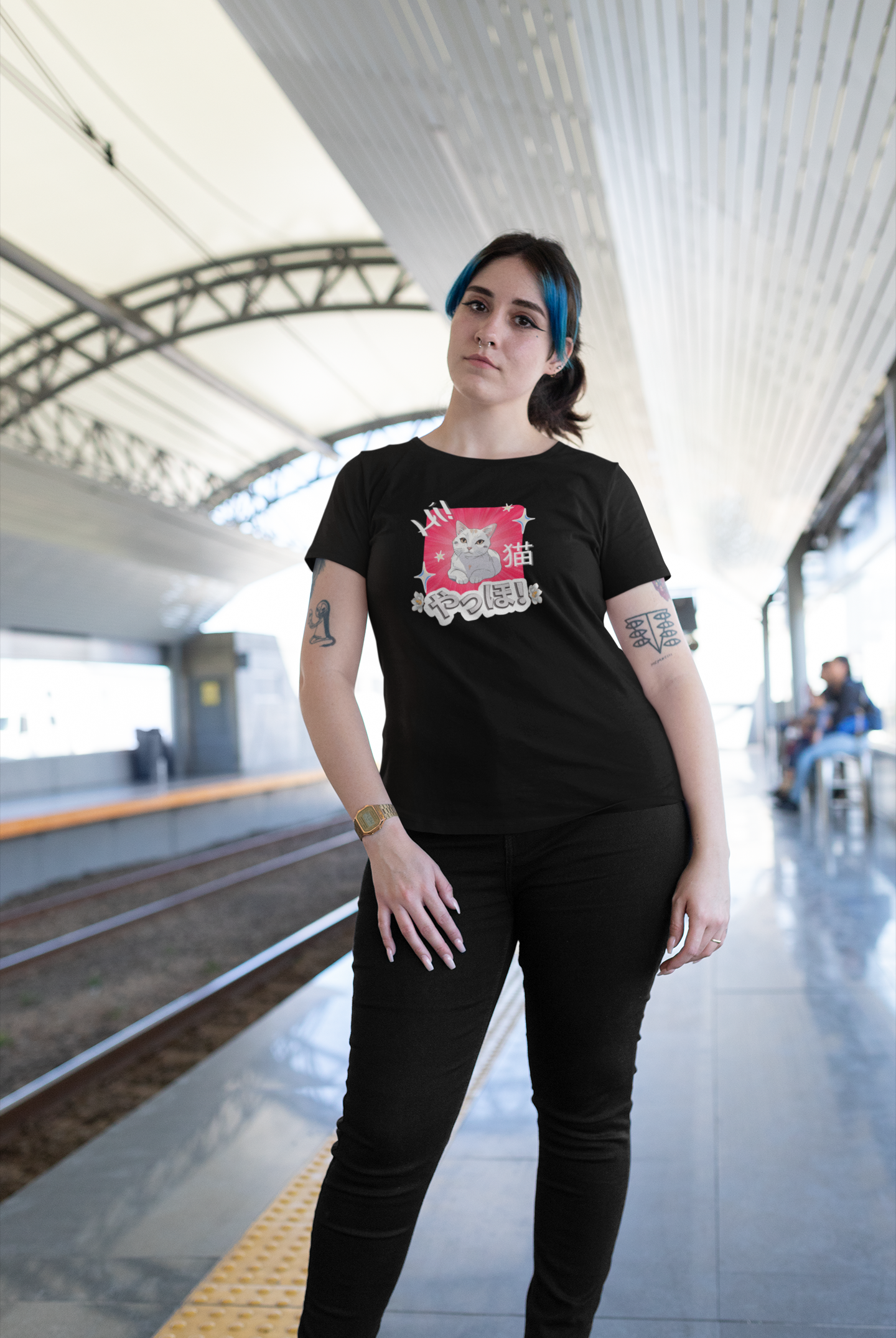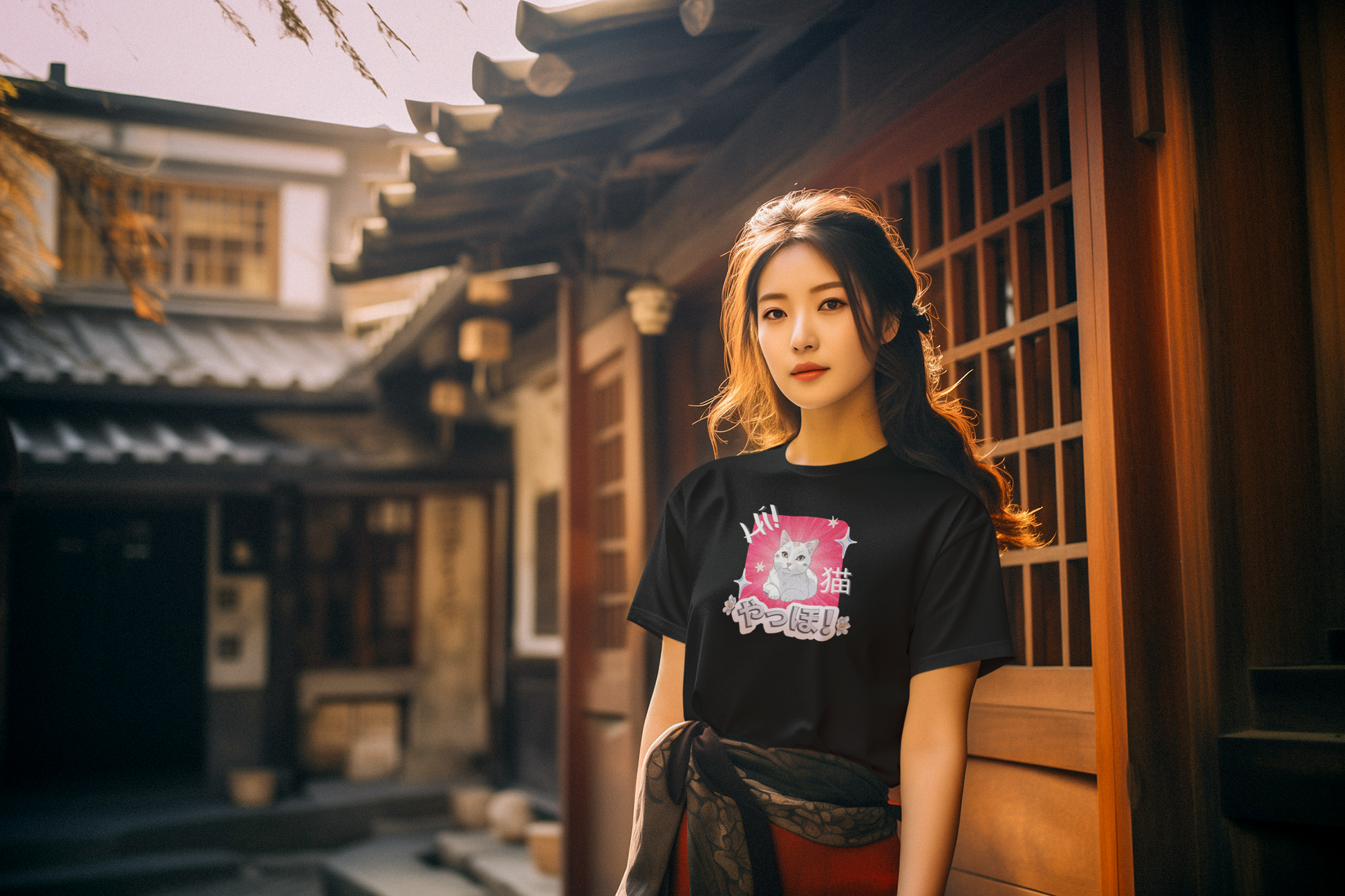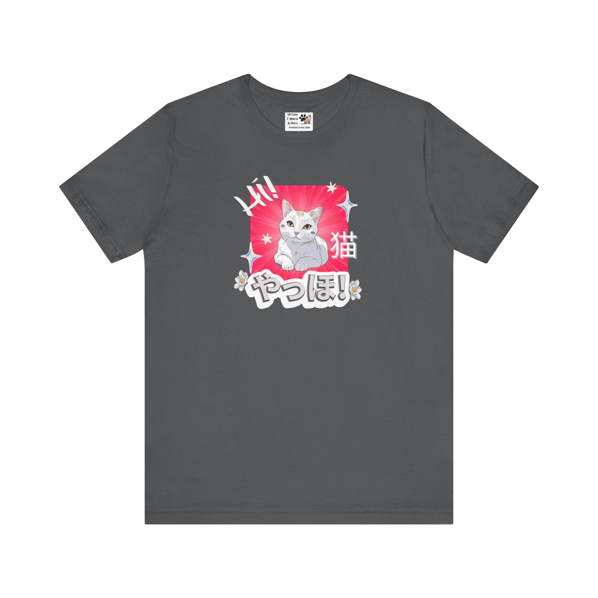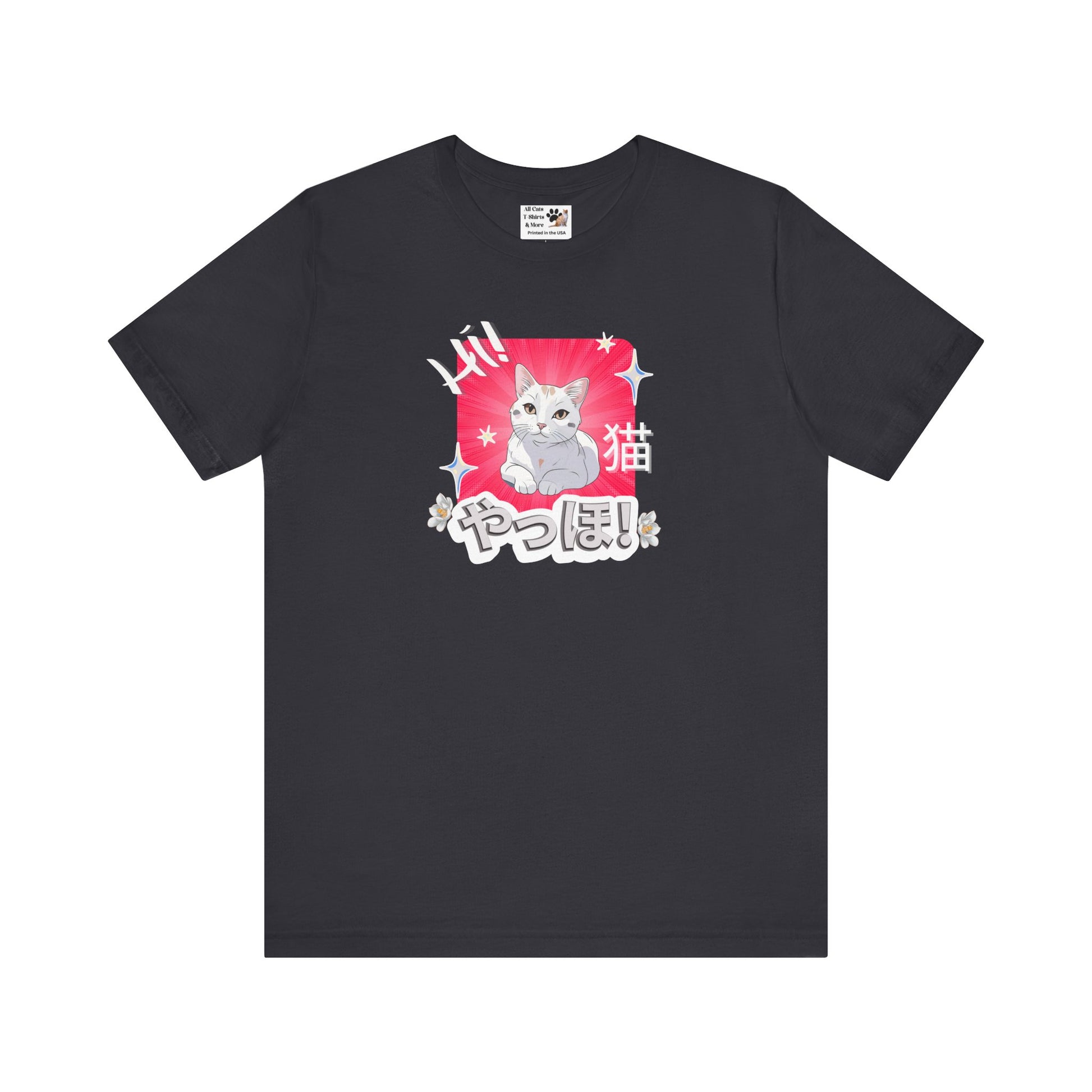 A Japanese anime style T-shirt of a cute white with pink background saying Hi in japanese ("Yahho": extremely informal) and it says "Cat" in Japanese characters. (A.I. Generated Cat Graphic) This shirt gives off a playful and trendy vibe, perfect for anime fans or those who appreciate Japanese culture. Ideal for casual wear, this T-shirt is great for everyday use or as a statement piece for special occasions.
