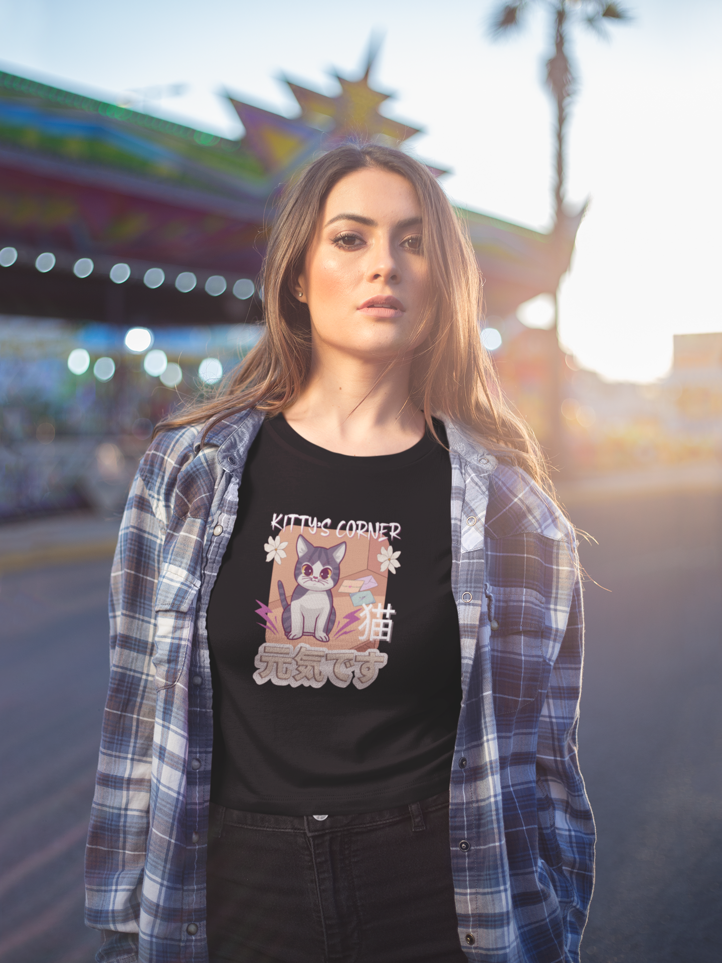 A cute Japanese anime style T-shirt of a little cat in its corner ("Kitty's Corner") guarding its letters and mail! It says "Cat" in a Japanese character on the right and in Japanese writing below it says: "Genki desu" meaning "I'm Fine"