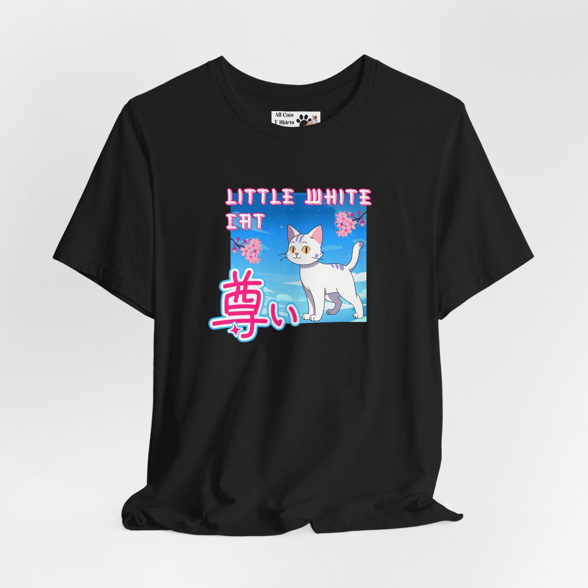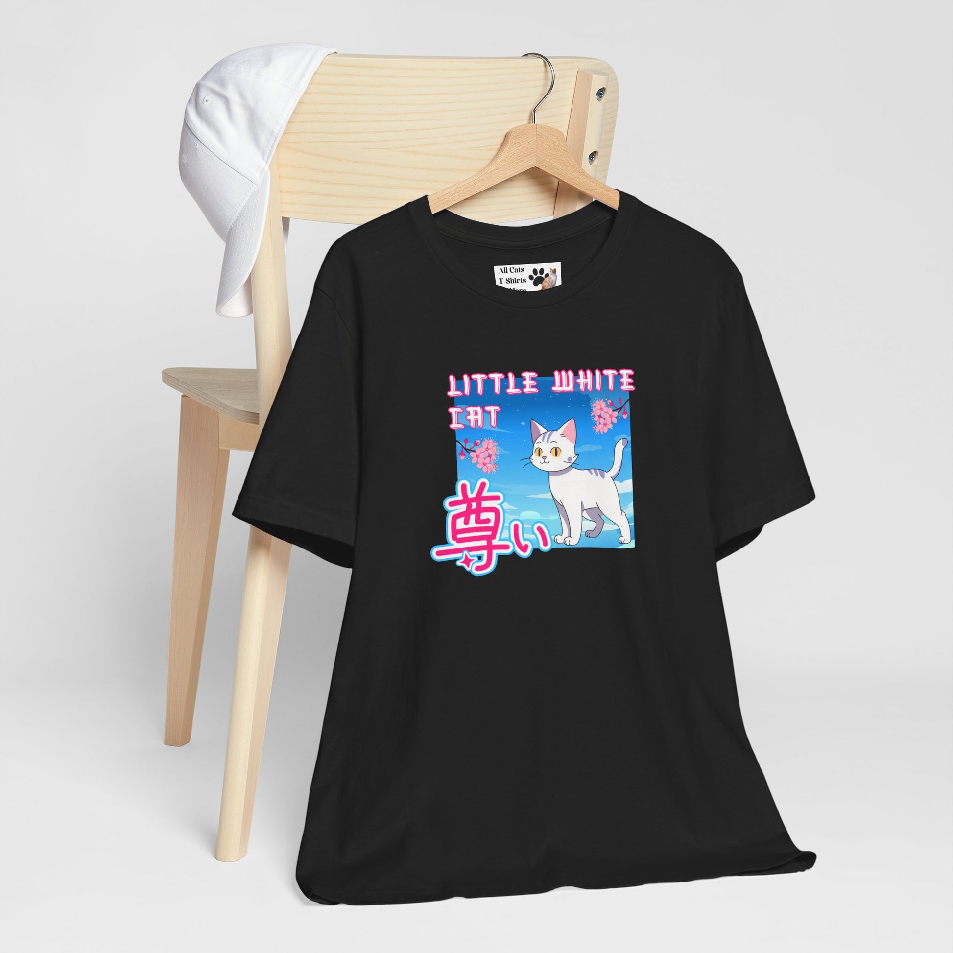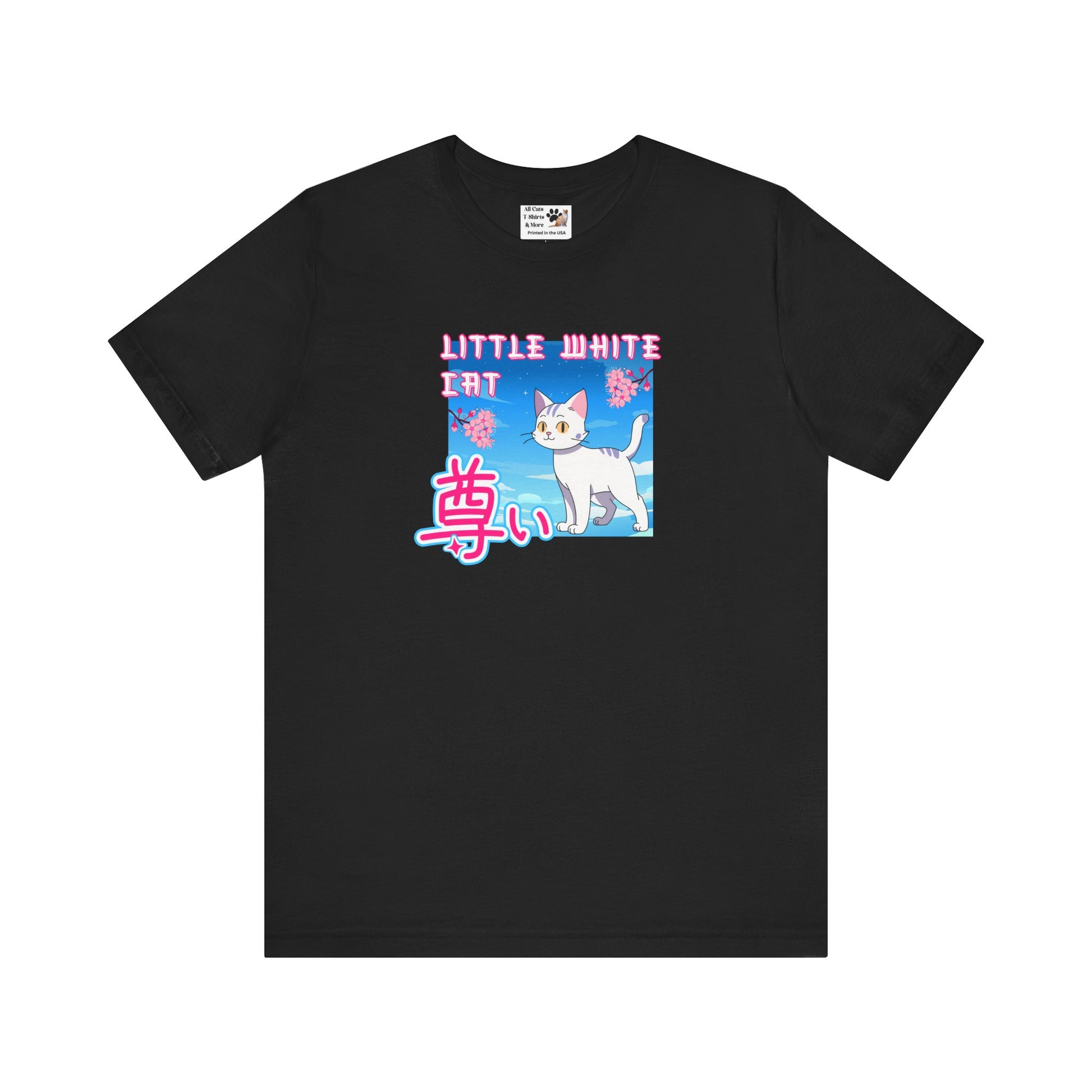 A cute and colorful Japanese anime style T-shirt of a "Little White Cat" with anime design elements and a Japanese Kanji illustration ("Toutoi") Meaning "Precious" Perfect for lovers of Japanese culture and anime enthusiasts, this T-shirt brings a fun and whimsical vibe to any outfit. Ideal for casual wear or as a gift for fans of anime. (A.I. Generated Cat Graphic)