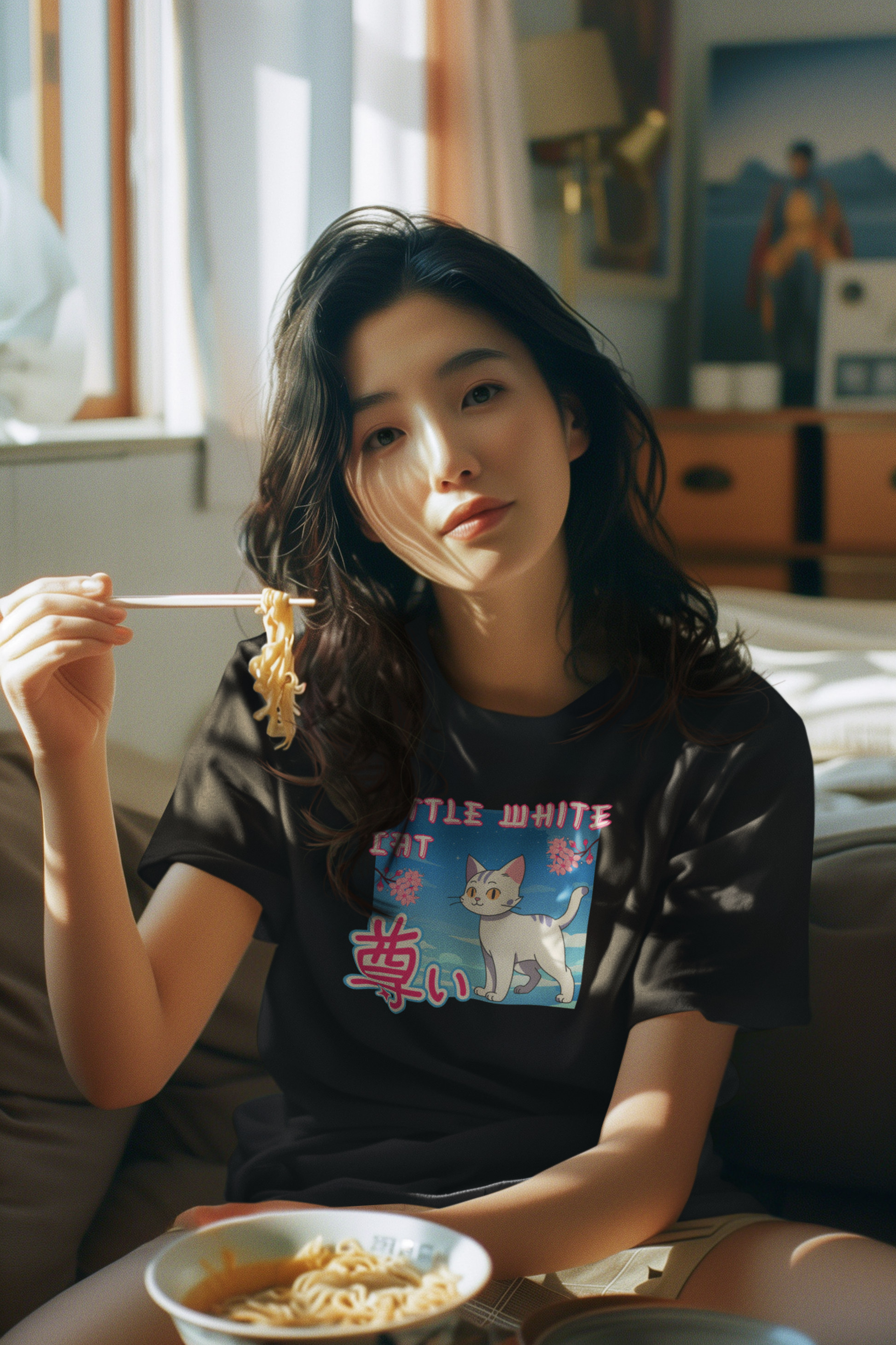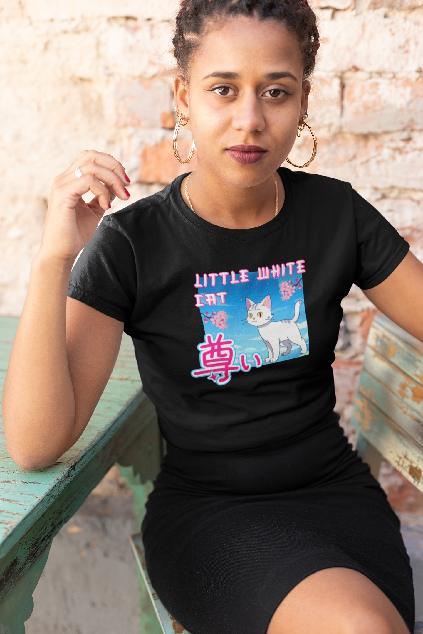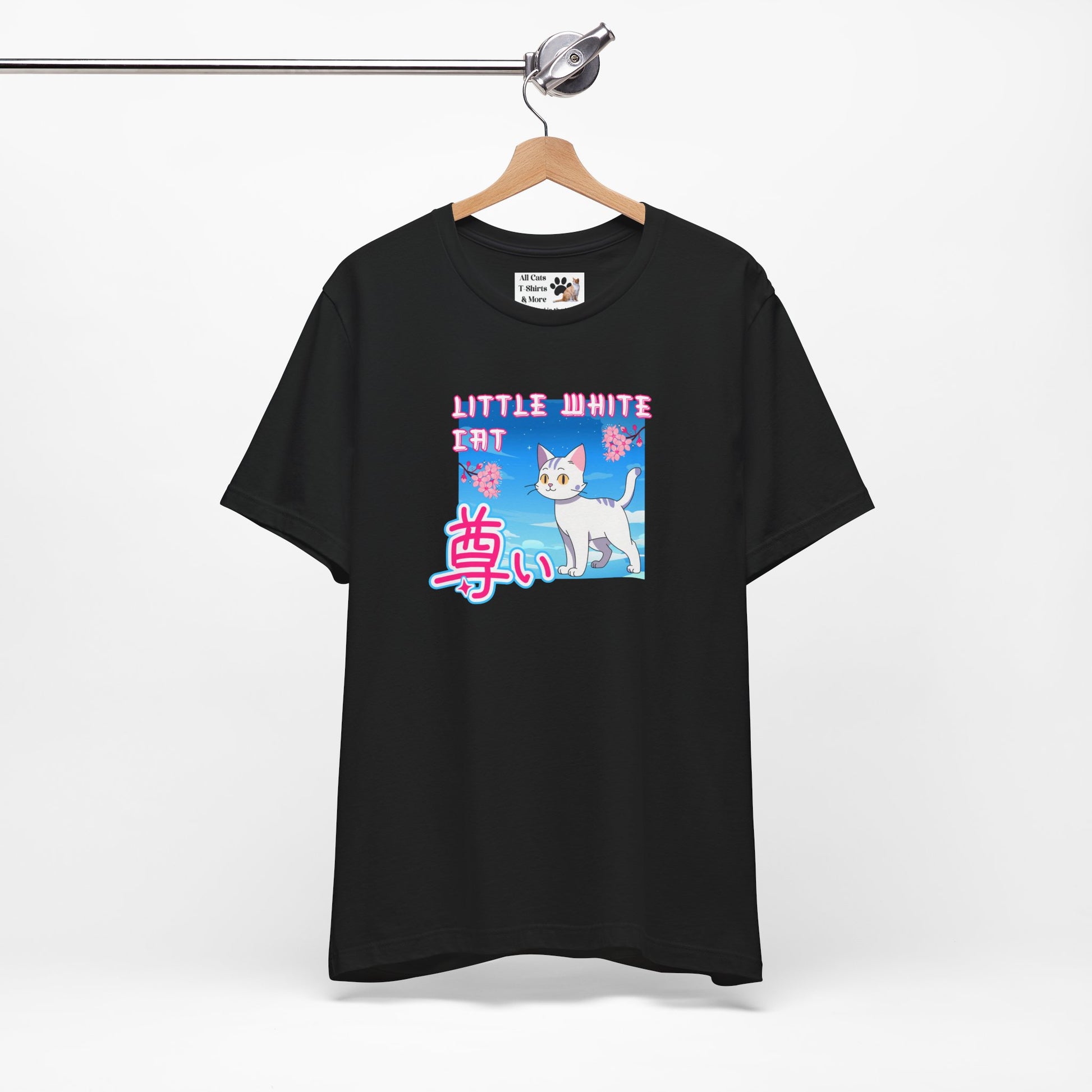 A cute and colorful Japanese anime style T-shirt of a "Little White Cat" with anime design elements and a Japanese Kanji illustration ("Toutoi") Meaning "Precious" Perfect for lovers of Japanese culture and anime enthusiasts, this T-shirt brings a fun and whimsical vibe to any outfit. Ideal for casual wear or as a gift for fans of anime. (A.I. Generated Cat Graphic)