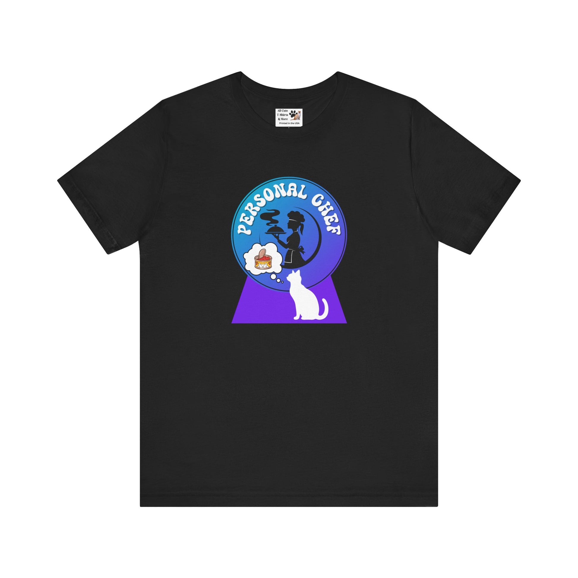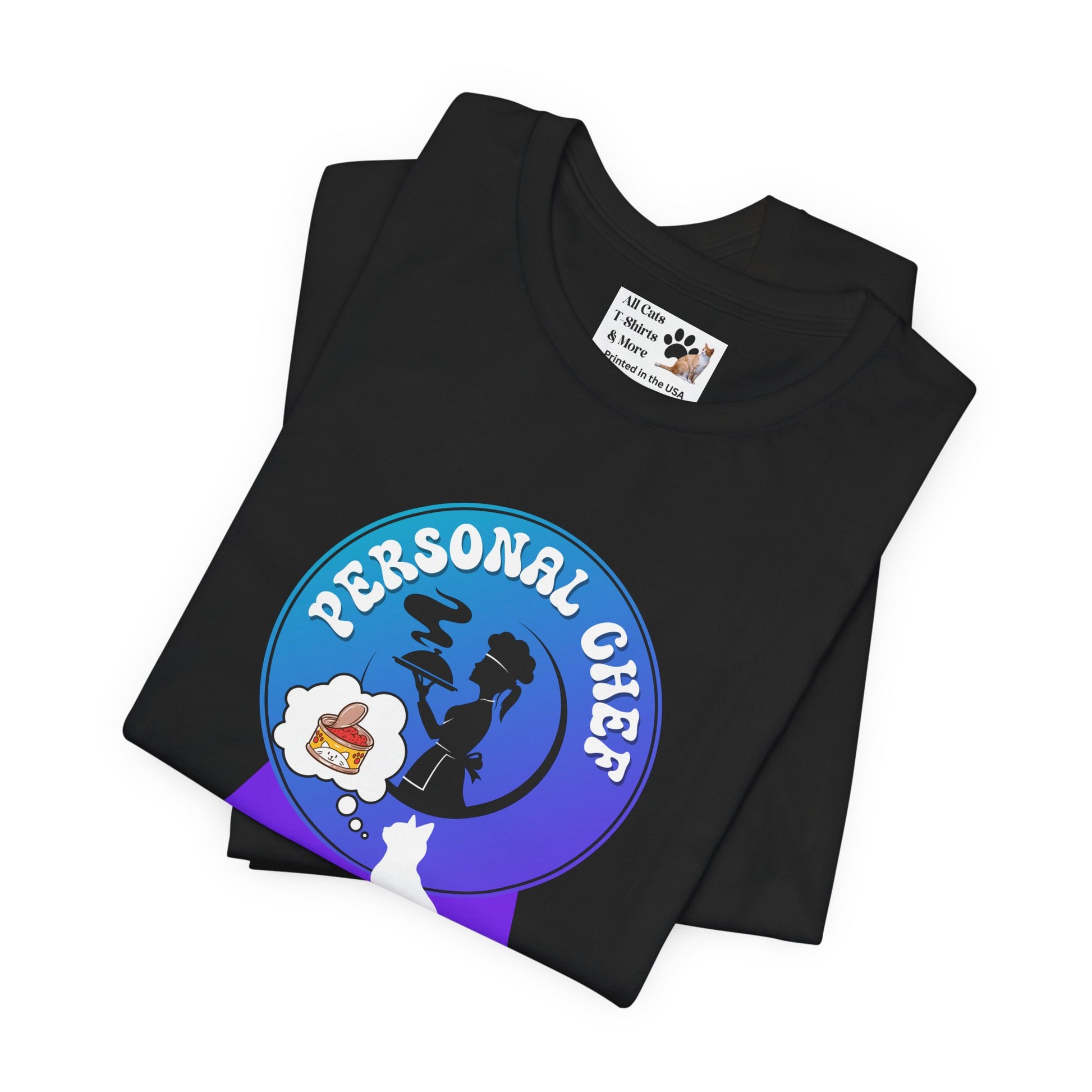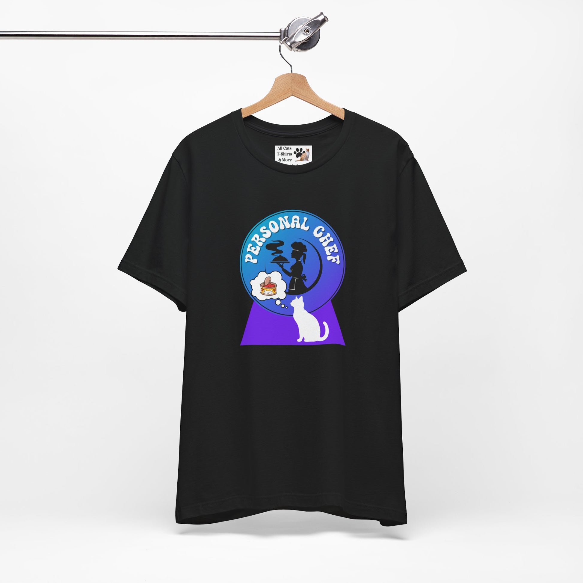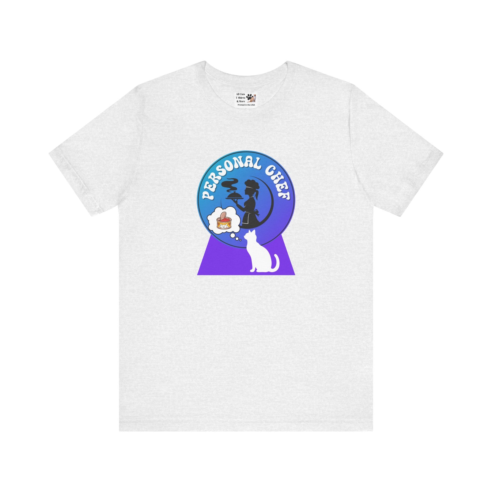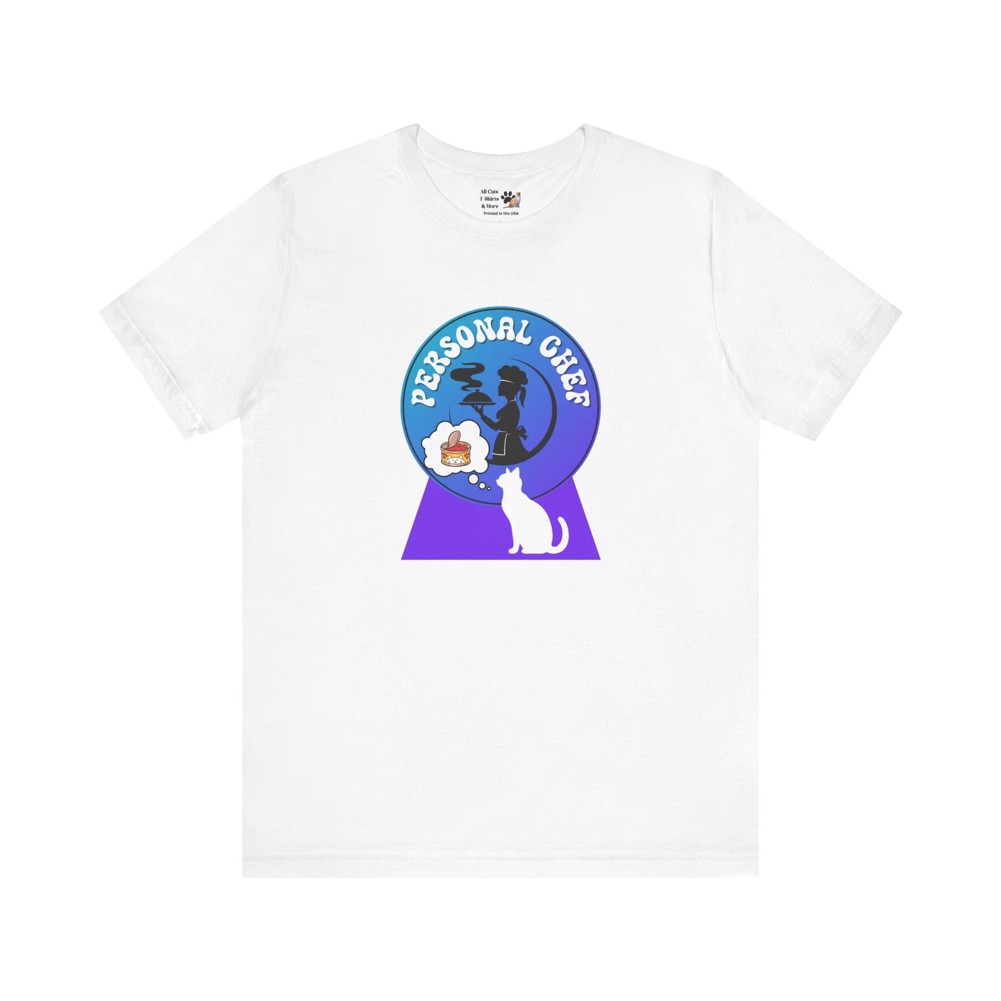 Personal Chef for Cats T-Shirt - (#10 - White Cat & Chef Silhouettes Blue Purple Design - Unisex Jersey Tee ā Perfect for Cat Care Givers!)