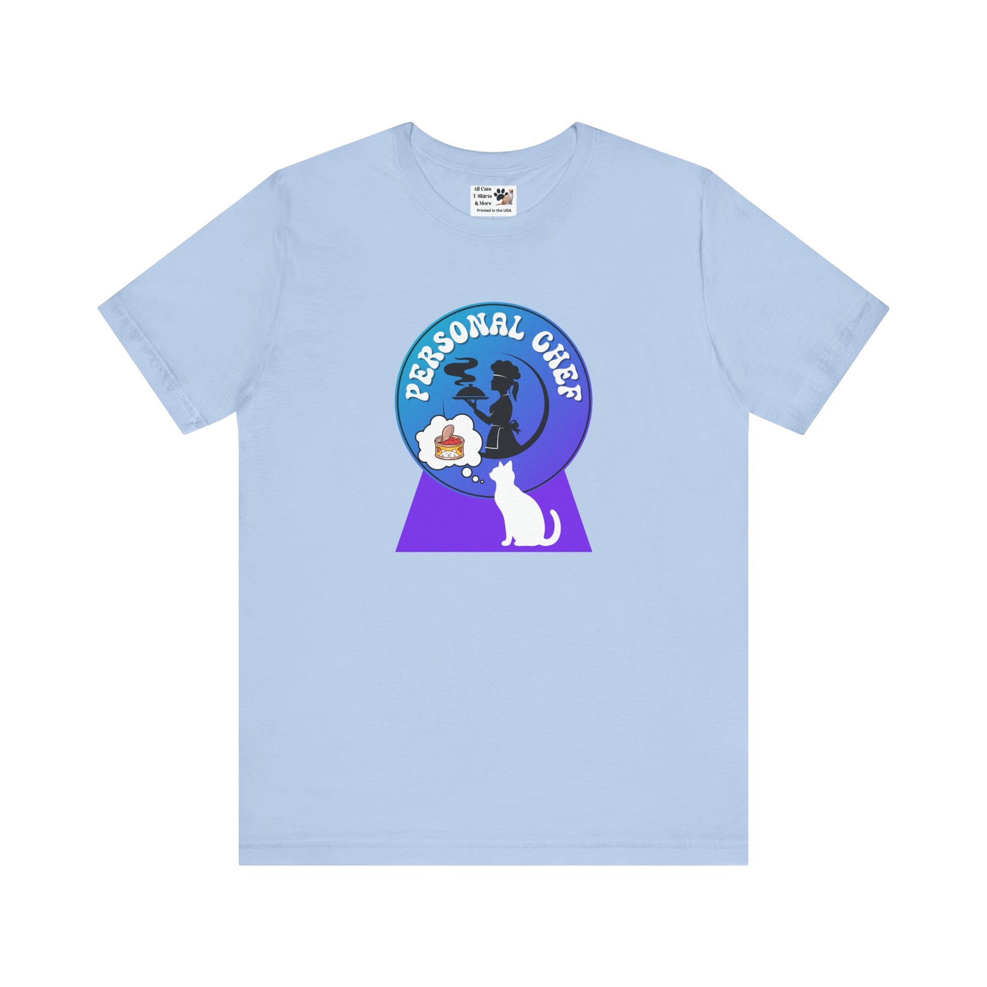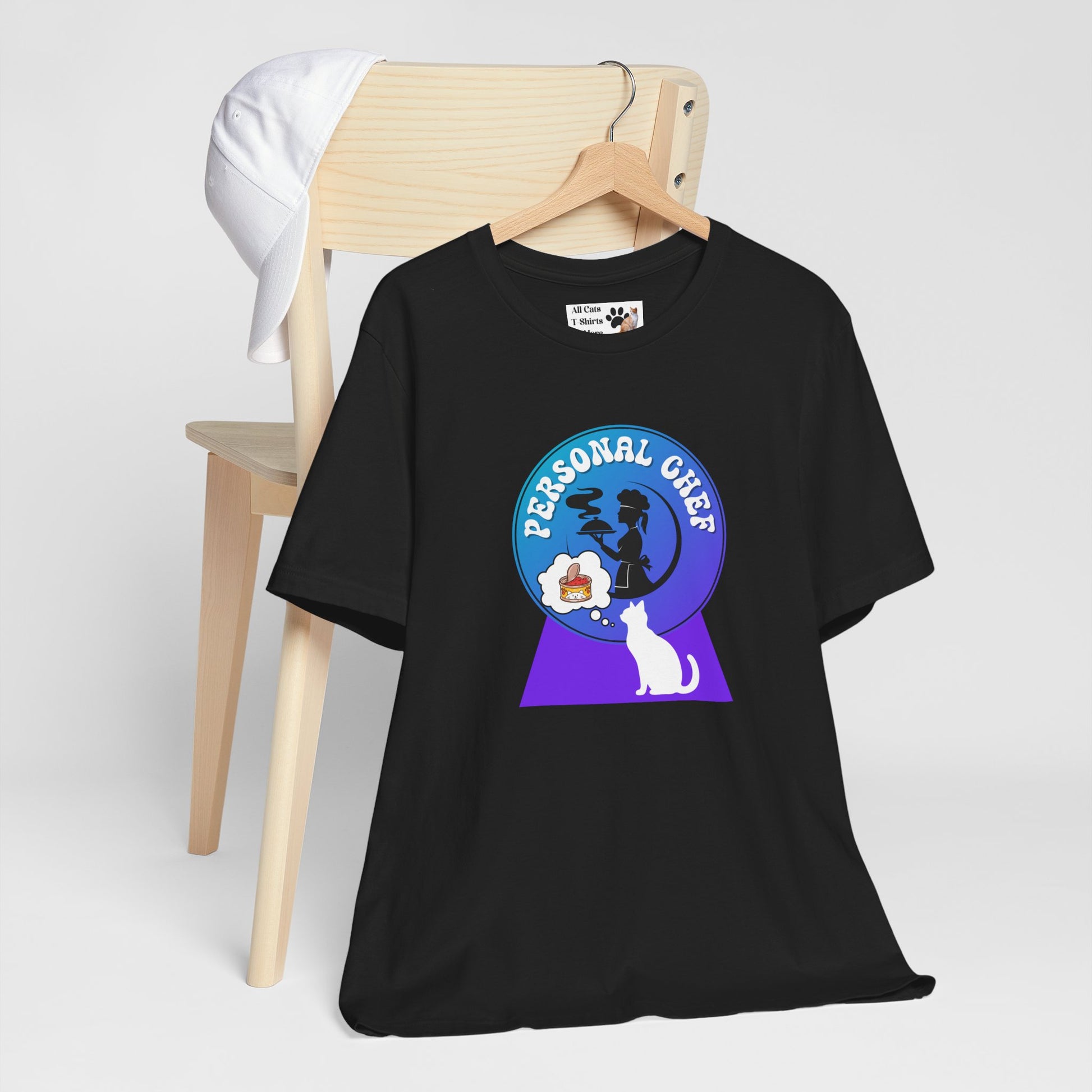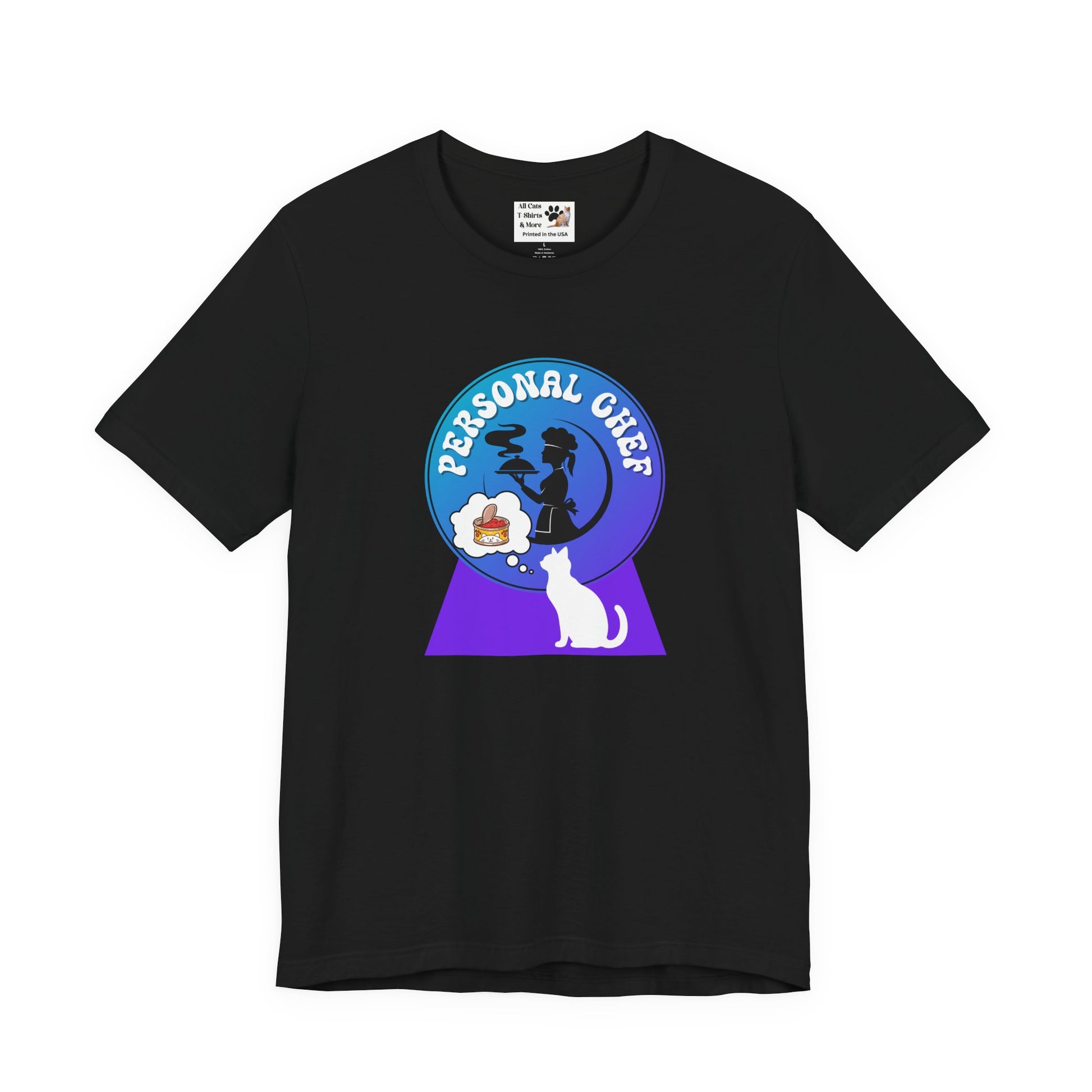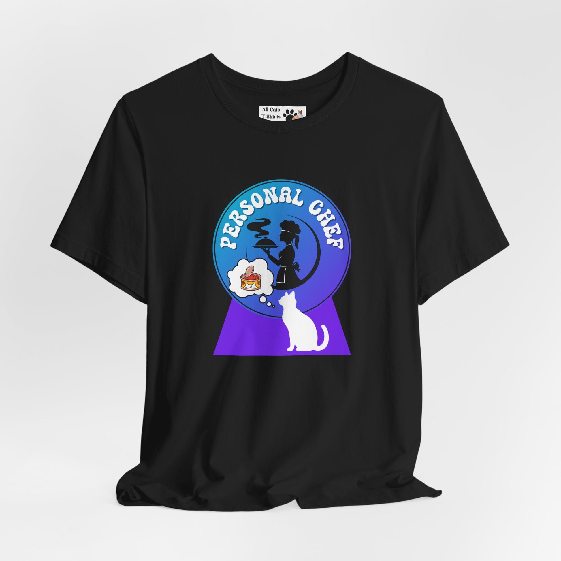 Personal Chef for Cats T-Shirt - (#10 - White Cat & Chef Silhouettes Blue Purple Design - Unisex Jersey Tee ā Perfect for Cat Care Givers!)