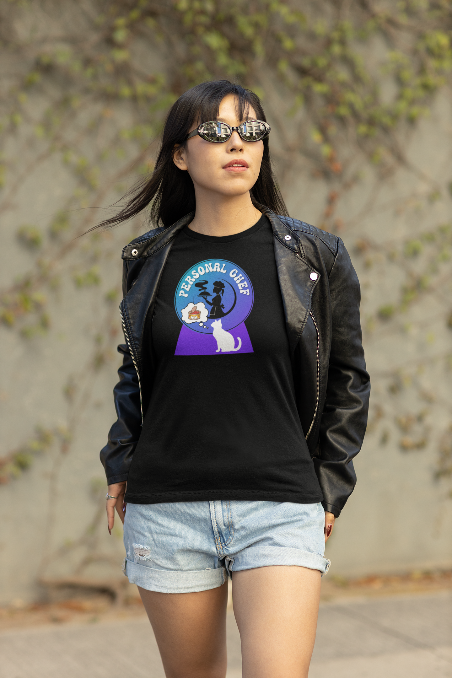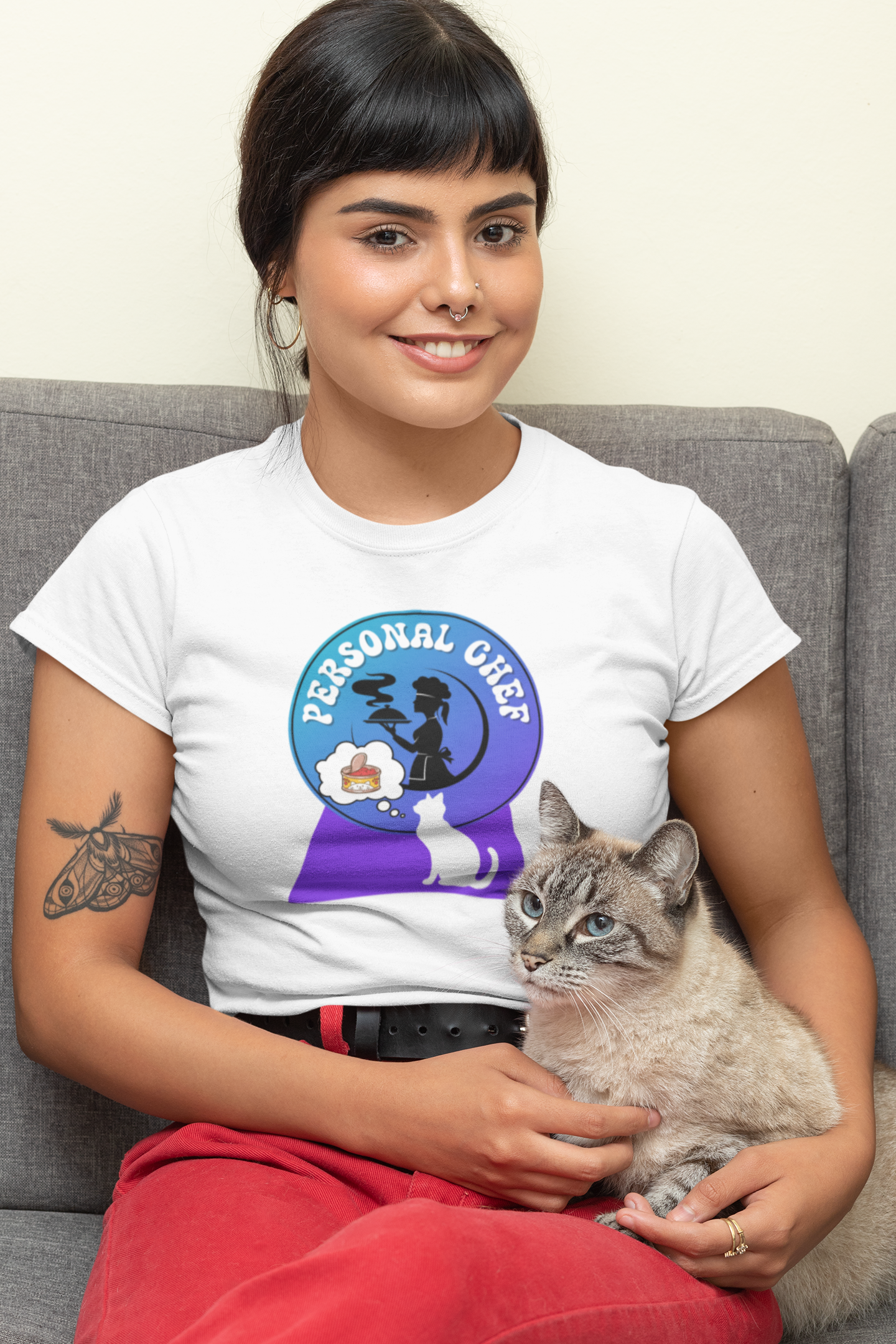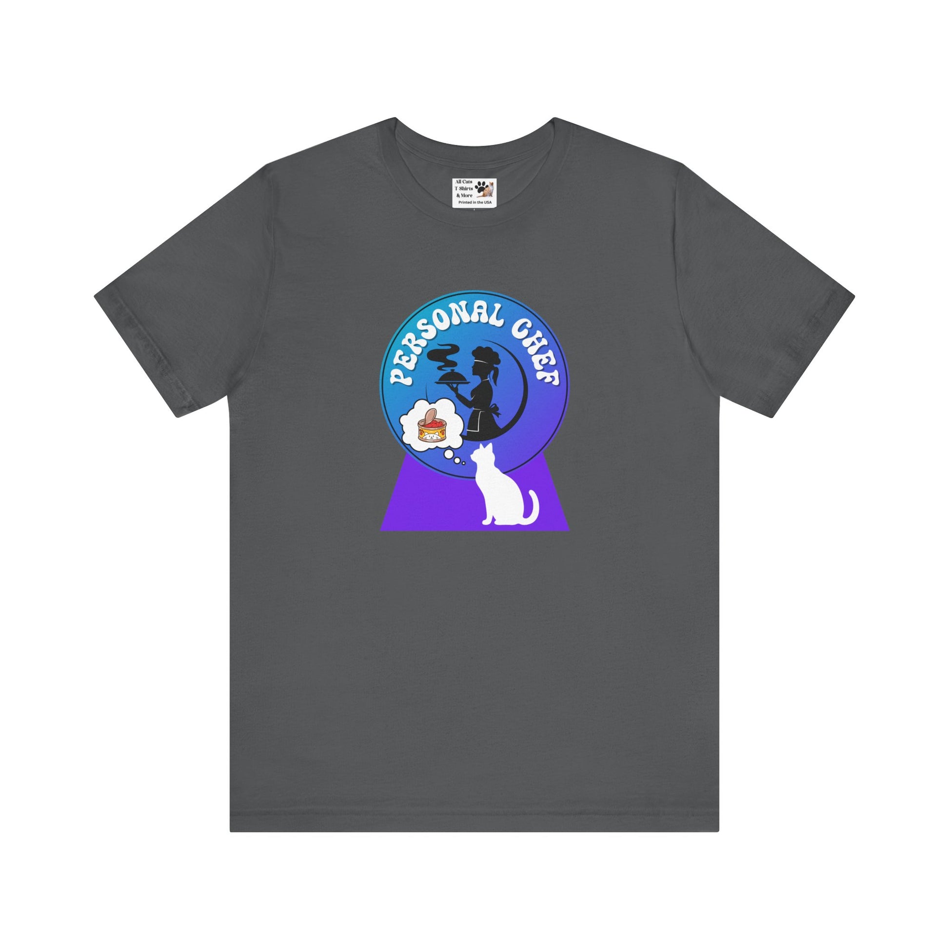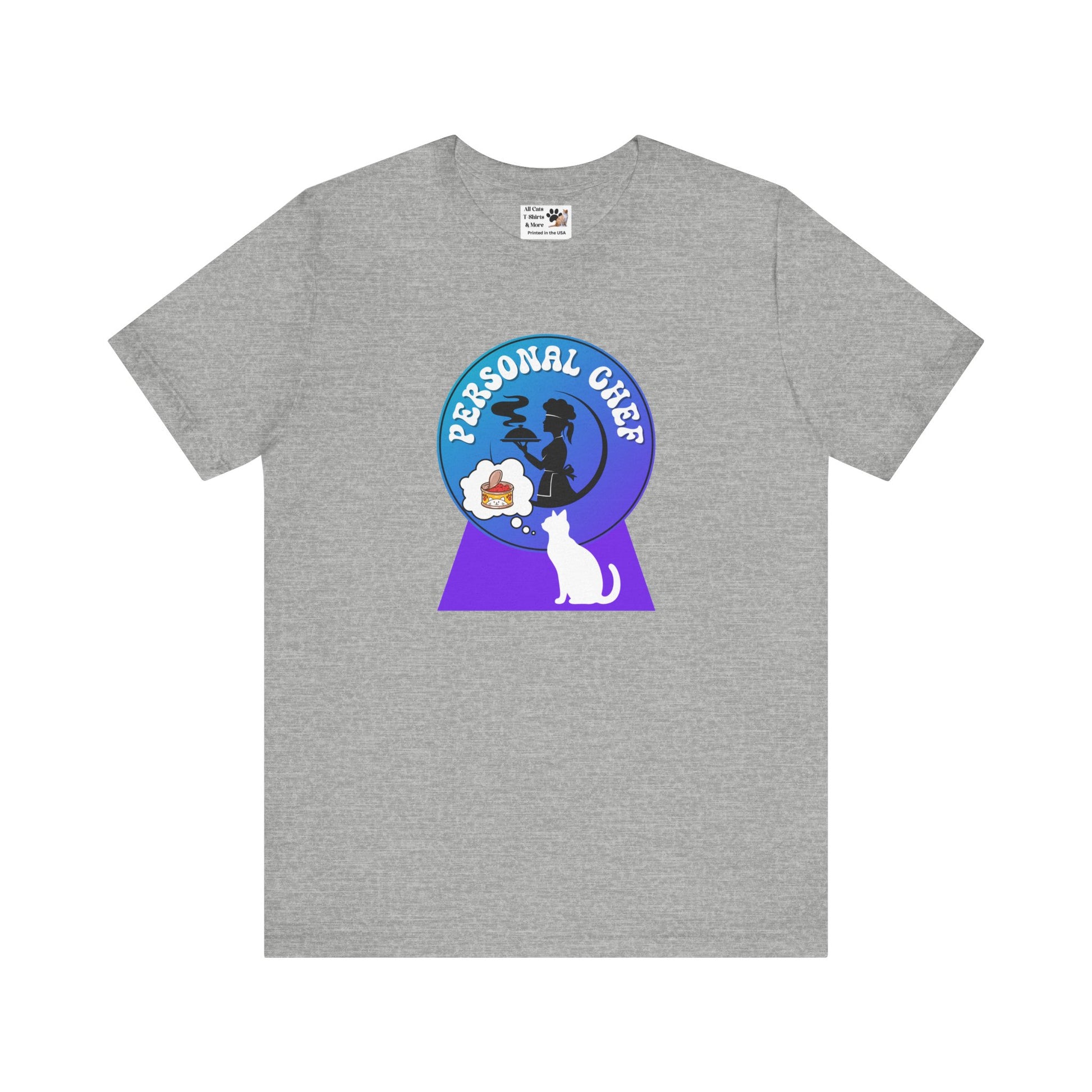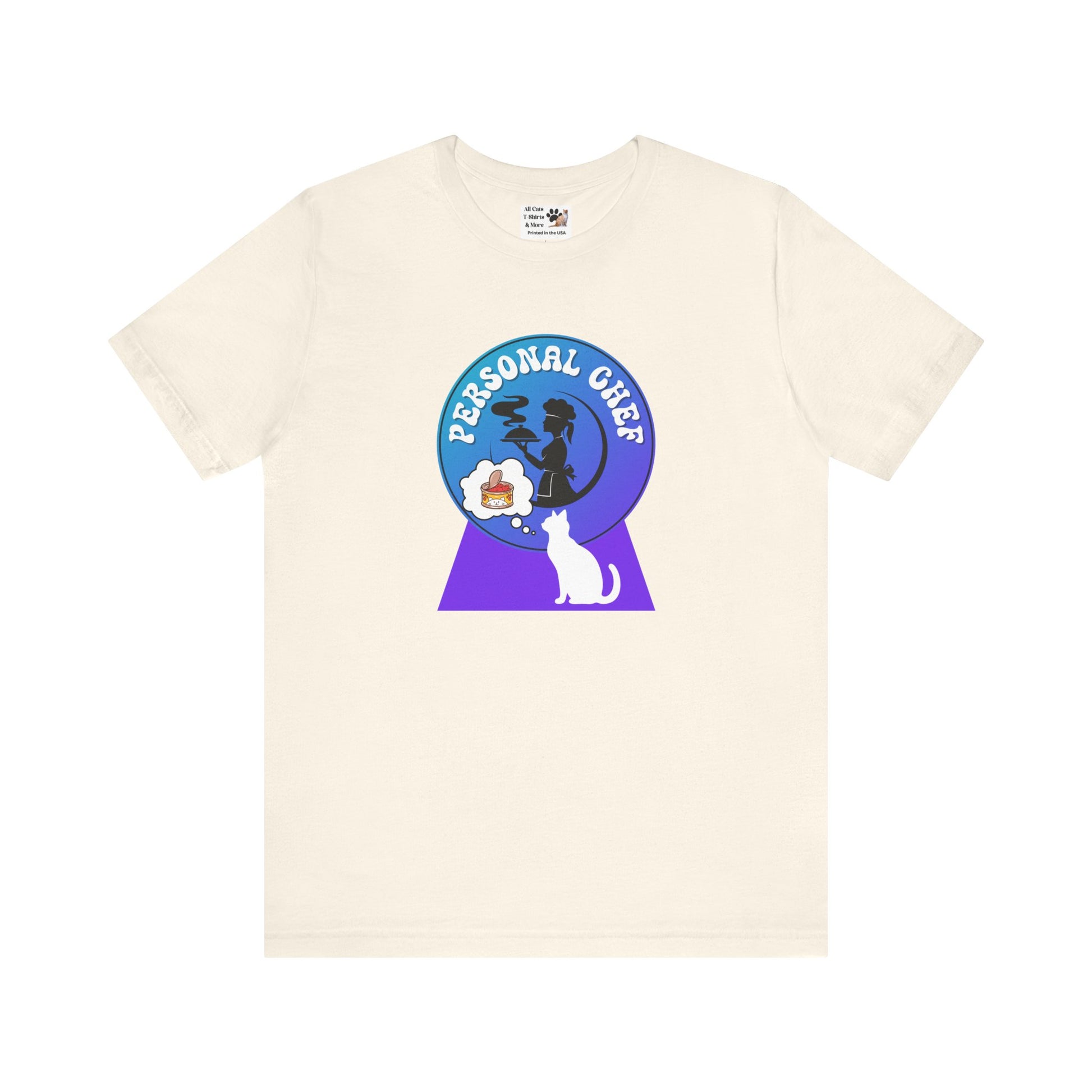 Personal Chef for Cats T-Shirt - (#10 - White Cat & Chef Silhouettes Blue Purple Design - Unisex Jersey Tee ā Perfect for Cat Care Givers!)
