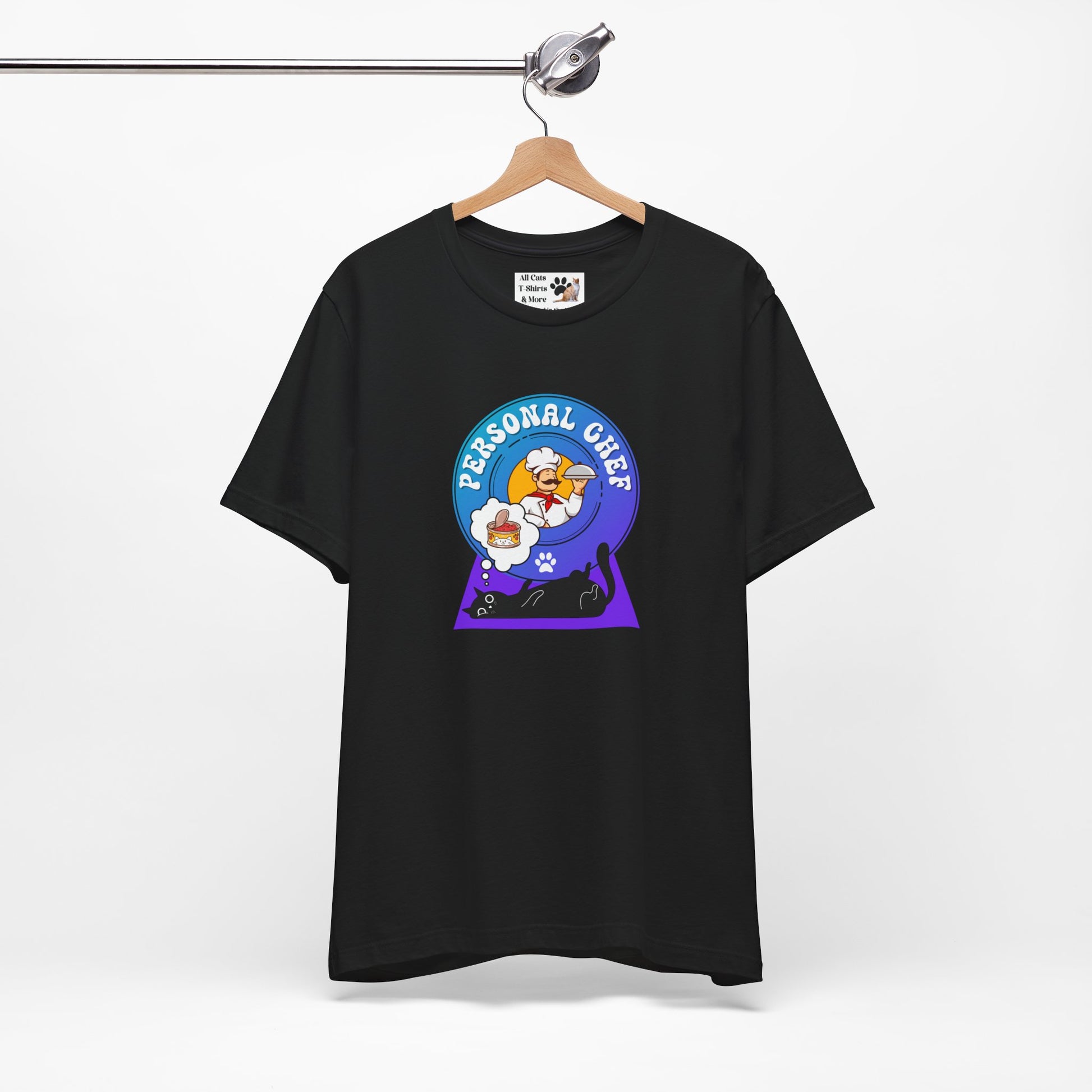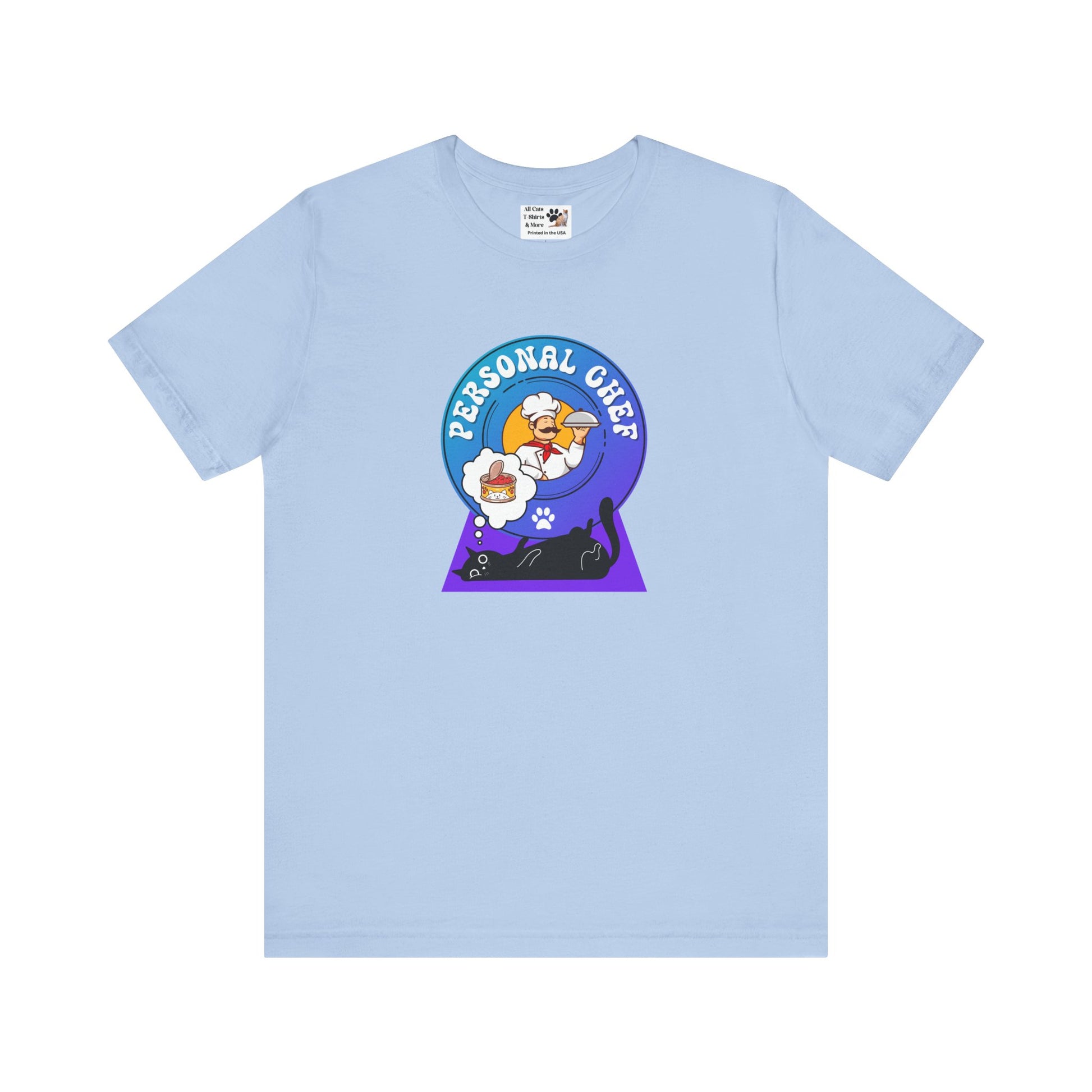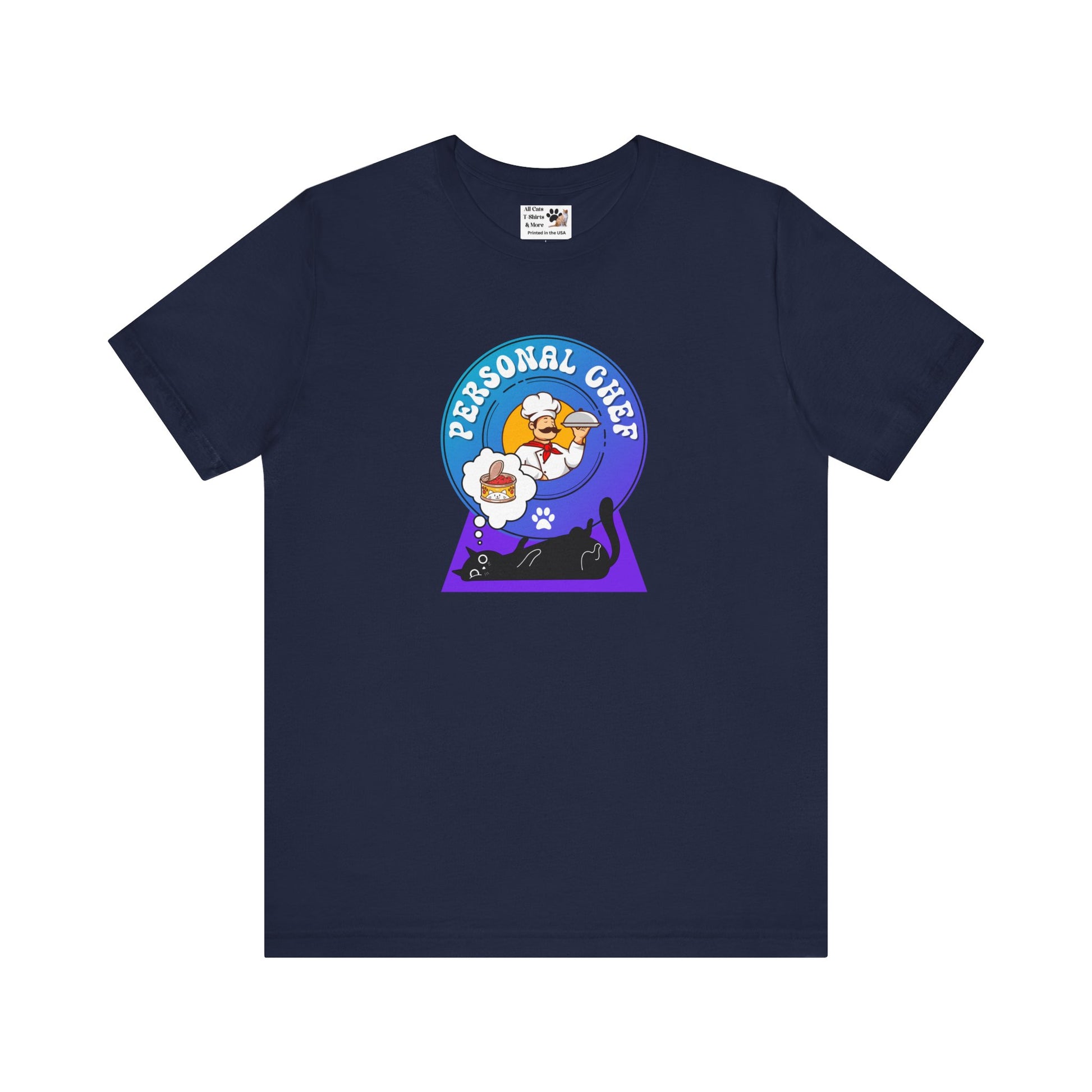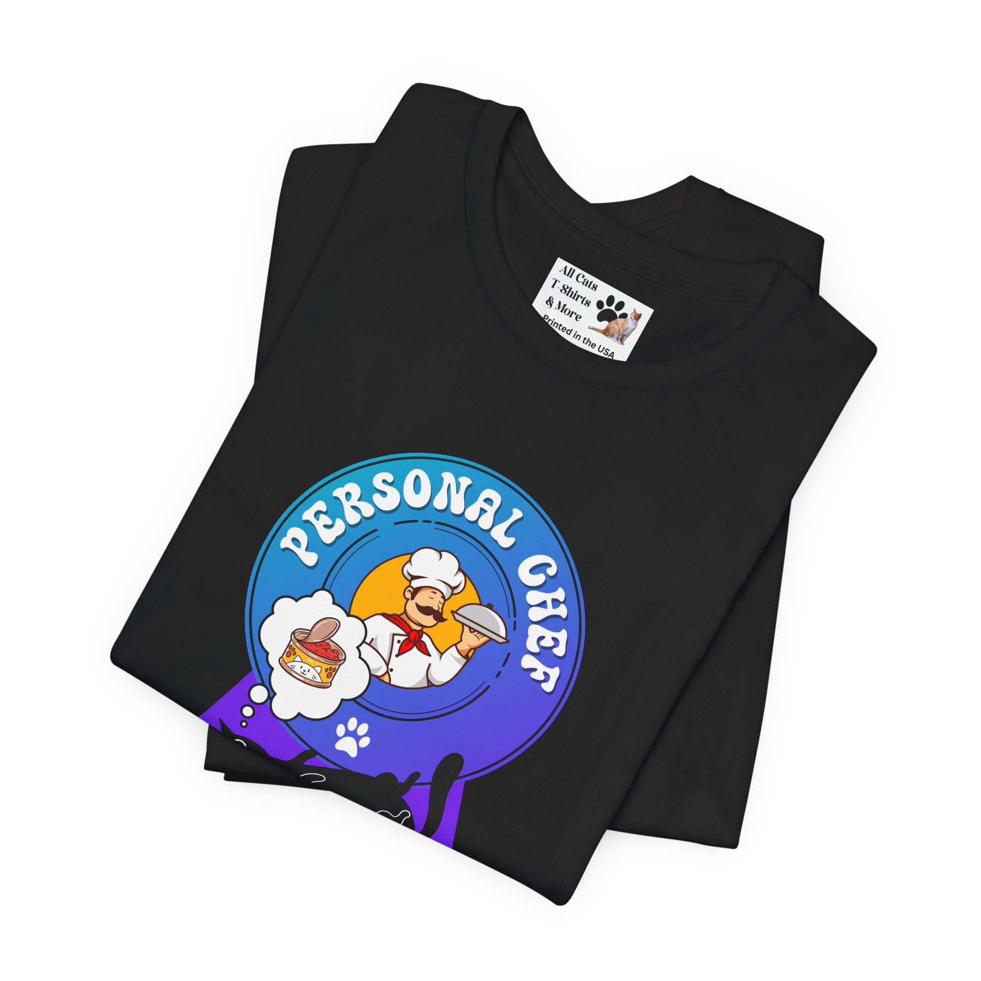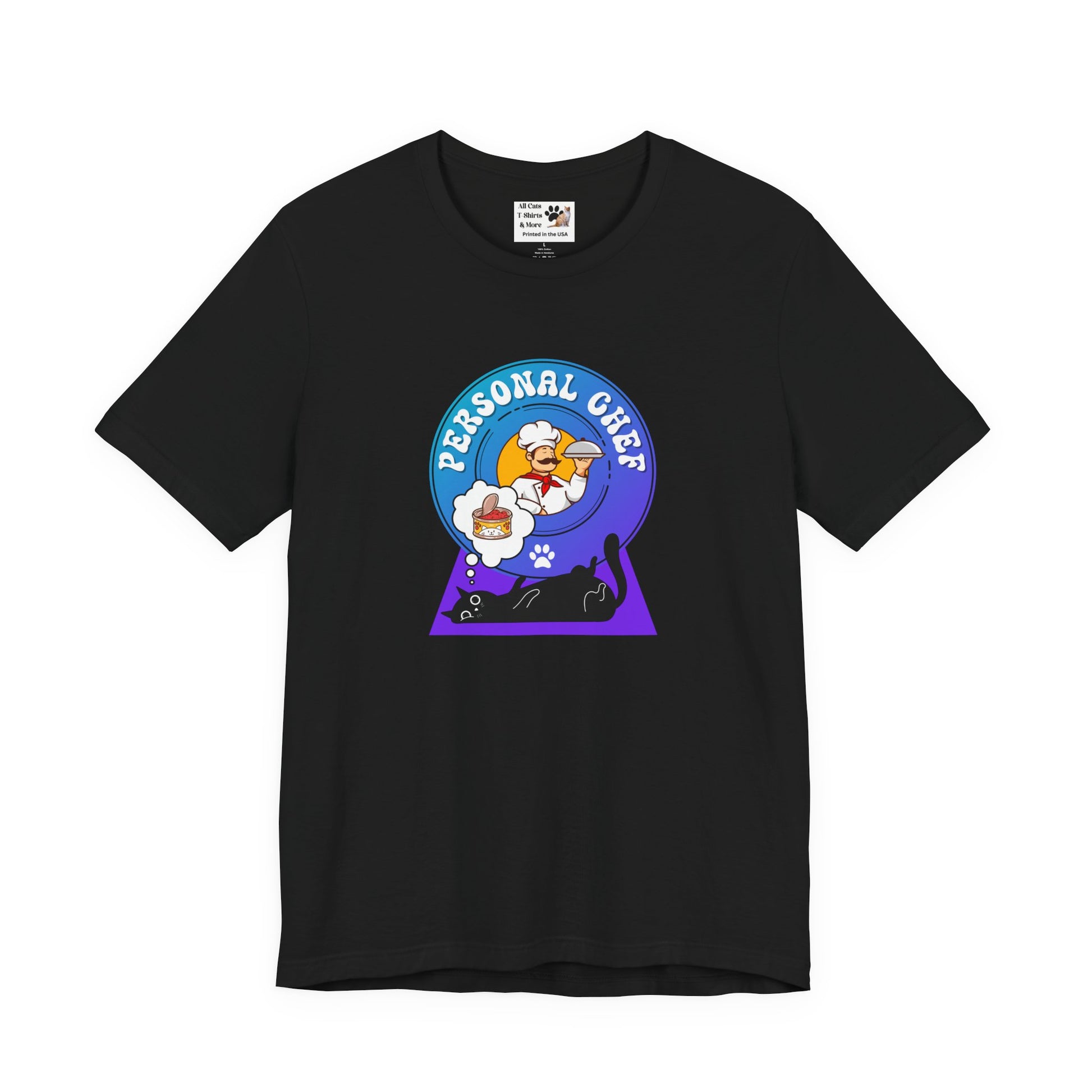 Personal Chef for Cats T-Shirt (#2 - Black Cat & Italian Chef, Blue Purple Design - Unisex Jersey Tee – Perfect Cat Care Givers!)