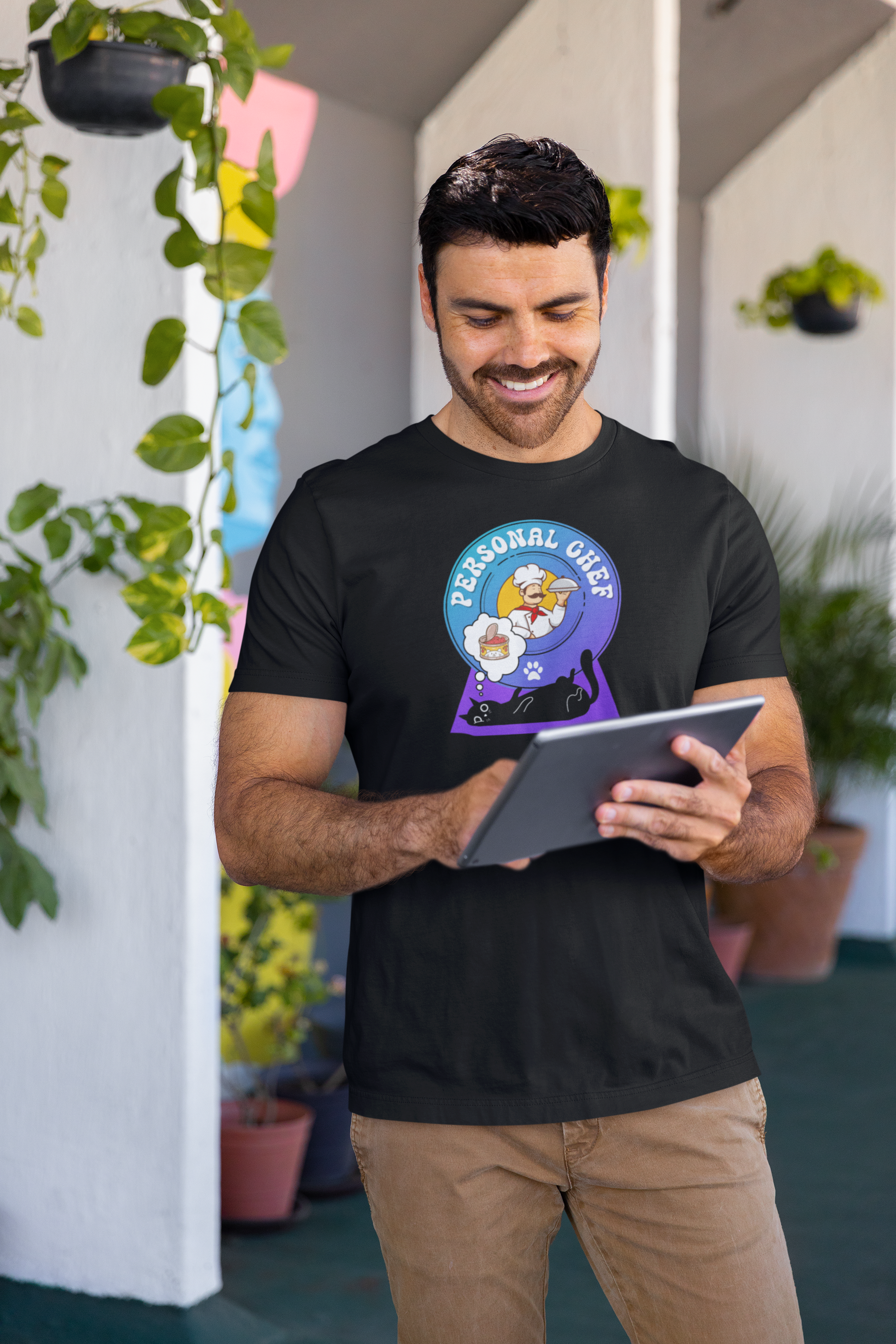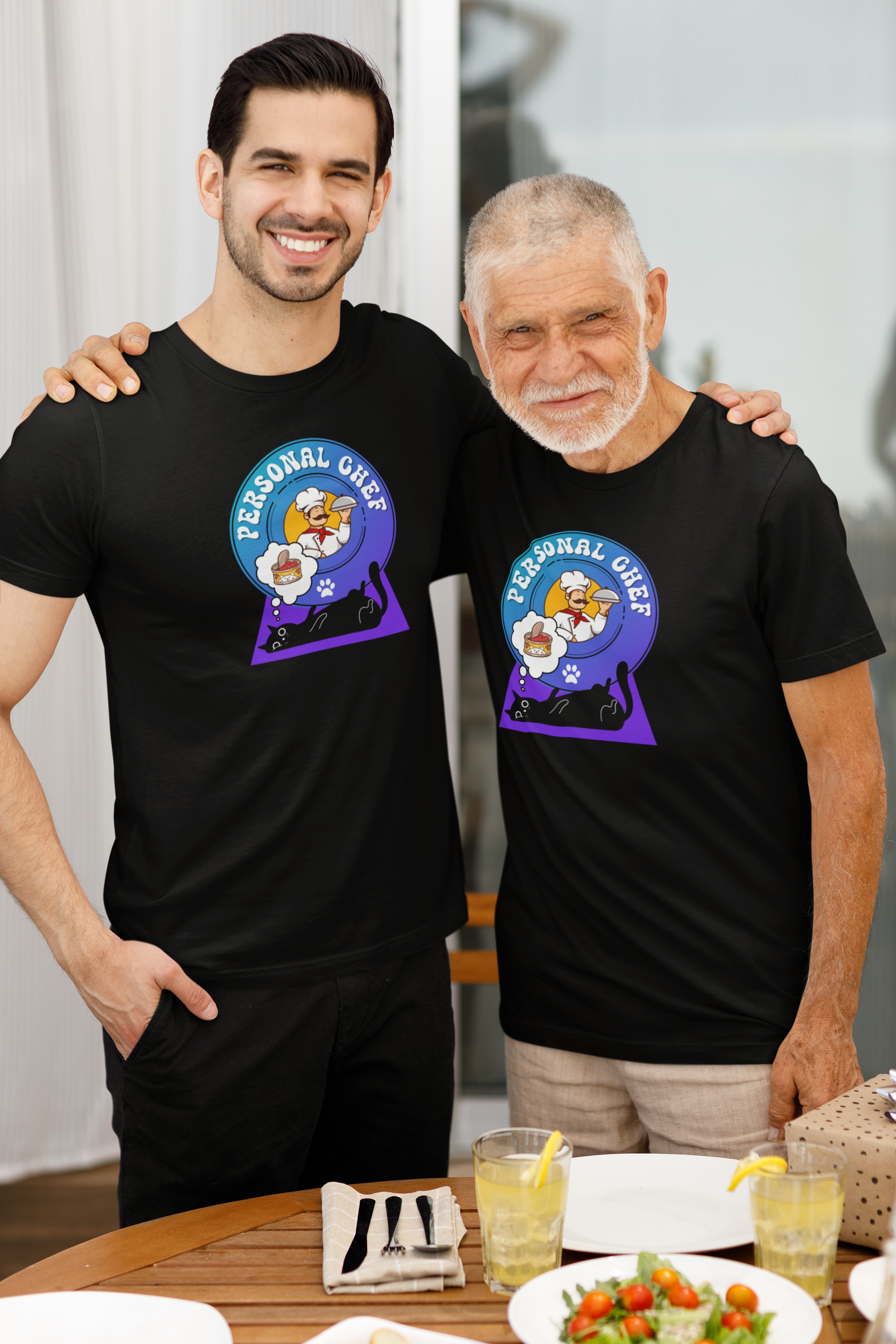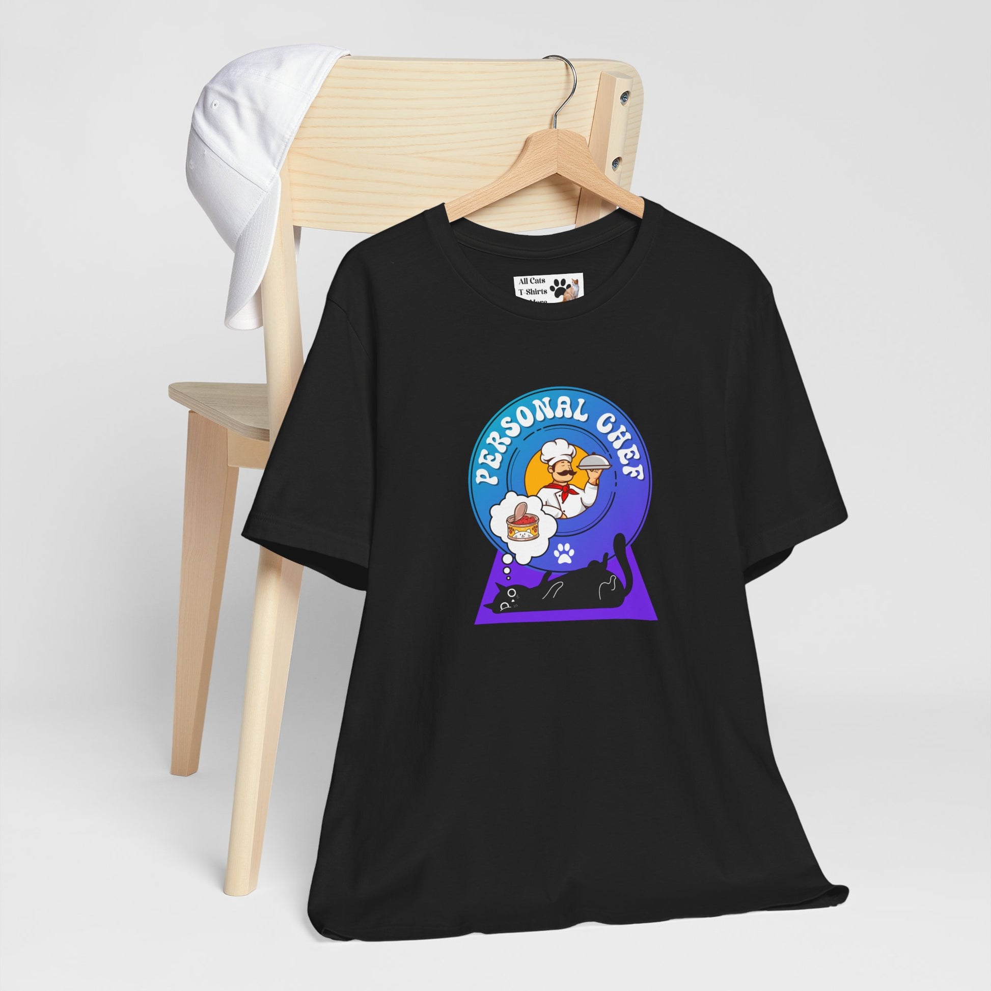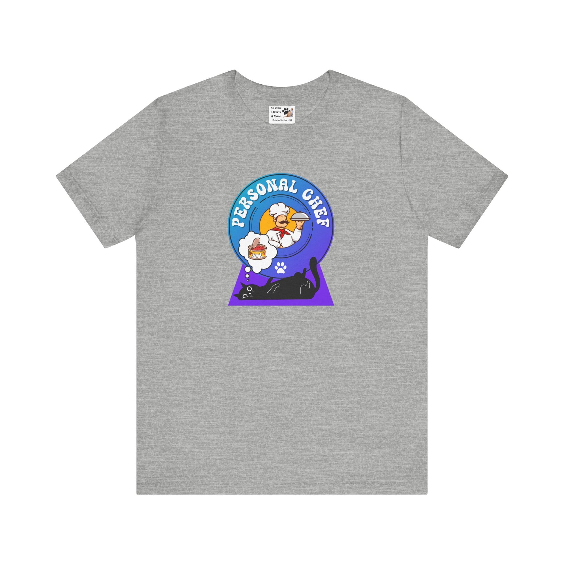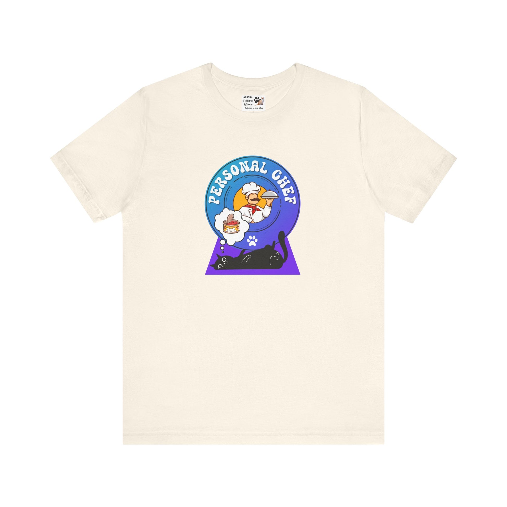 Personal Chef for Cats T-Shirt (#2 - Black Cat & Italian Chef, Blue Purple Design - Unisex Jersey Tee – Perfect Cat Care Givers!)