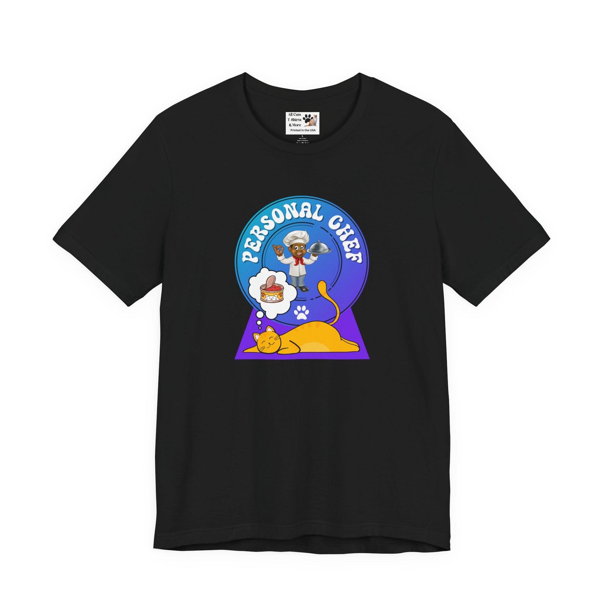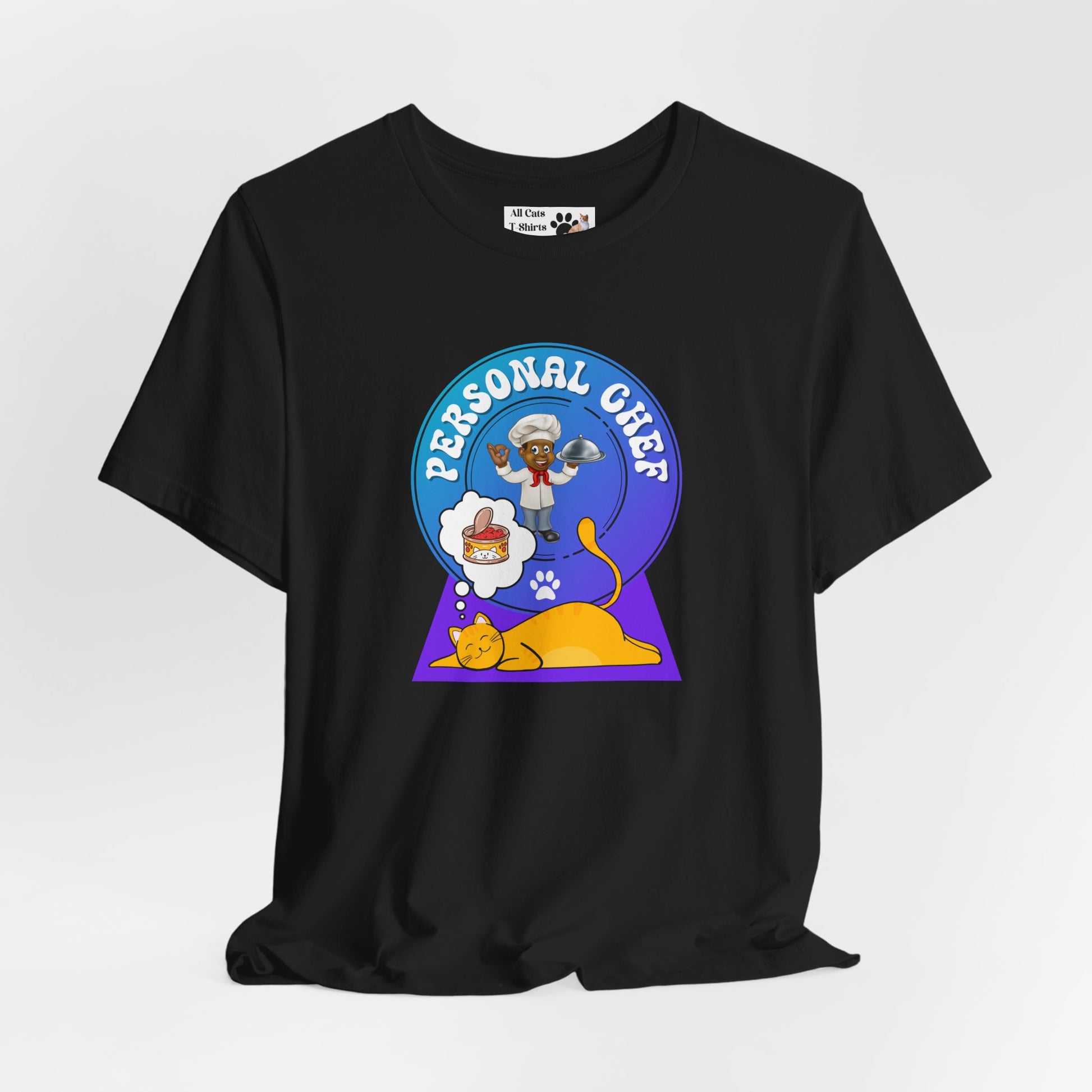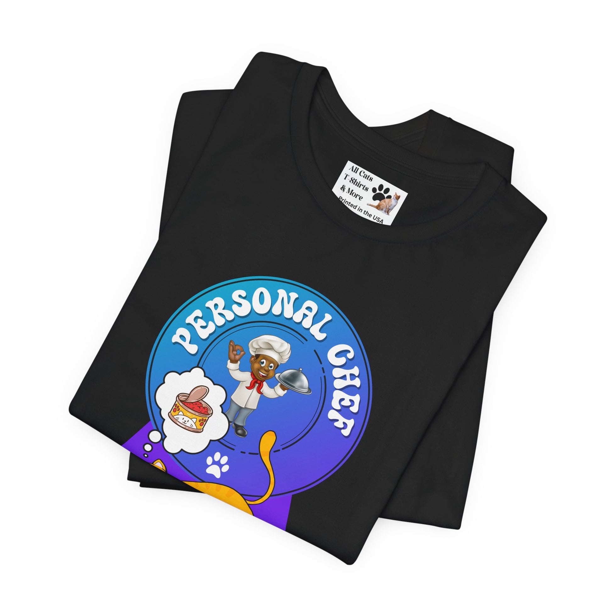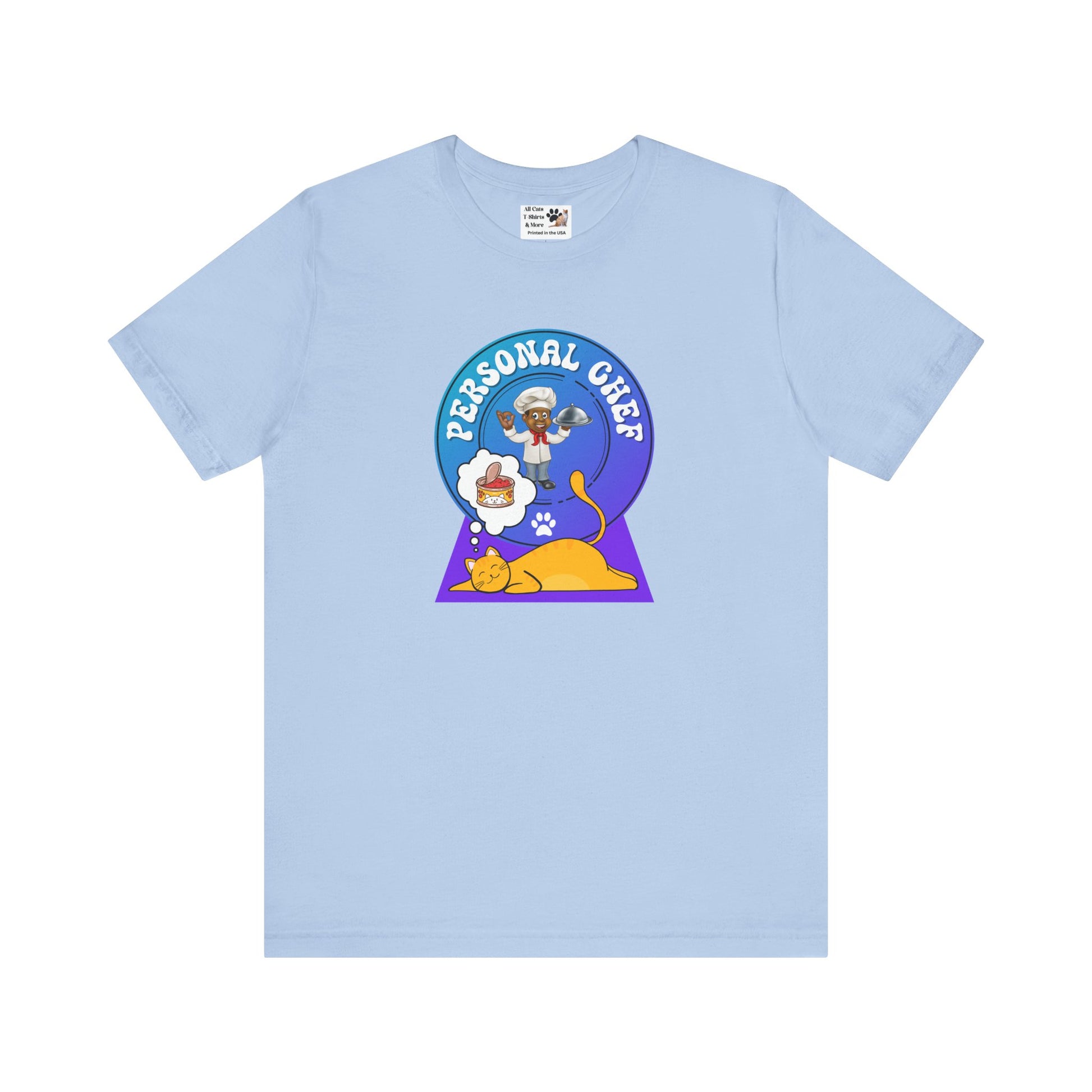 Personal Chef for Cats T-Shirt (#3 - Orange Cat & Chef Blue Purple Design - Unisex Jersey Tee ā Perfect Cat Care Givers!)