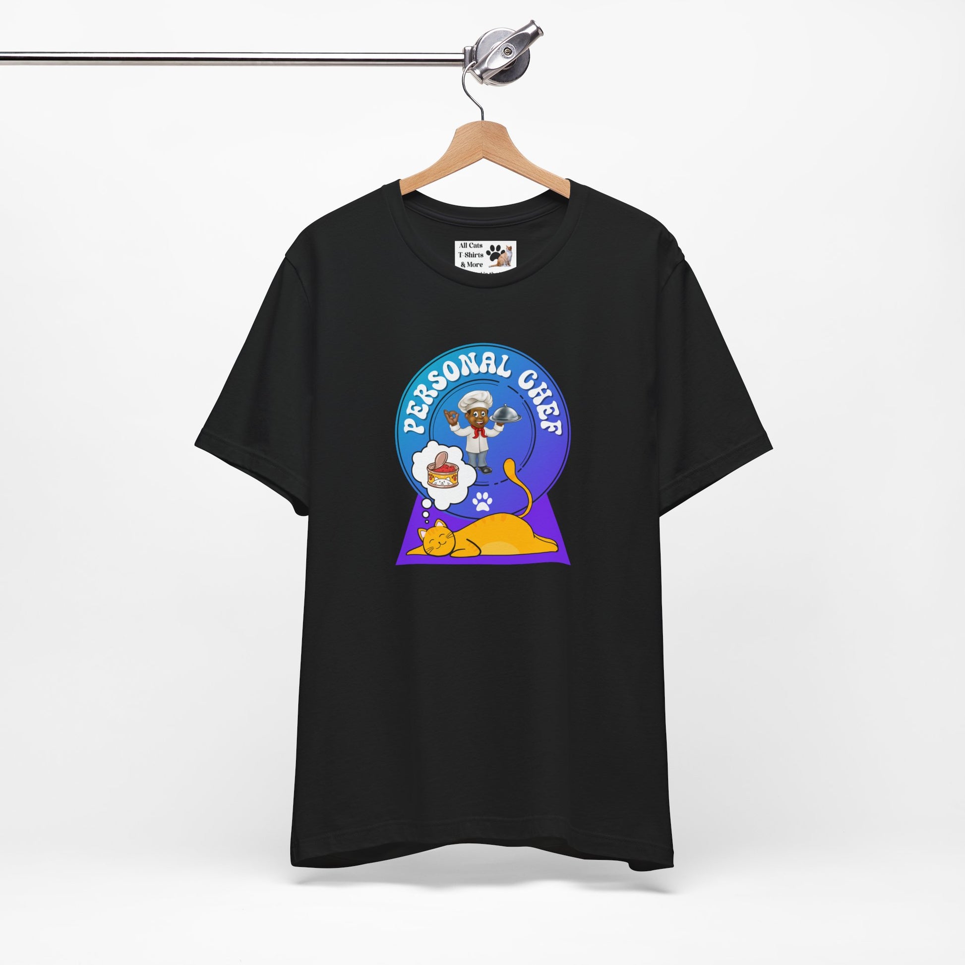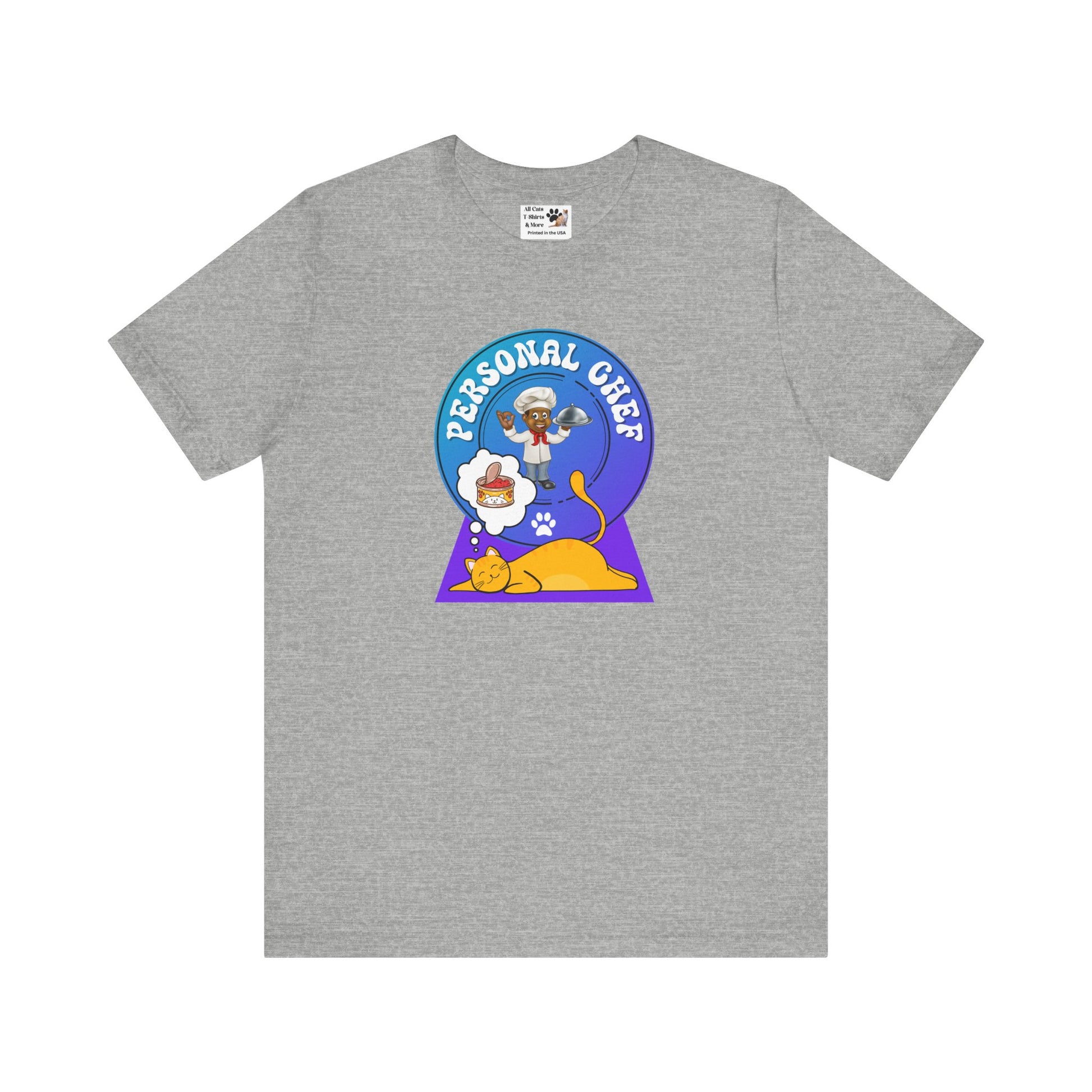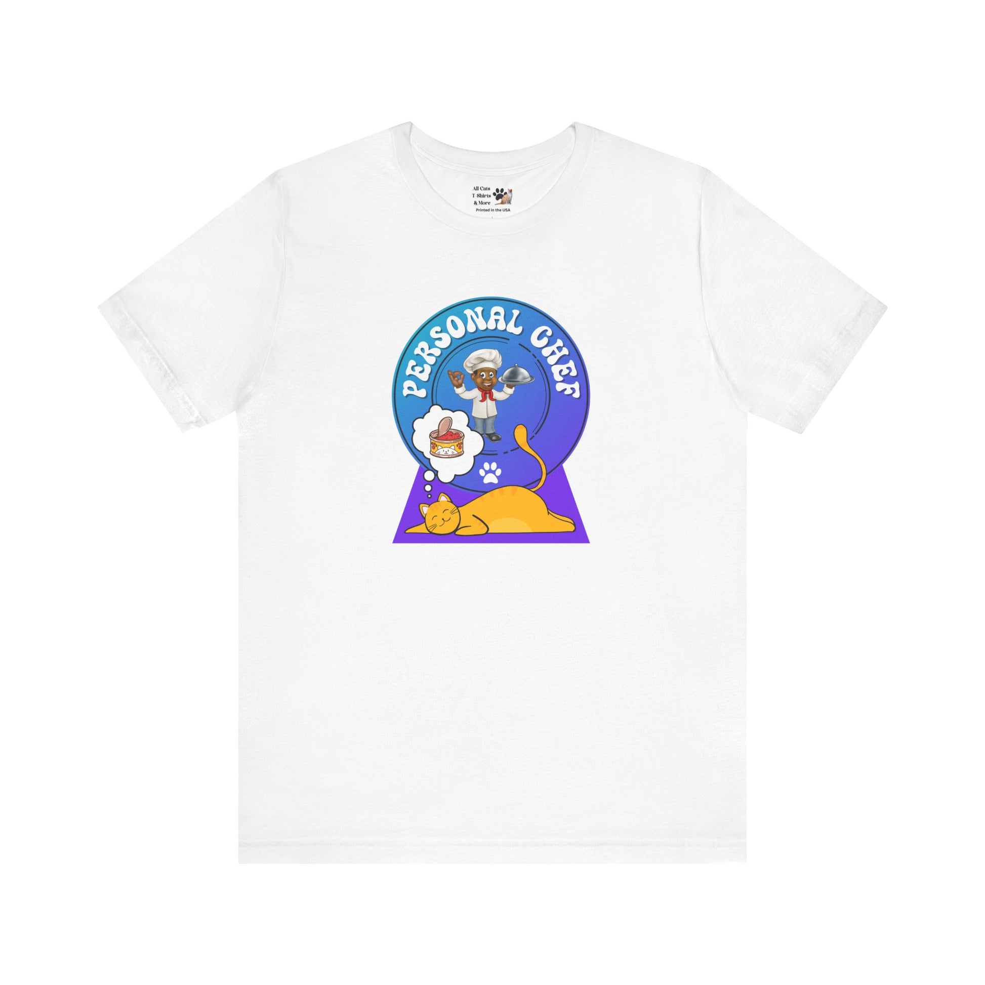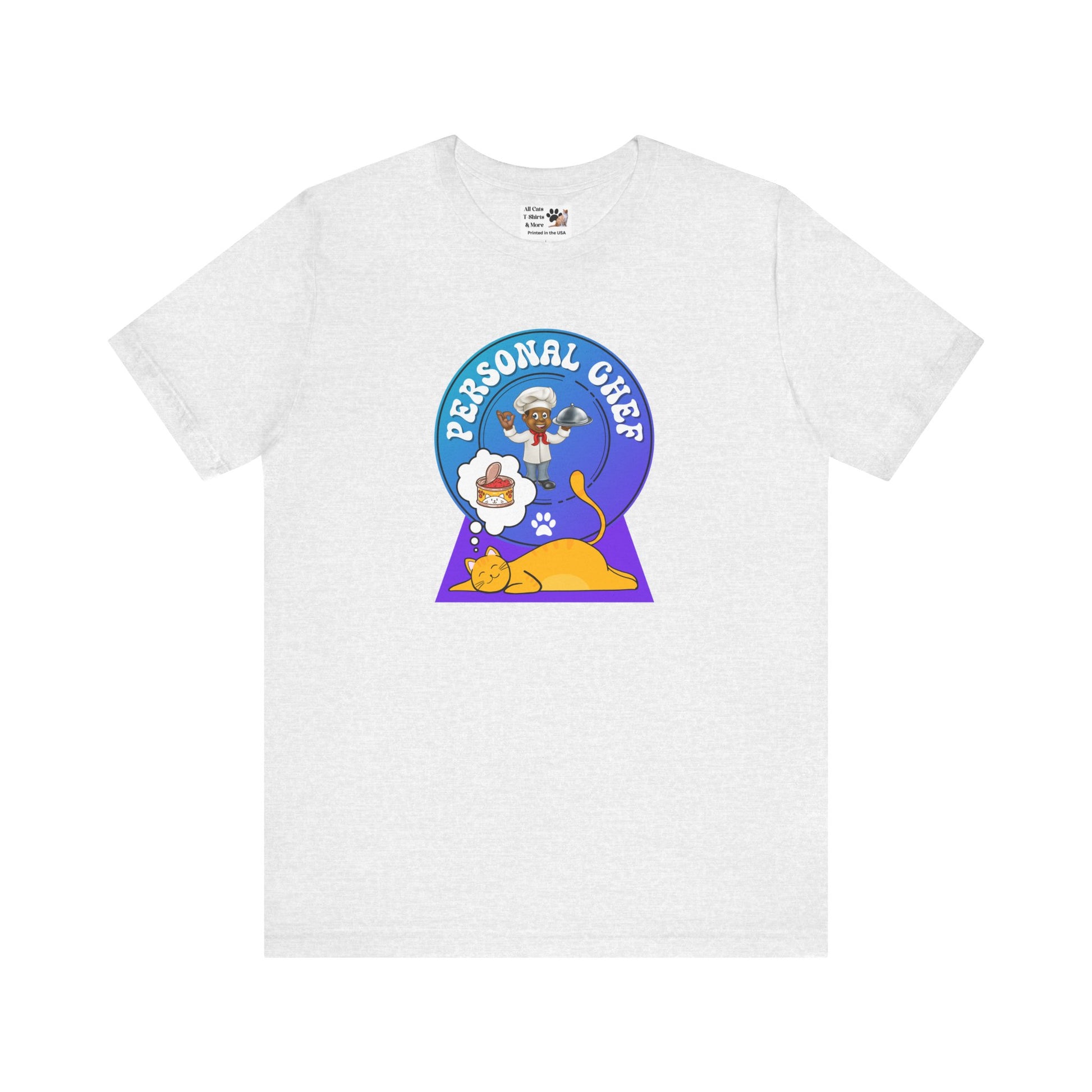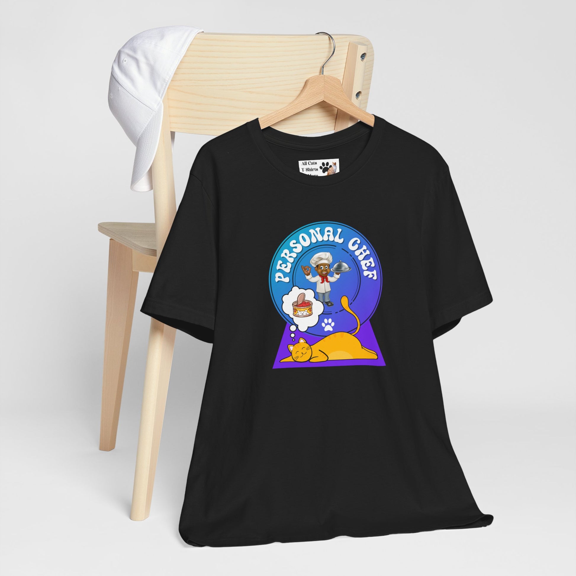 Personal Chef for Cats T-Shirt (#3 - Orange Cat & Chef Blue Purple Design - Unisex Jersey Tee ā Perfect Cat Care Givers!)