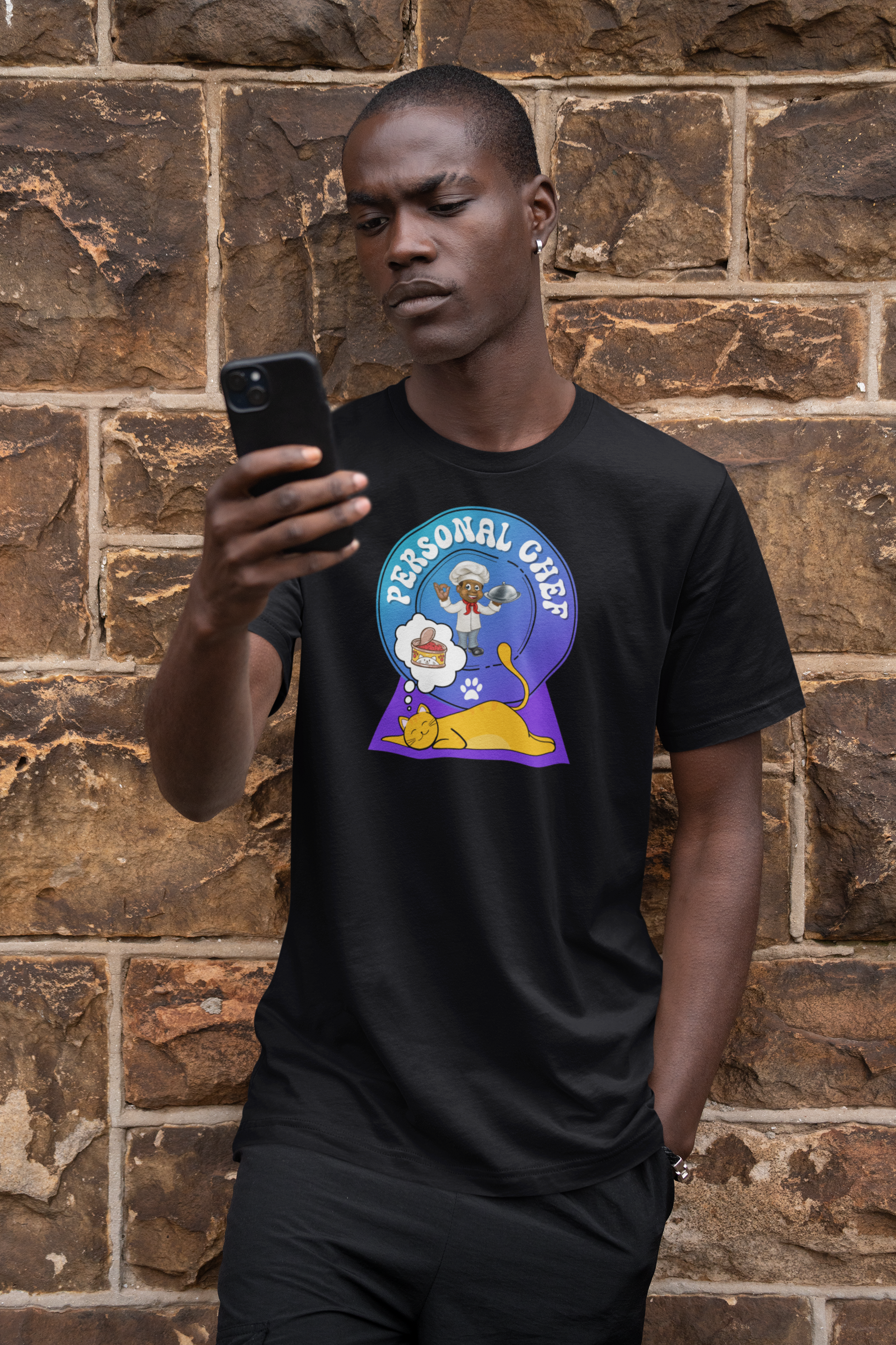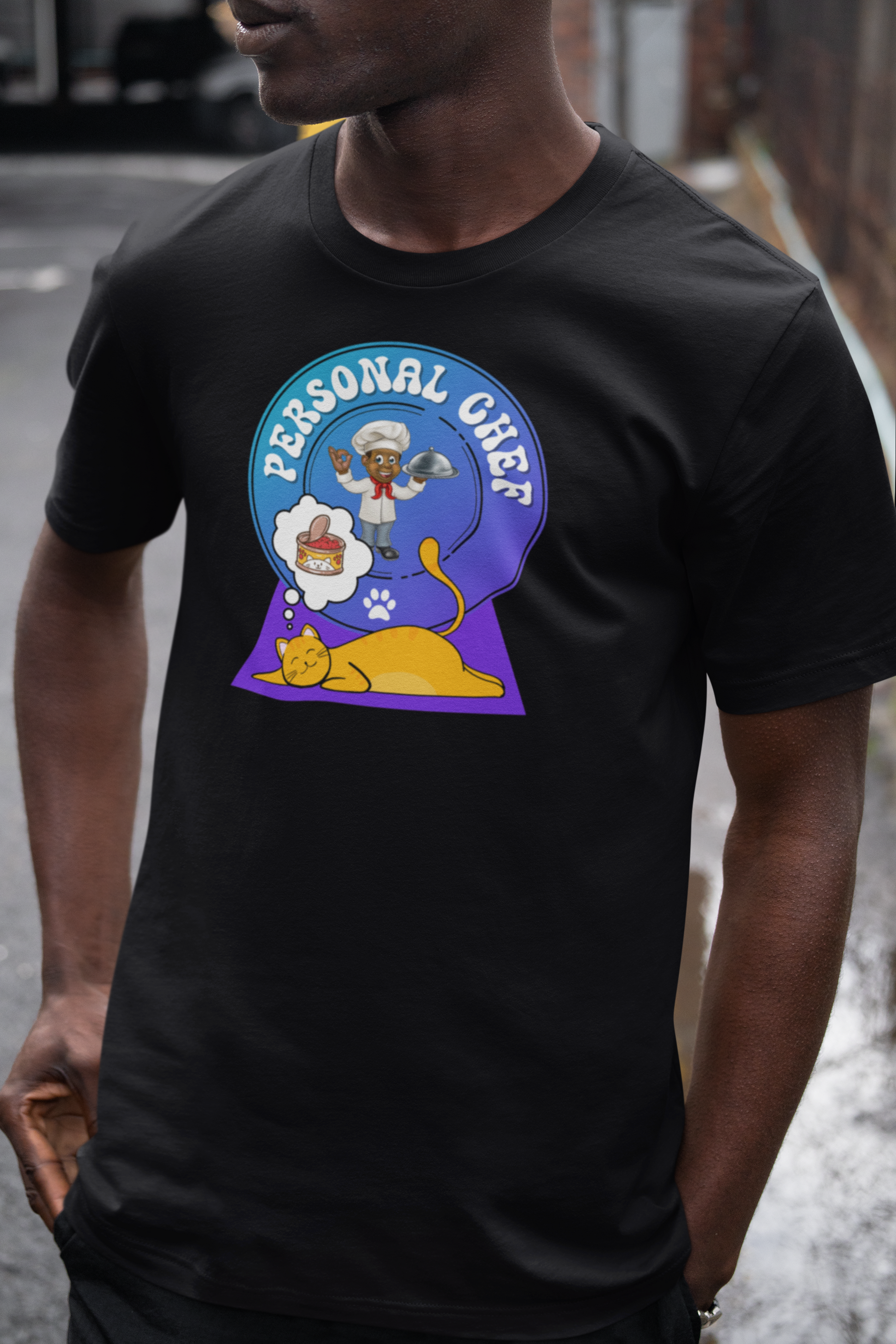 Are you a "PERSONAL CHEF" for your kitty? Introducing the Personal Chef for Cats T-shirts theme; these T-shirts help proud cat owners make a fun and funny statment about being their cats "personal chef" (Or the opener of the can of cat food!) This T-Shirt features an Orange Cat dreaming about its tin of cat food with a chef in the background holding a covered platter, on a blue and purple background. This fun and quirky design is perfect for cat lovers and can be a great conversation starter and a playful addition to a casual outfit. Ideal for wearing during everyday activities or while hanging out with friends. Relevant for cat owners and parents and those who enjoy unique and humorous clothing.Ā