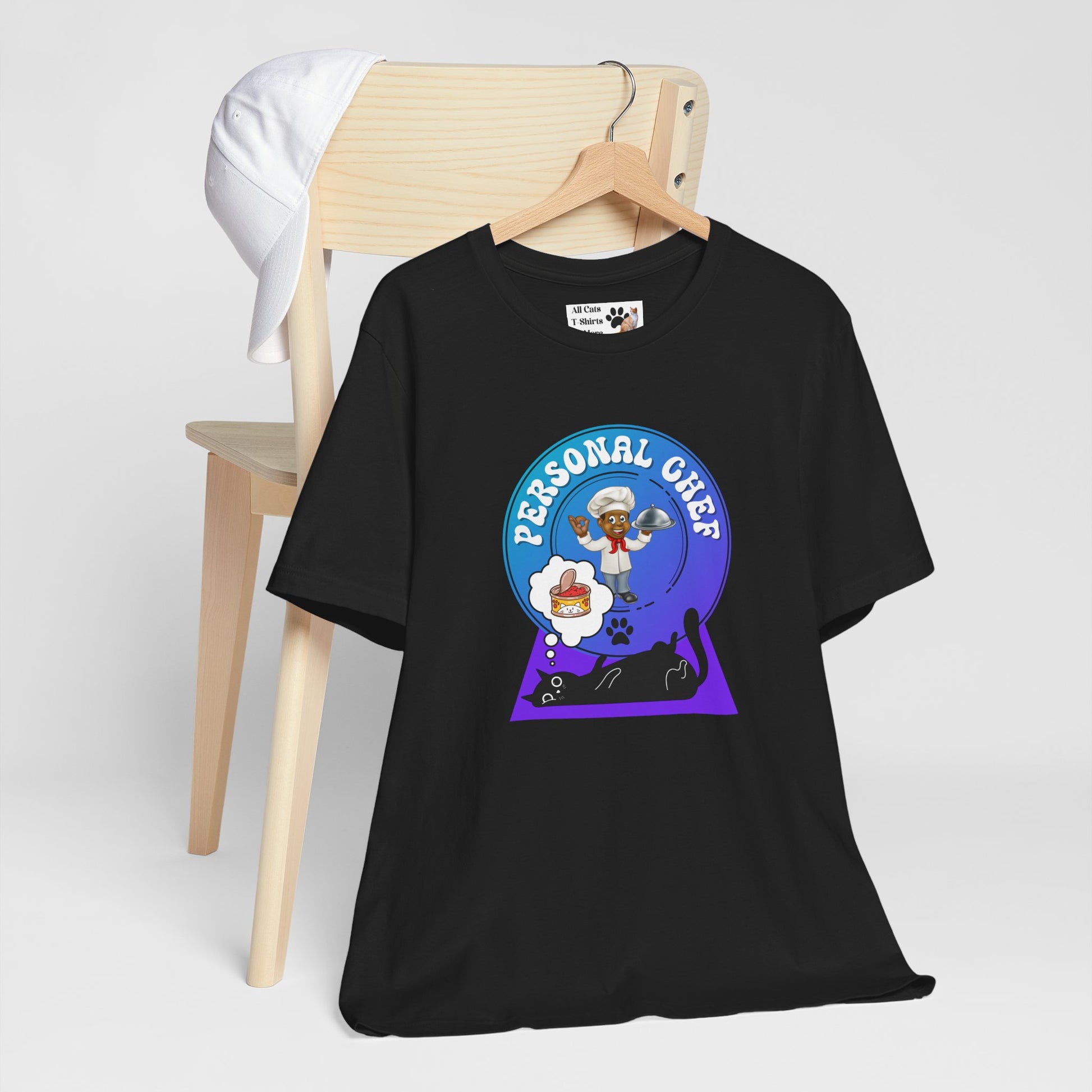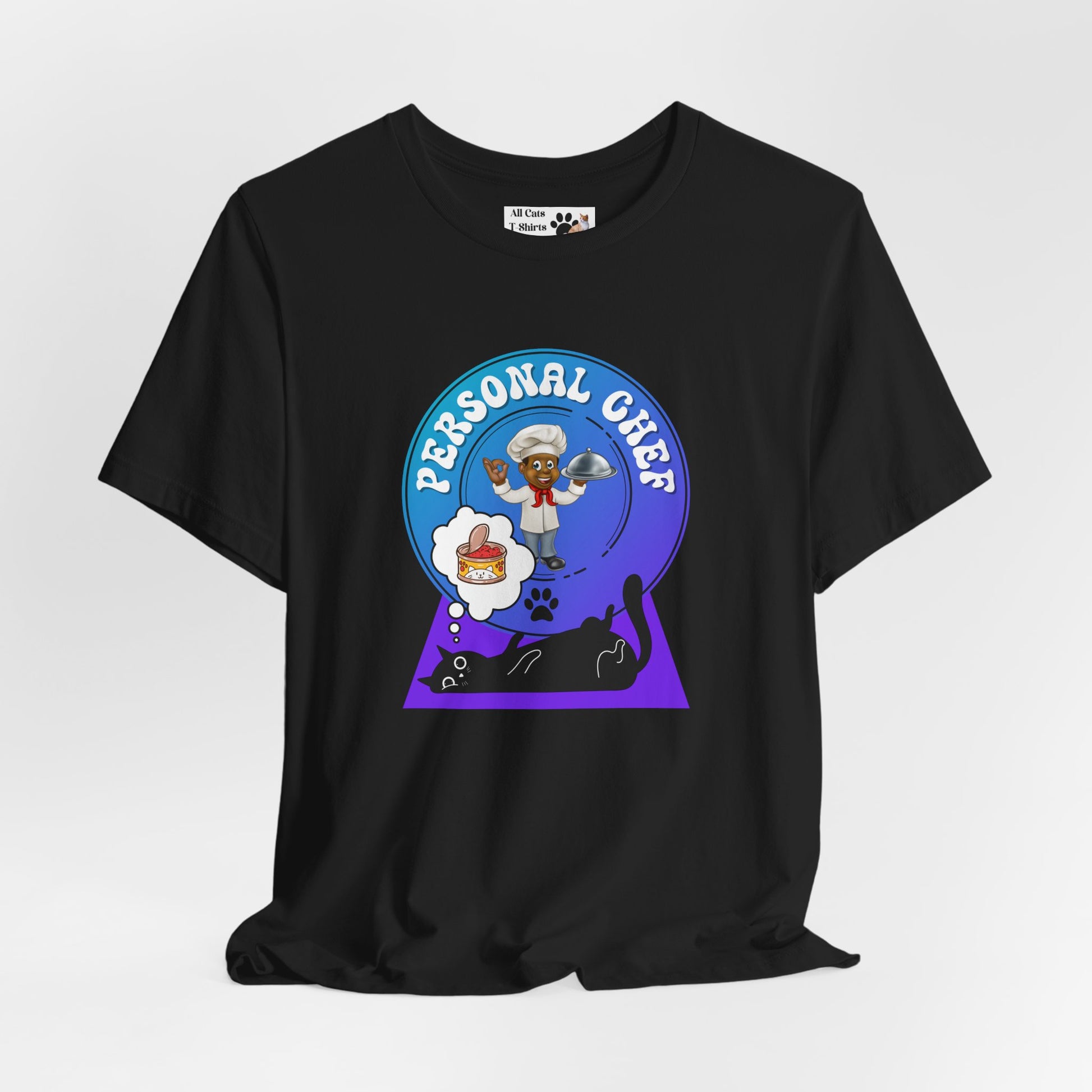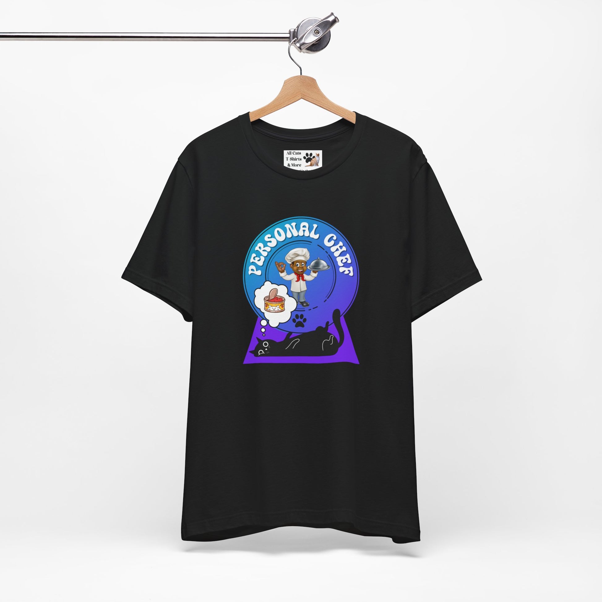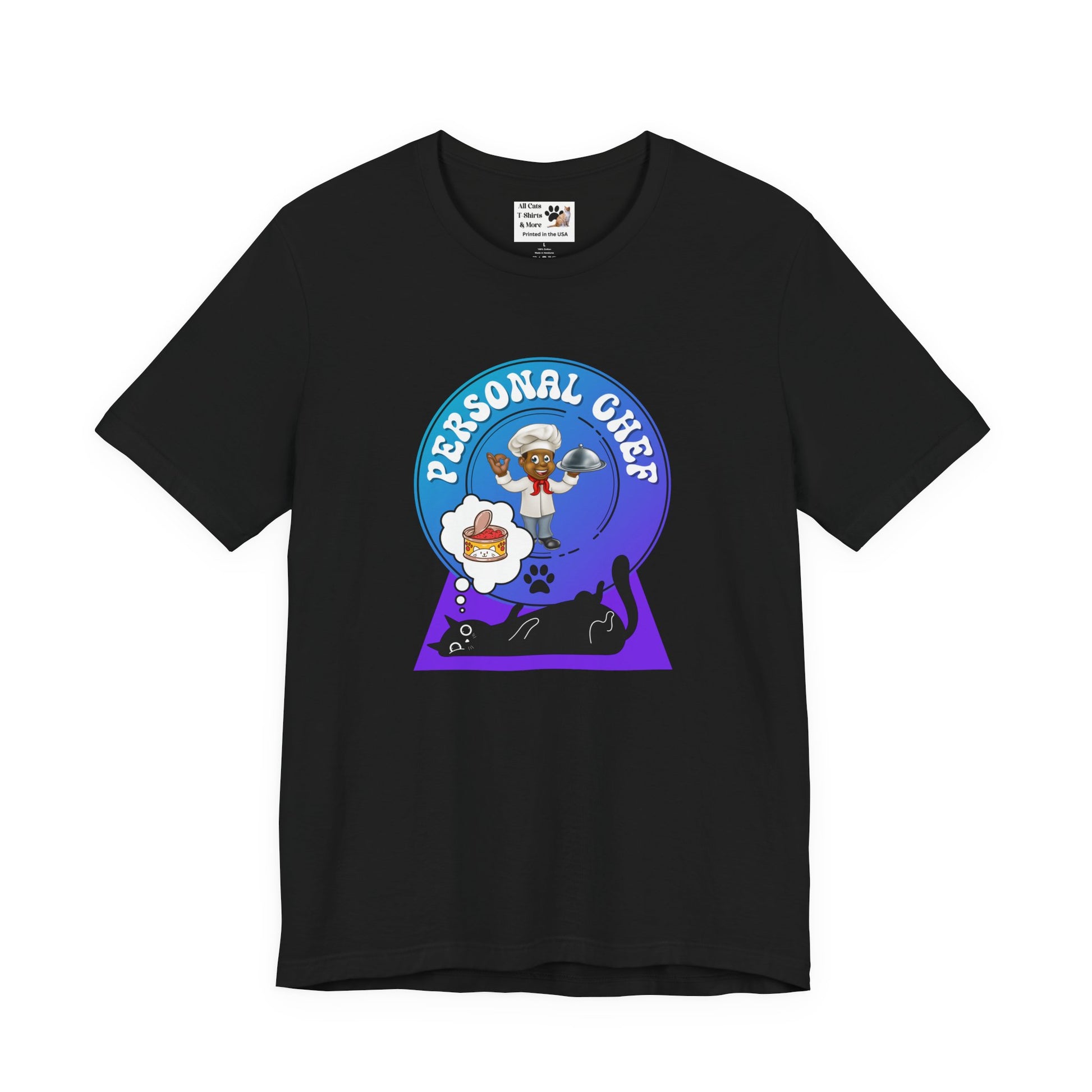 Personal Chef for Cats T-Shirt (#5 - Black Cat & Chef Blue Purple Design - Unisex Jersey Tee – Perfect Cat Care Givers!)