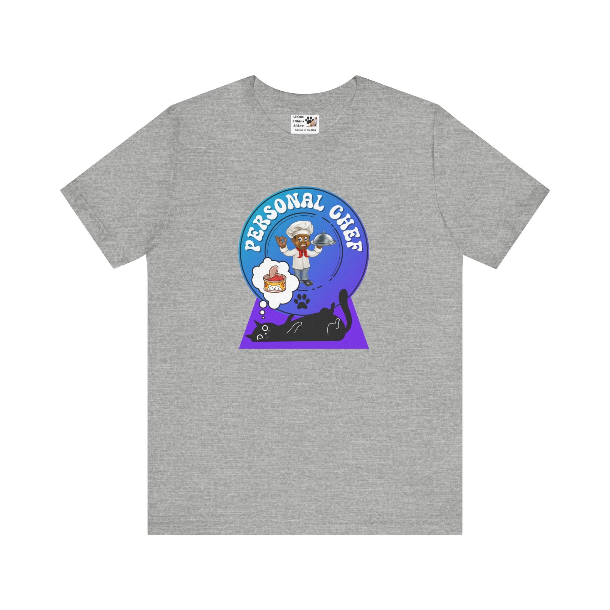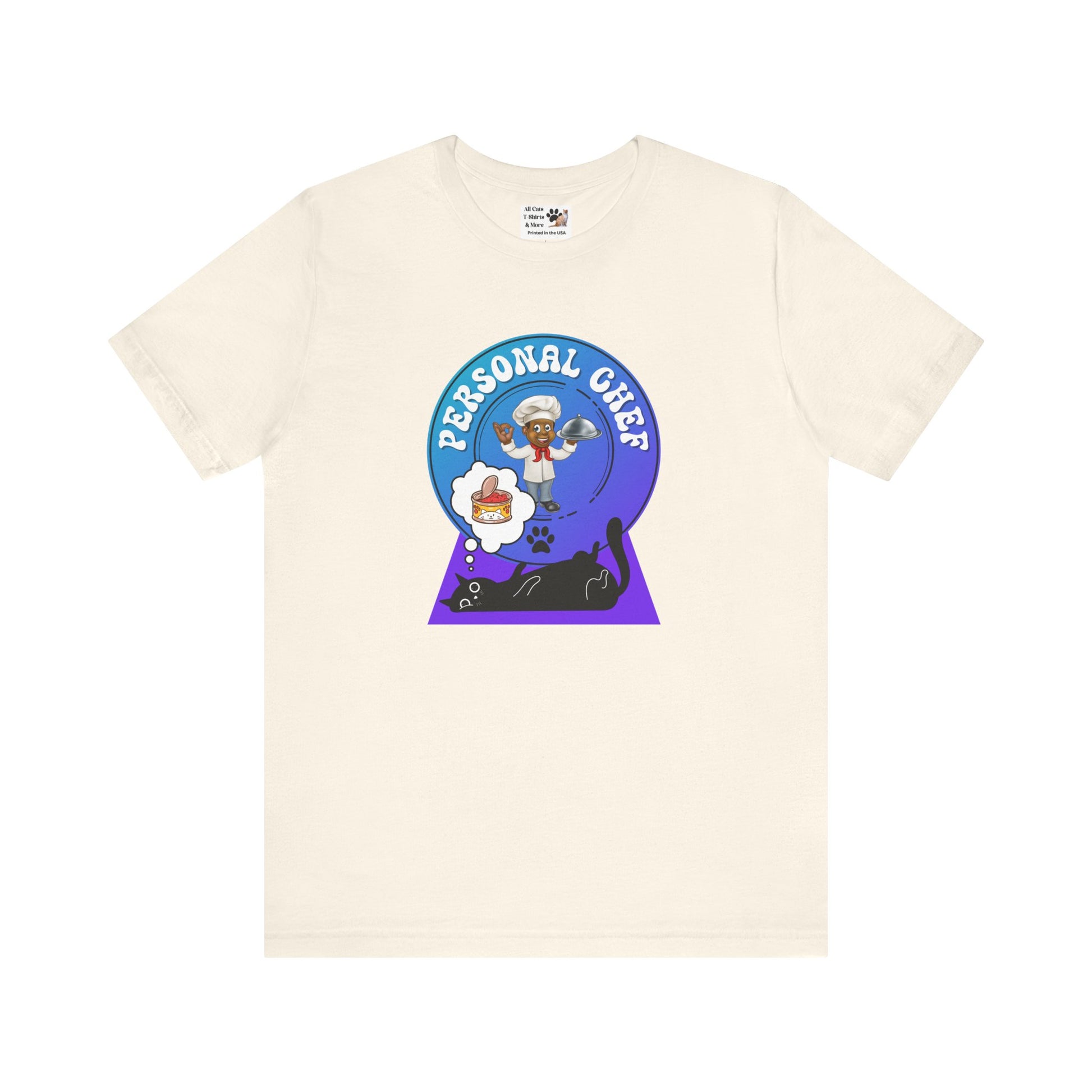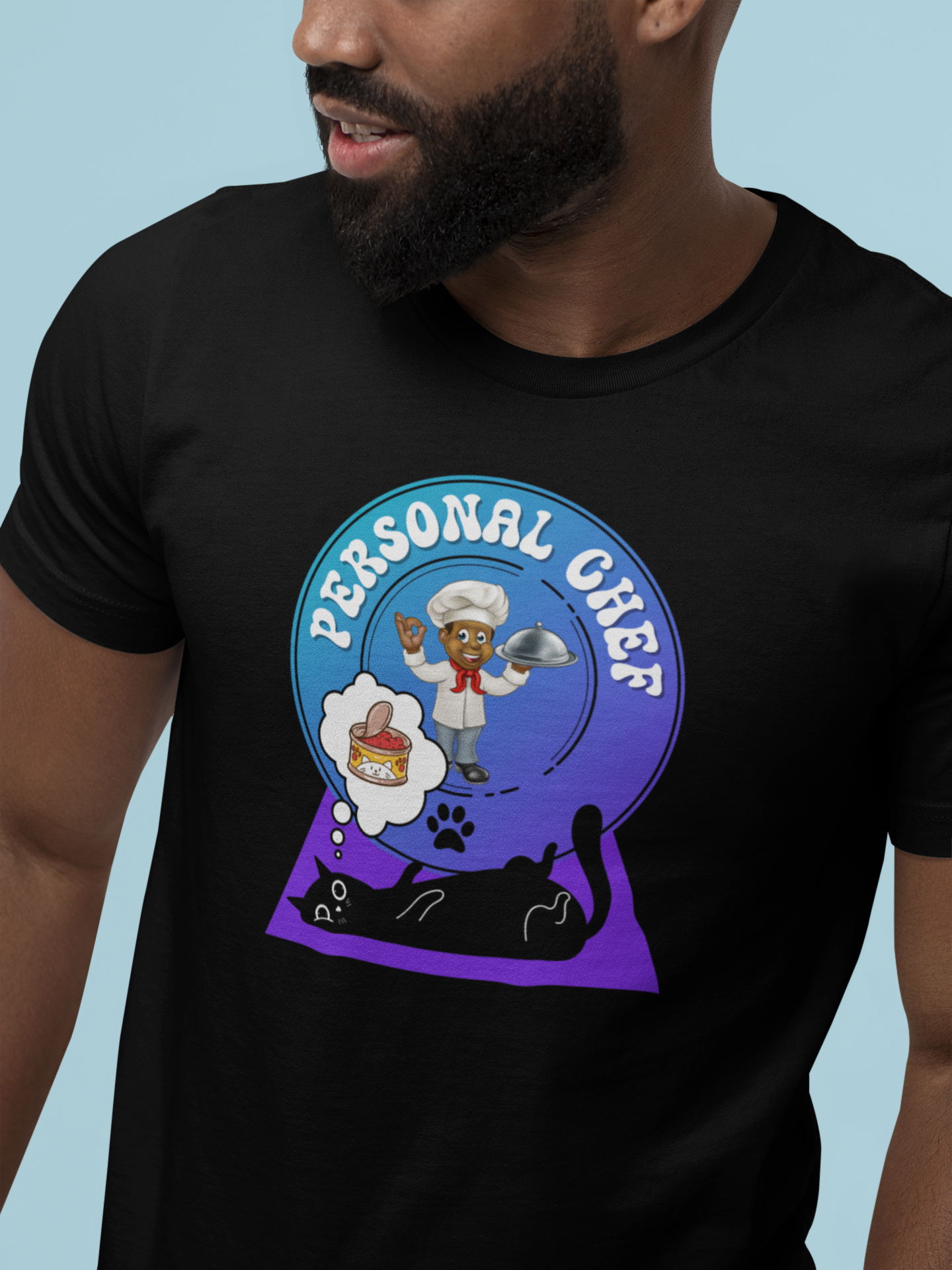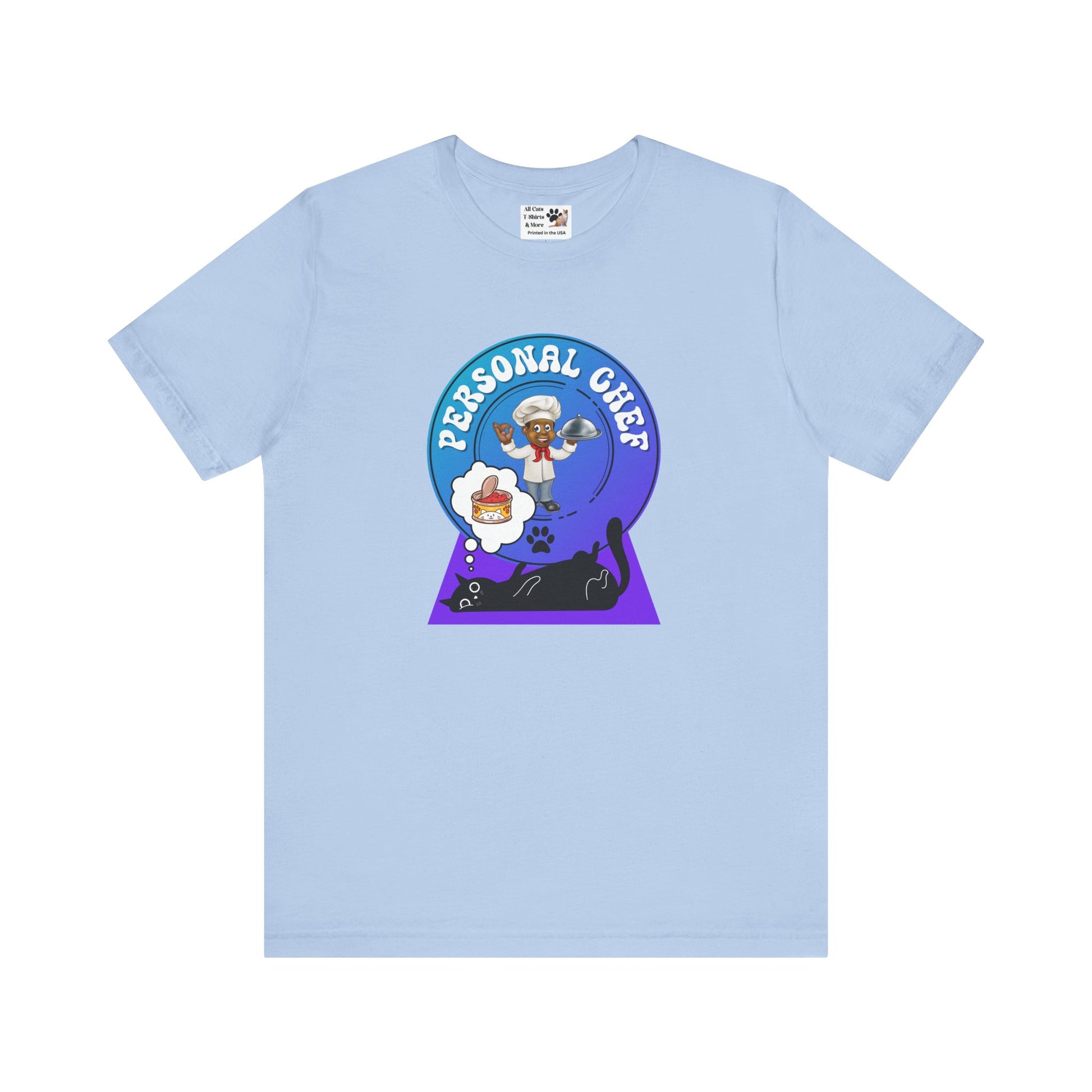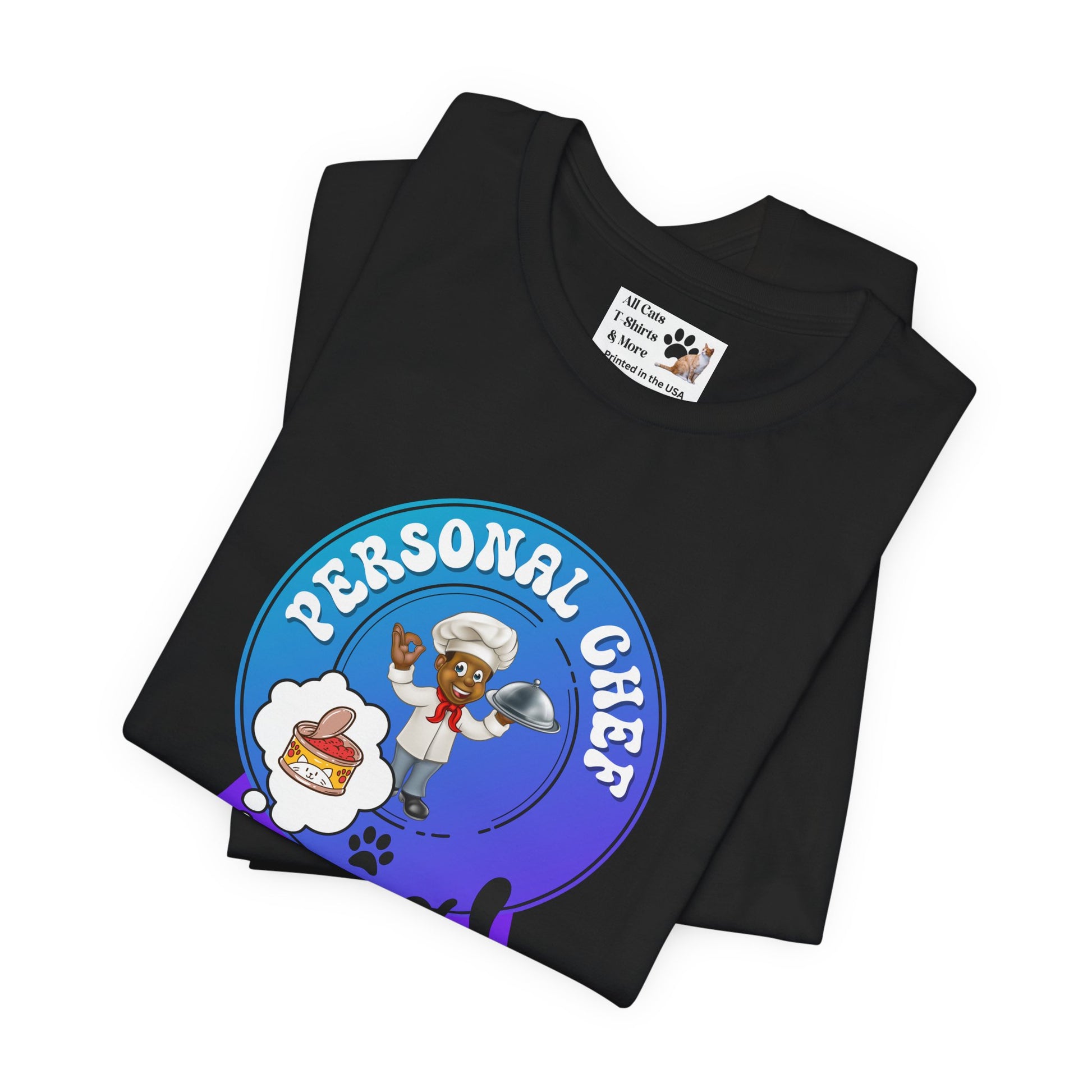 Personal Chef for Cats T-Shirt (#5 - Black Cat & Chef Blue Purple Design - Unisex Jersey Tee – Perfect Cat Care Givers!)
