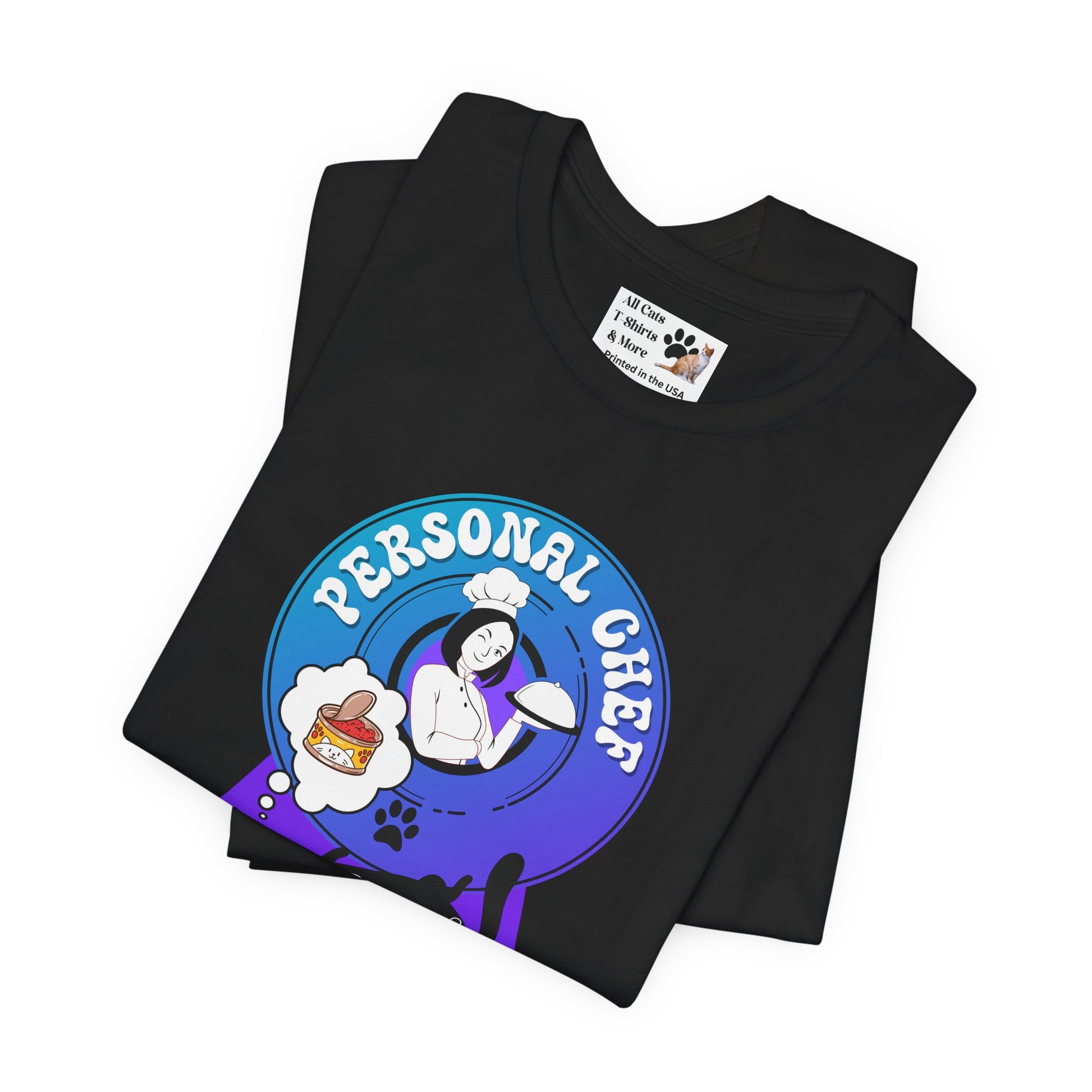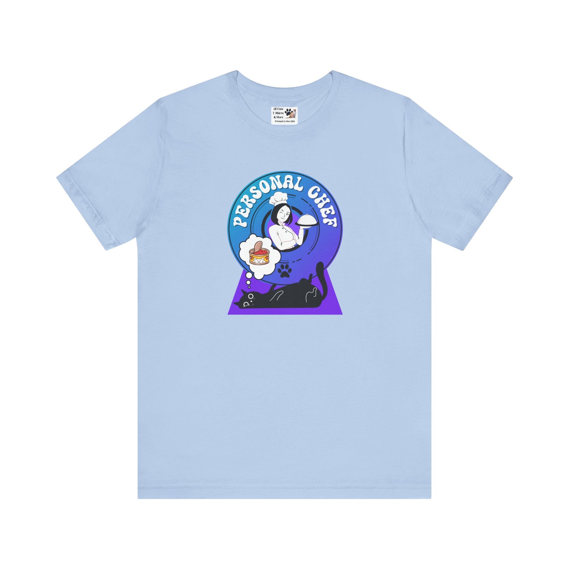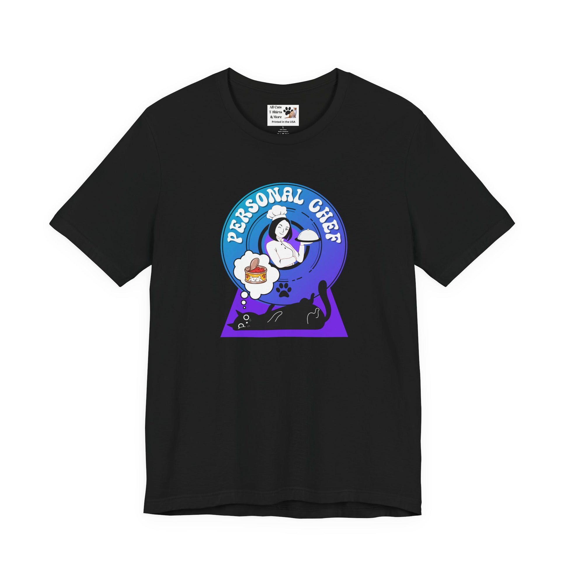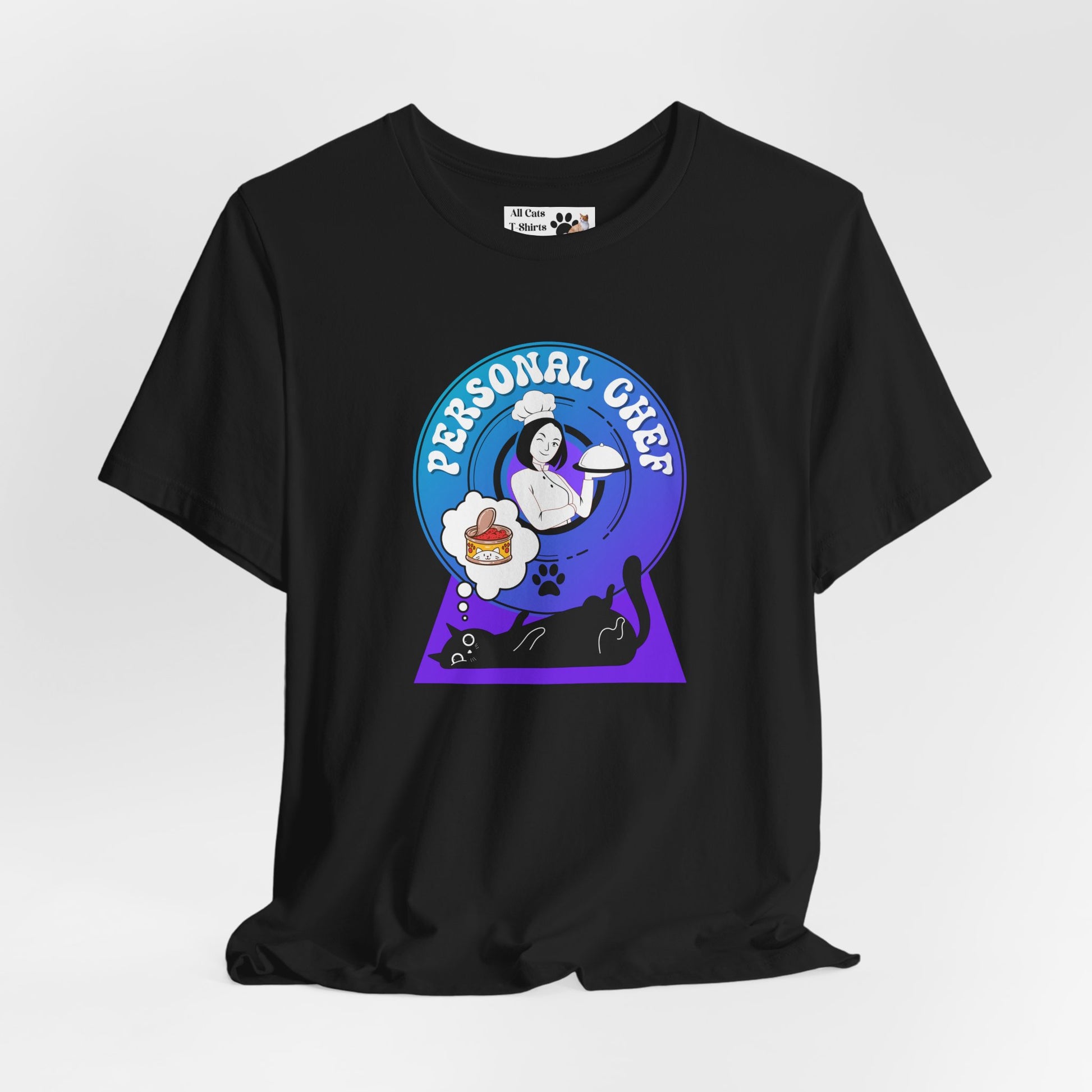 Personal Chef for Cats T-Shirt - (#7 - Black Cat & Chef Blue Purple Design - Unisex Jersey Tee – Perfect for Cat Care Givers!)