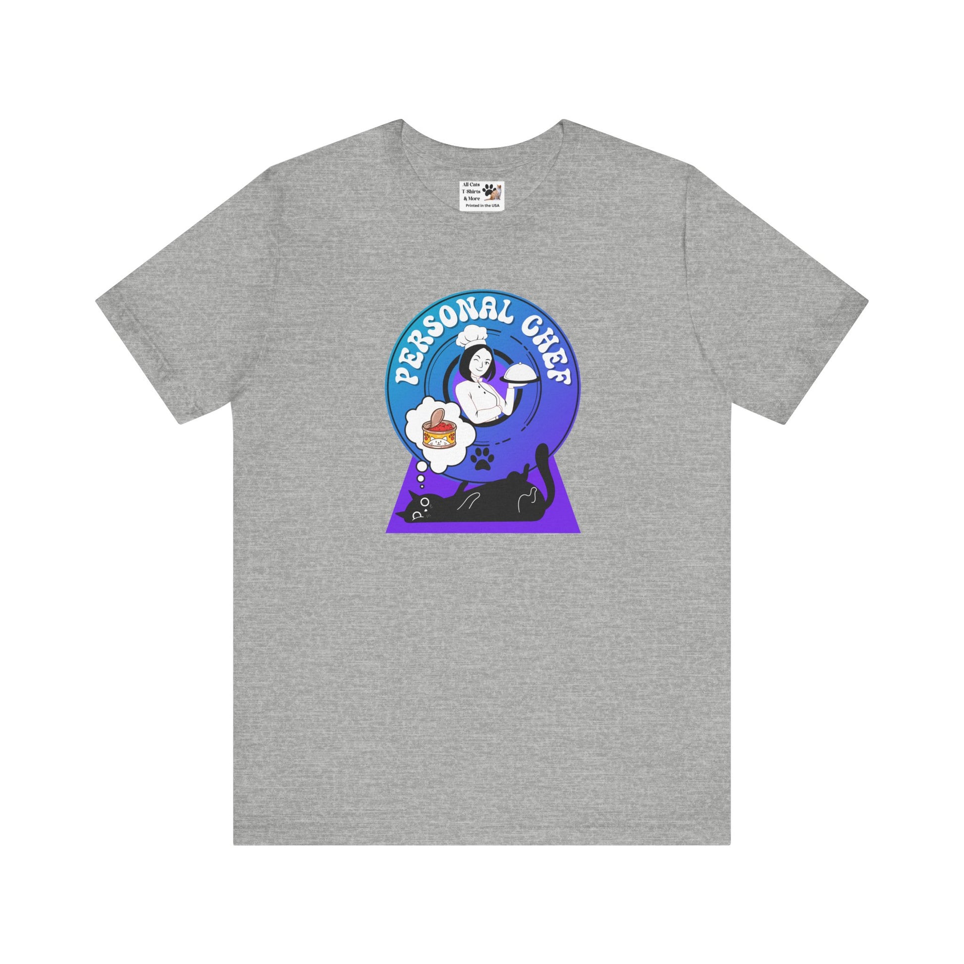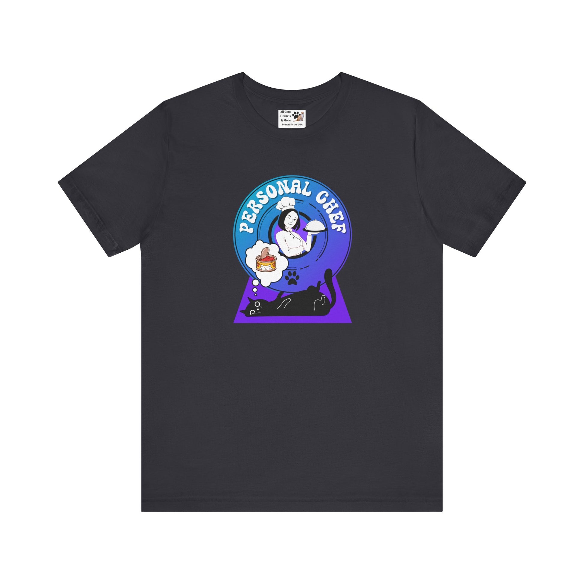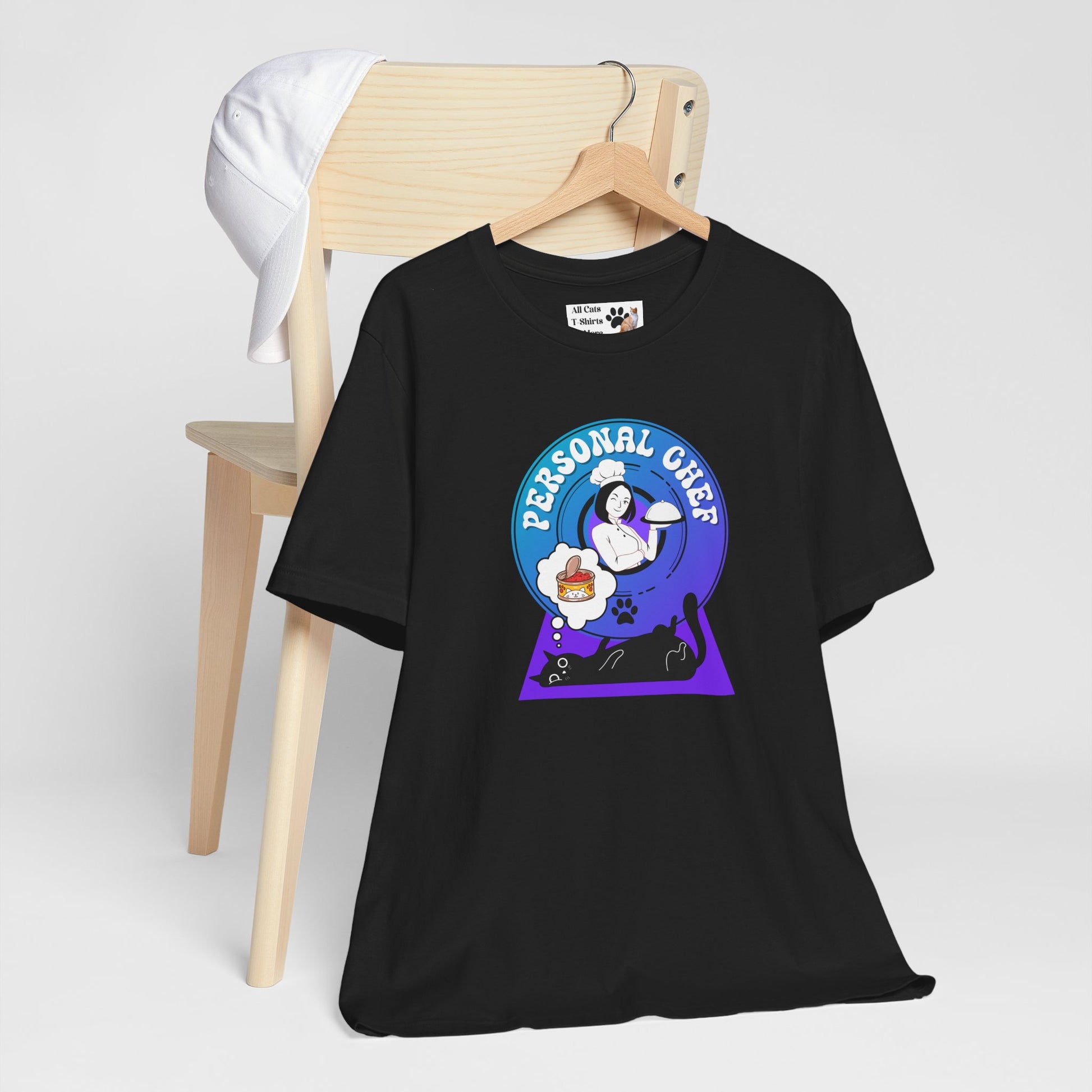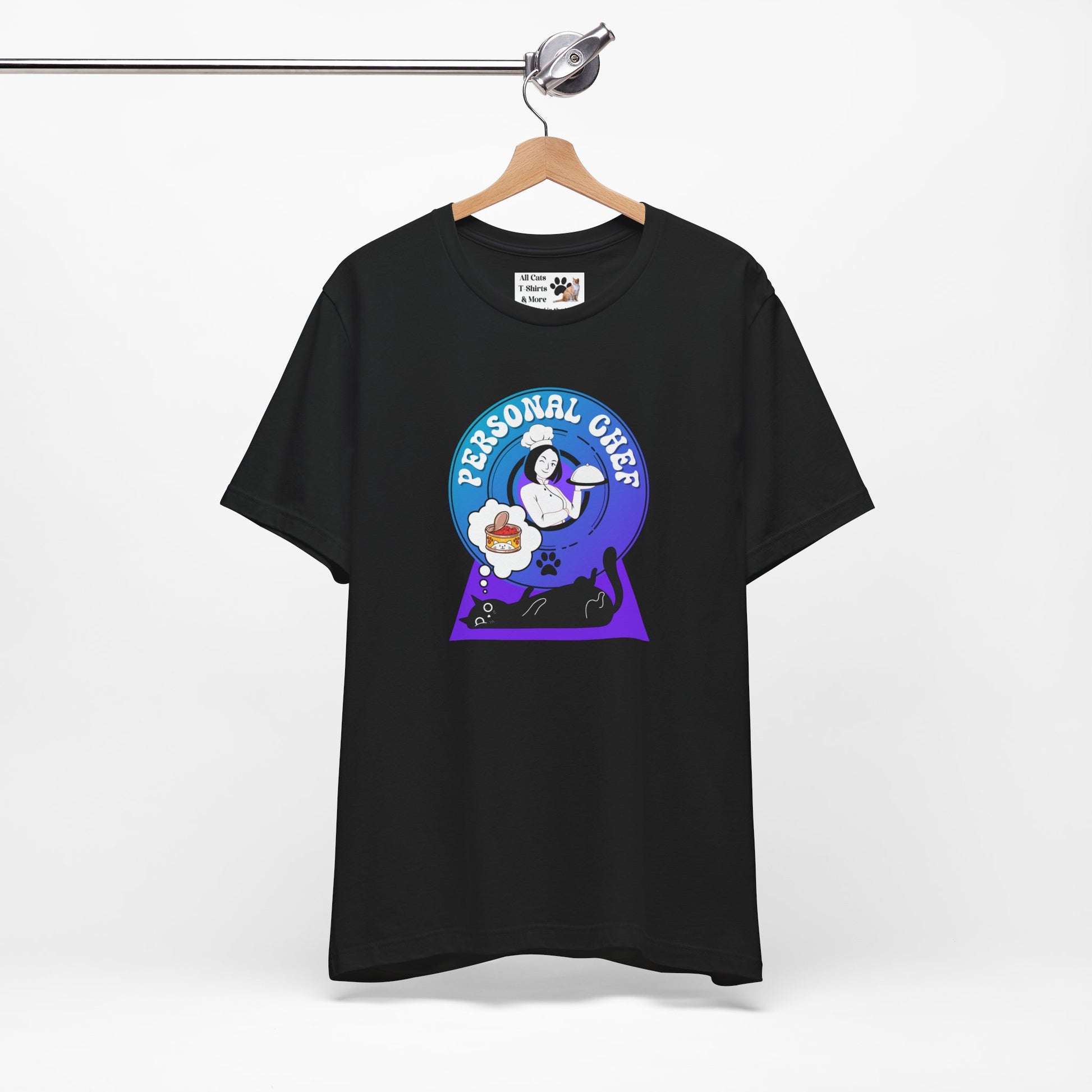 Personal Chef for Cats T-Shirt - (#7 - Black Cat & Chef Blue Purple Design - Unisex Jersey Tee – Perfect for Cat Care Givers!)