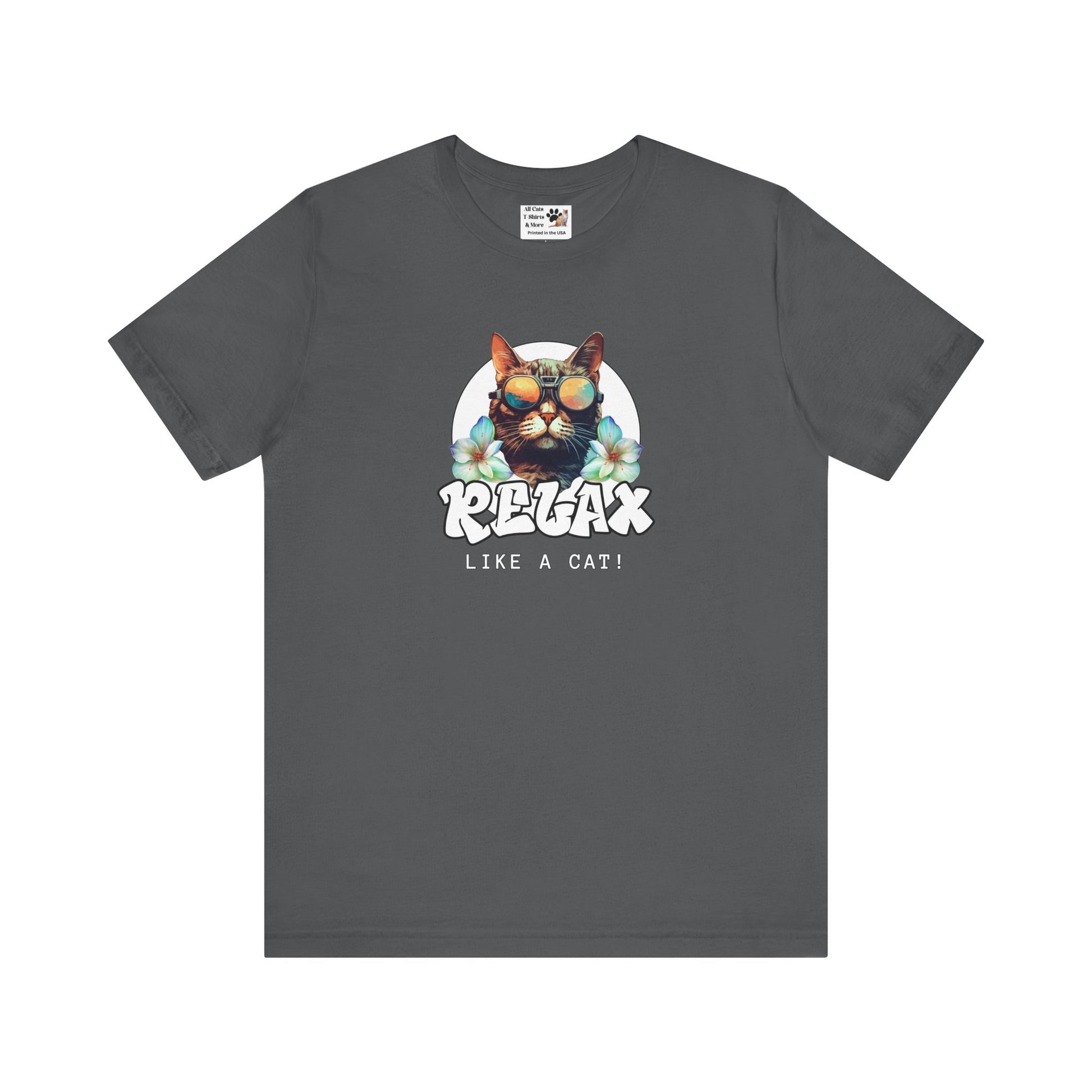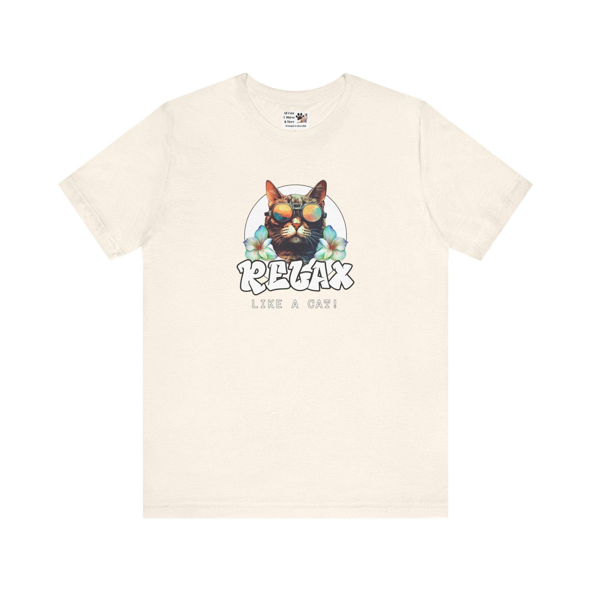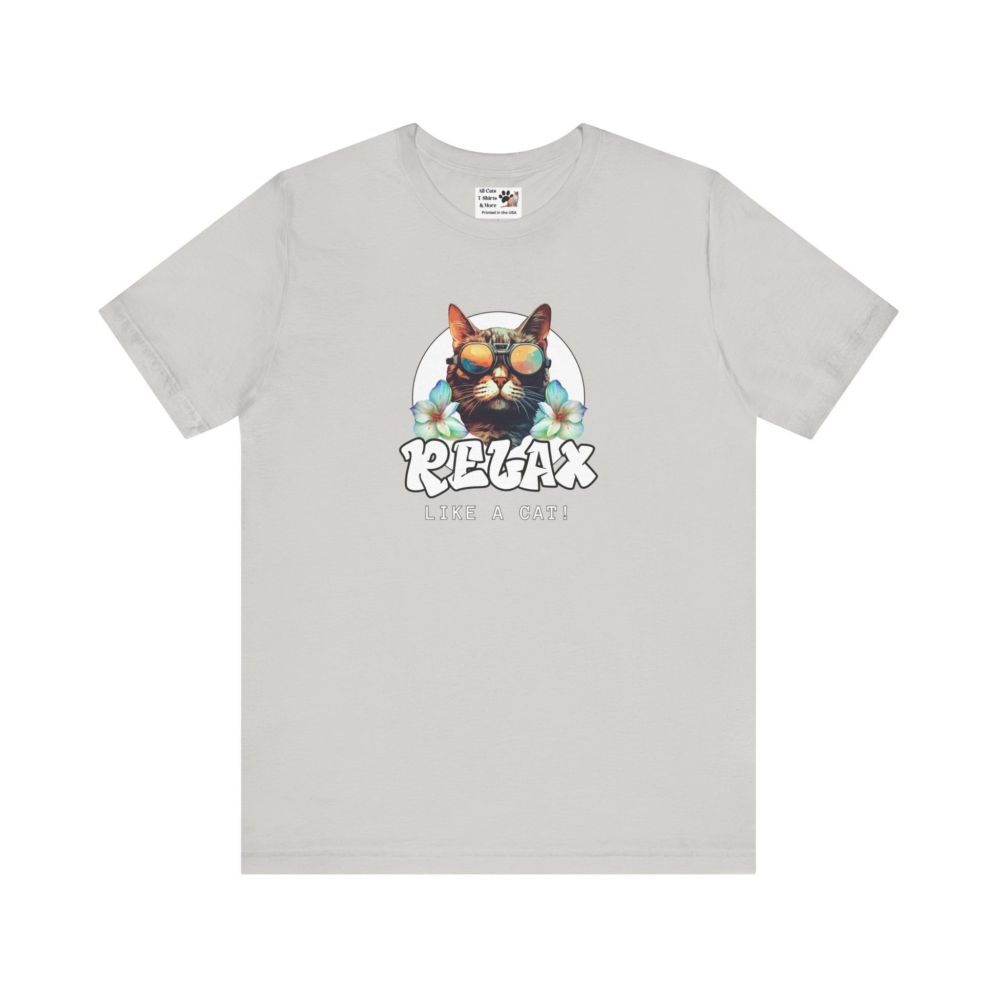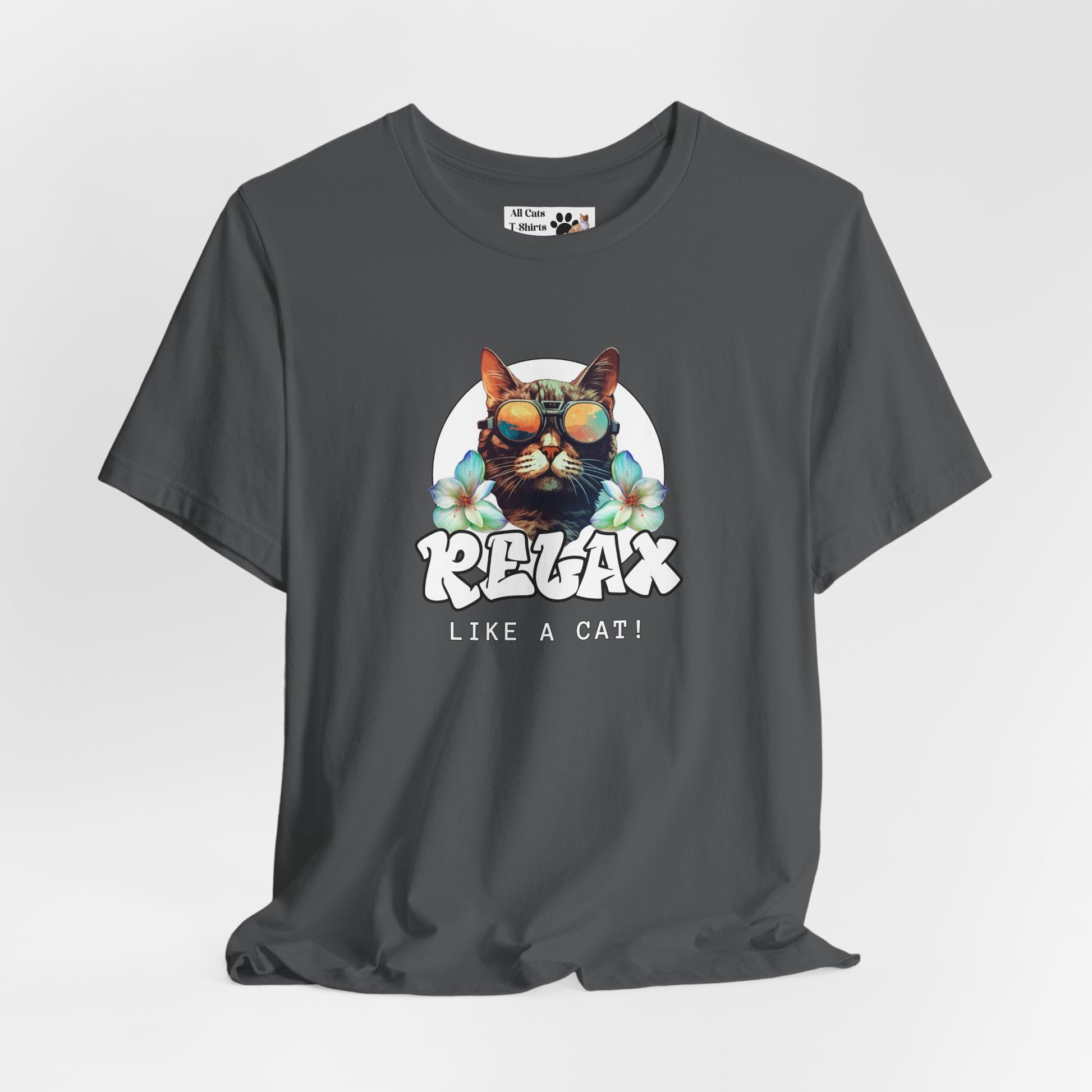 This "Relax Like a Cat" T-Shirt is perfect for cat owners and cat fans. This cool graphic t-shirt of a shades wearing kitty is ideal for lounging in the summer and expressing your love for cats. A great gift for cat lovers. It features a cat in sunglasses on a white circle background, with flowers on either side and the word relax in a cool graffiti style font. This fun and casual tee is perfect for cat fans looking to add a relaxed and stylish vibe to their everyday wardrobe. Ideal for lounging at home or running errands, this t-shirt is also great for casual outings with friends. Perfect for cat lovers birthdays, or just for a fun and quirky everyday look.