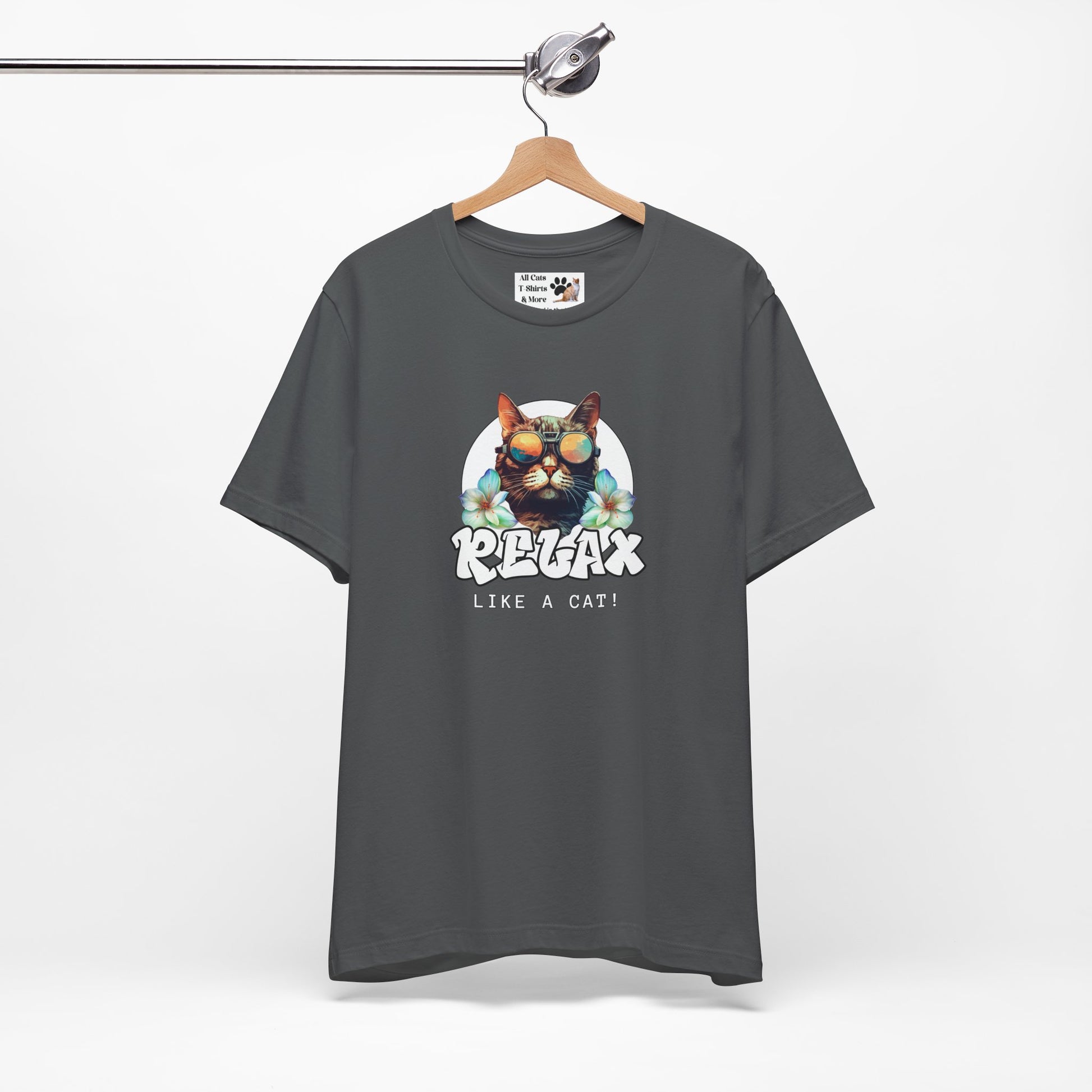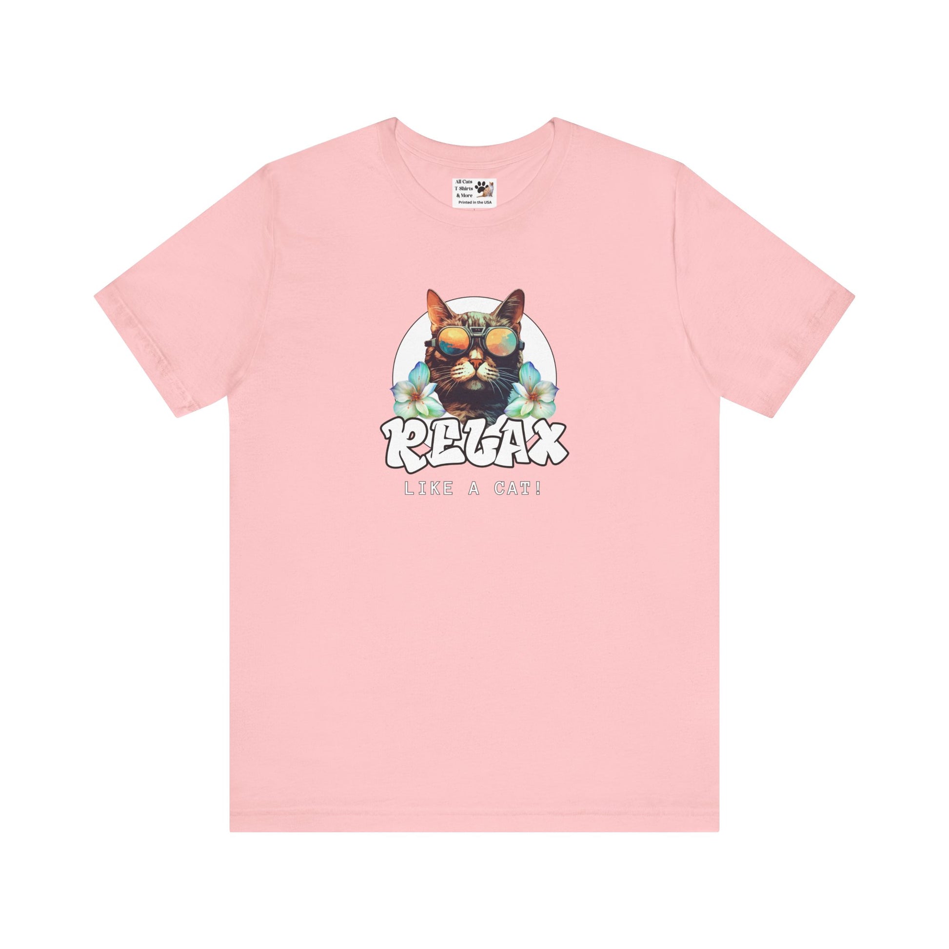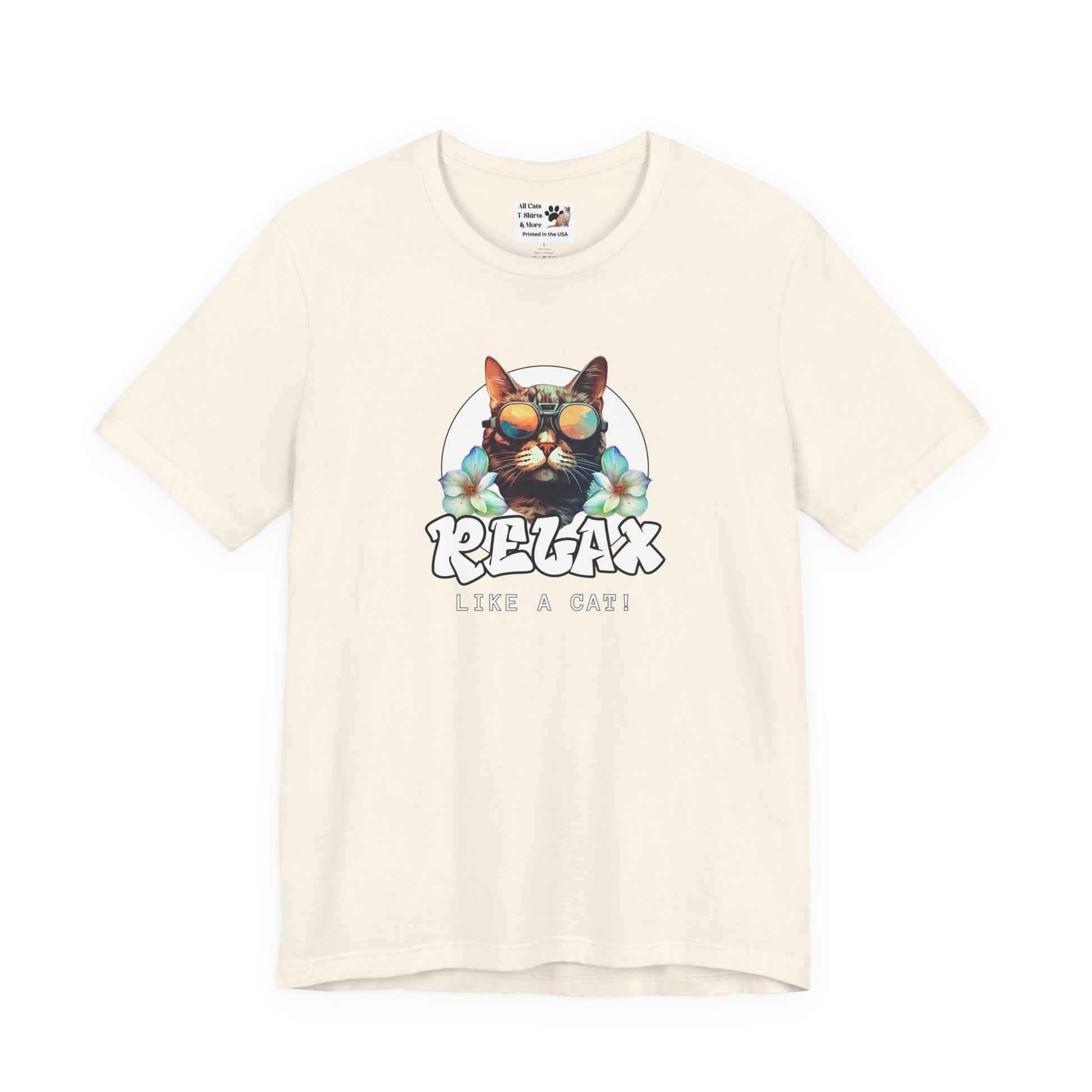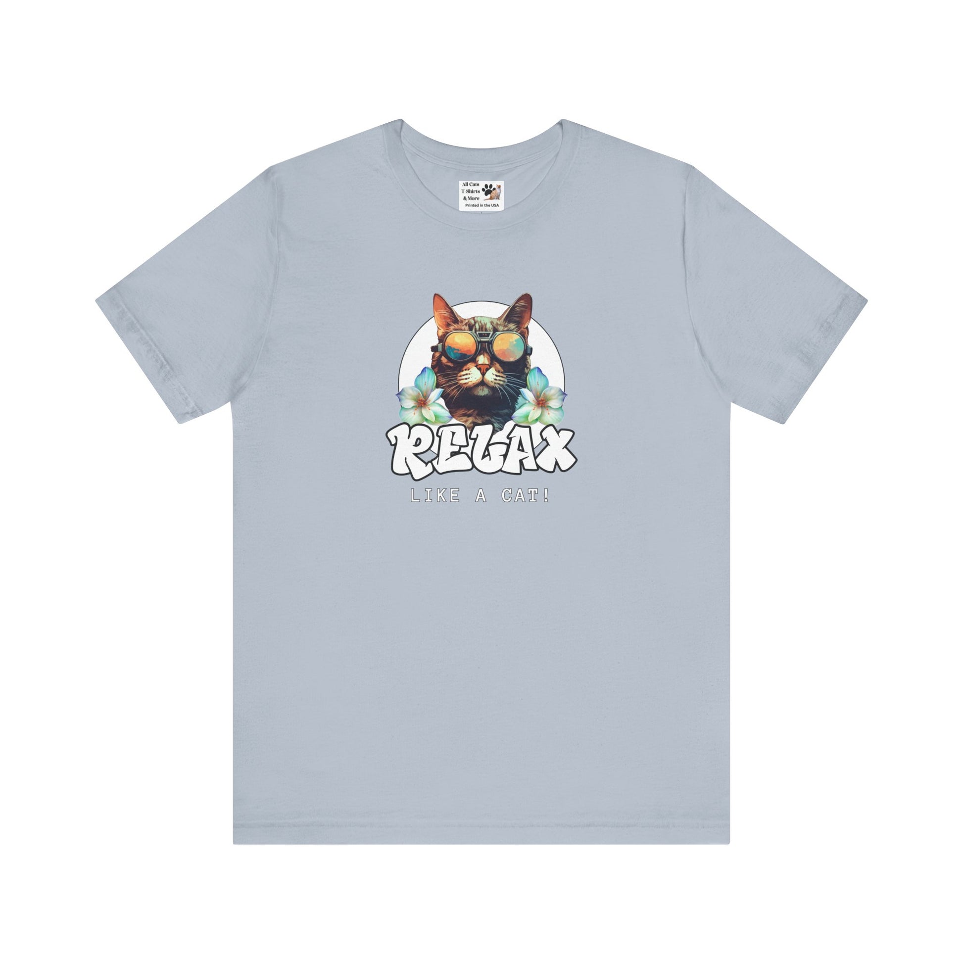 This "Relax Like a Cat" T-Shirt is perfect for cat owners and cat fans. This cool graphic t-shirt of a shades wearing kitty is ideal for lounging in the summer and expressing your love for cats. A great gift for cat lovers. It features a cat in sunglasses on a white circle background, with flowers on either side and the word relax in a cool graffiti style font. This fun and casual tee is perfect for cat fans looking to add a relaxed and stylish vibe to their everyday wardrobe. Ideal for lounging at home or running errands, this t-shirt is also great for casual outings with friends. Perfect for cat lovers birthdays, or just for a fun and quirky everyday look.