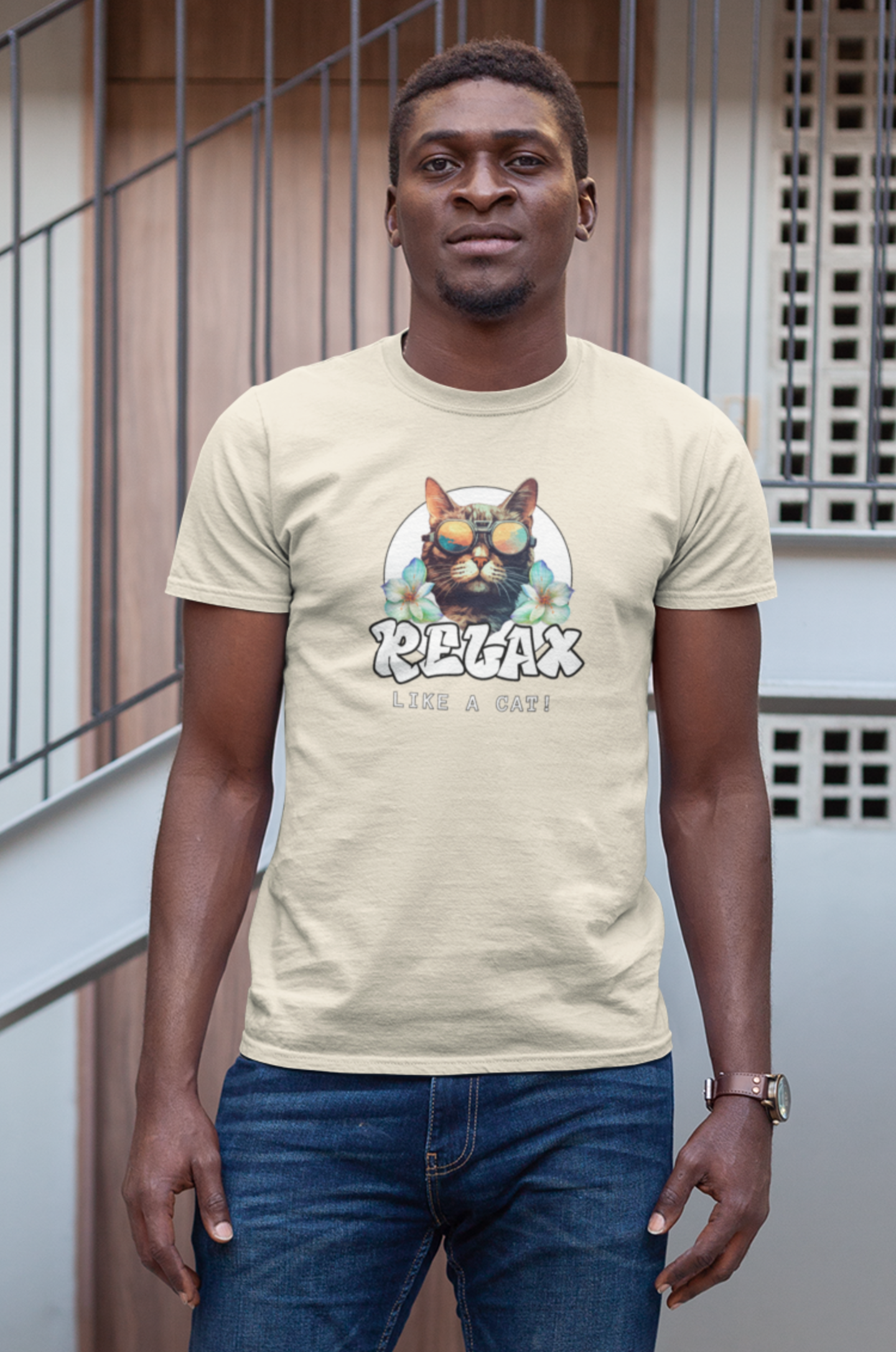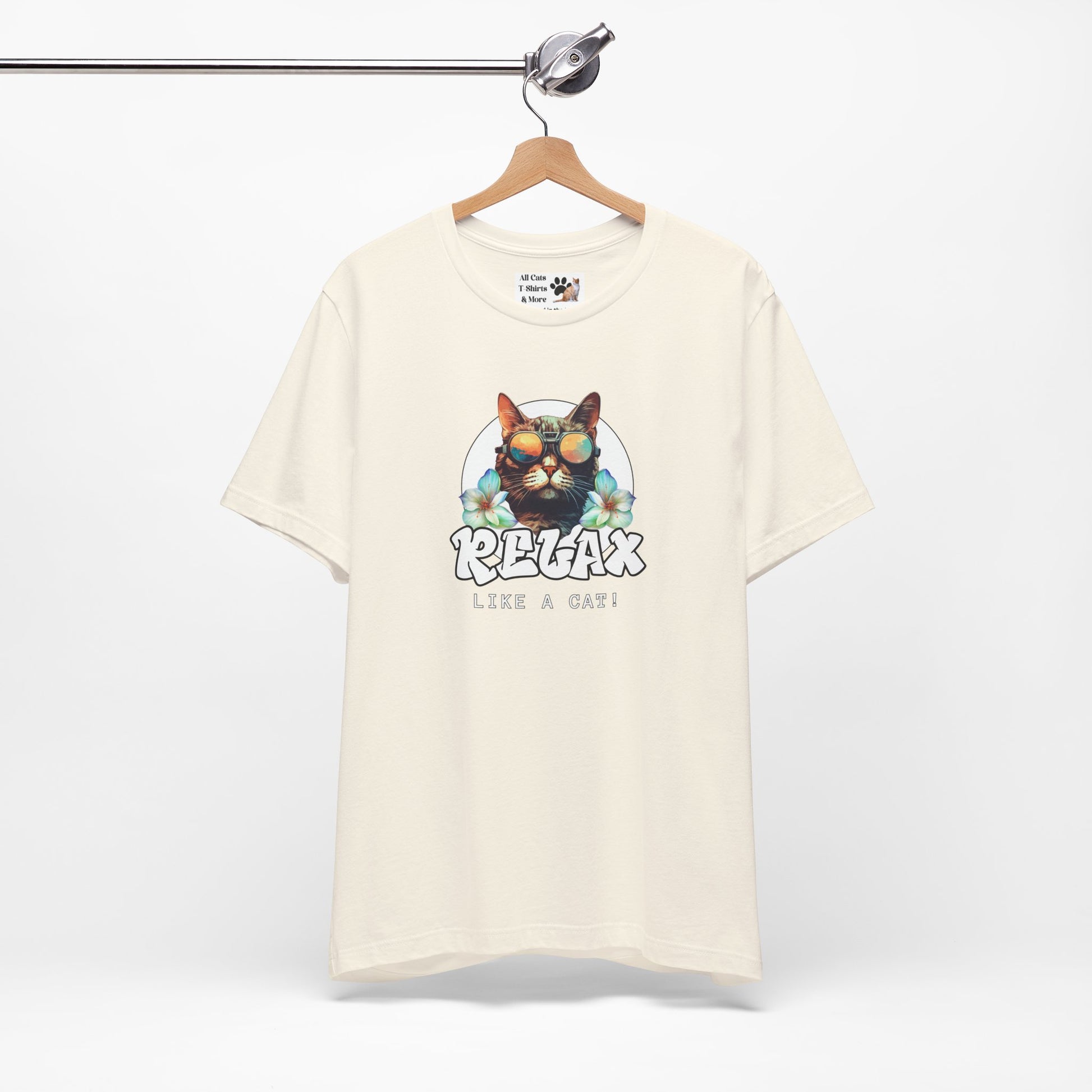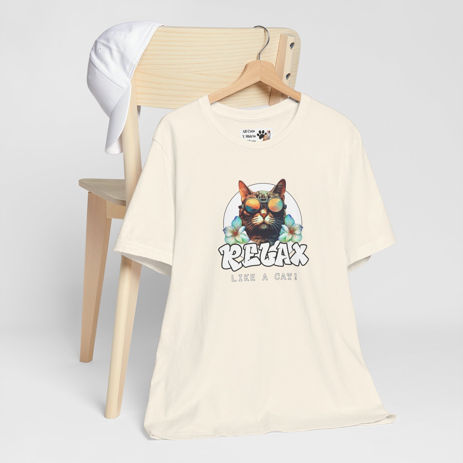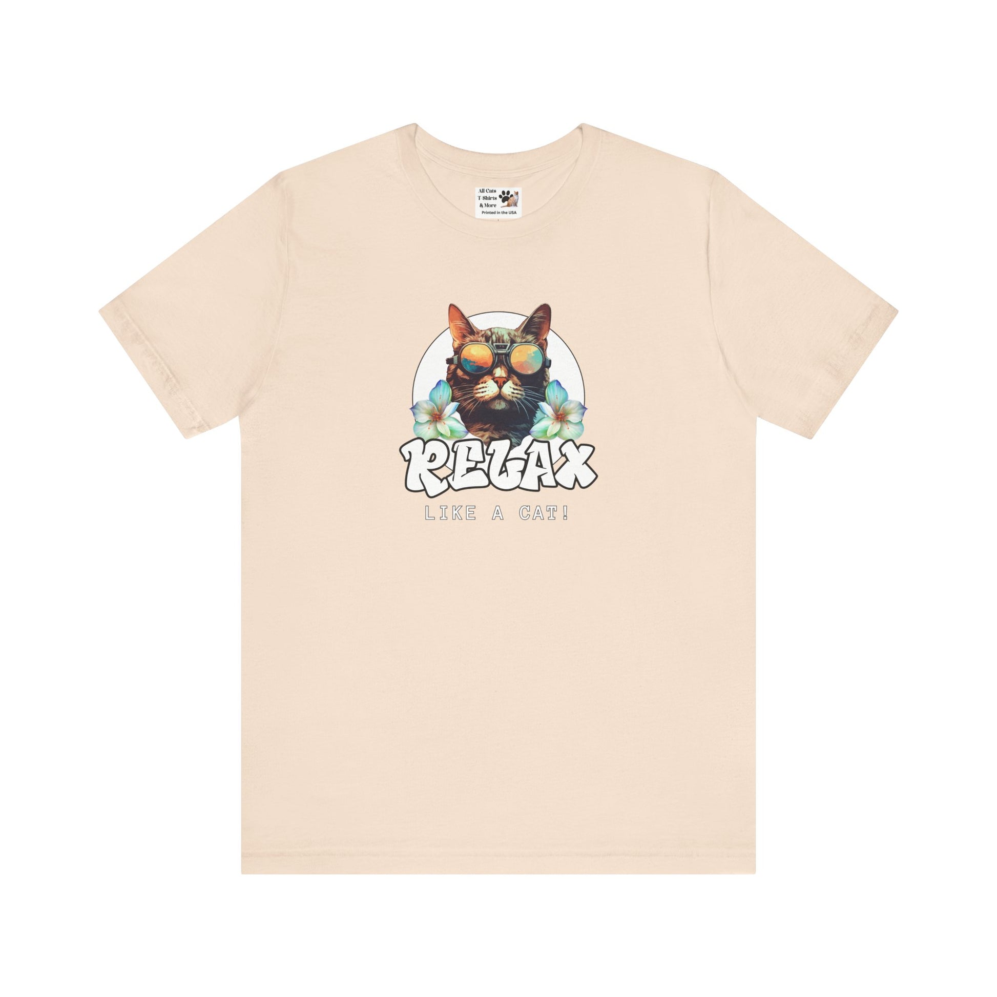 This "Relax Like a Cat" T-Shirt is perfect for cat owners and cat fans. This cool graphic t-shirt of a shades wearing kitty is ideal for lounging in the summer and expressing your love for cats. A great gift for cat lovers. It features a cat in sunglasses on a white circle background, with flowers on either side and the word relax in a cool graffiti style font. This fun and casual tee is perfect for cat fans looking to add a relaxed and stylish vibe to their everyday wardrobe. Ideal for lounging at home or running errands, this t-shirt is also great for casual outings with friends. Perfect for cat lovers birthdays, or just for a fun and quirky everyday look.