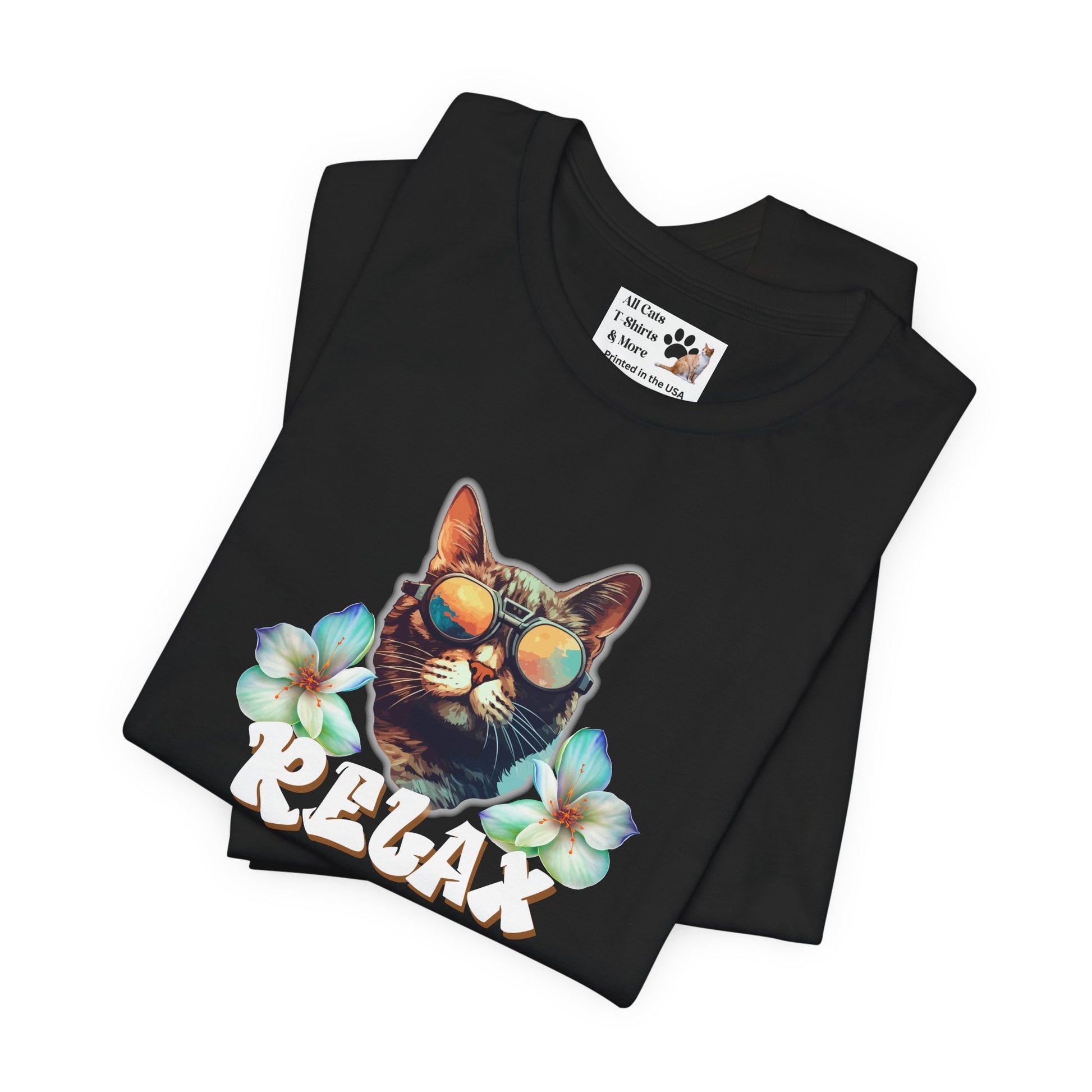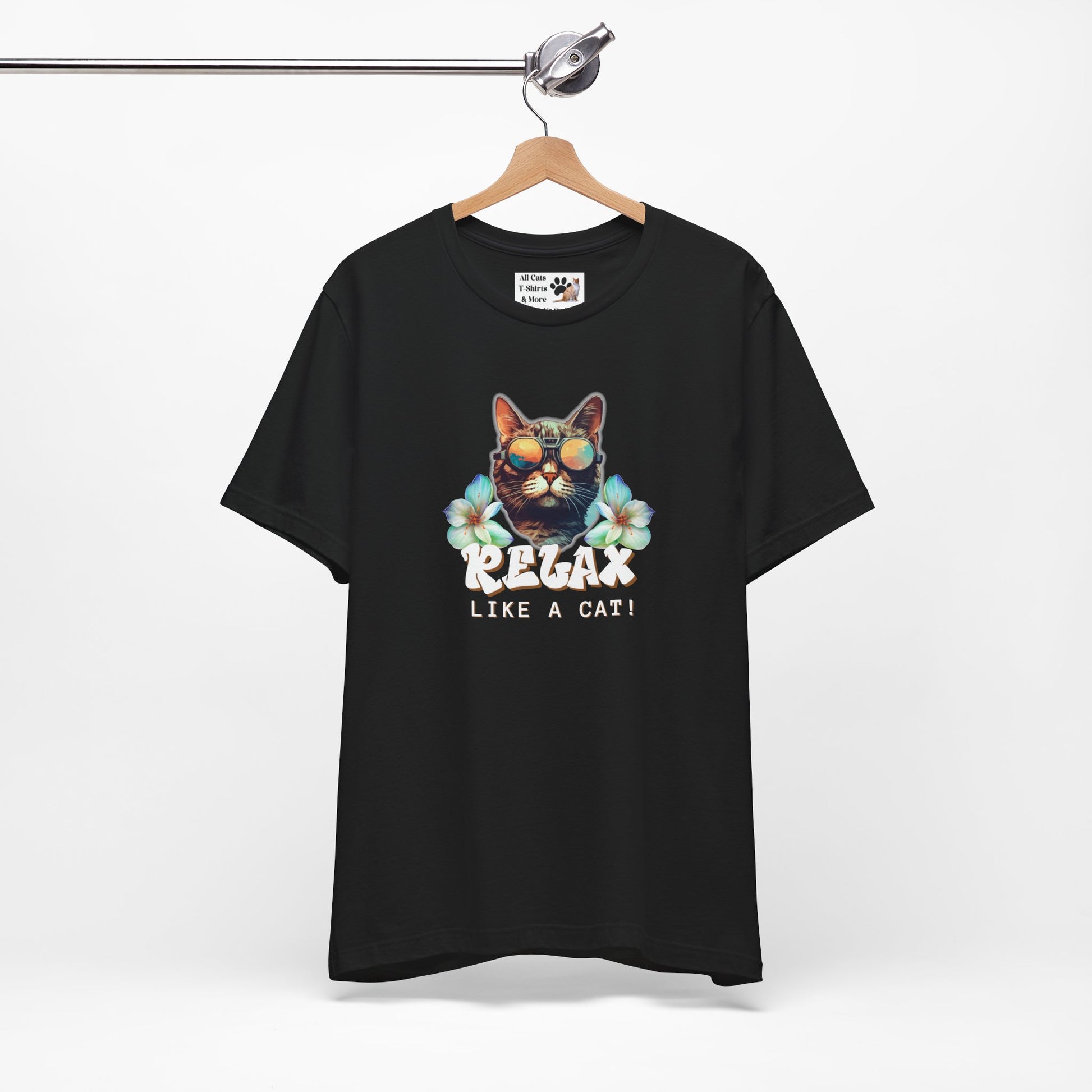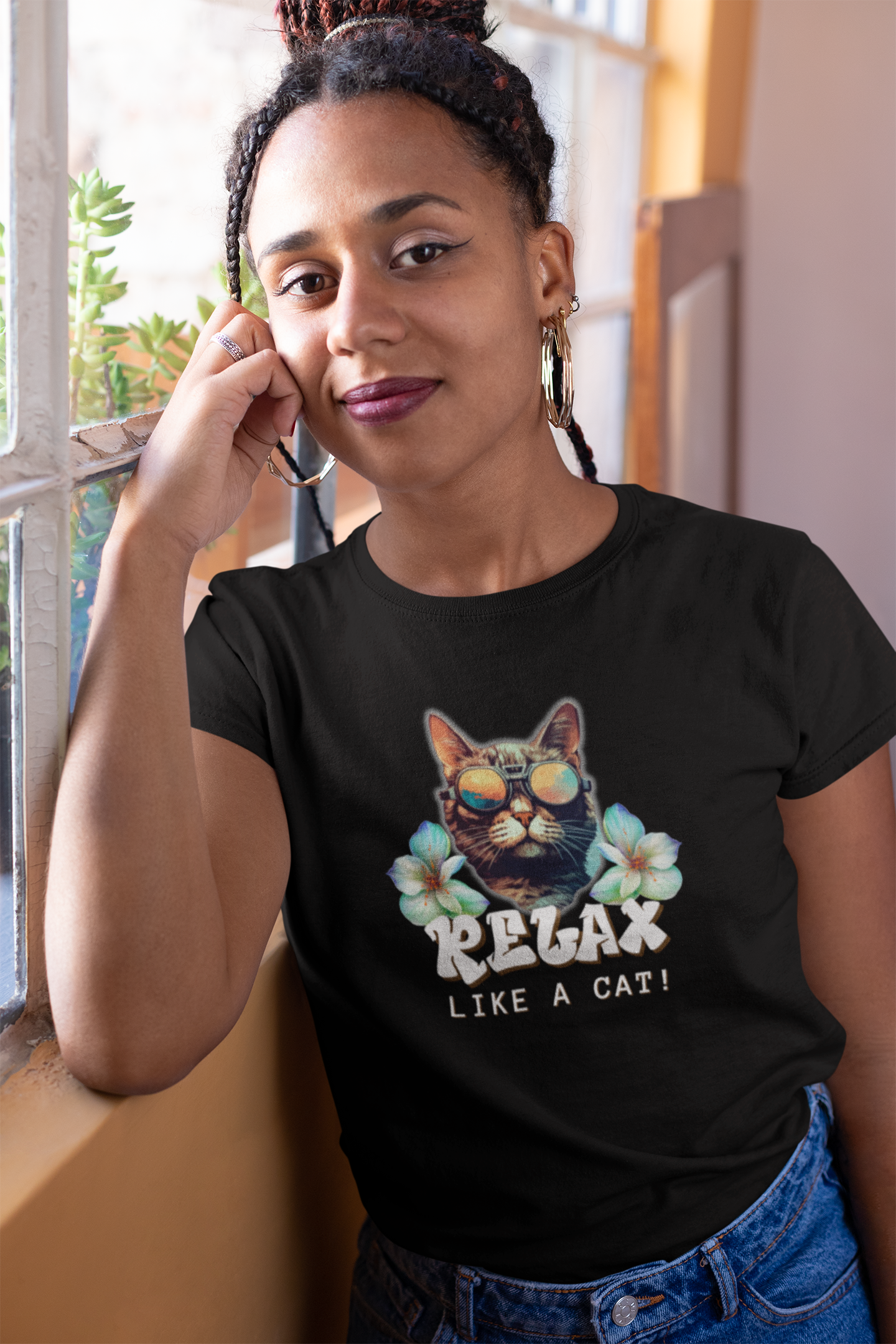 This "Relax Like a Cat" T-Shirt is perfect for cat owners and cat fans. This cool graphic t-shirt of a shades wearing kitty is ideal for lounging in the summer and expressing your love for cats. A great gift for cat lovers. It features a cat in sunglasses with flowers on either side and the word relax in a cool graffiti style font. This fun and casual tee is perfect for cat fans looking to add a relaxed and stylish vibe to their everyday wardrobe. Ideal for lounging at home or running errands, this t-shirt is also great for casual outings with friends. Perfect for cat lovers birthdays, or just for a fun and quirky everyday look.