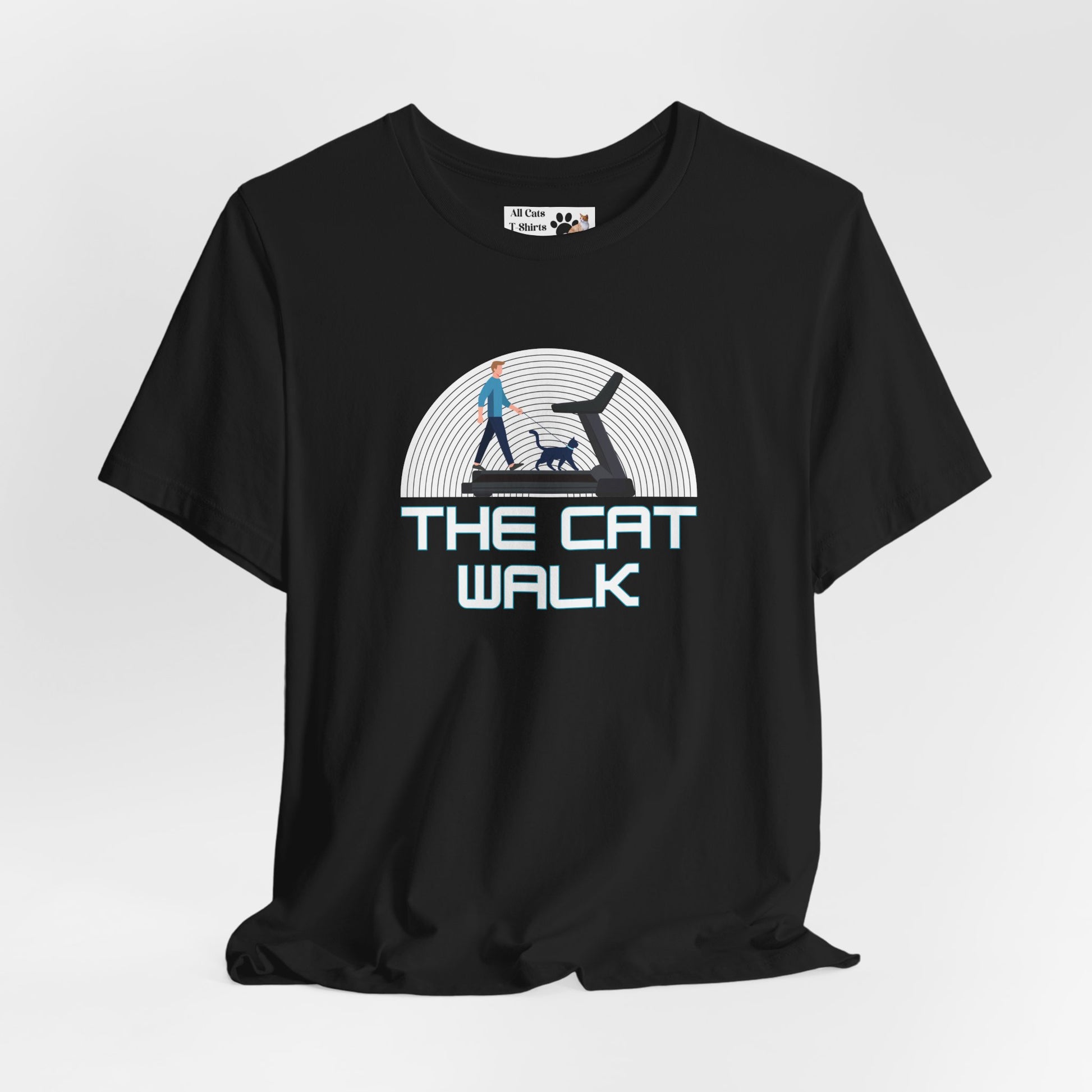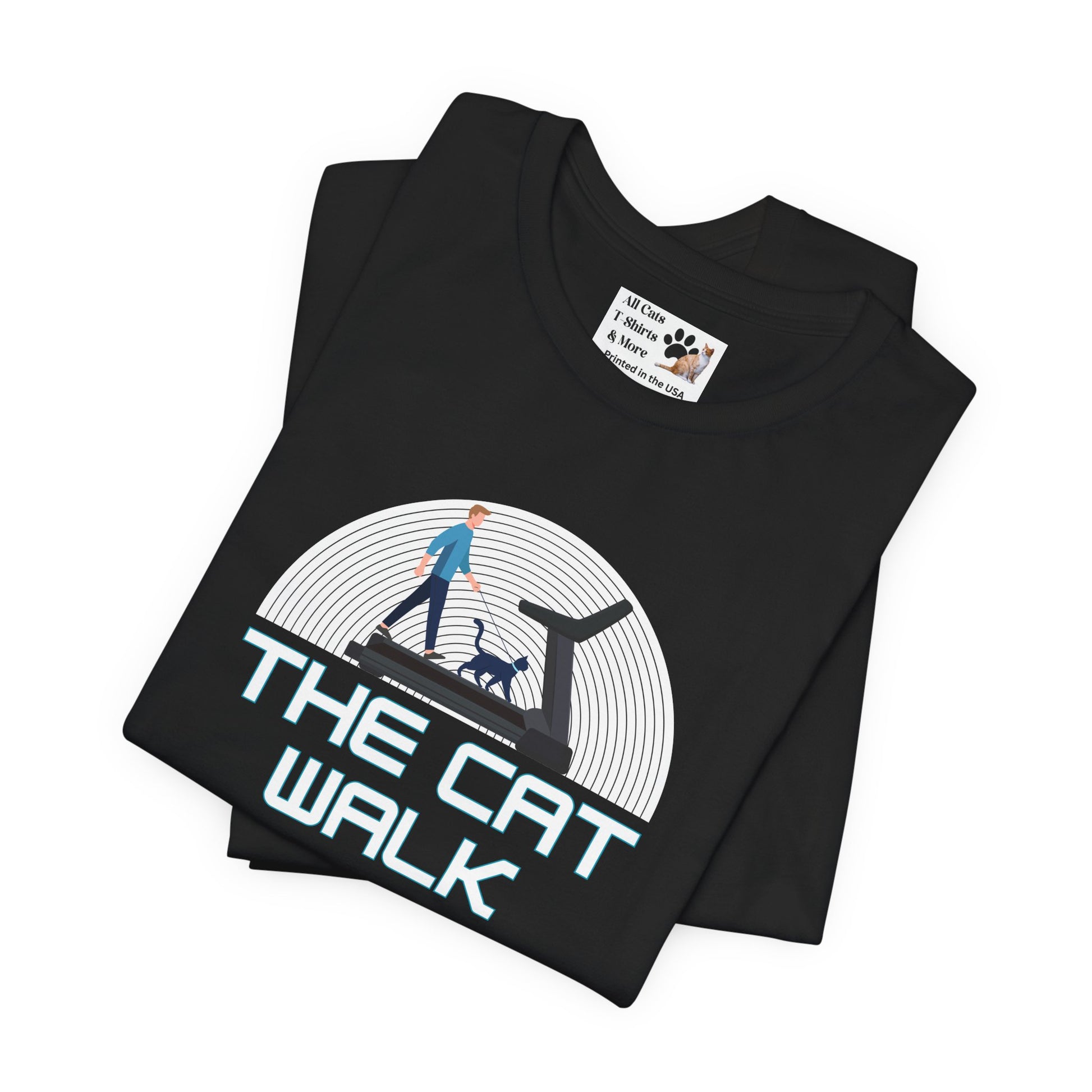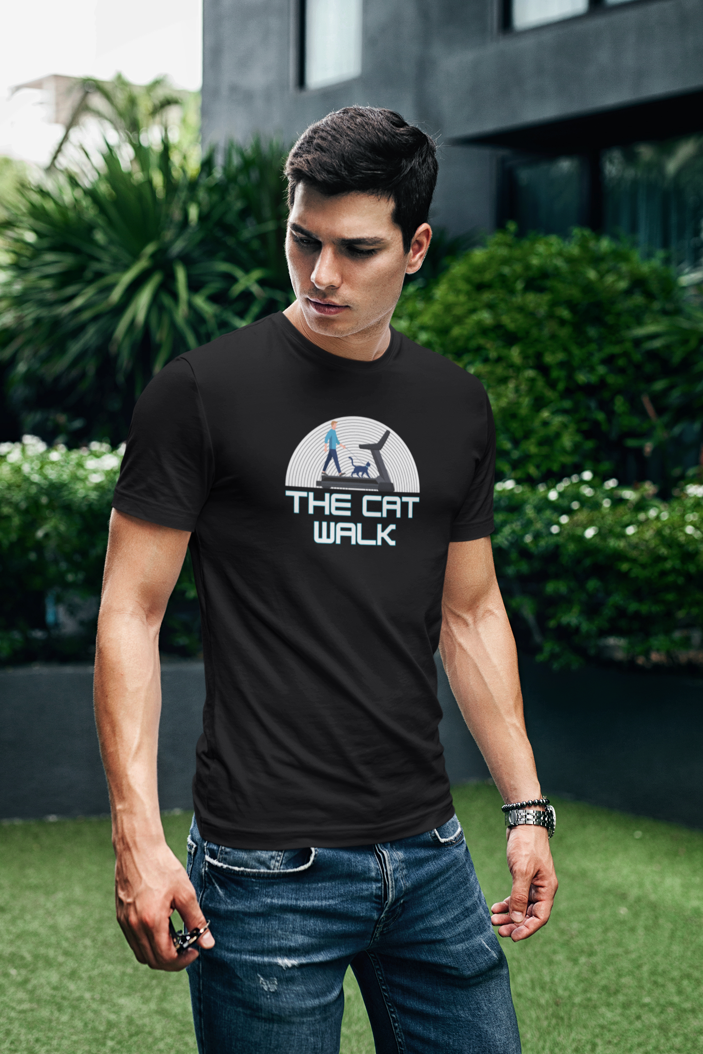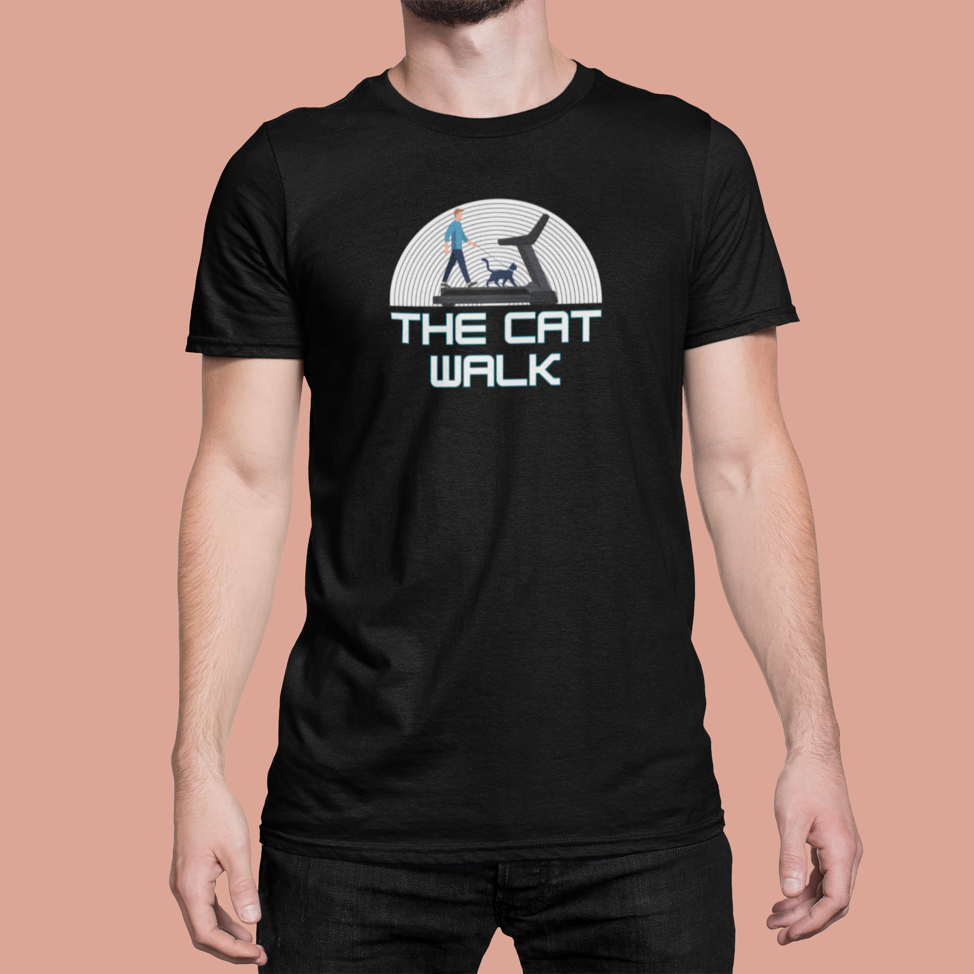 A humorous play on words T-Shirt featuring a man walking his leashed cat on a treadmill (The "Cat Walk") perfect for cat lovers with a playful sense of humor. This shirt is ideal for casual wear and adding a touch of fun to everyday outfits. Relevant for cat enthusiasts, pet owners, and those who appreciate quirky designs. Great for gifting on birthdays, holidays, and special occasions.