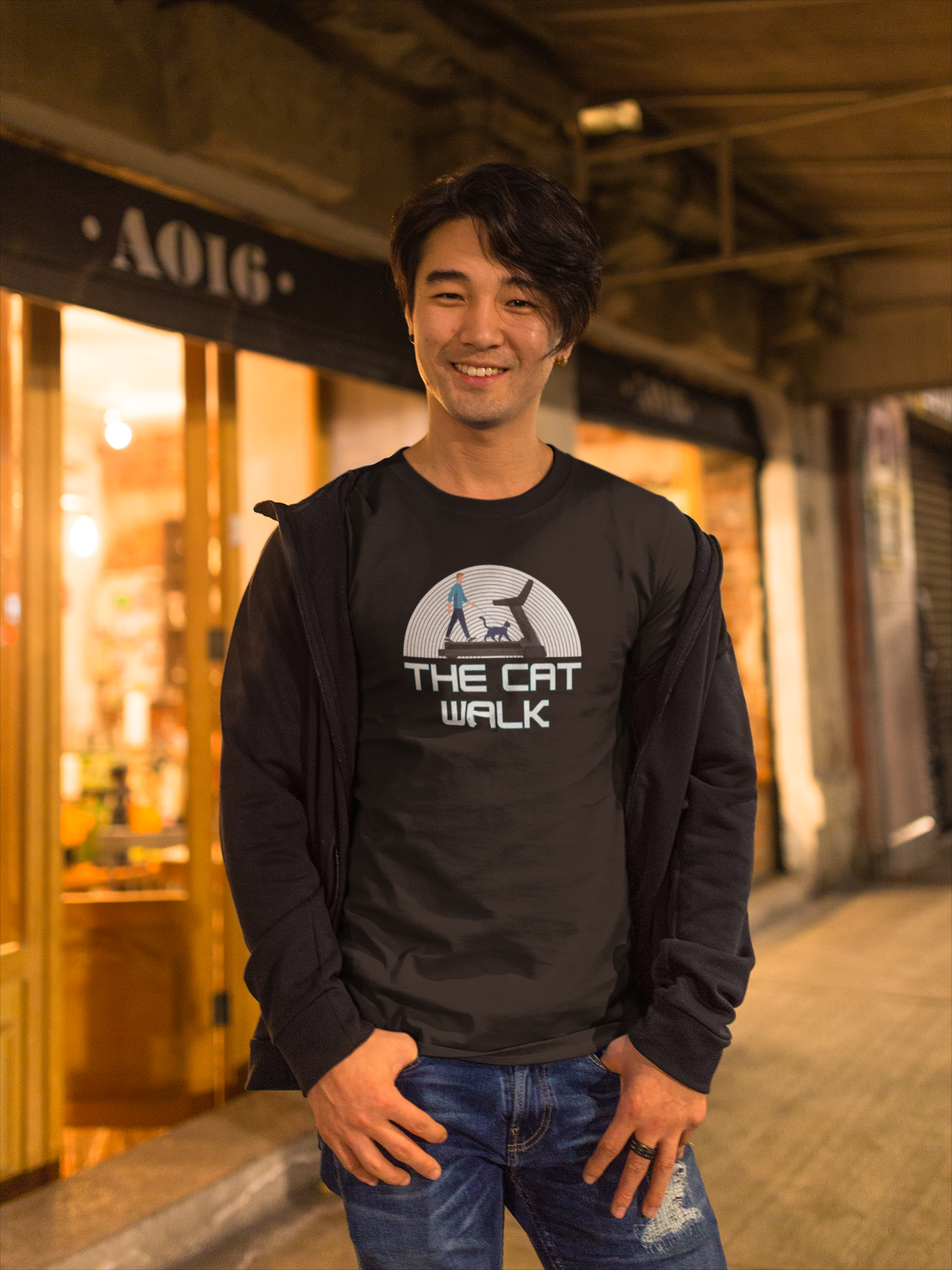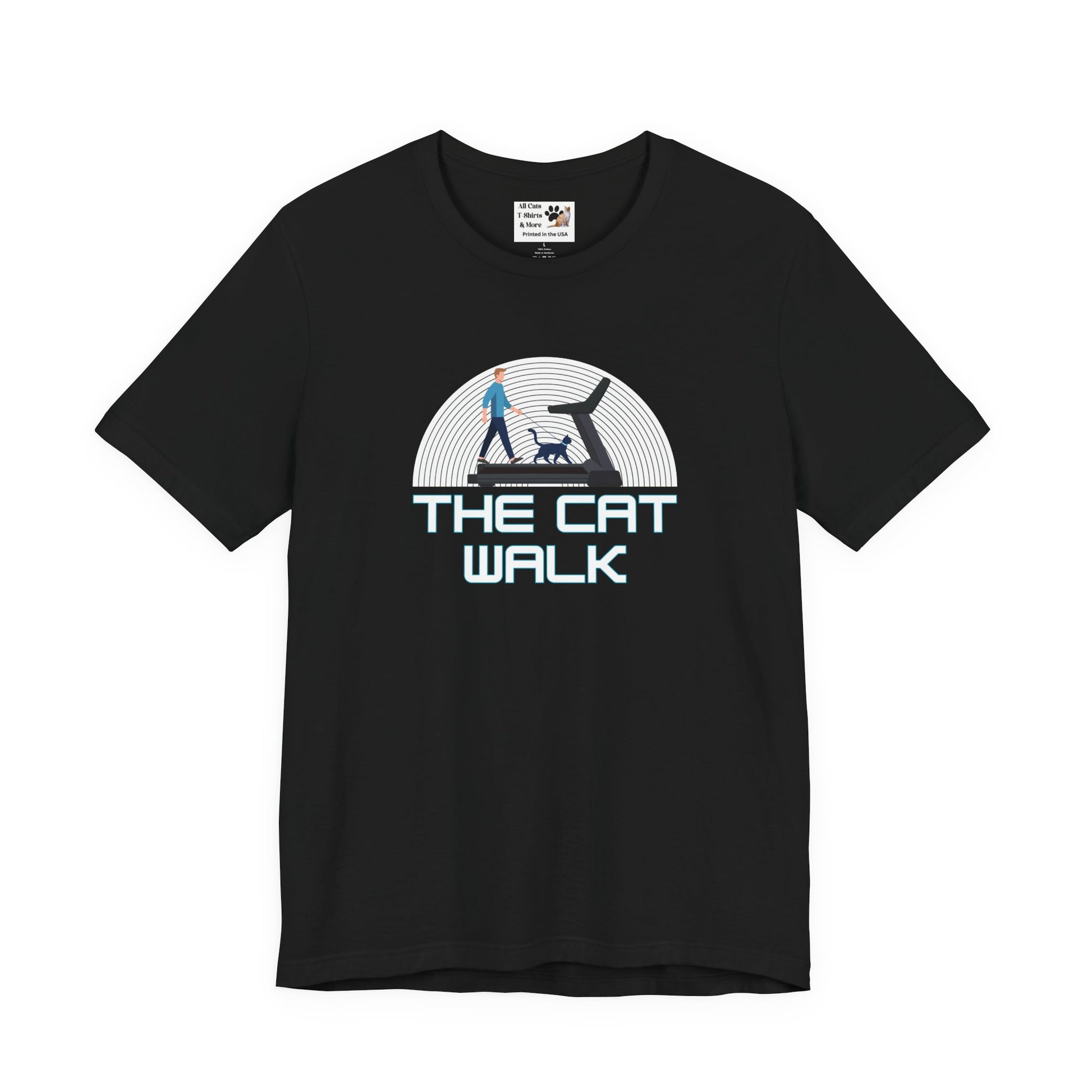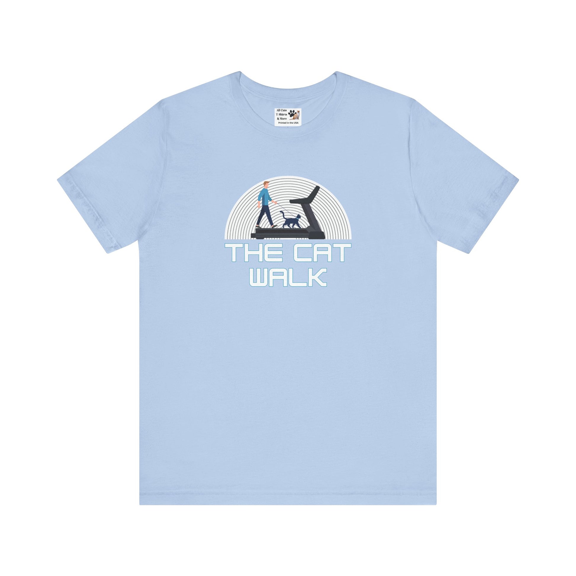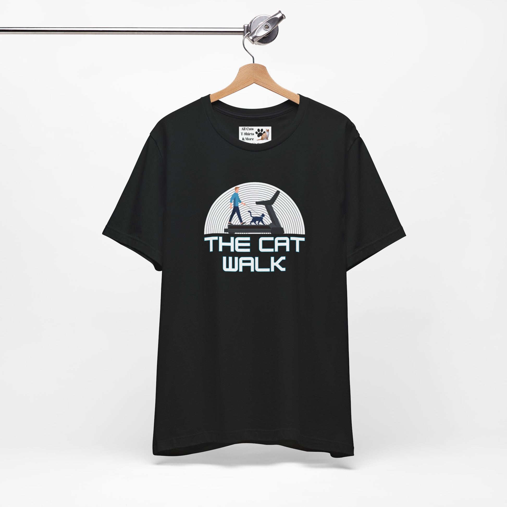 A humorous play on words T-Shirt featuring a man walking his leashed cat on a treadmill (The "Cat Walk") perfect for cat lovers with a playful sense of humor. This shirt is ideal for casual wear and adding a touch of fun to everyday outfits. Relevant for cat enthusiasts, pet owners, and those who appreciate quirky designs. Great for gifting on birthdays, holidays, and special occasions.