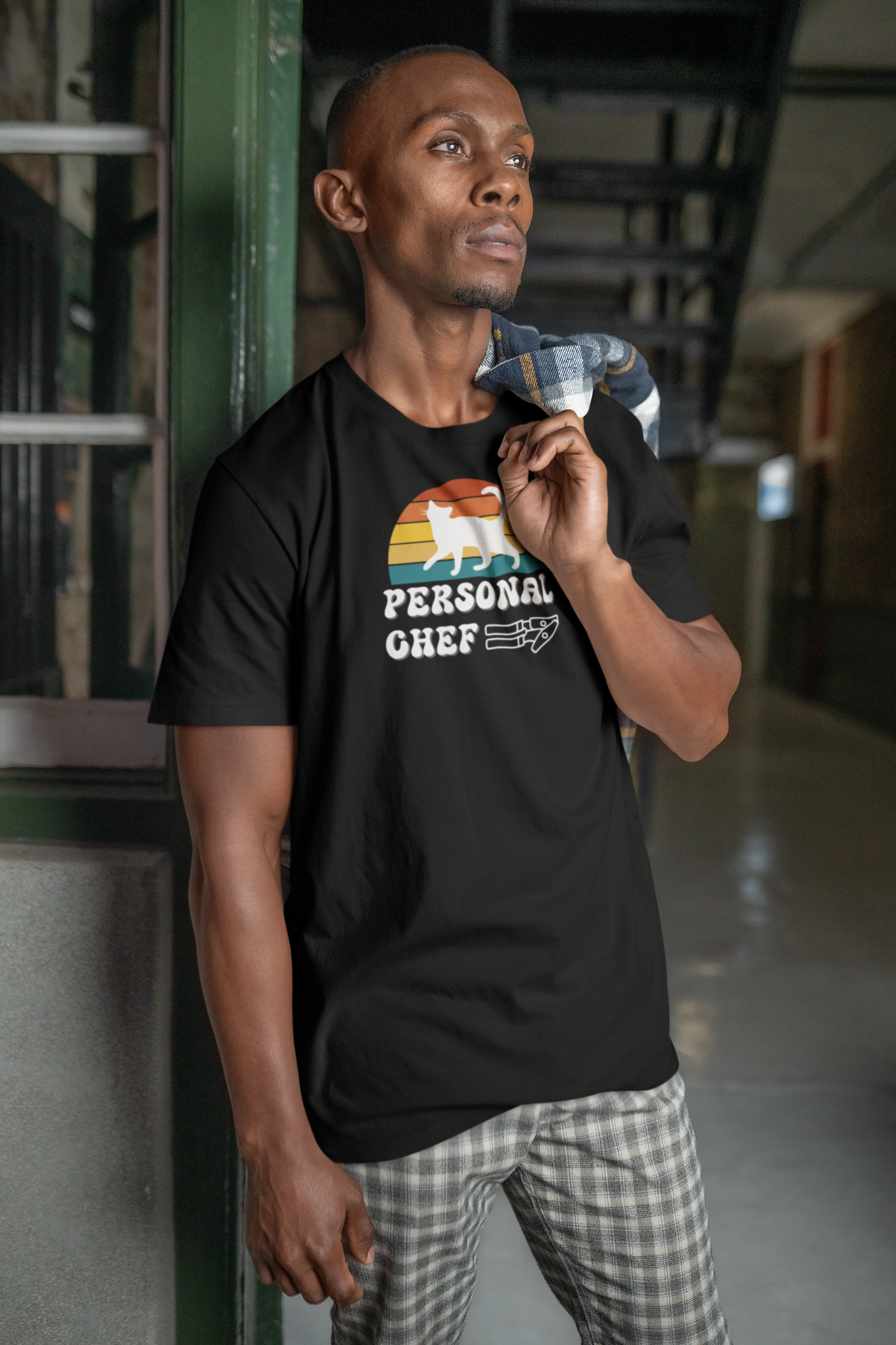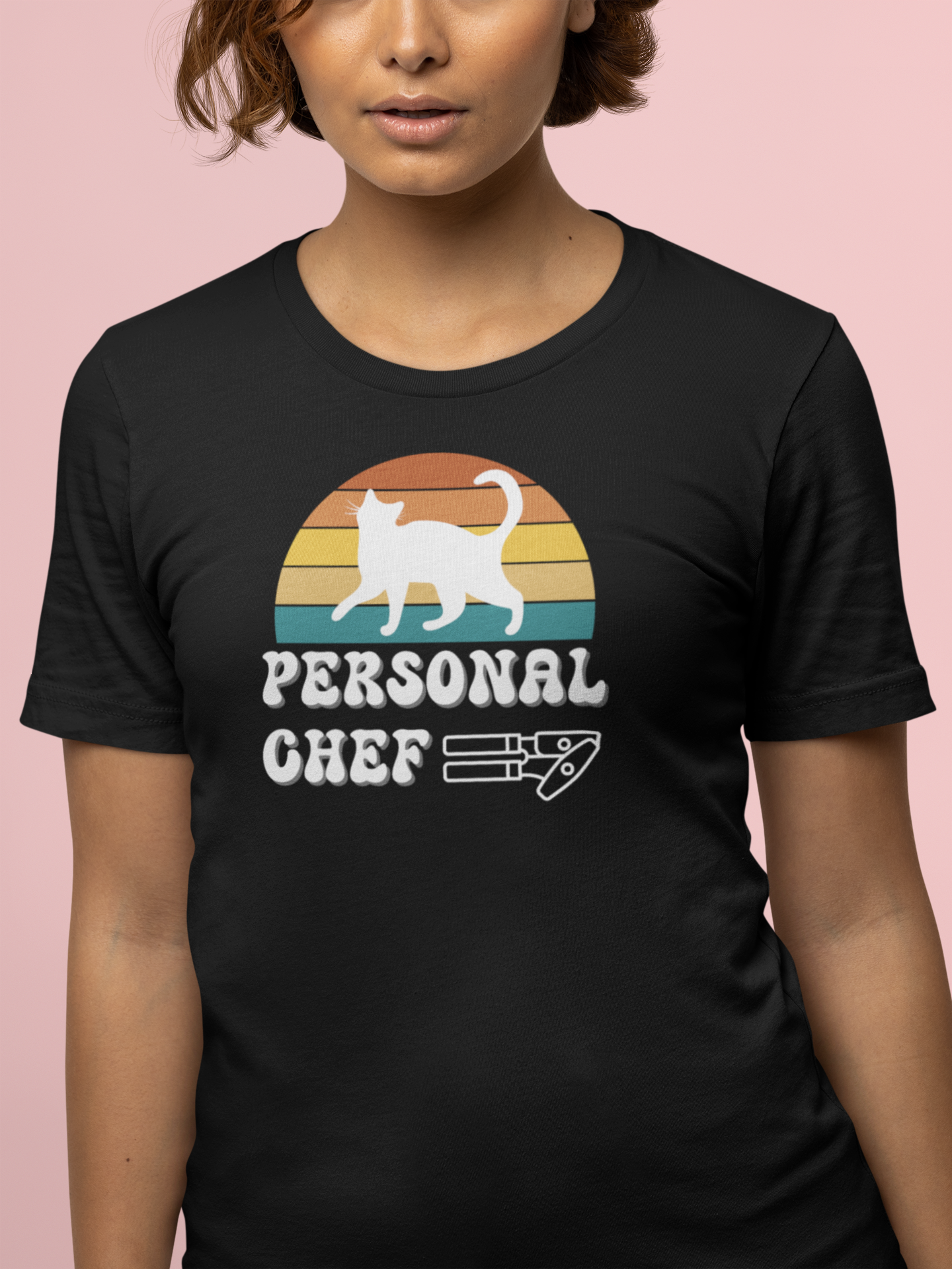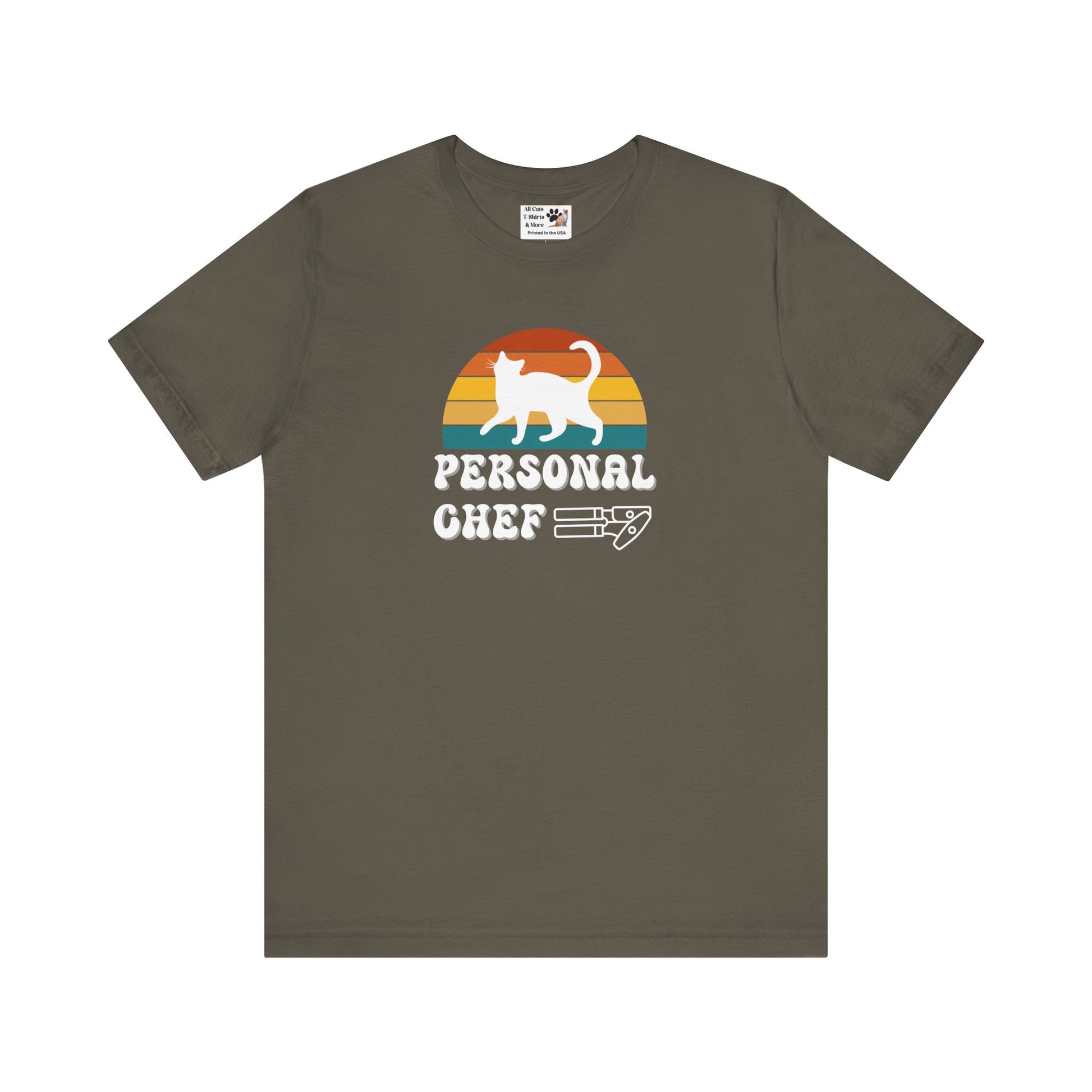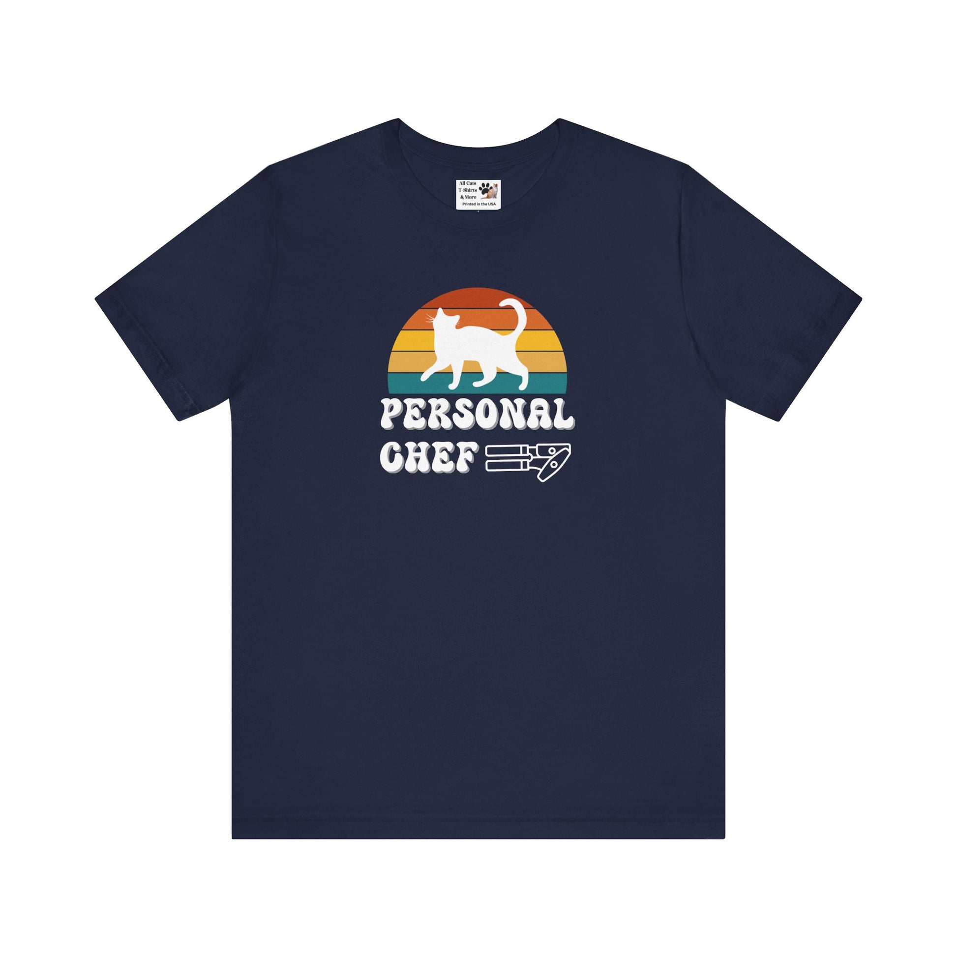 Are you a "PERSONAL CHEF" for your kitty? Introducing the Personal Chef for Cats T-shirts theme; these T-shirts help proud cat owners make a fun and funny statment about being their cats "personal chef" (Or the opener of the can of cat food!) This T-Shirt features a white cat silhouette on a vintage sunset style background and a can opener outline below. This fun and quirky design is perfect for cat lovers and can be a great conversation starter and a playful addition to a casual outfit. Ideal for wearing during everyday activities or while hanging out with friends. Relevant for cat owners and parents and those who enjoy unique and humorous clothing.
