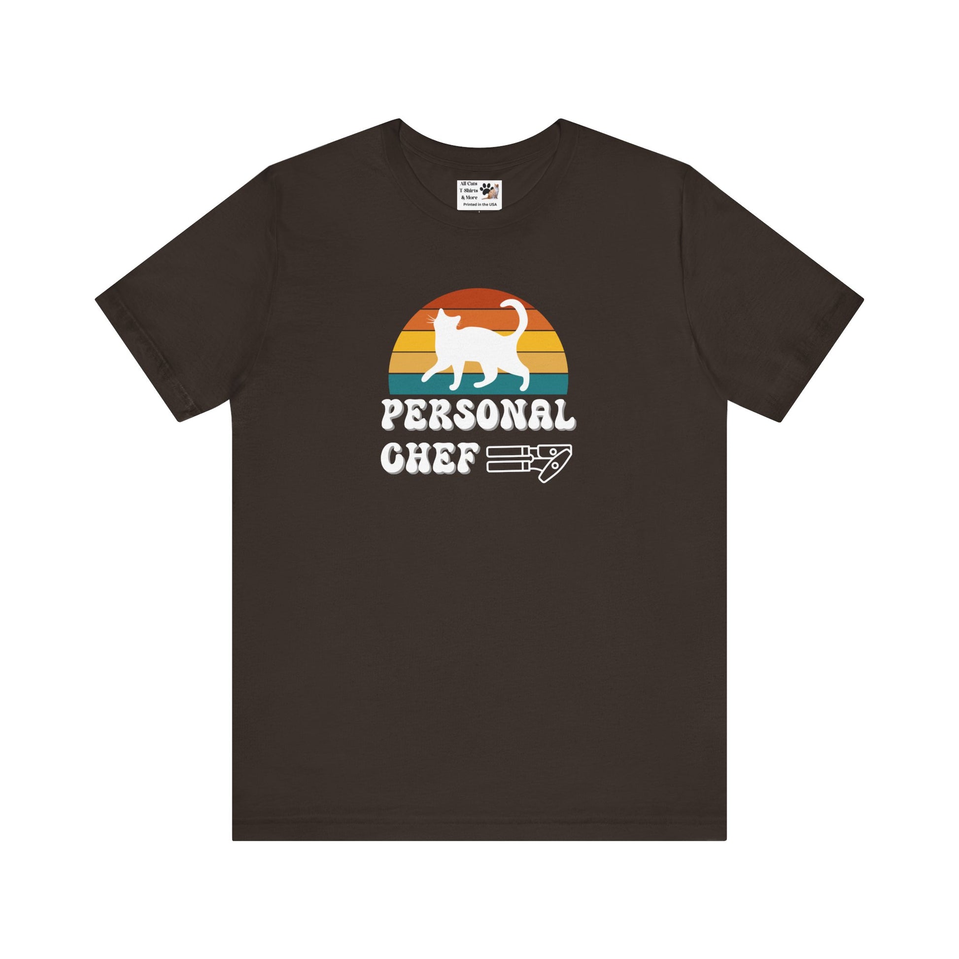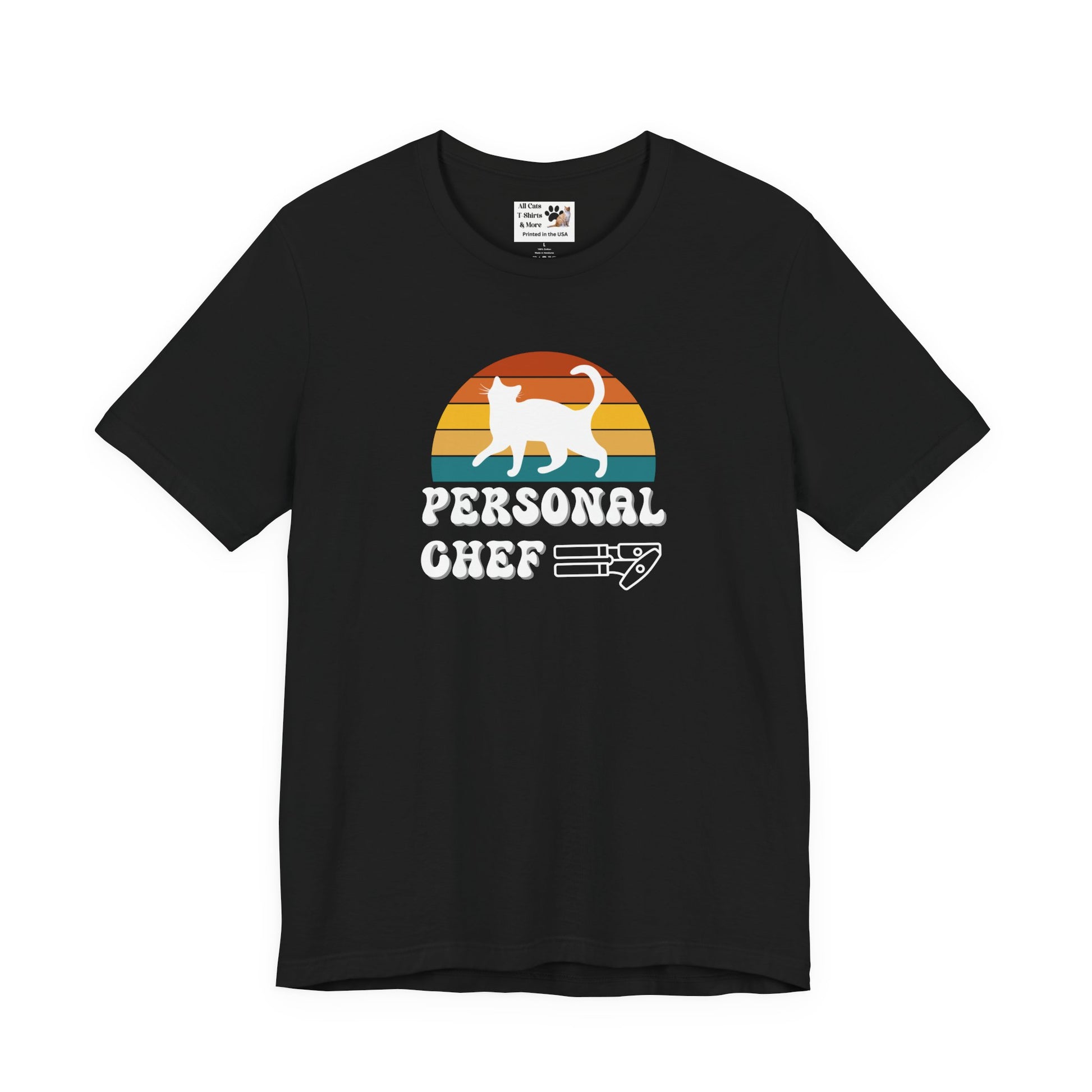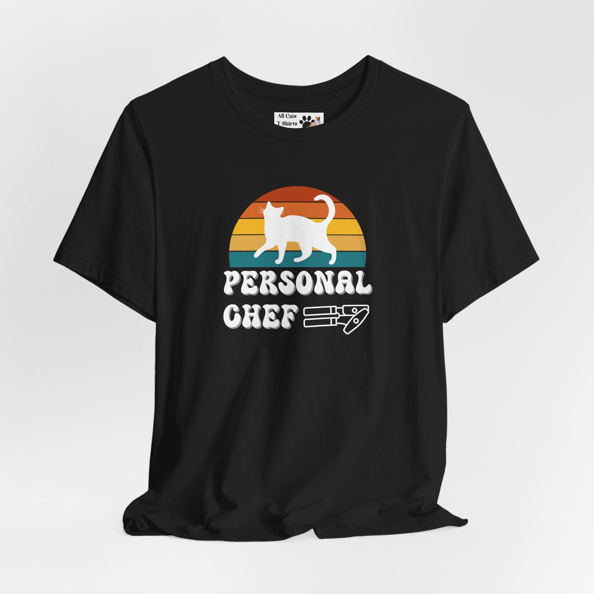 Vintage Sunset Personal Chef for Cats T-Shirt (#17 - White Cat Silhouette & Can Opener - Unisex Jersey Tee – Funny Cat Tee)