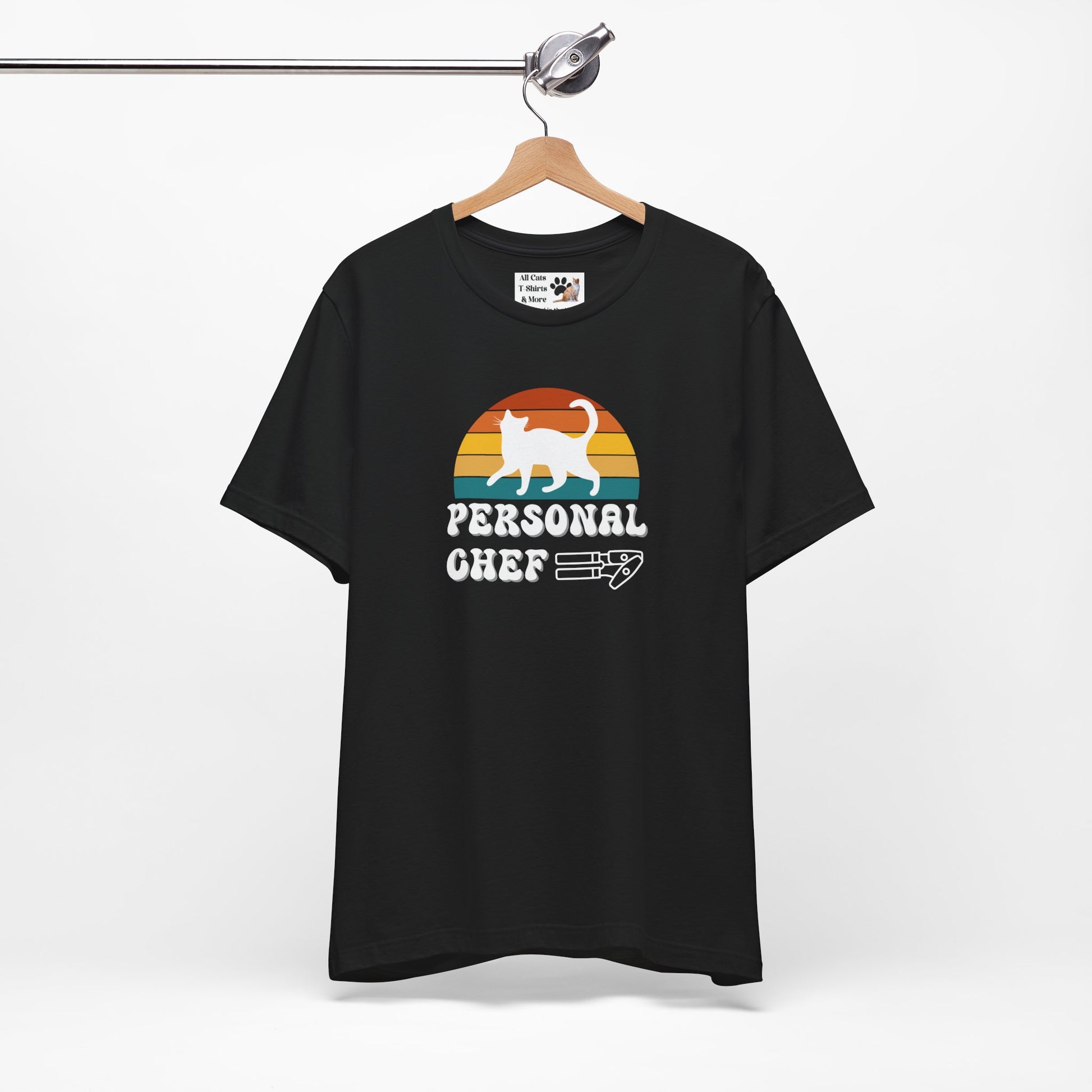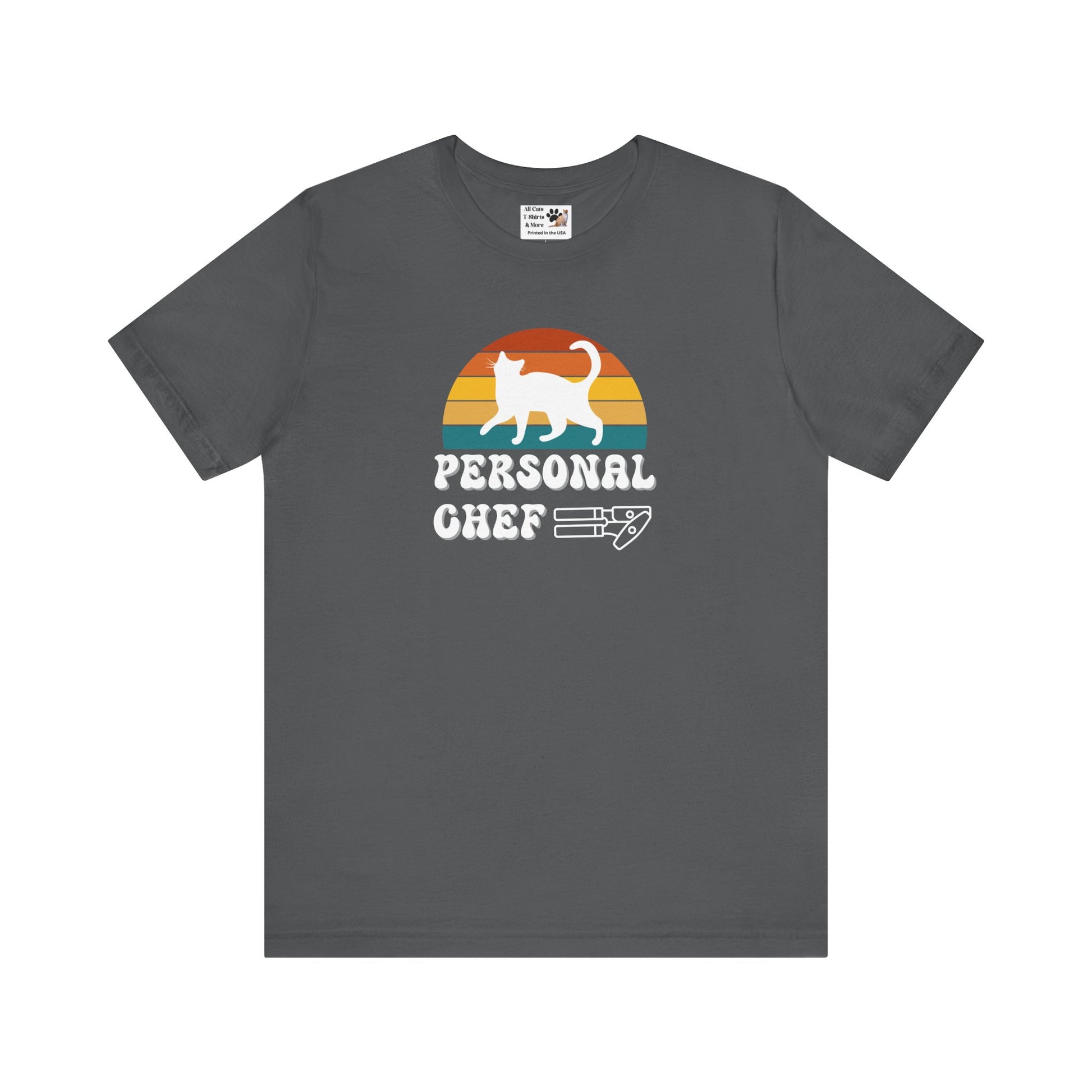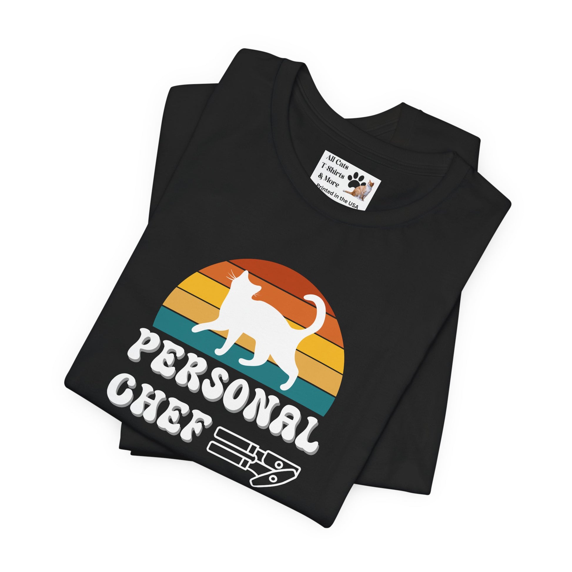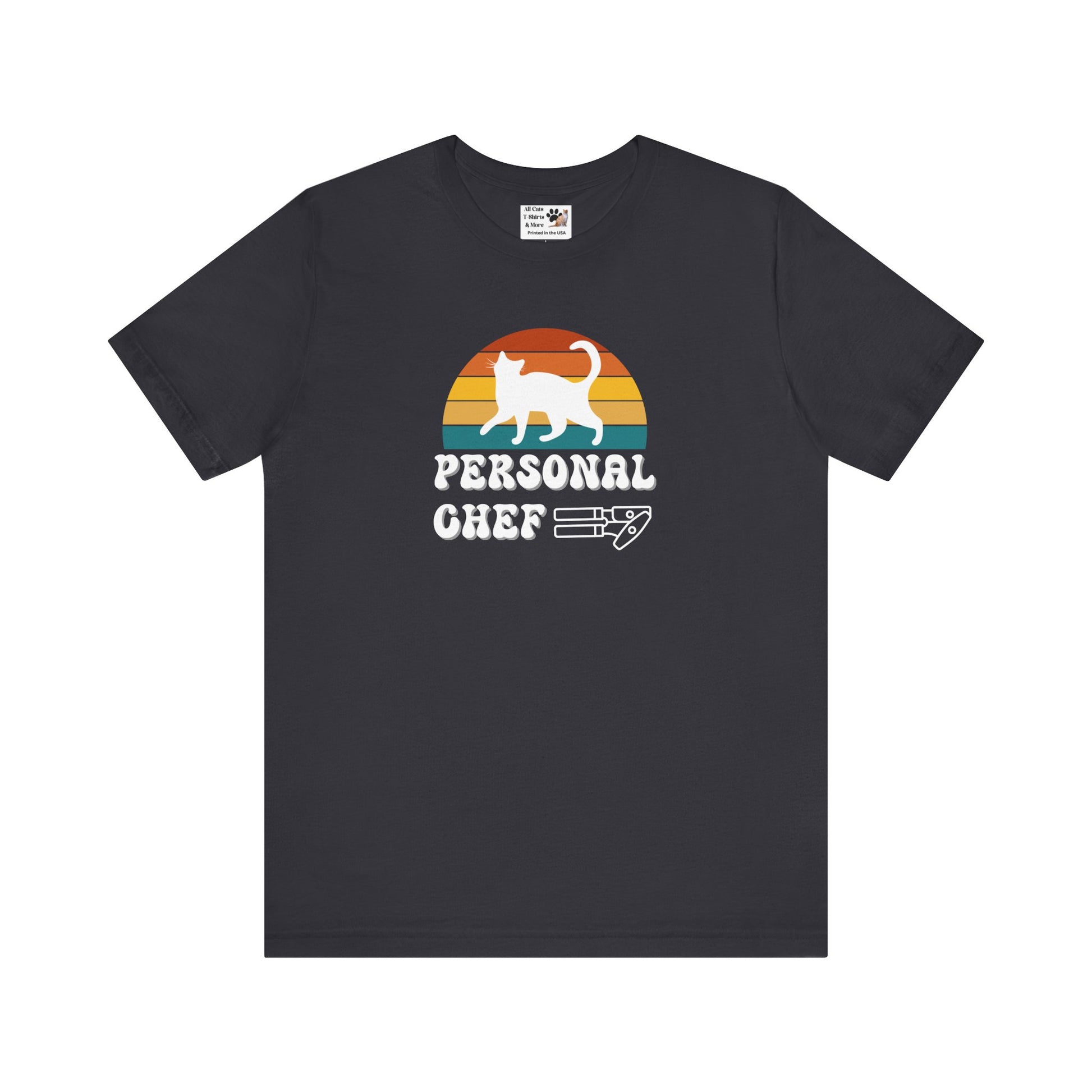 Vintage Sunset Personal Chef for Cats T-Shirt (#17 - White Cat Silhouette & Can Opener - Unisex Jersey Tee – Funny Cat Tee)