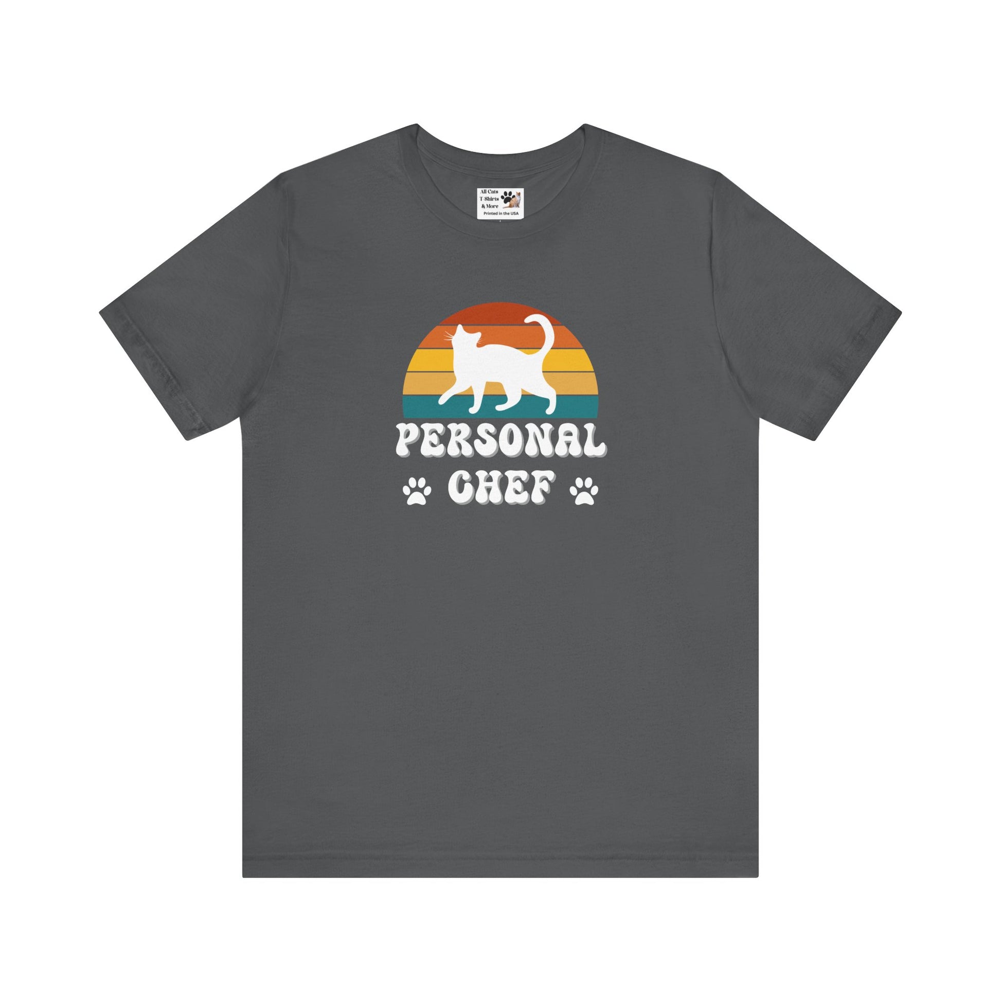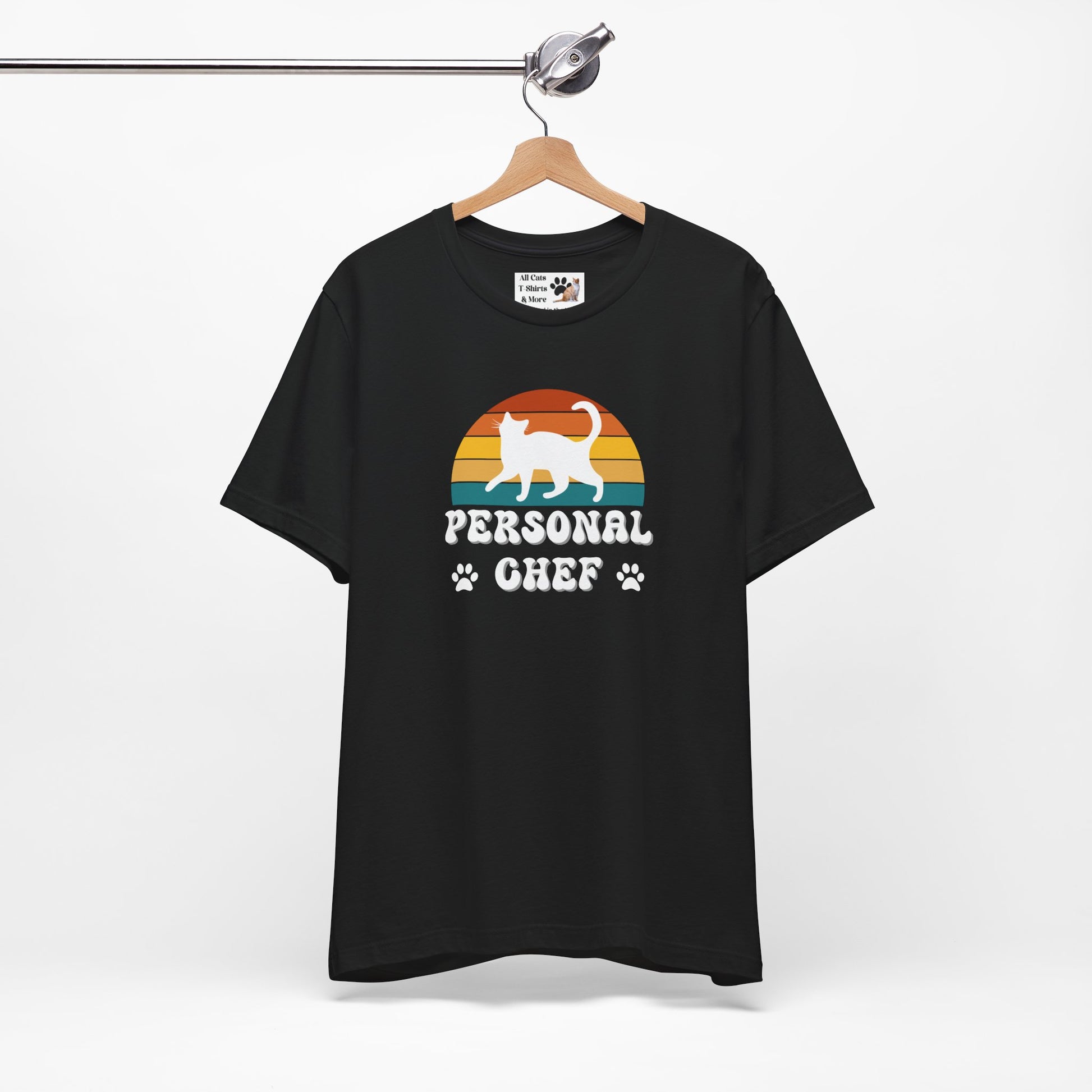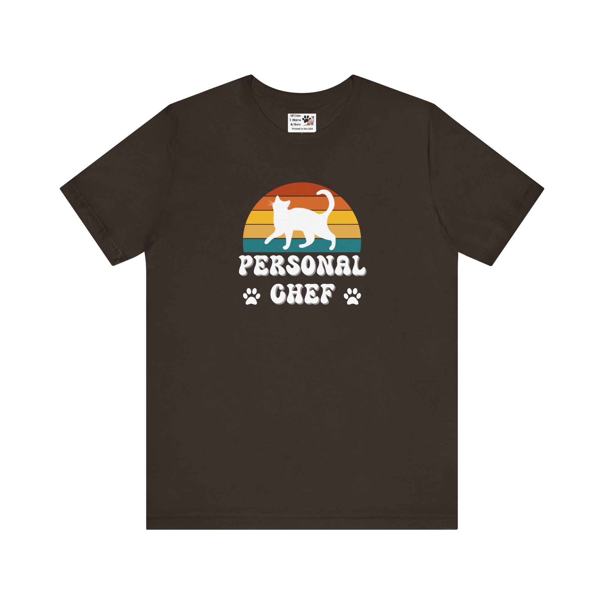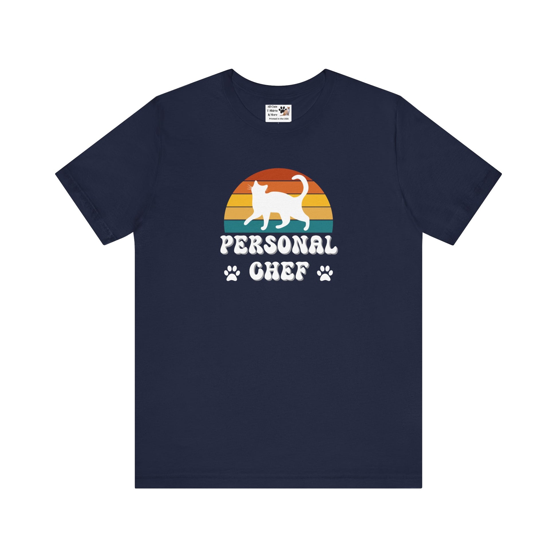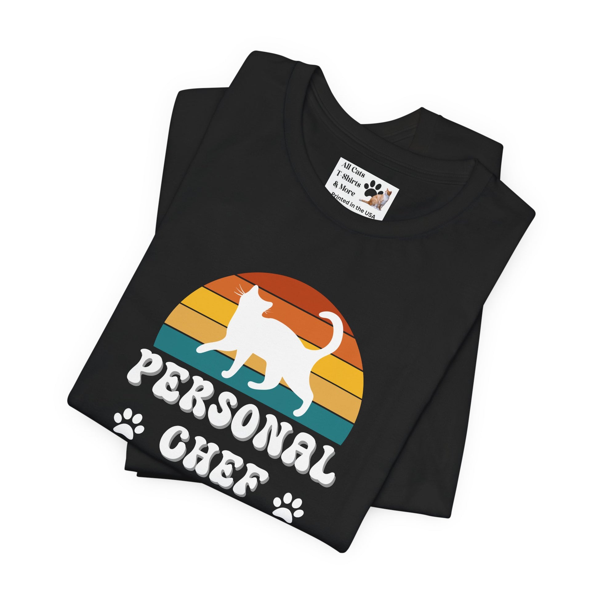 Vintage Sunset Personal Chef for Cats T-Shirt (#21 - White Cat Silhouette & Paw Prints - Unisex Jersey Tee)