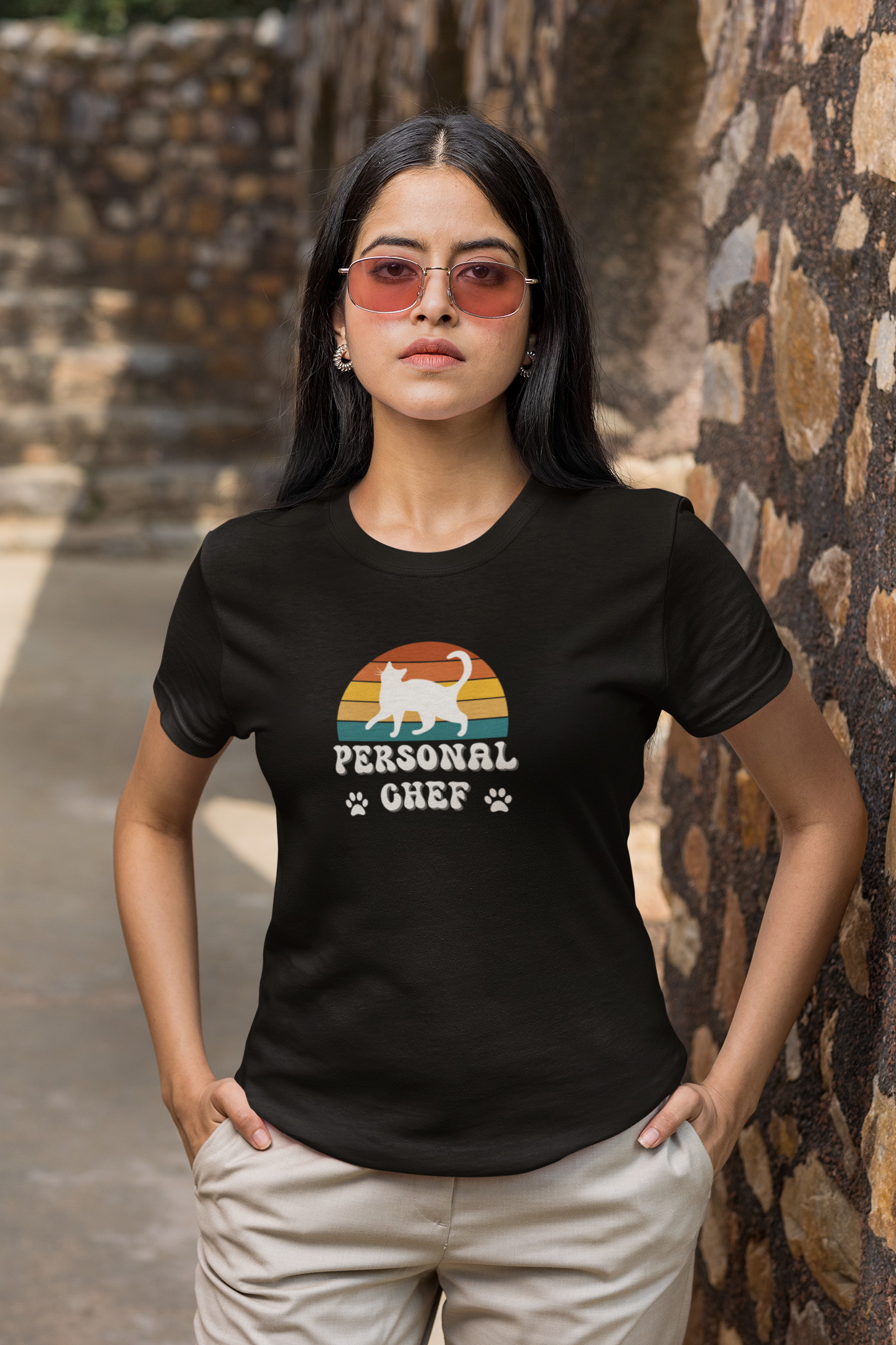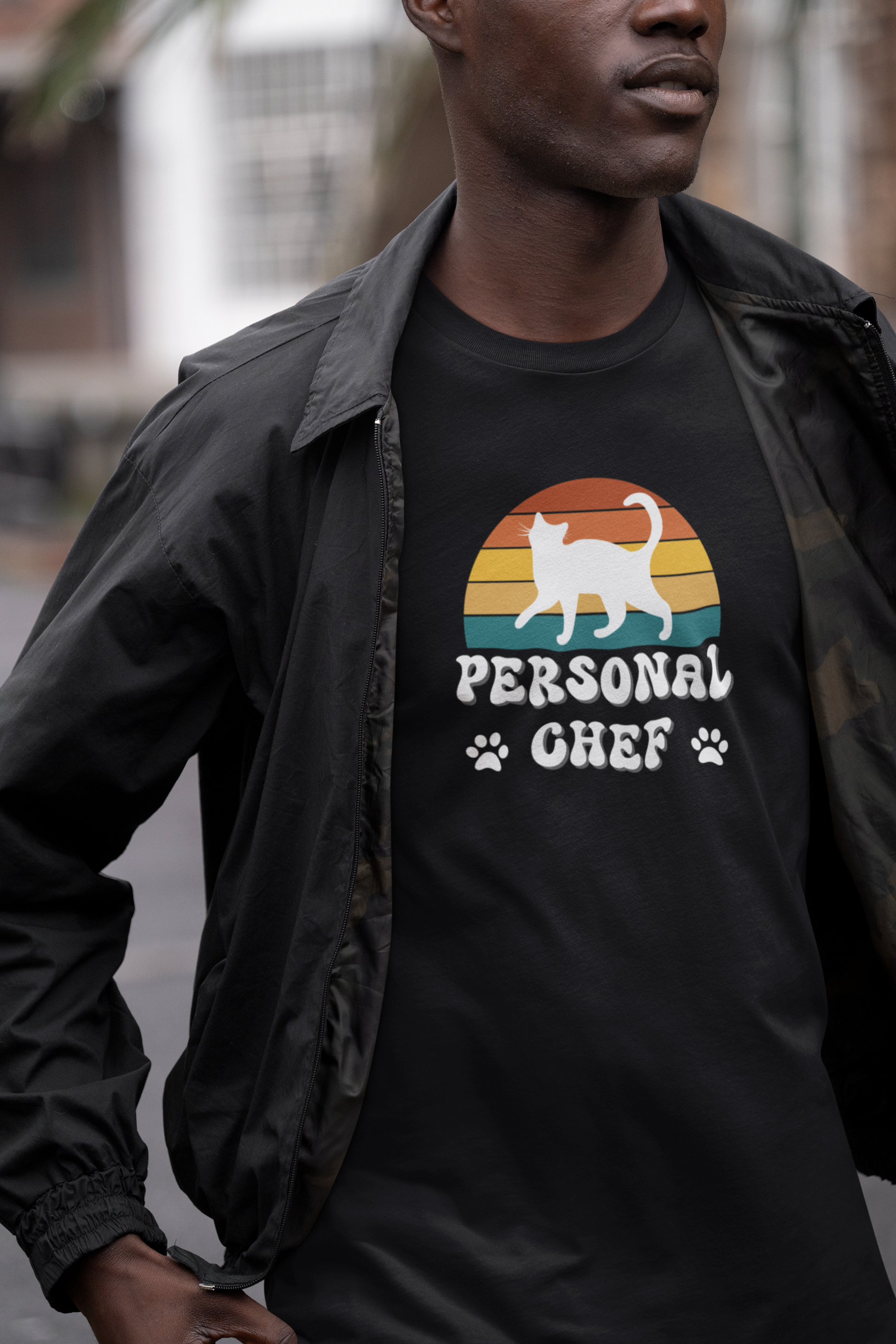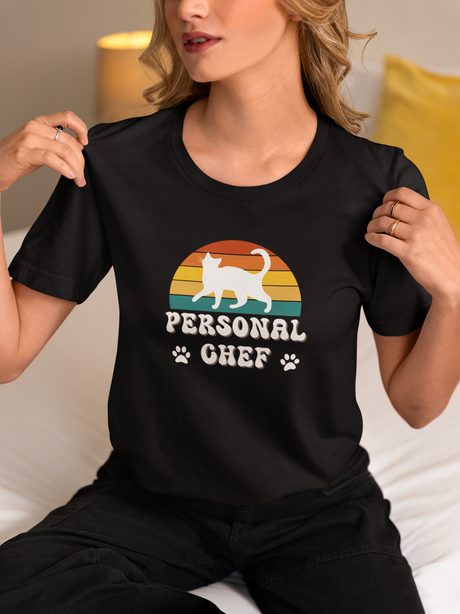 Are you a "PERSONAL CHEF" for your kitty? Introducing the Personal Chef for Cats T-shirts theme; these T-shirts help proud cat owners make a fun and funny statment about being their cats "personal chef" (Or the opener of the can of cat food!) This T-Shirt features a white cat silhouette on a vintage sunset style background and two paw prints. This fun and quirky design is perfect for cat lovers and can be a great conversation starter and a playful addition to a casual outfit. Ideal for wearing during everyday activities or while hanging out with friends. Relevant for cat owners and parents and those who enjoy unique and humorous clothing.